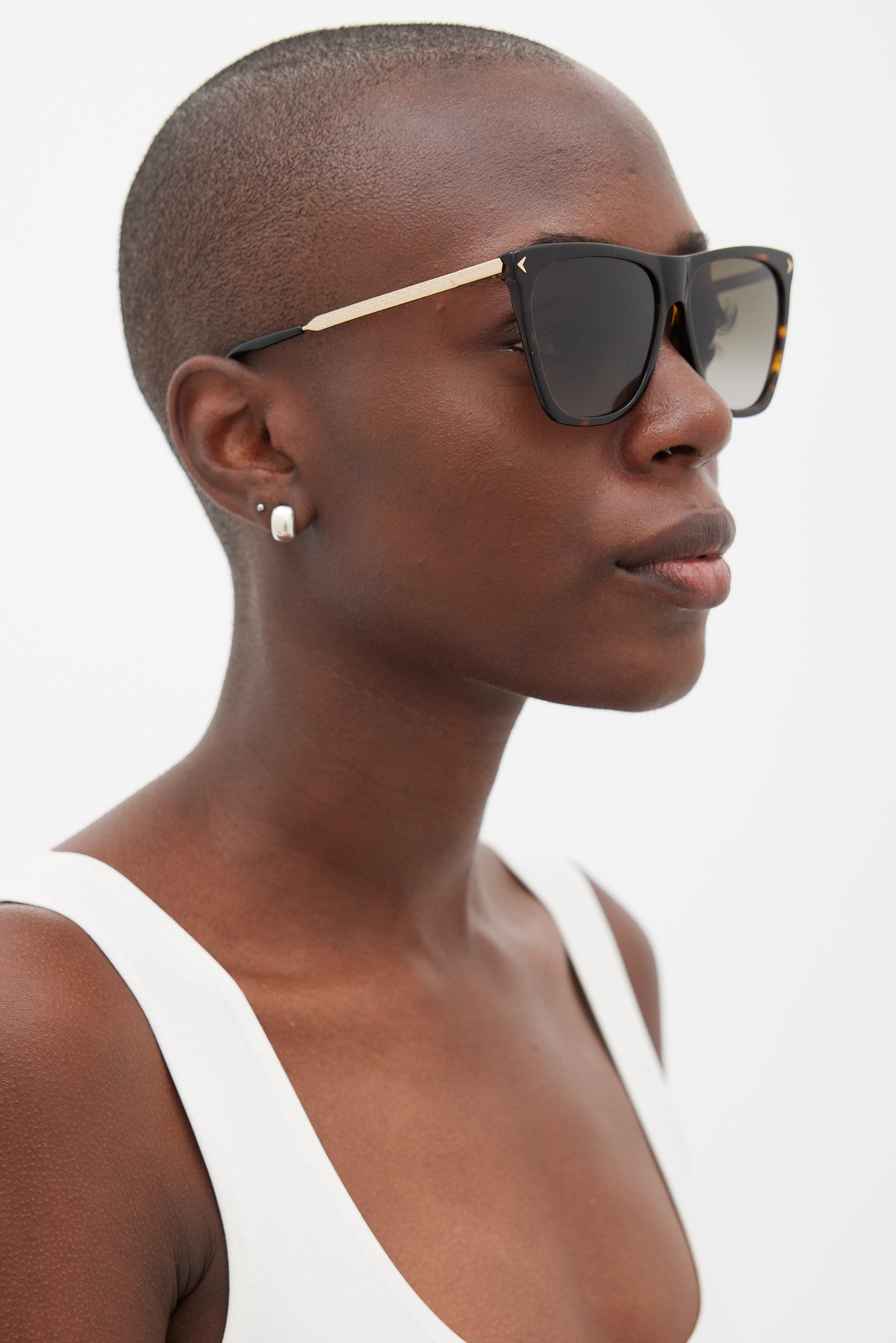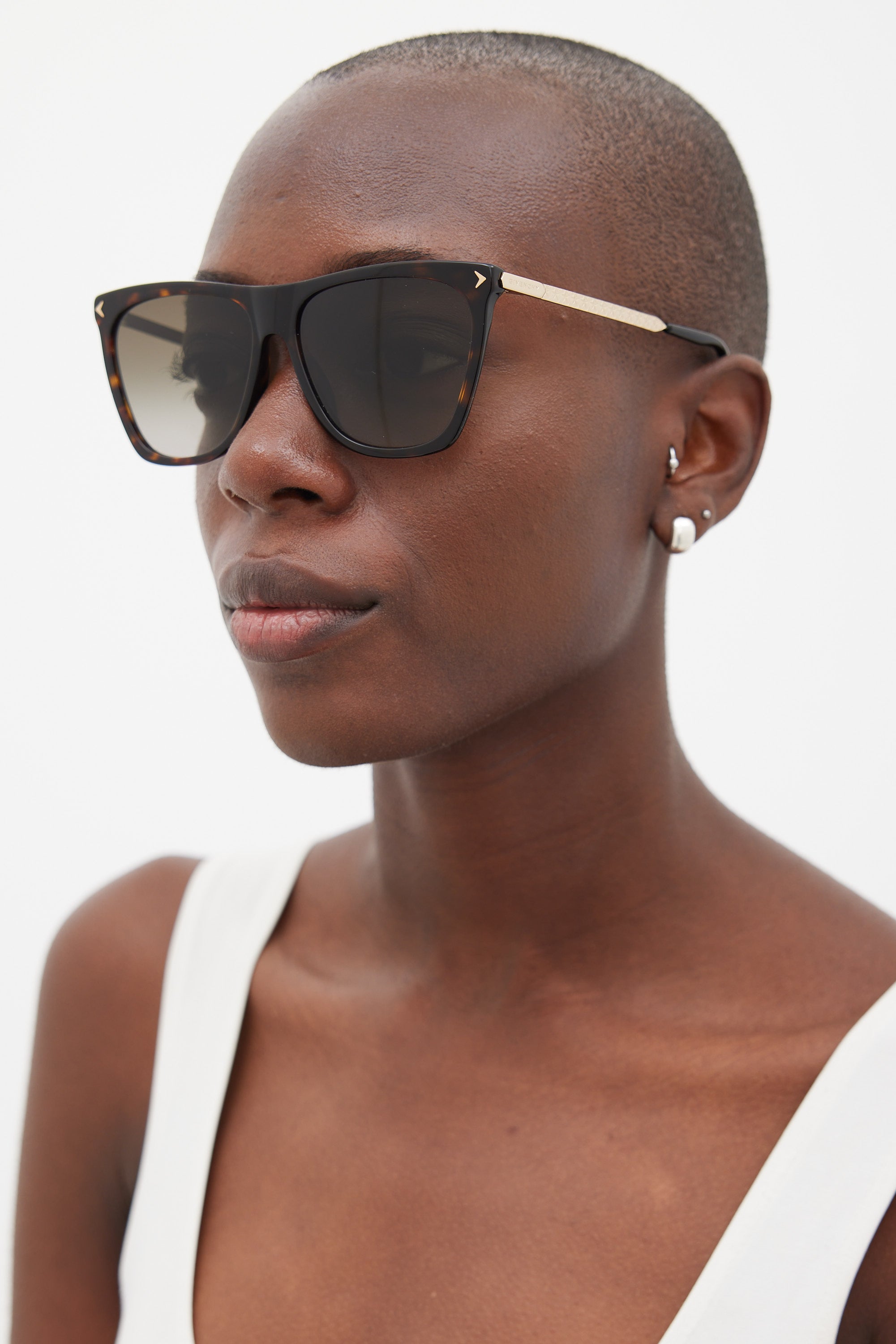 Pre-owned Givenchy GV7096/S sunglasses featuring a brown tortoiseshell rectangular fame, grey lenses, gold tone arms with debossed logo at temple and star motif throughout, and black arm tips. Comes with original case.