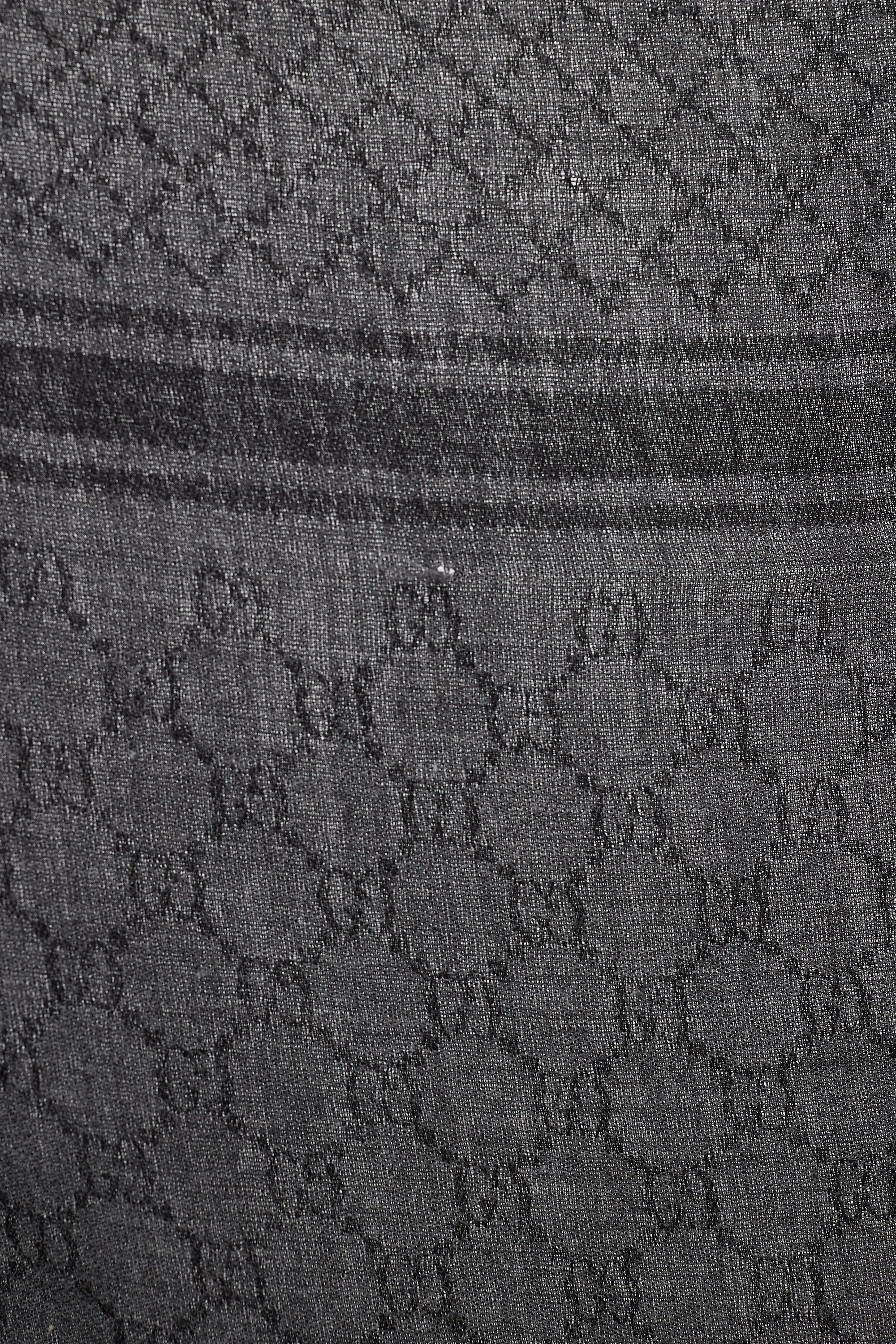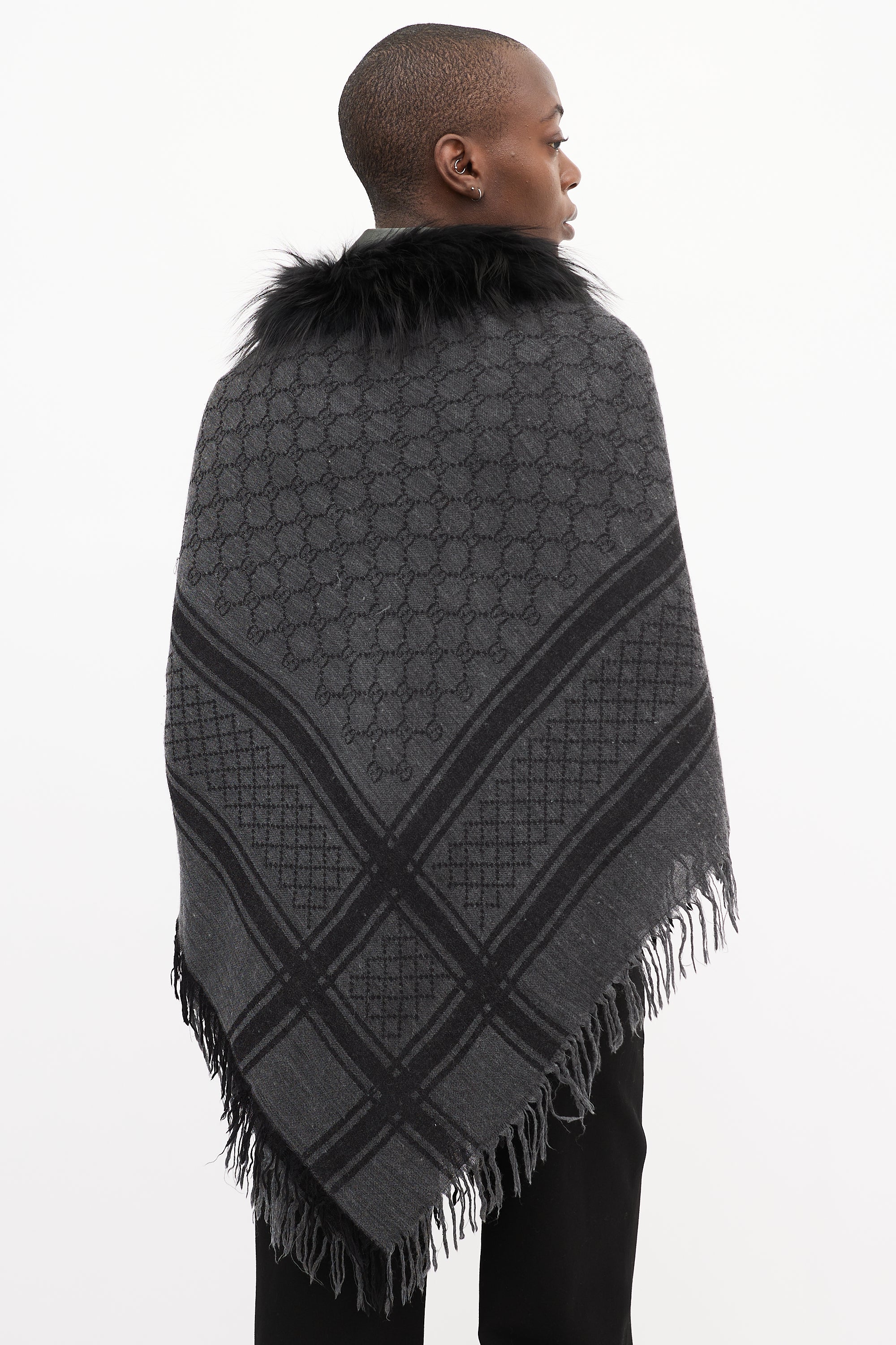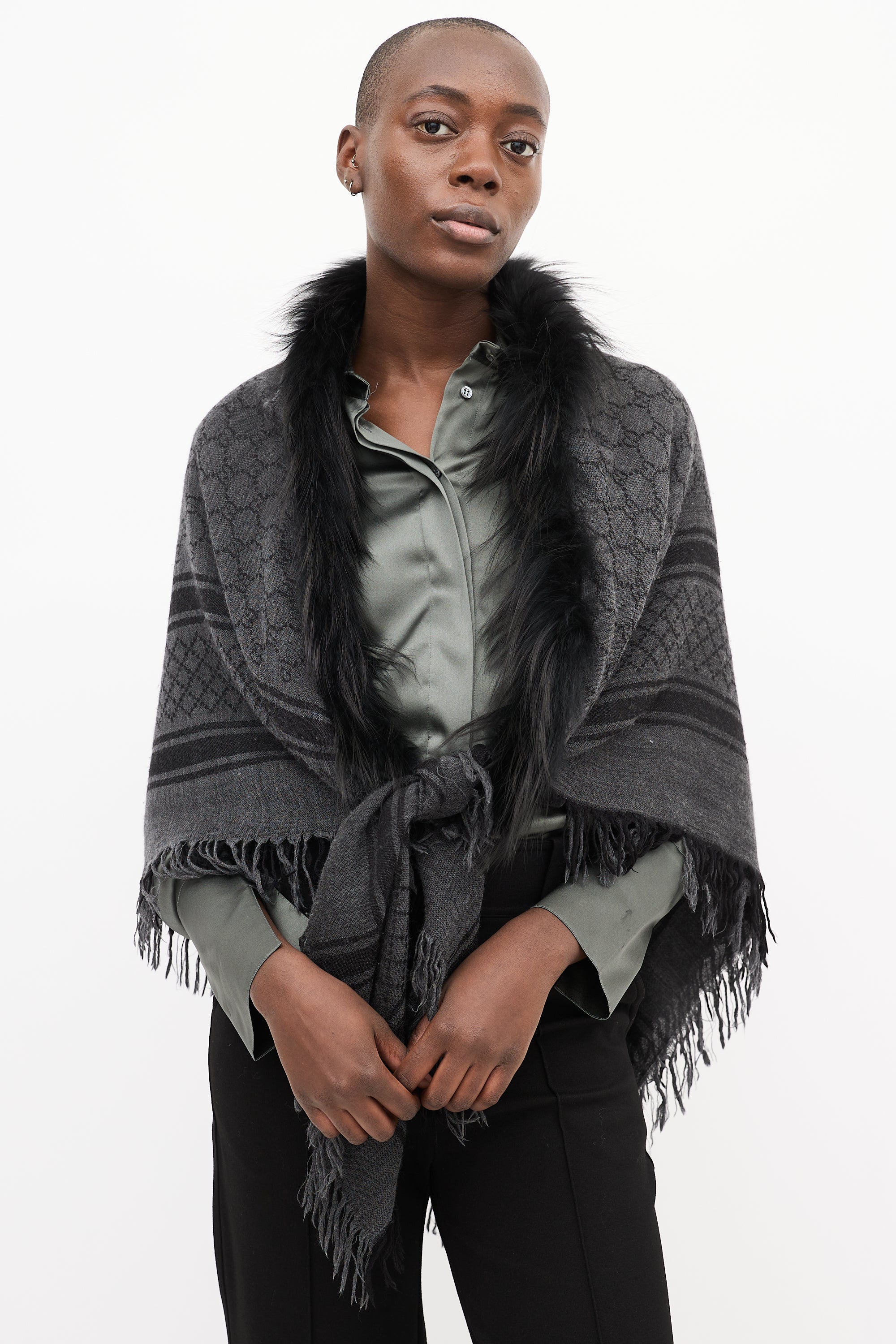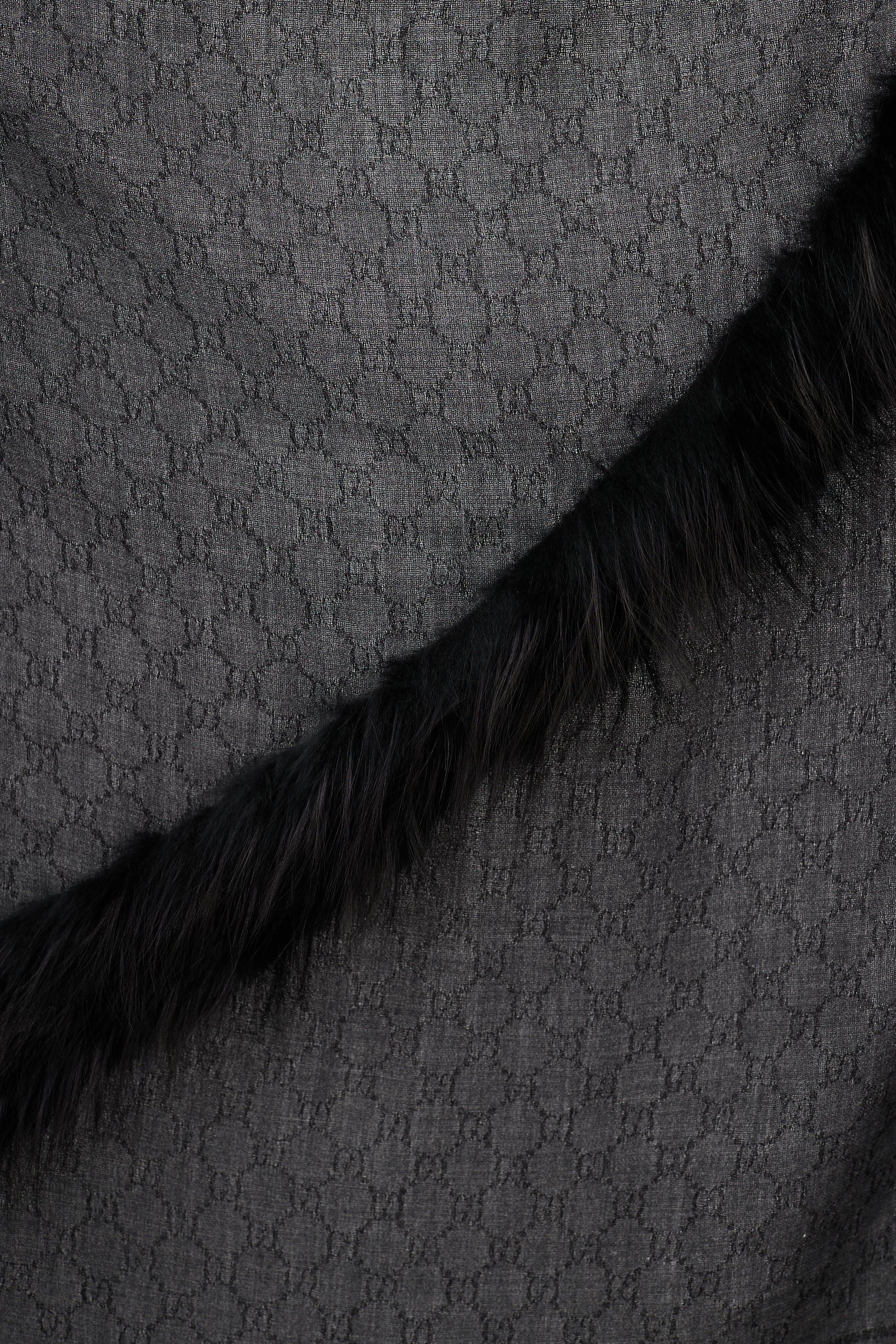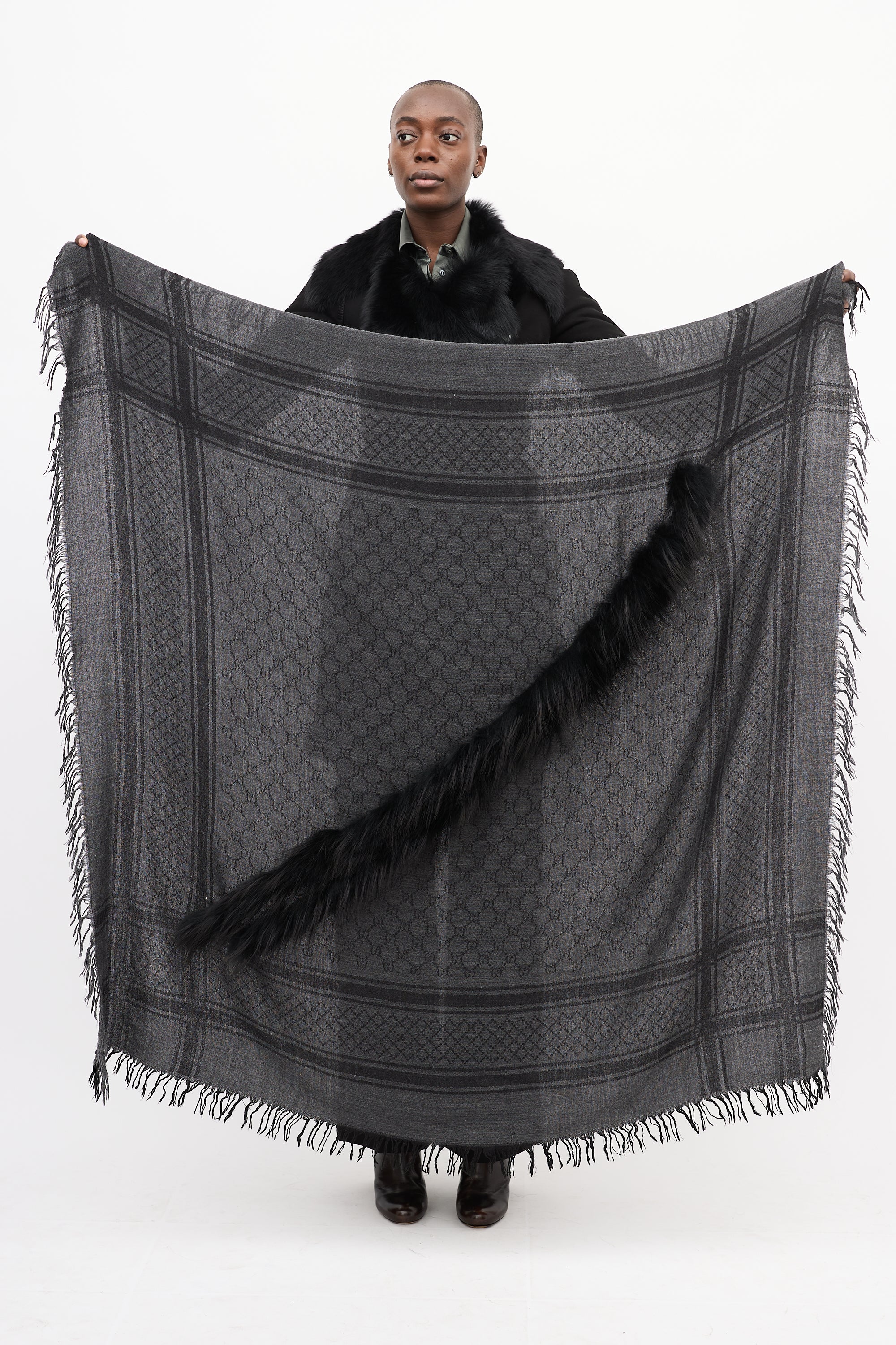 Pre-owned Gucci black and dark grey scarf featuring GG monogram intarsia, striped fringe hem, and fox fur trim.