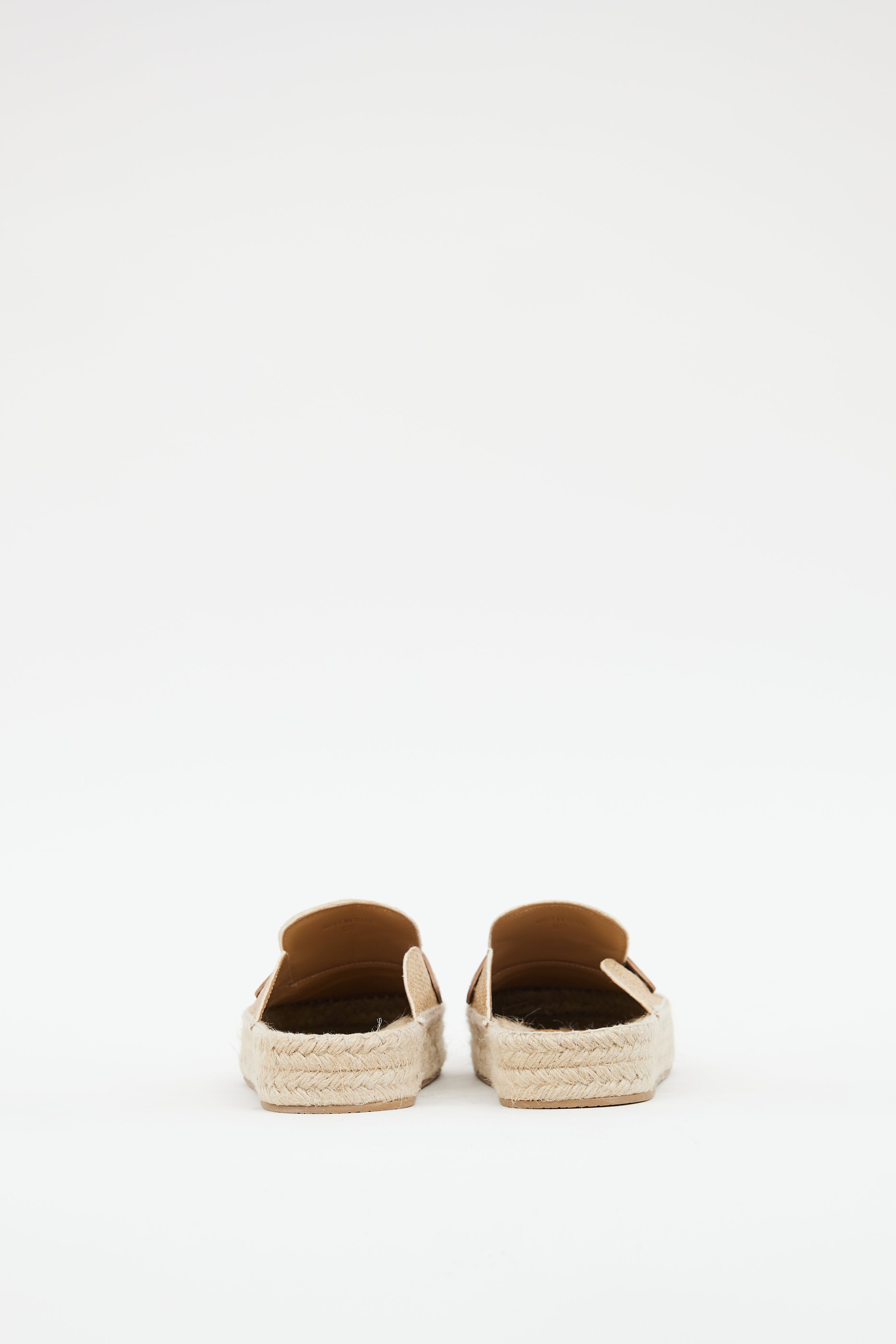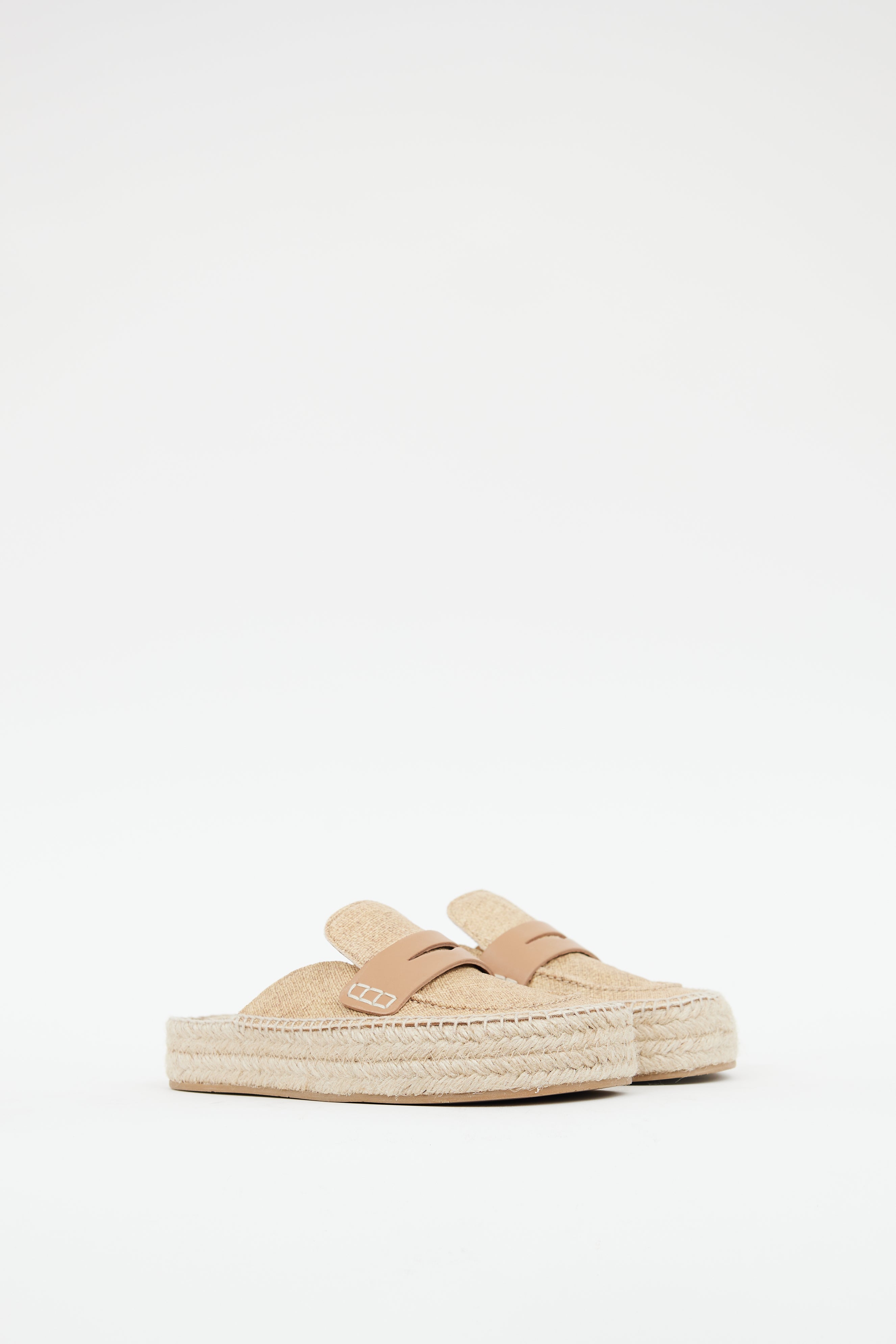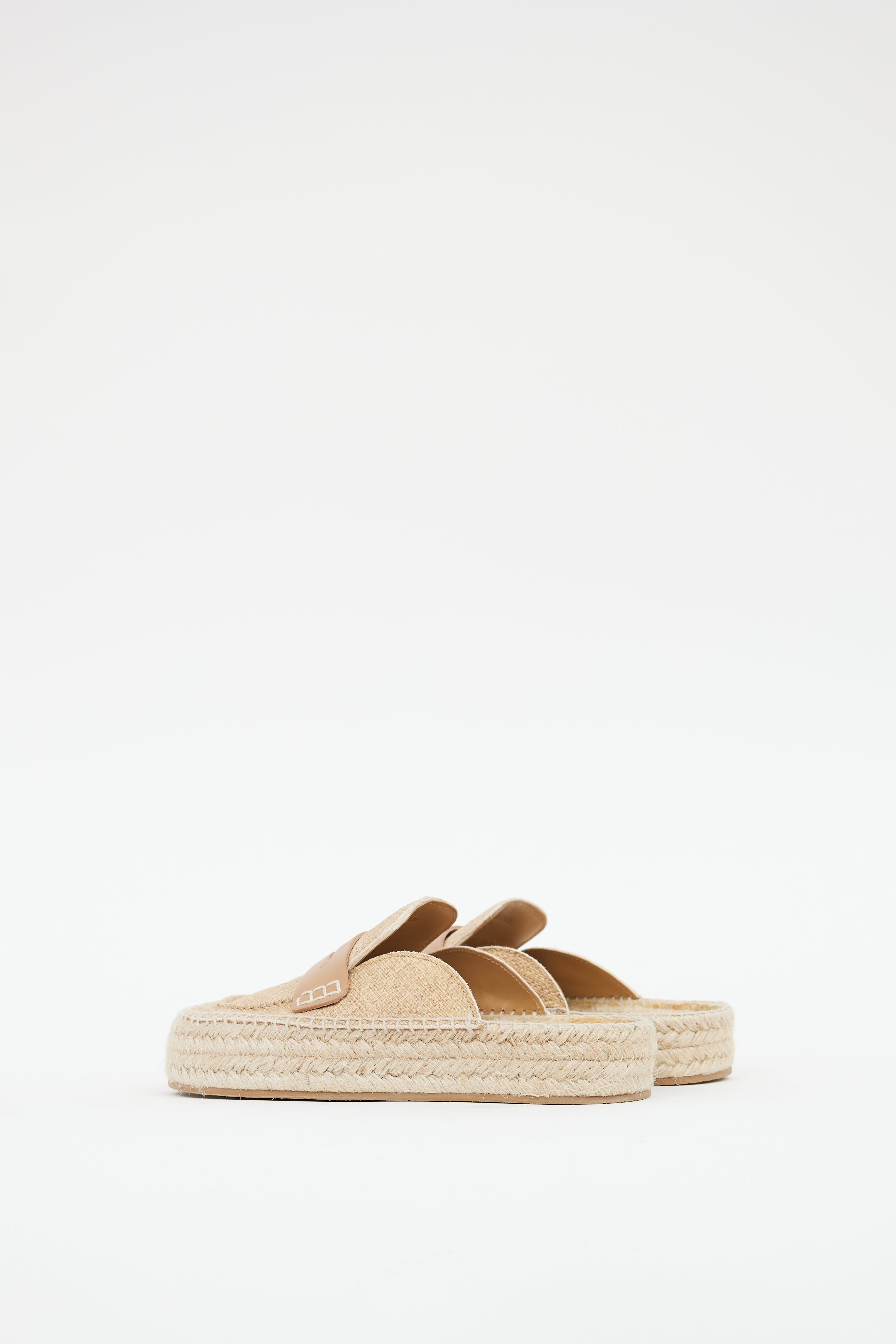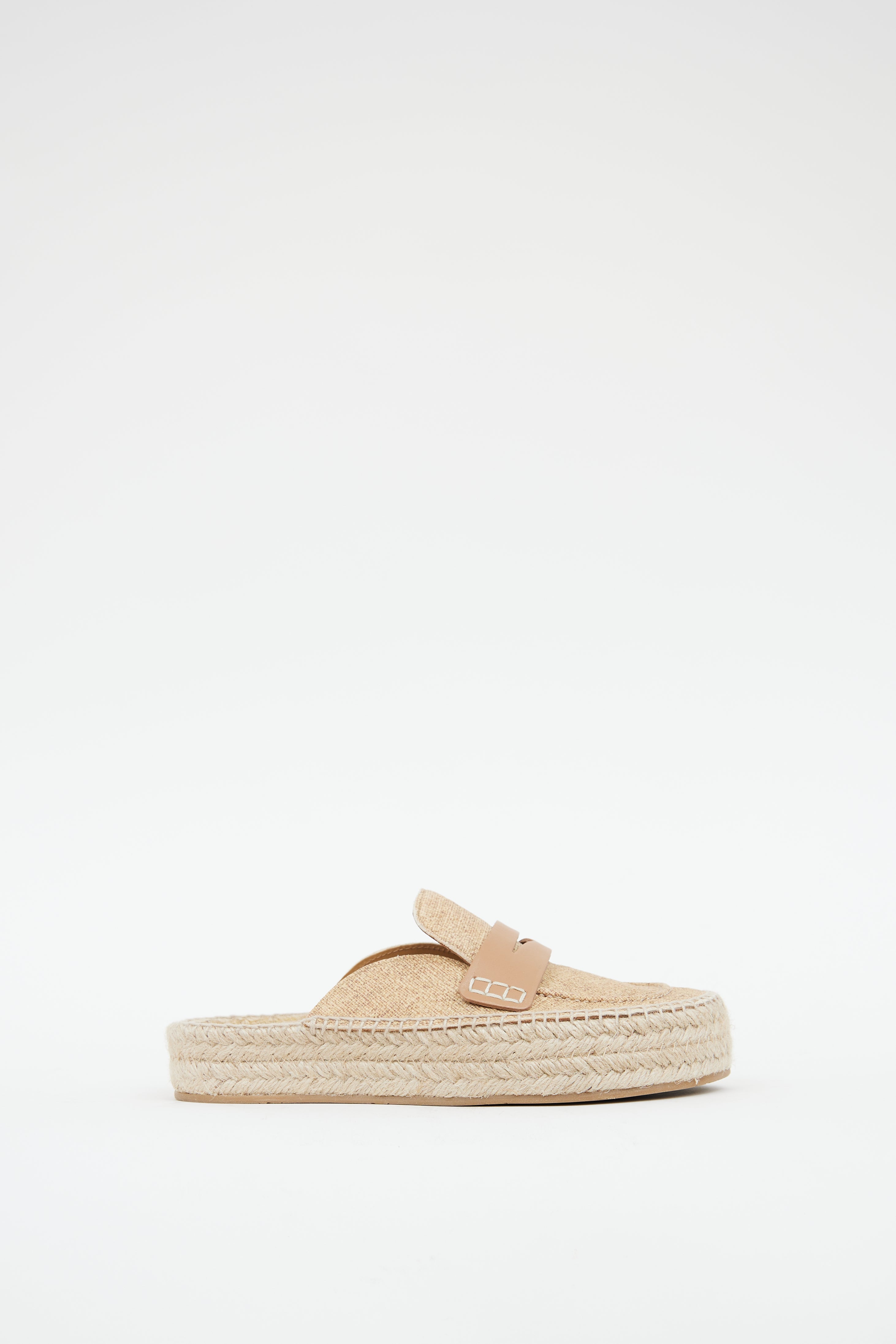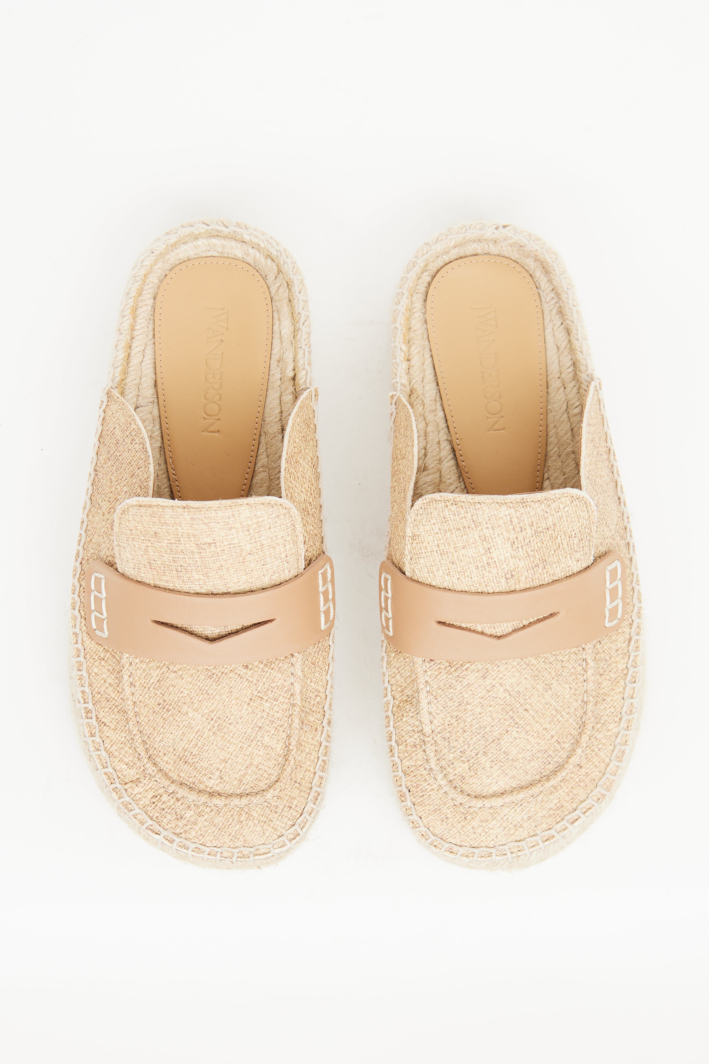 Pre-owned JW Anderson beige mules featuring a round toe, leather strap at vamp, woven upper, raffia midsole, and slip on entry.