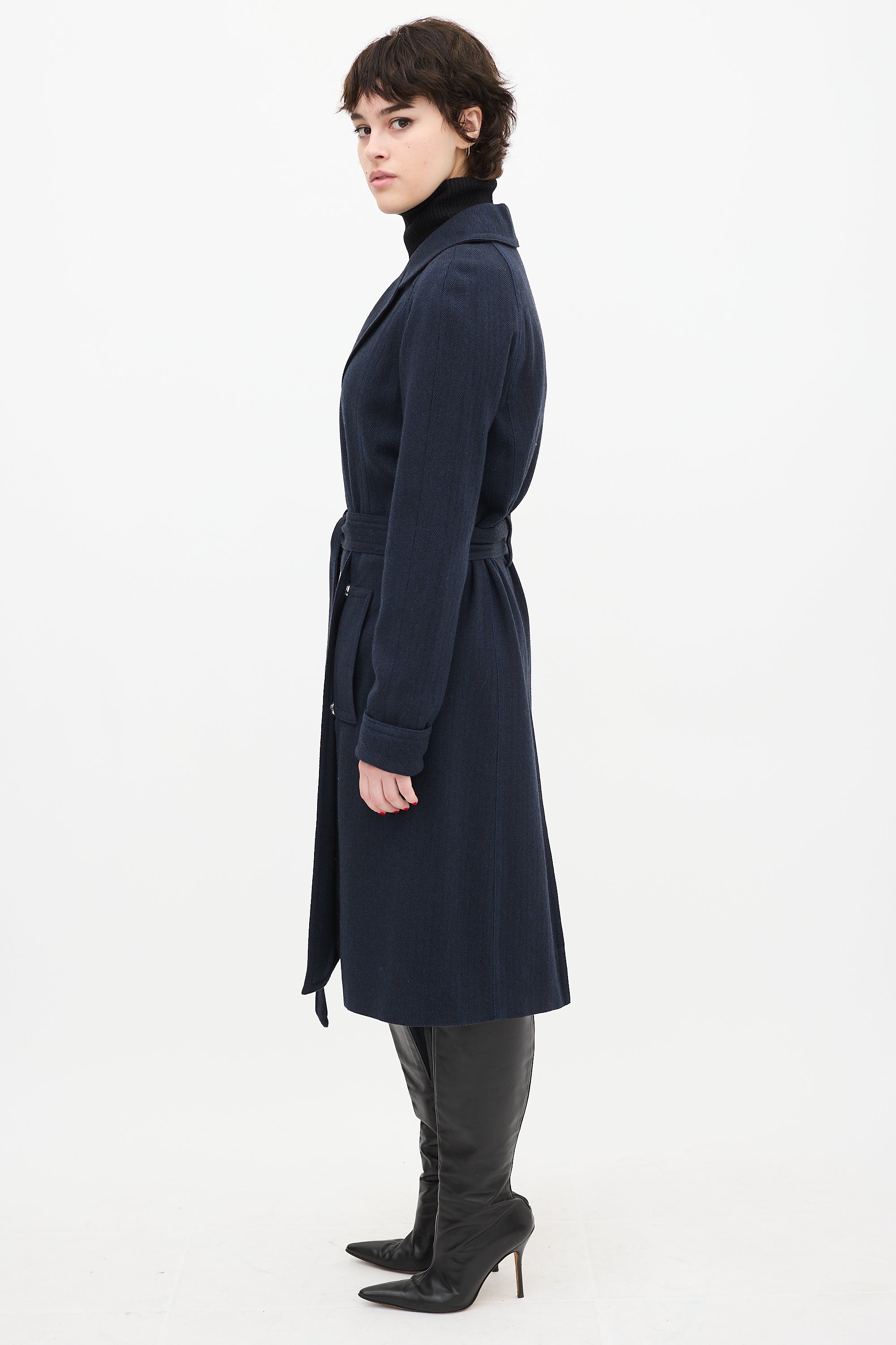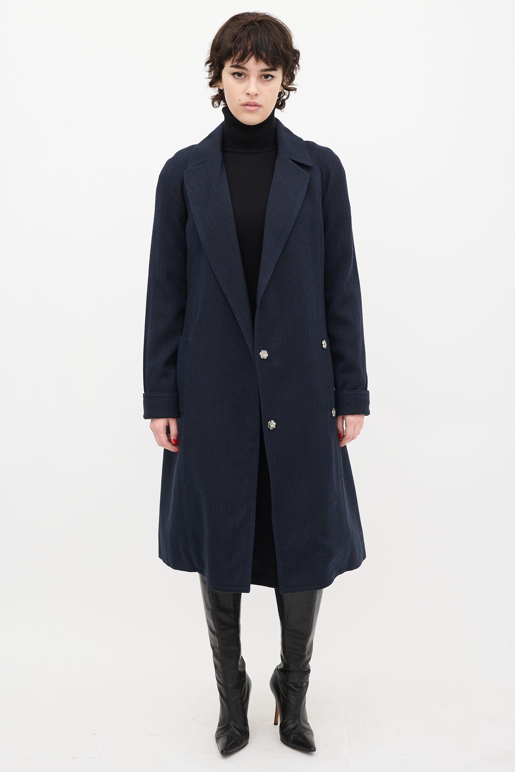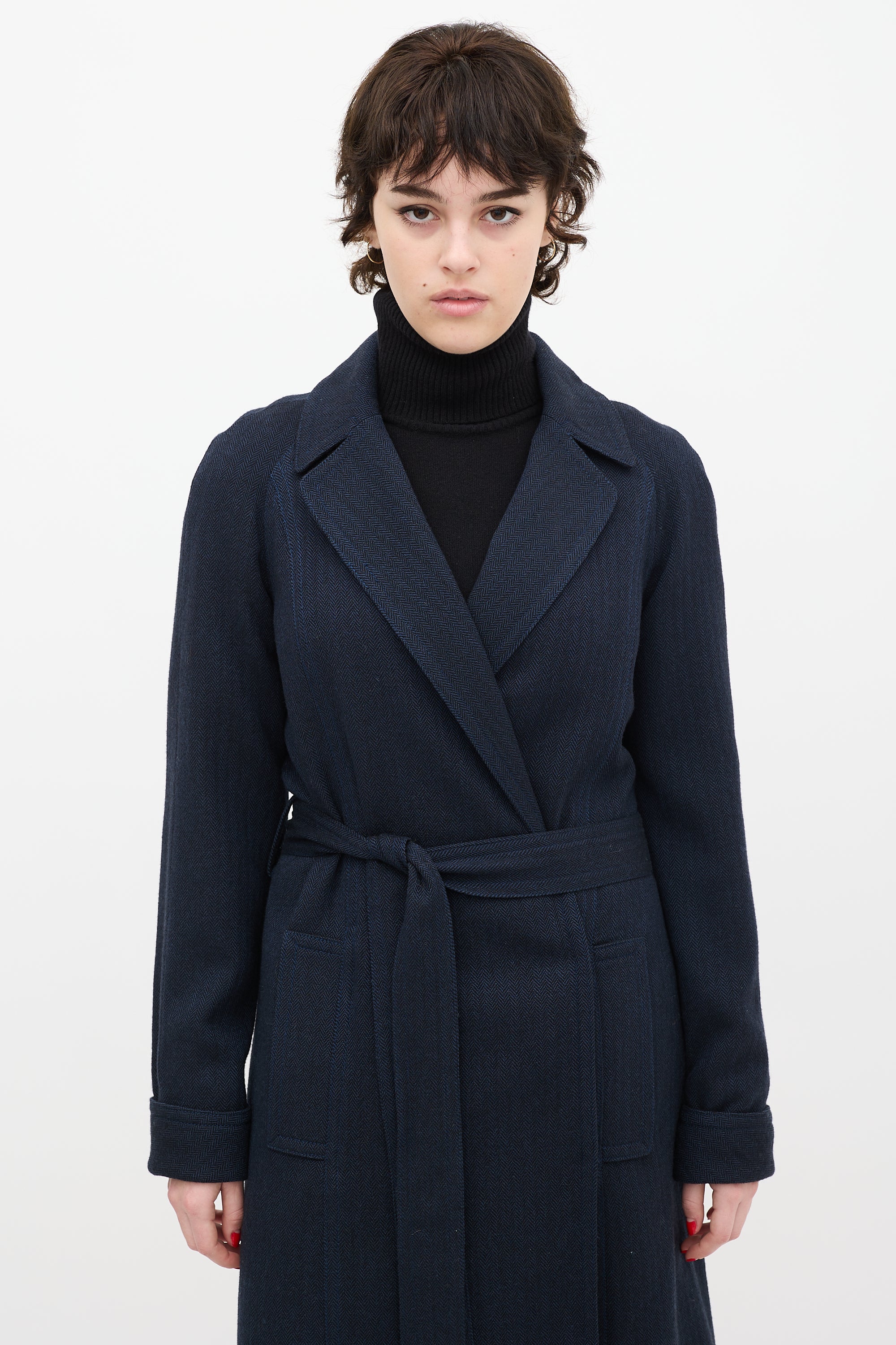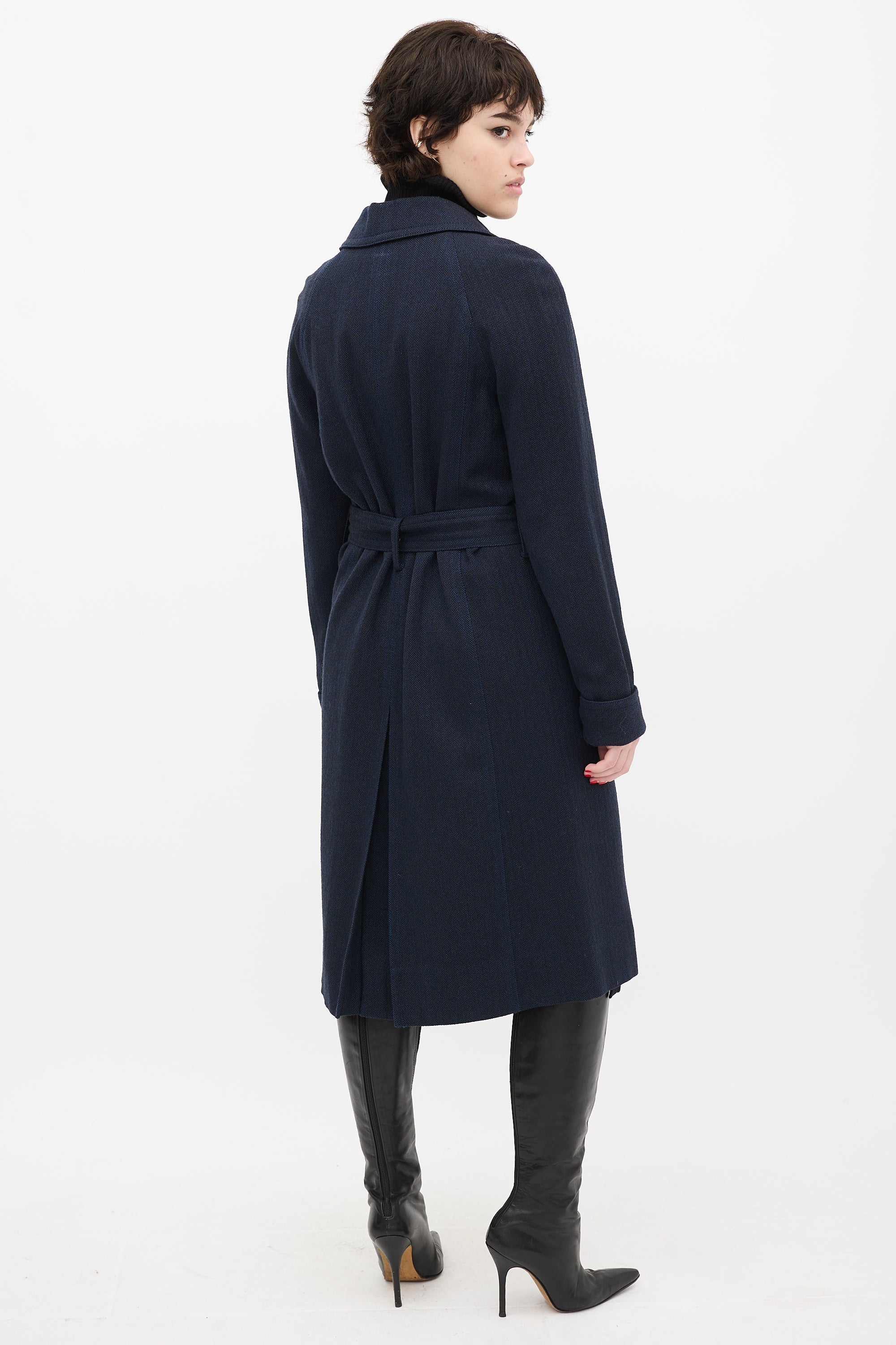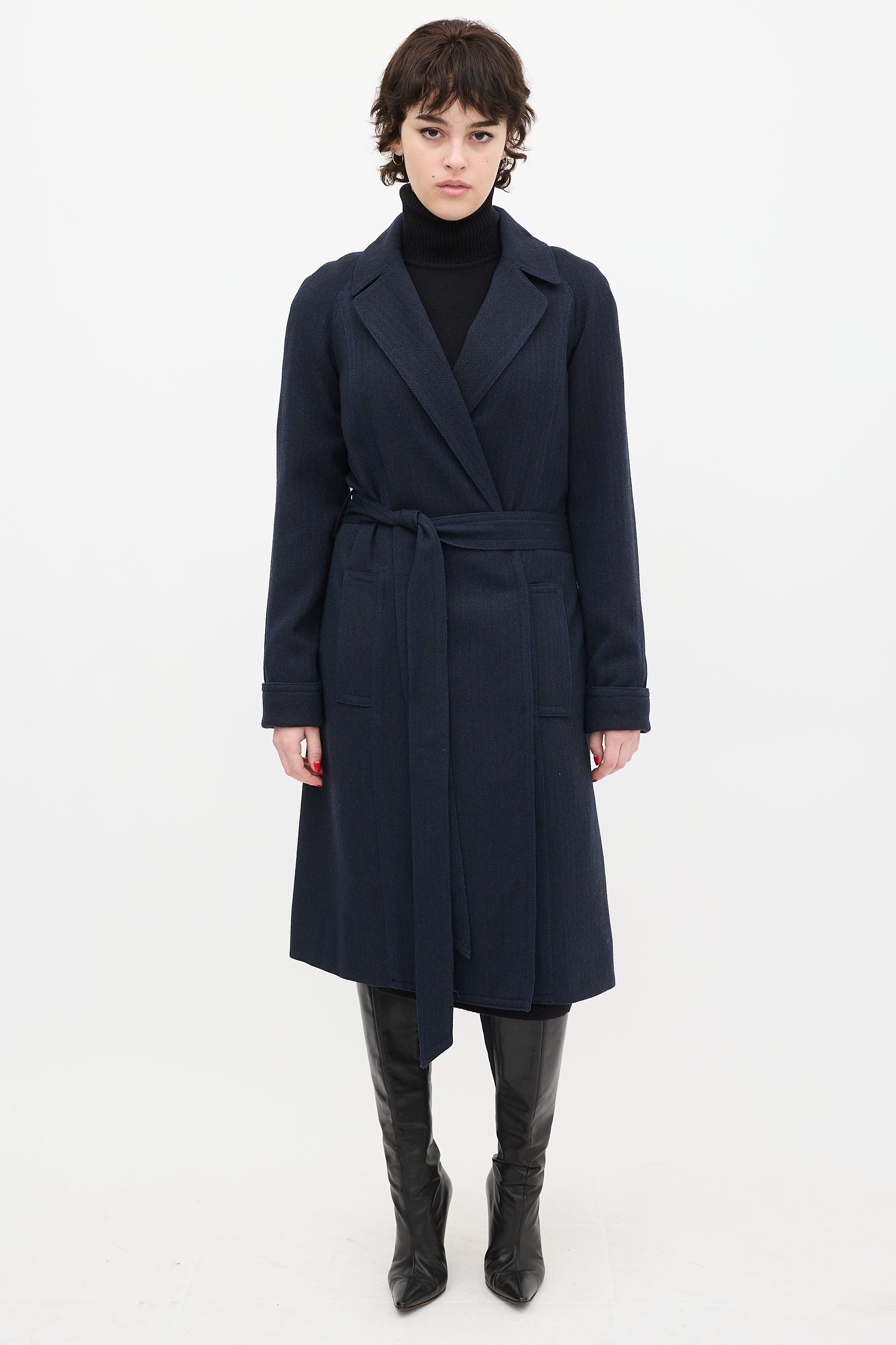 Pre-owned Marc Jacobs navy wool herringbone coat featuring notched lapel, two slip pockets, concealed double breasted snap button front, waist tie, and back pleat at hem.