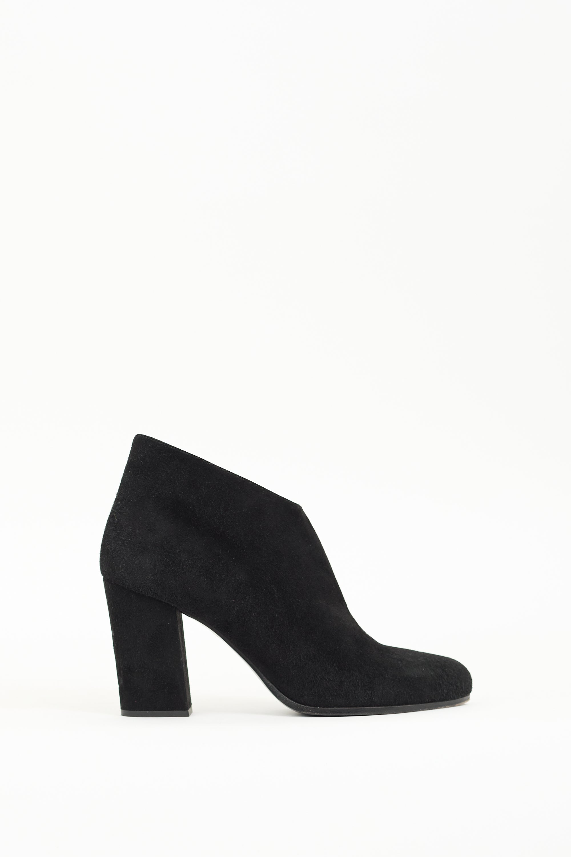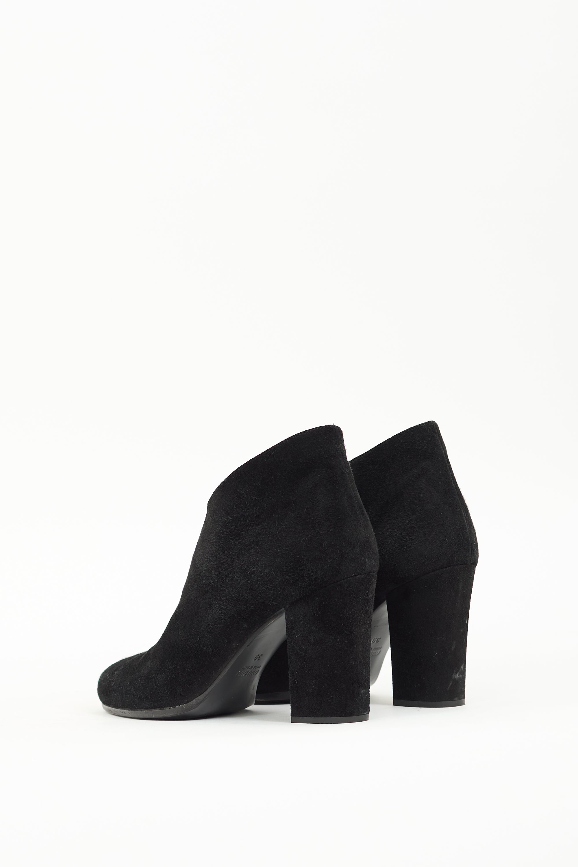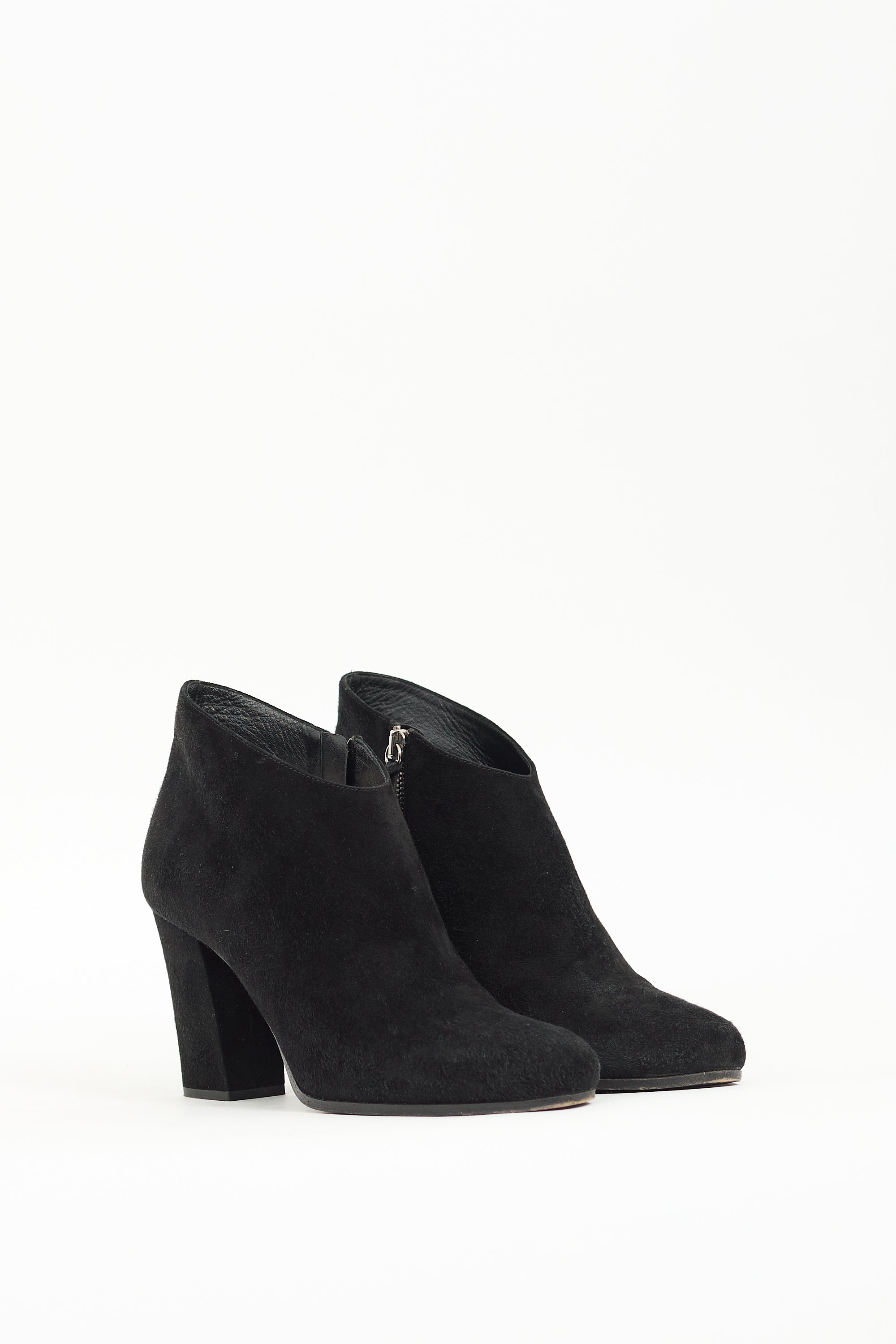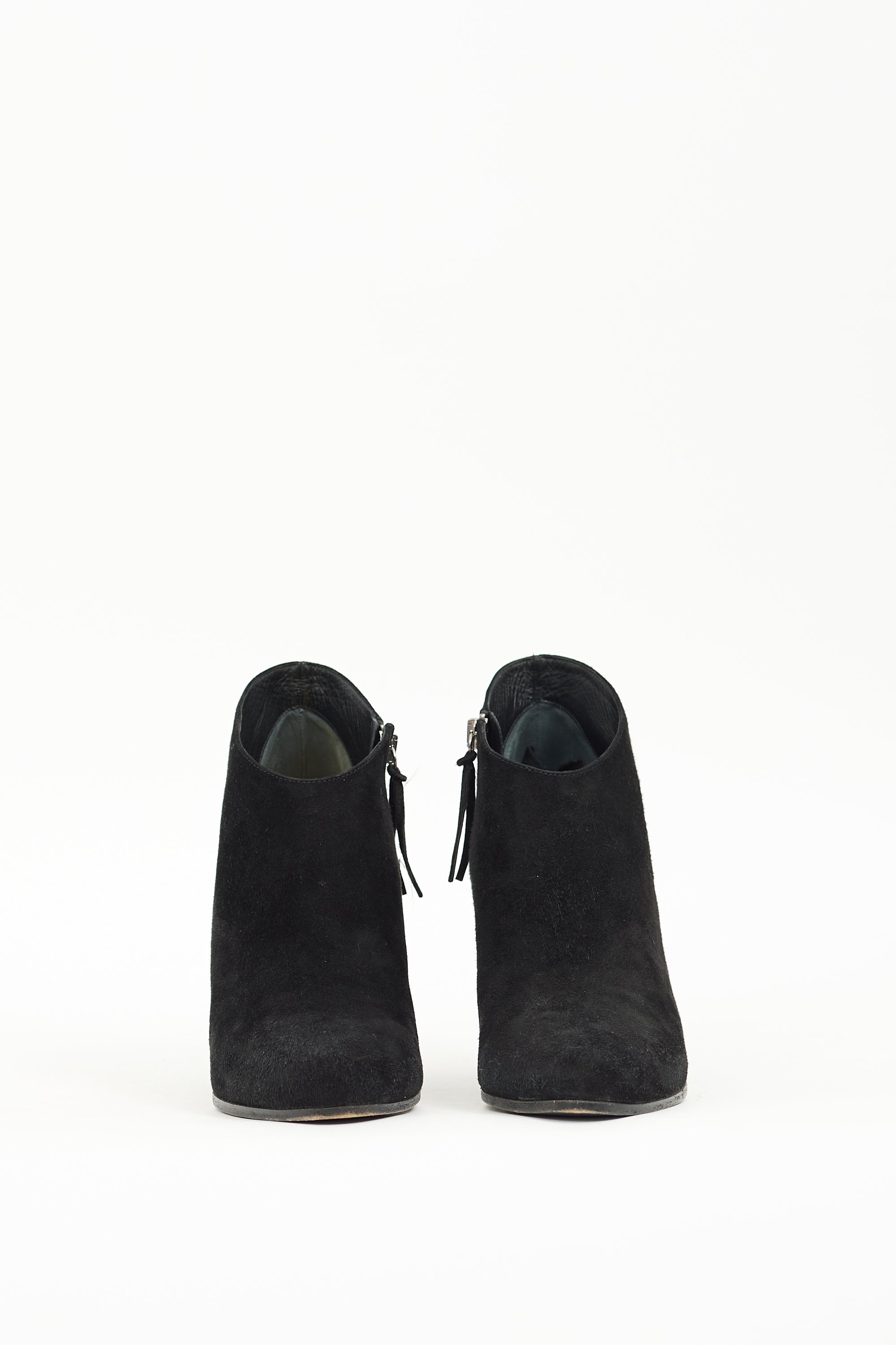 Pre-owned Miu Miu black suede ankle boots featuring rounded toe, side zip closure, and covered block heel.