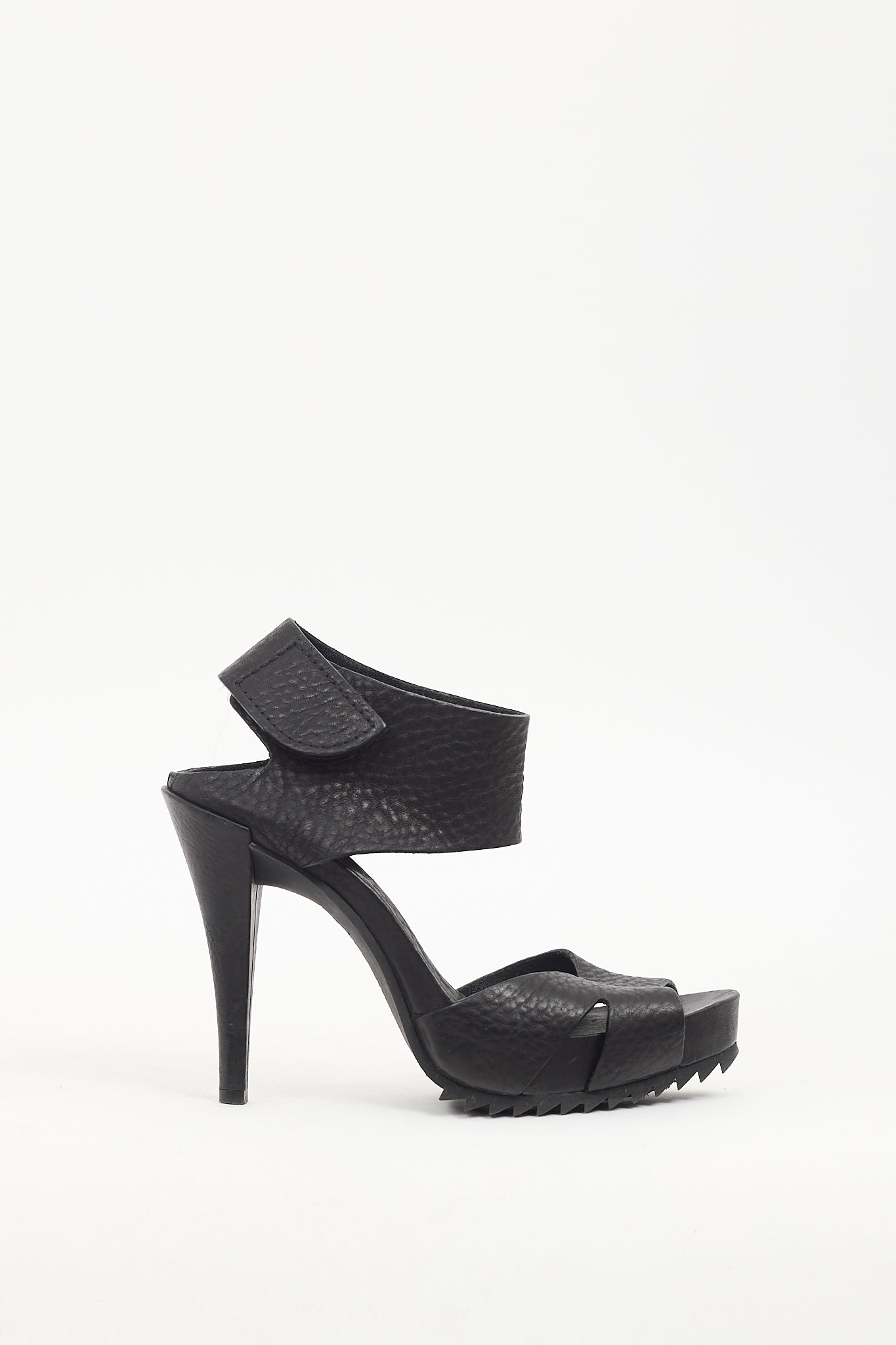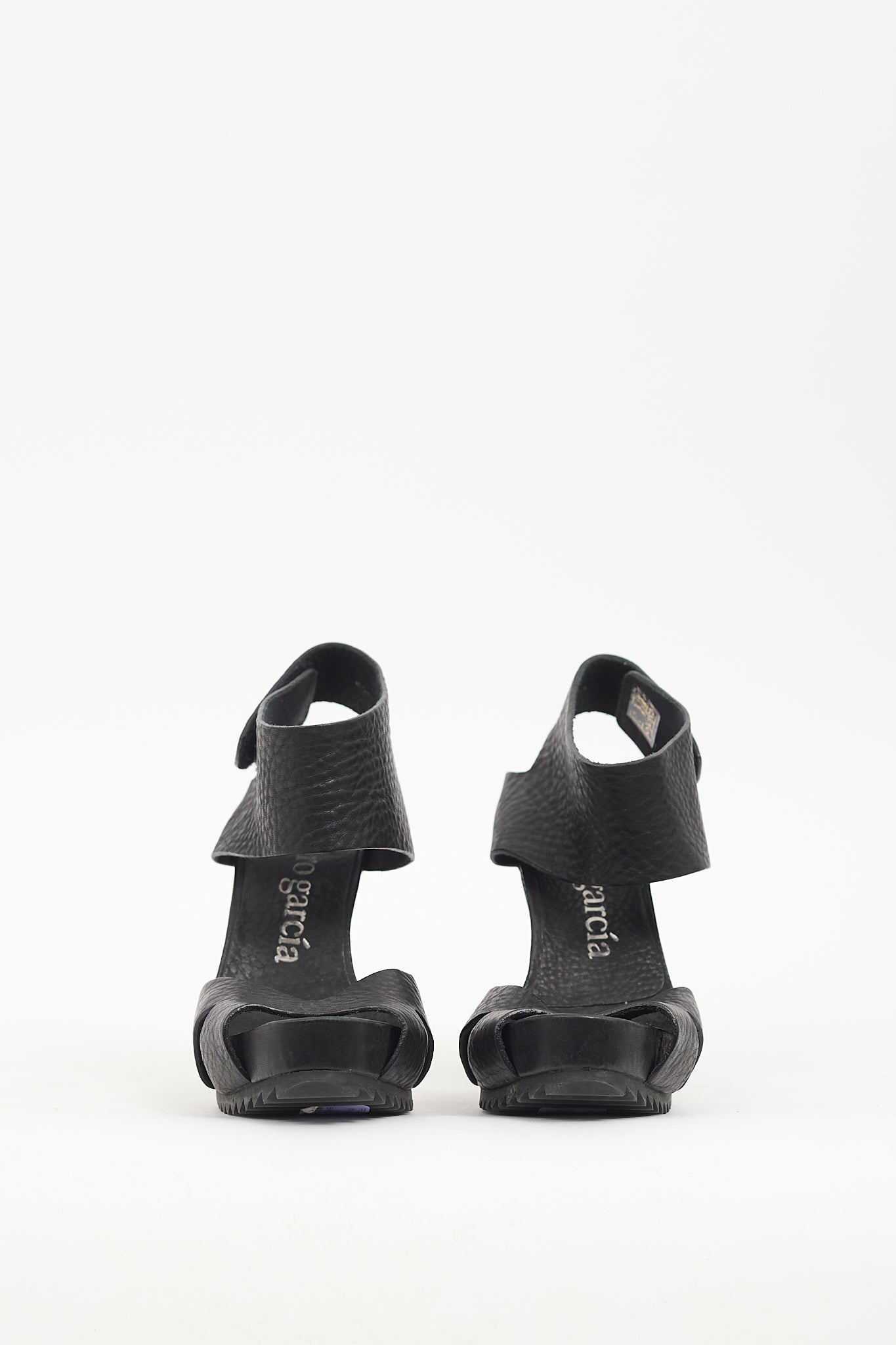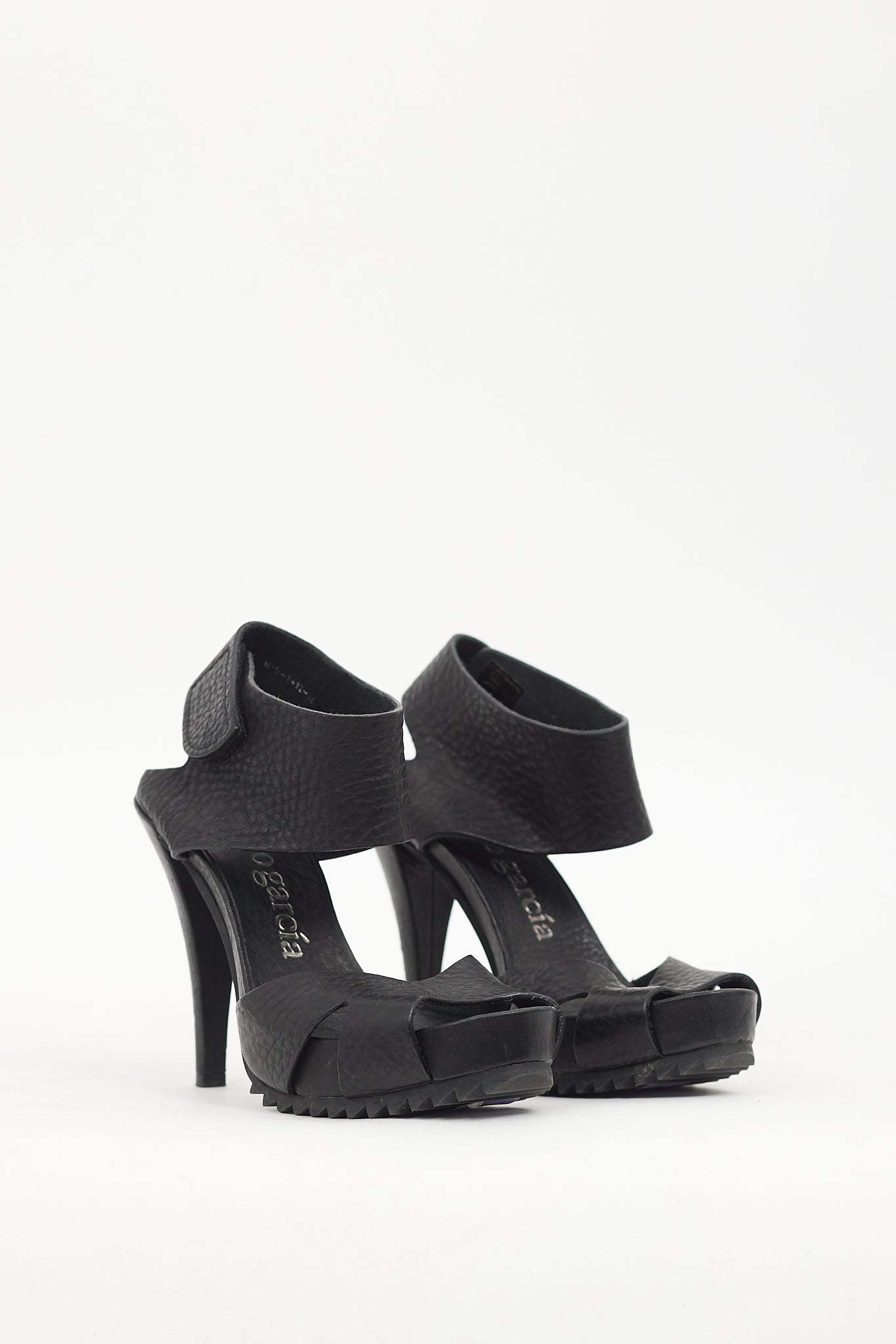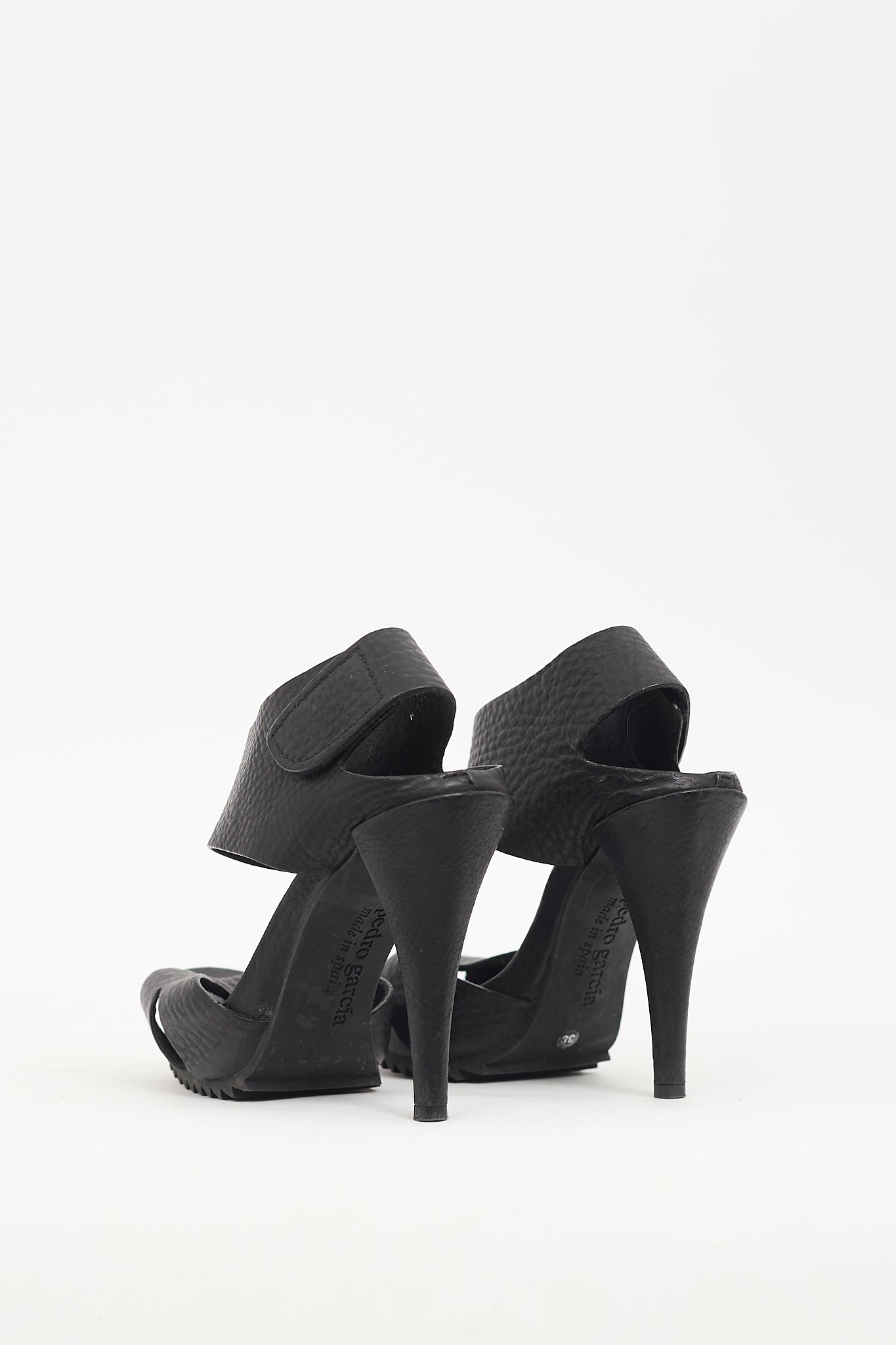 Pre-owned Pedro Garcia black leather heels featuring open almond toe, cut out vamp, covered upper with velcro strap, and covered heel.