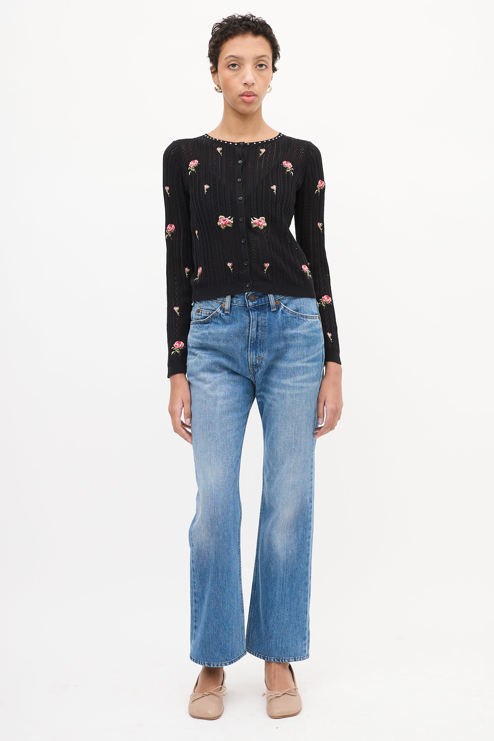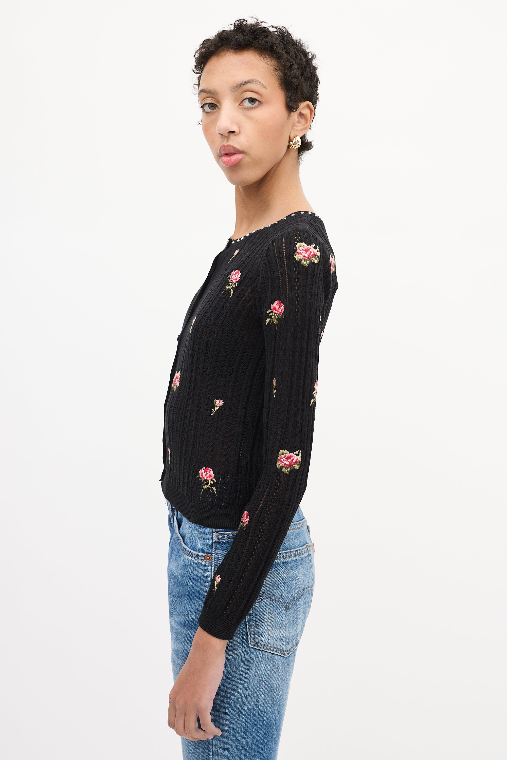 Pre-owned Red Valentino black and multicolour knit cardigan featuring a round neckline with silver tone stud embellishments, button up front closure, decorative weave throughout, embroidered floral motifs throughout, and ribbed neck, hem, and cuffs.