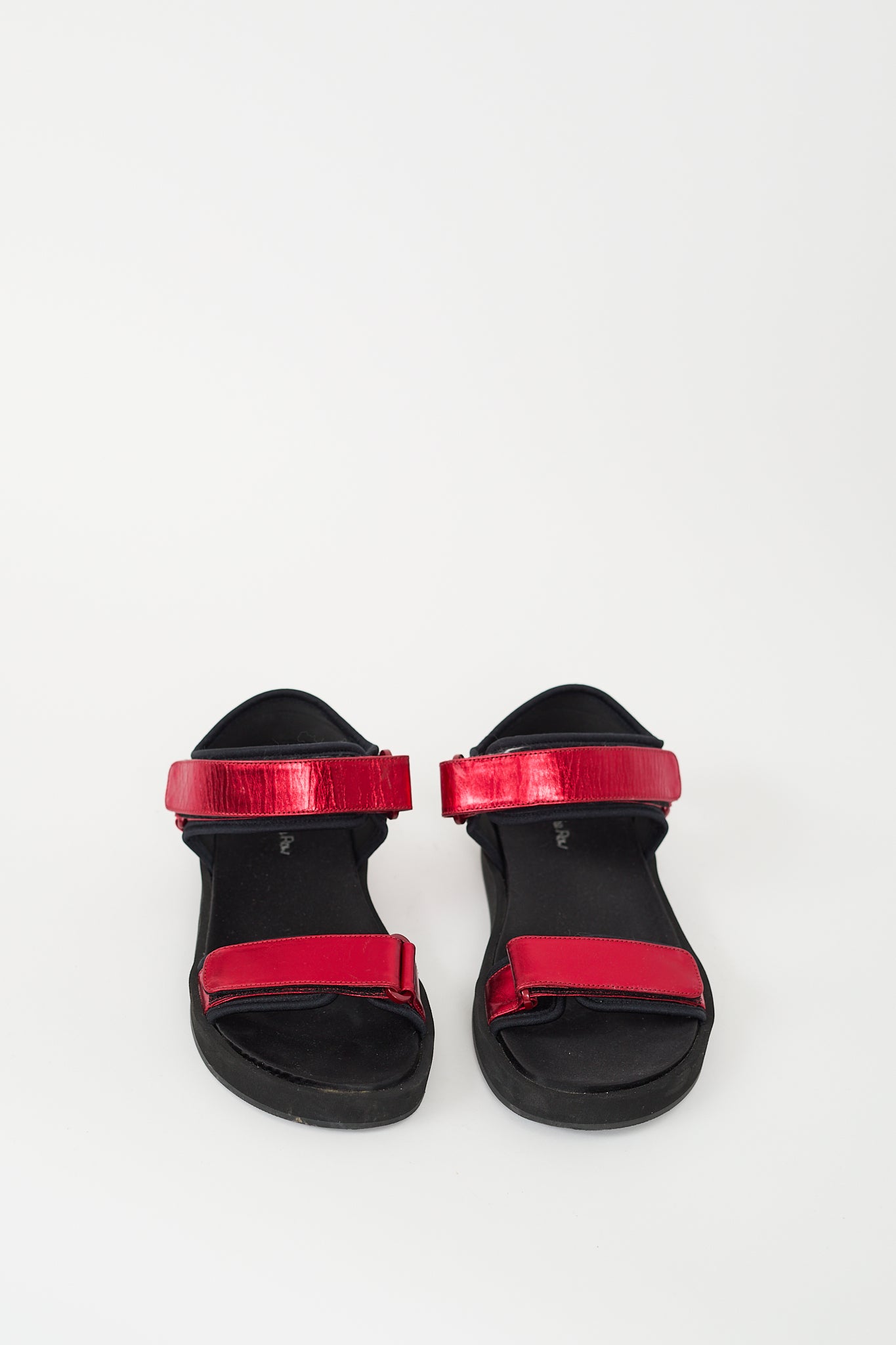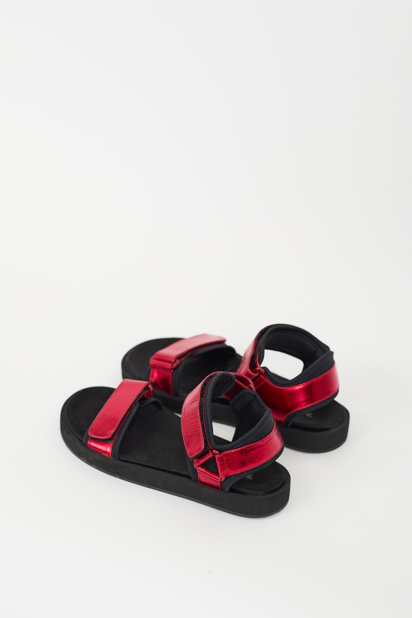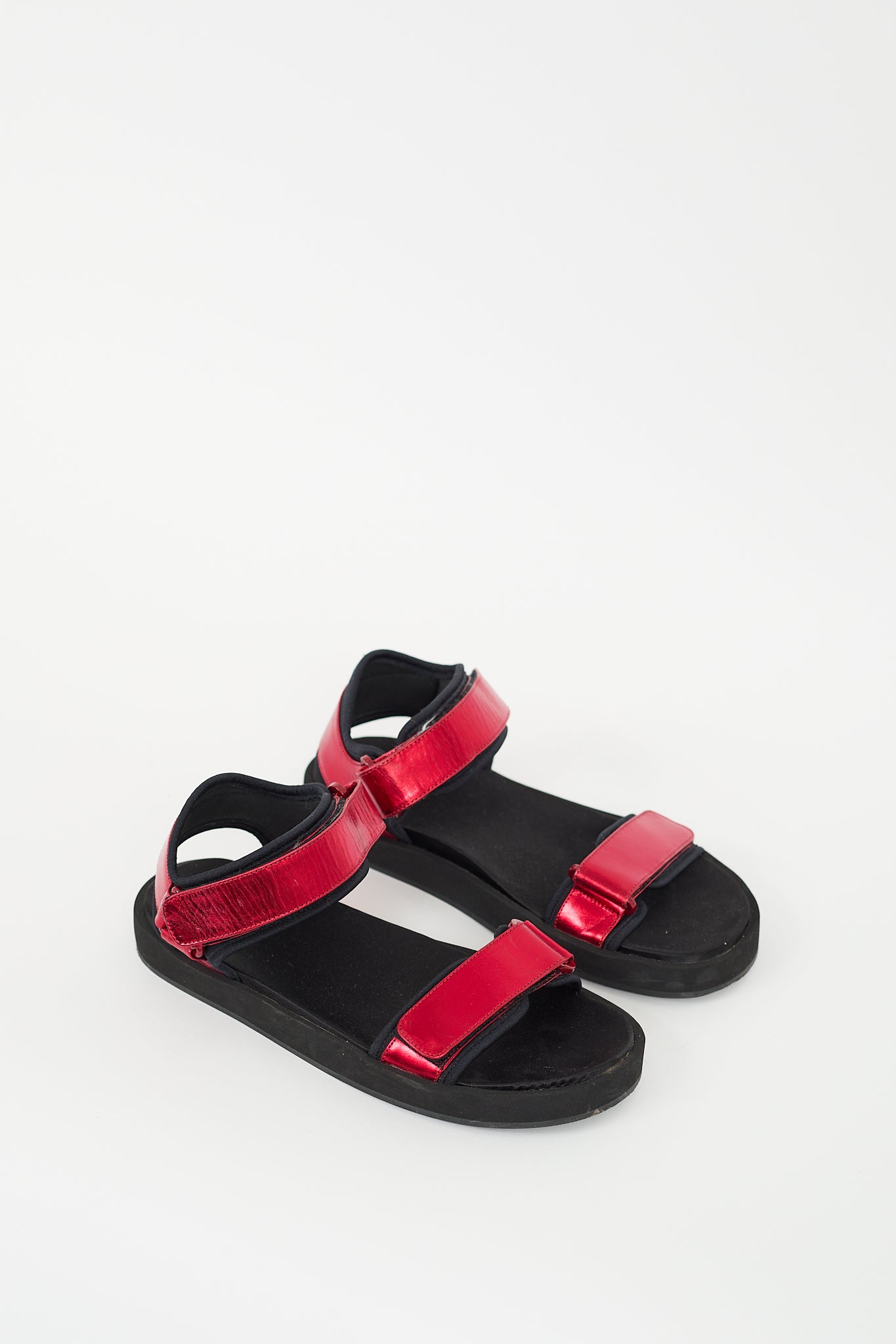 Pre-owned The Row red and black metallic Hook and Loop sandals featuring rounded toe, Velcro straps at vamp and ankle, and black platform outsole.