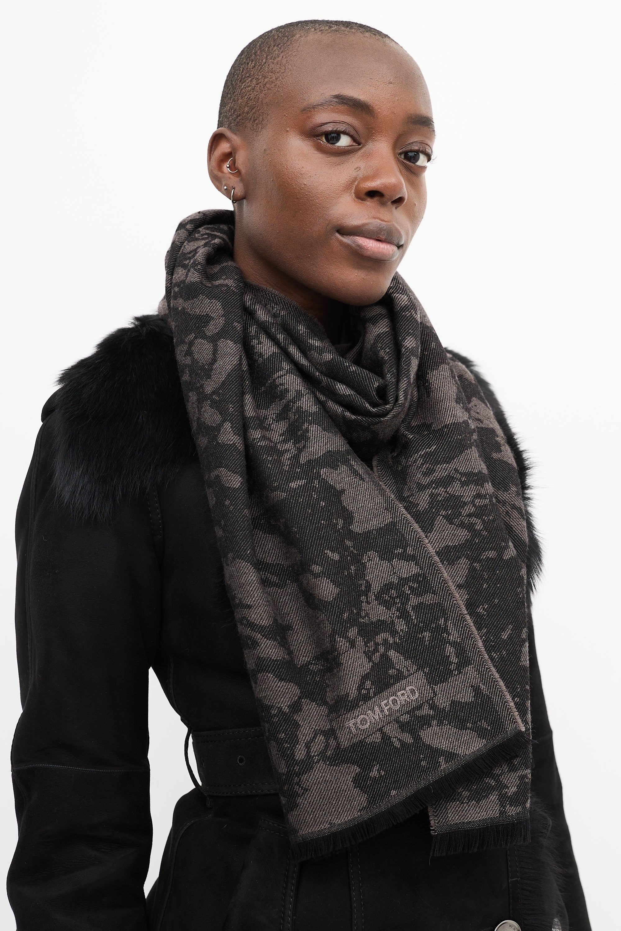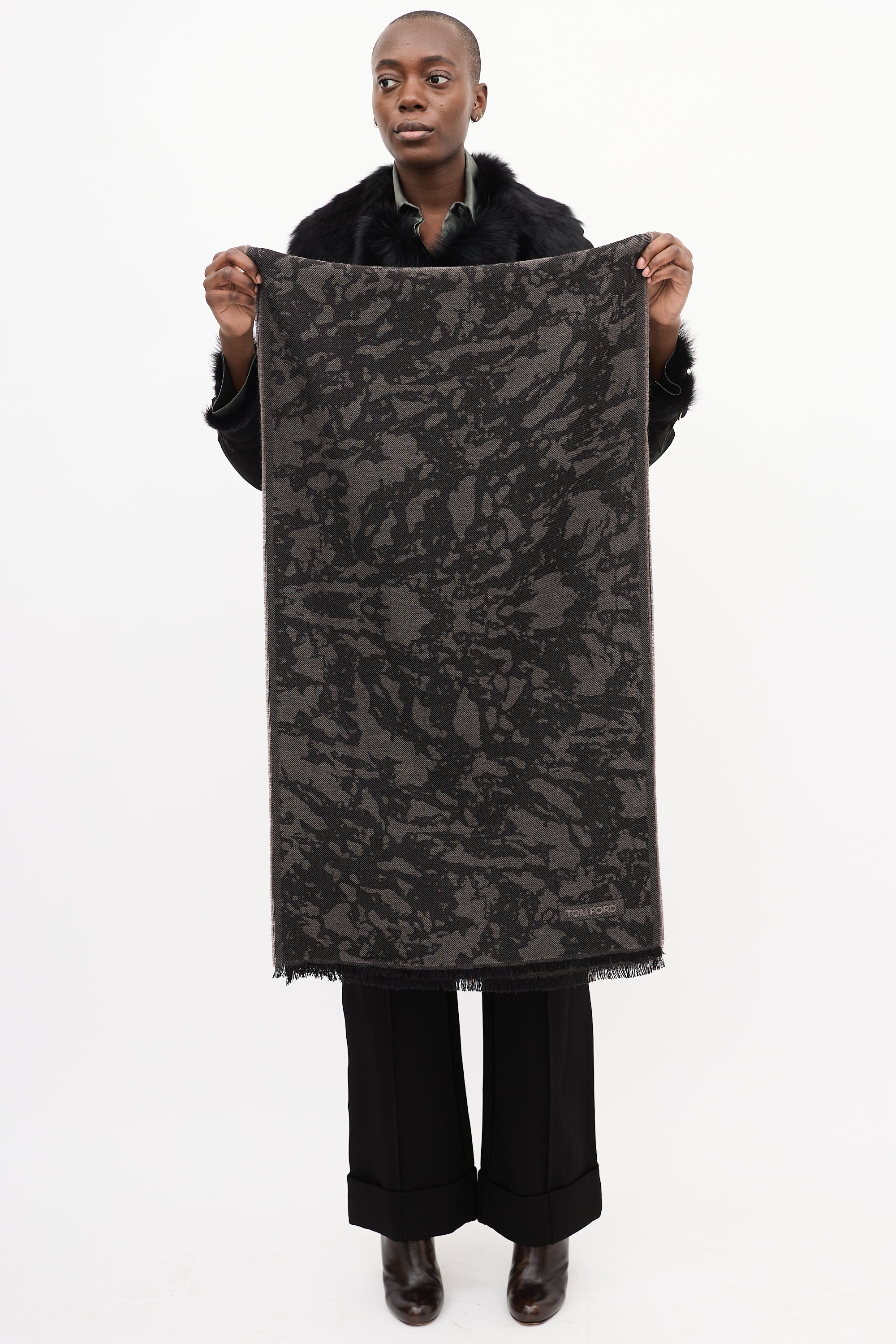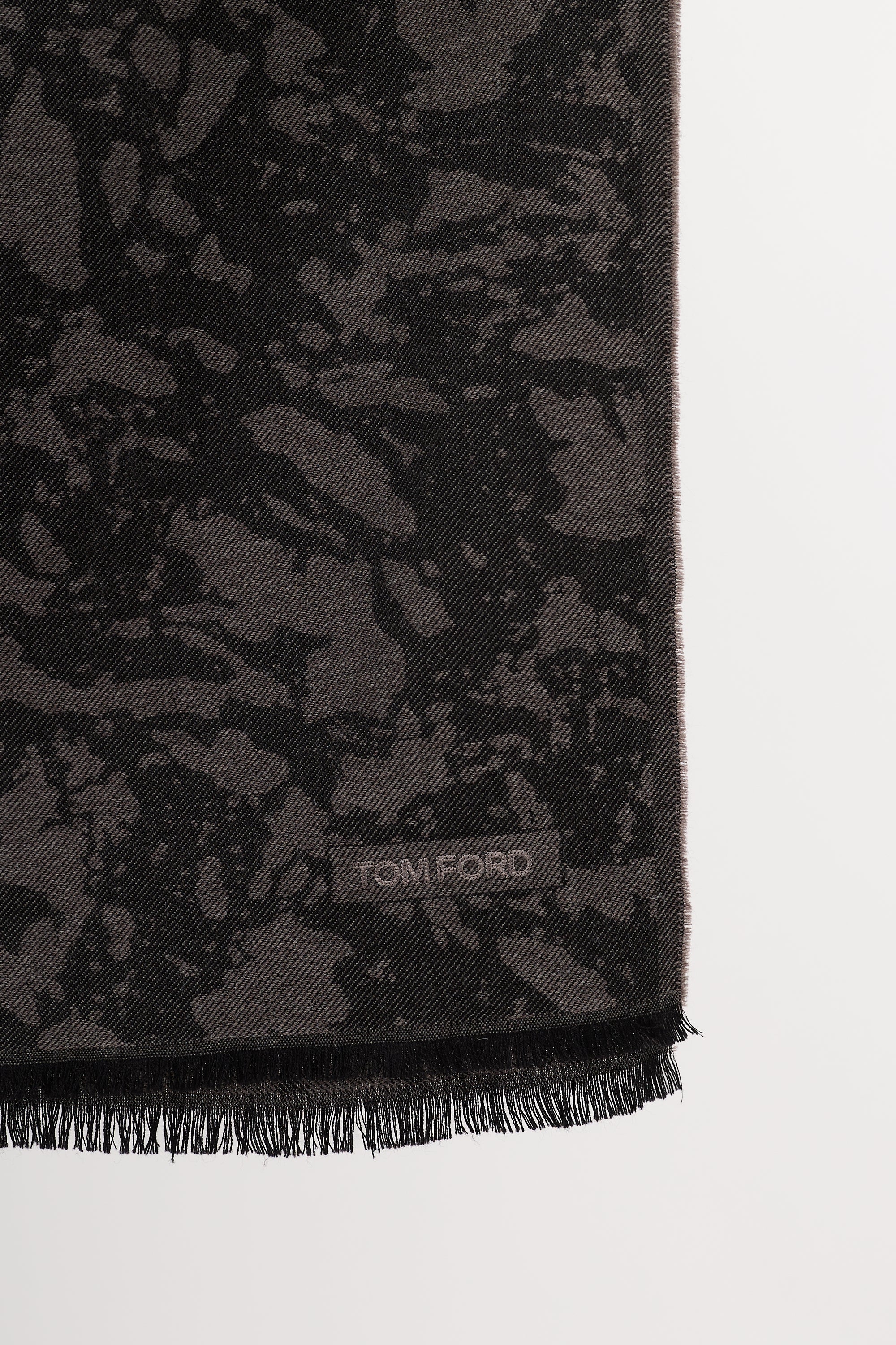 Pre-owned Tom Ford black and grey wool scarf featuring camouflage intarsia, embroidered logo, and black fringe hem.