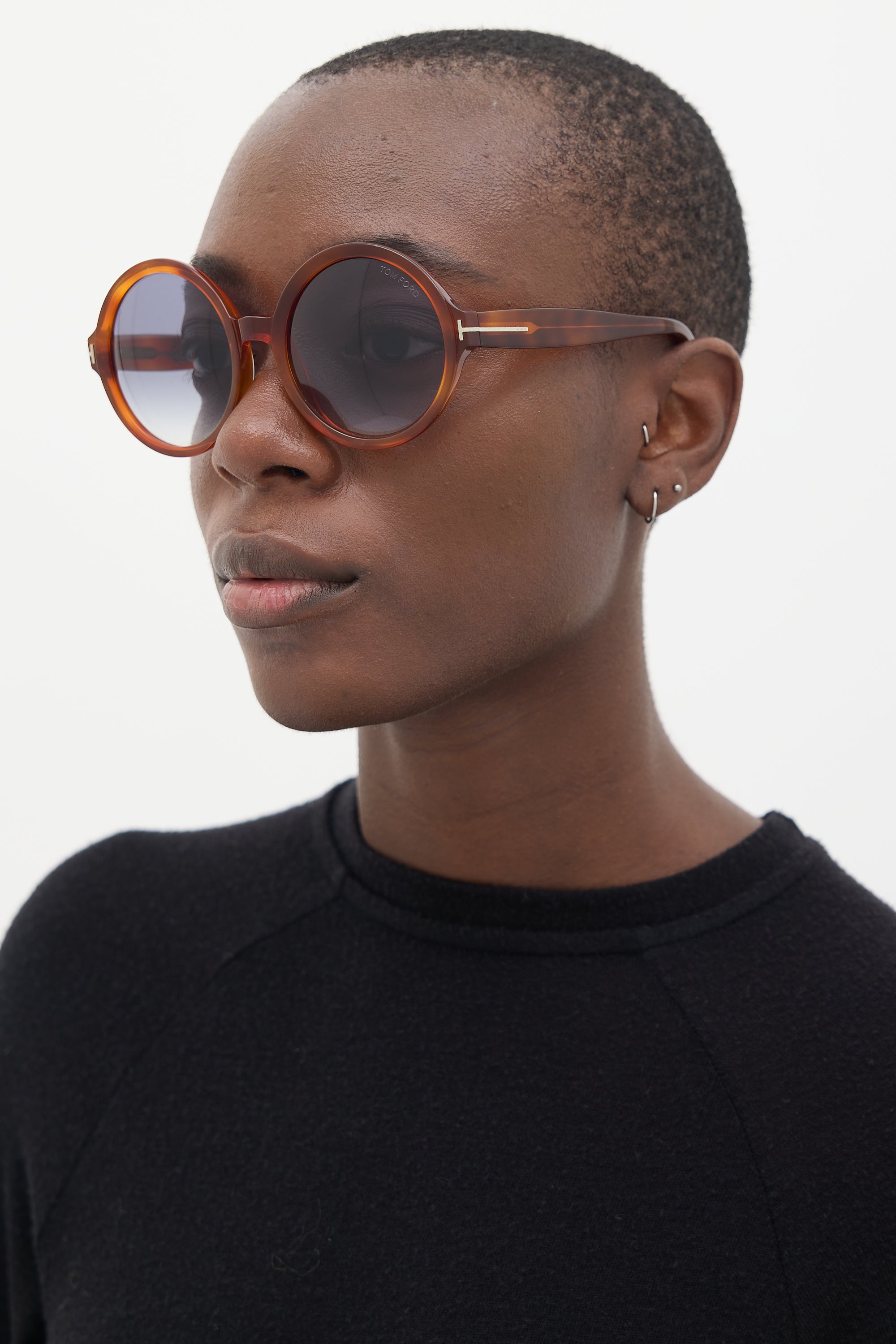 Pre-owned Tom Ford Juliet TF369 sunglasses featuring blue gradient tinted lenses, brown marbled circle frame, and inset gold tone hardware accents at temple and arm tips. Comes with original box, case, and care guide. Copy of original receipt available upon request.