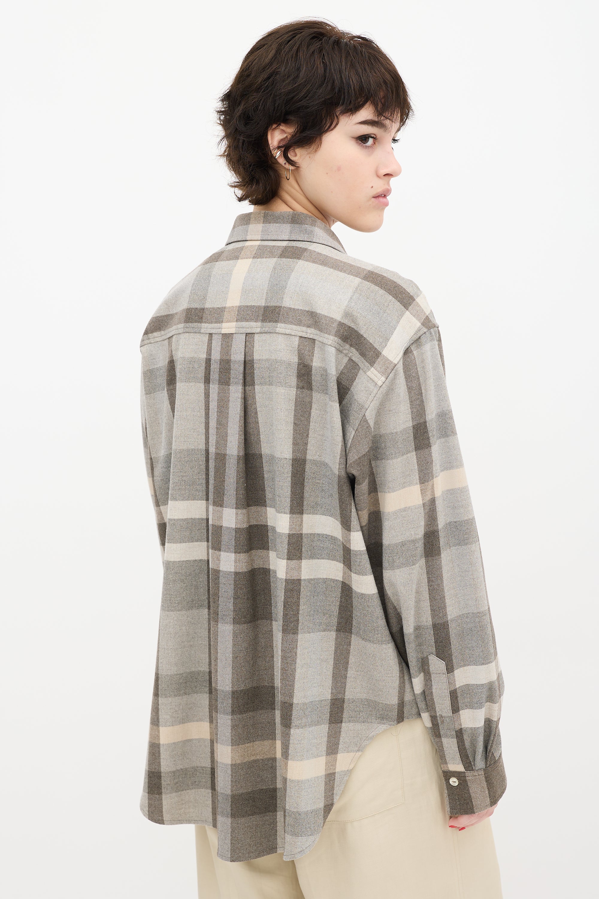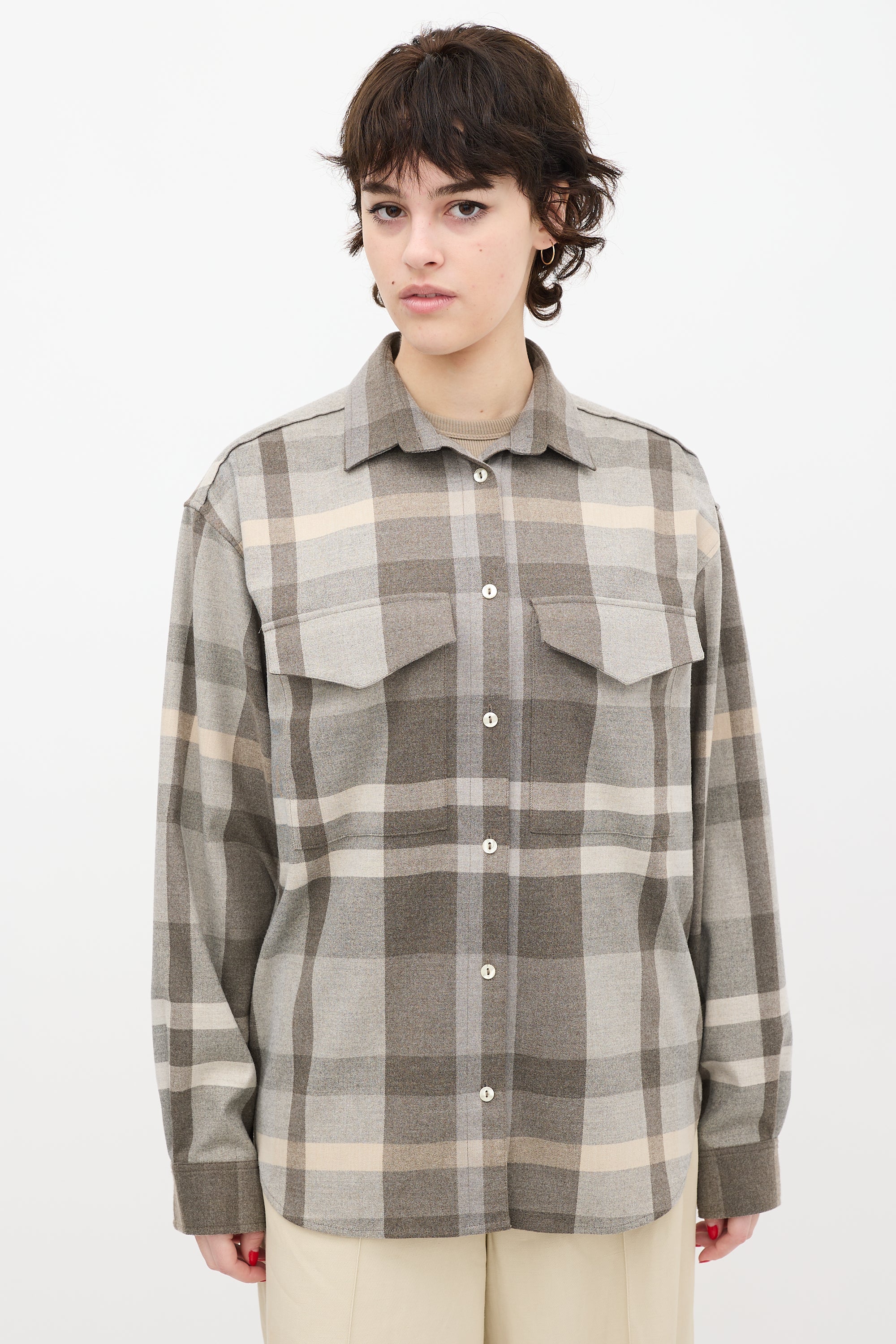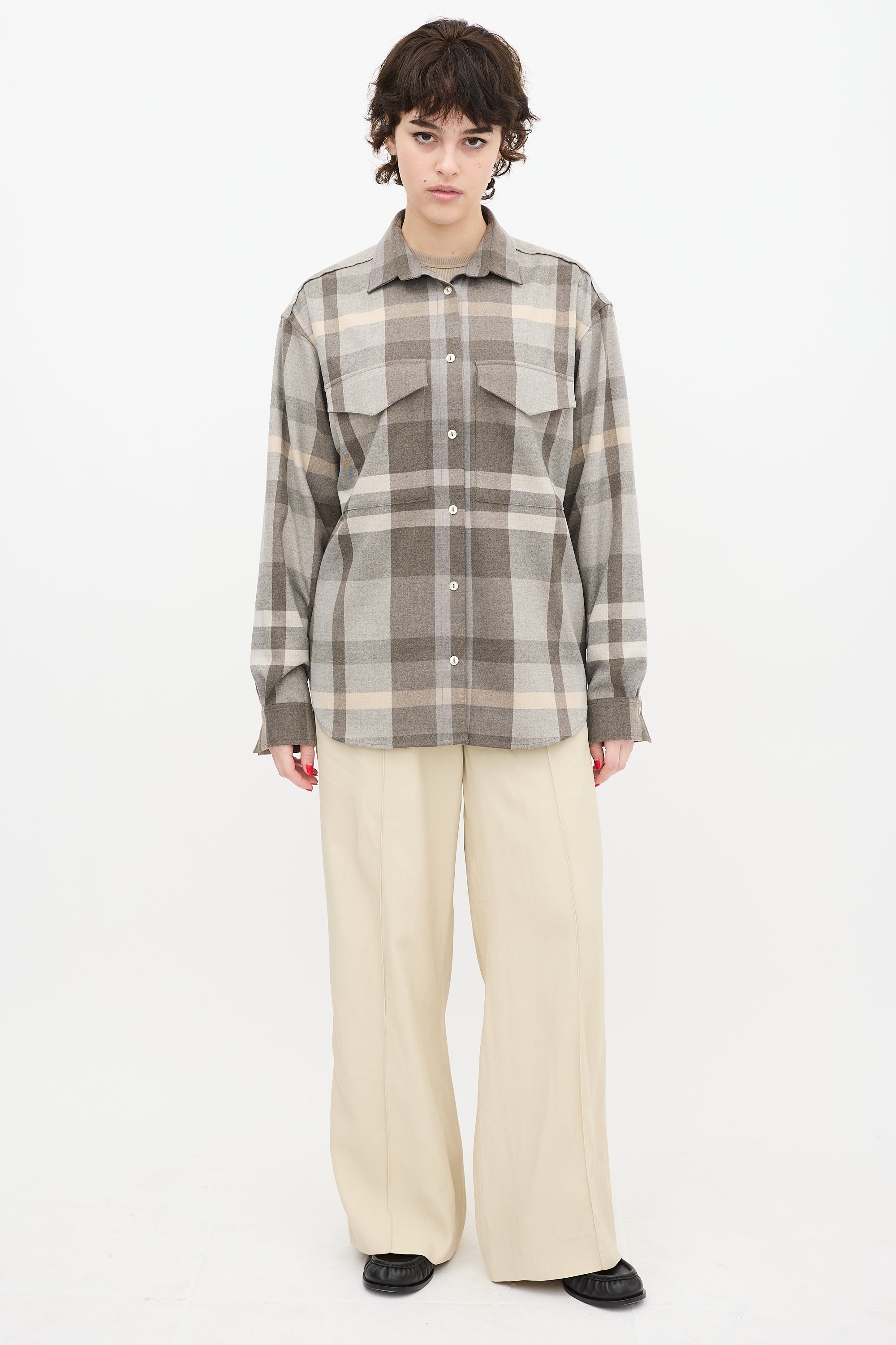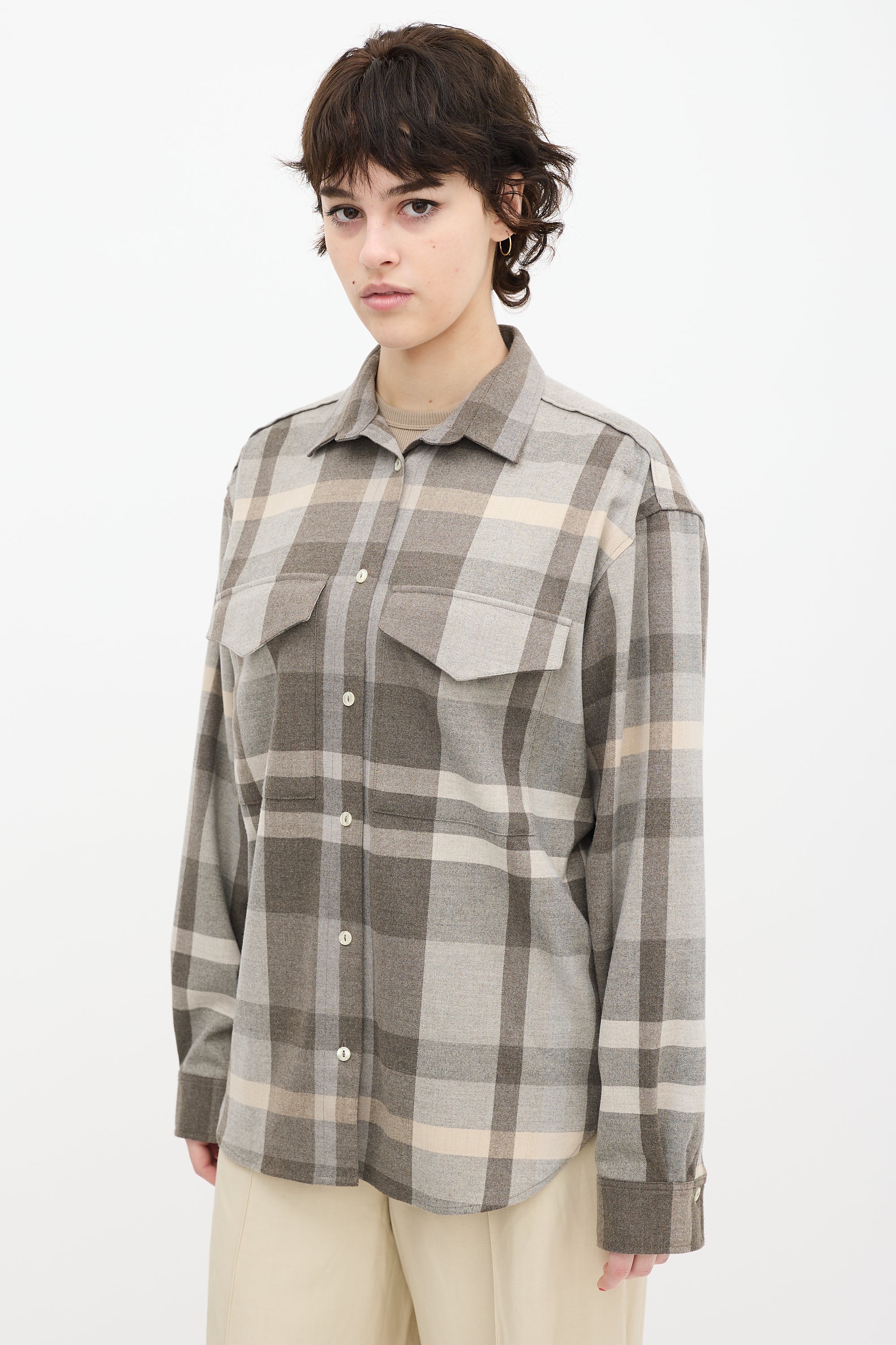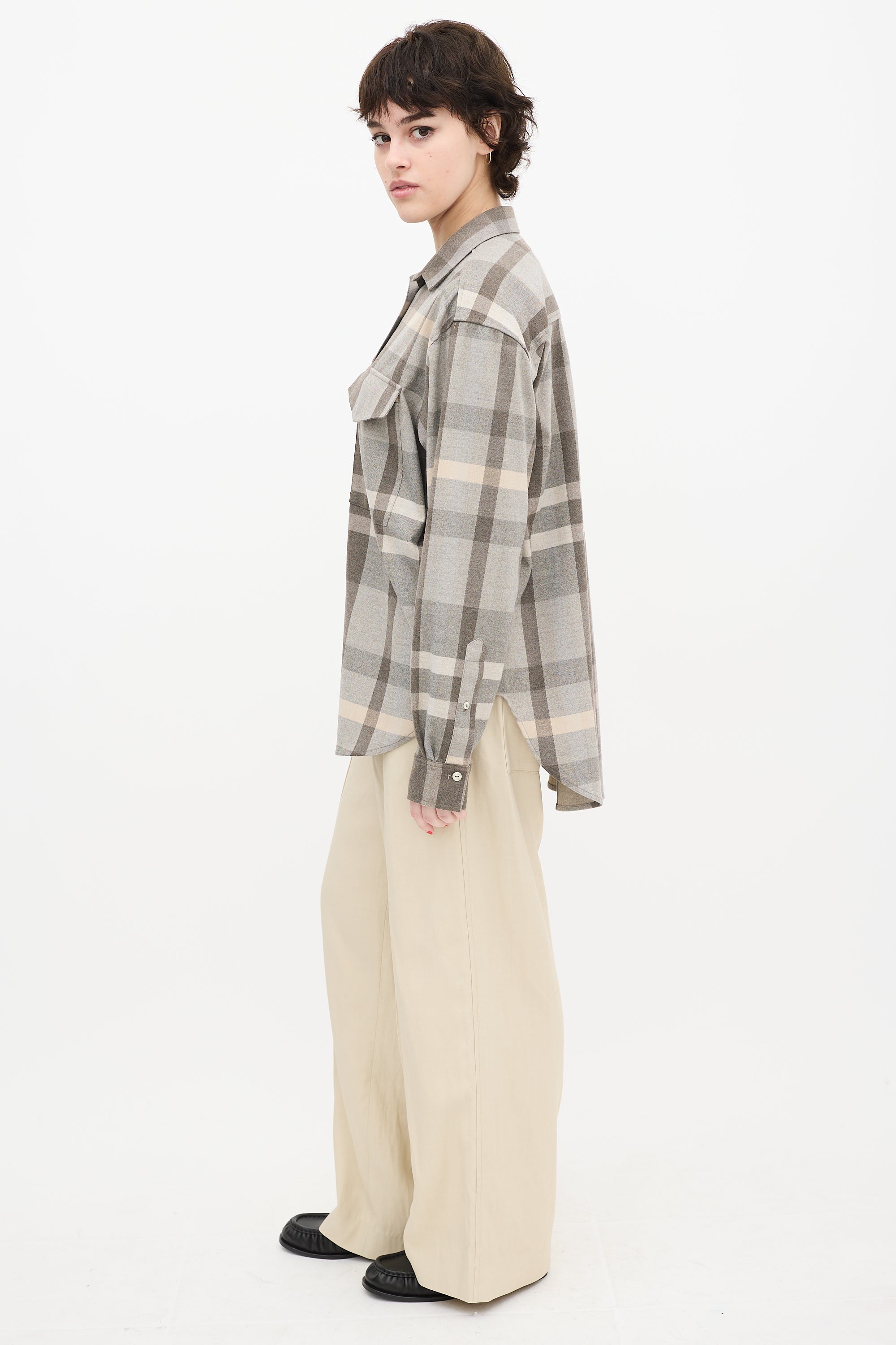 Pre-owned Toteme grey and beige plaid Novella Flannel shirt featuring pointed collar, button up front, two flap pockets at chest,  buttoned cuffs, and scoop hem.