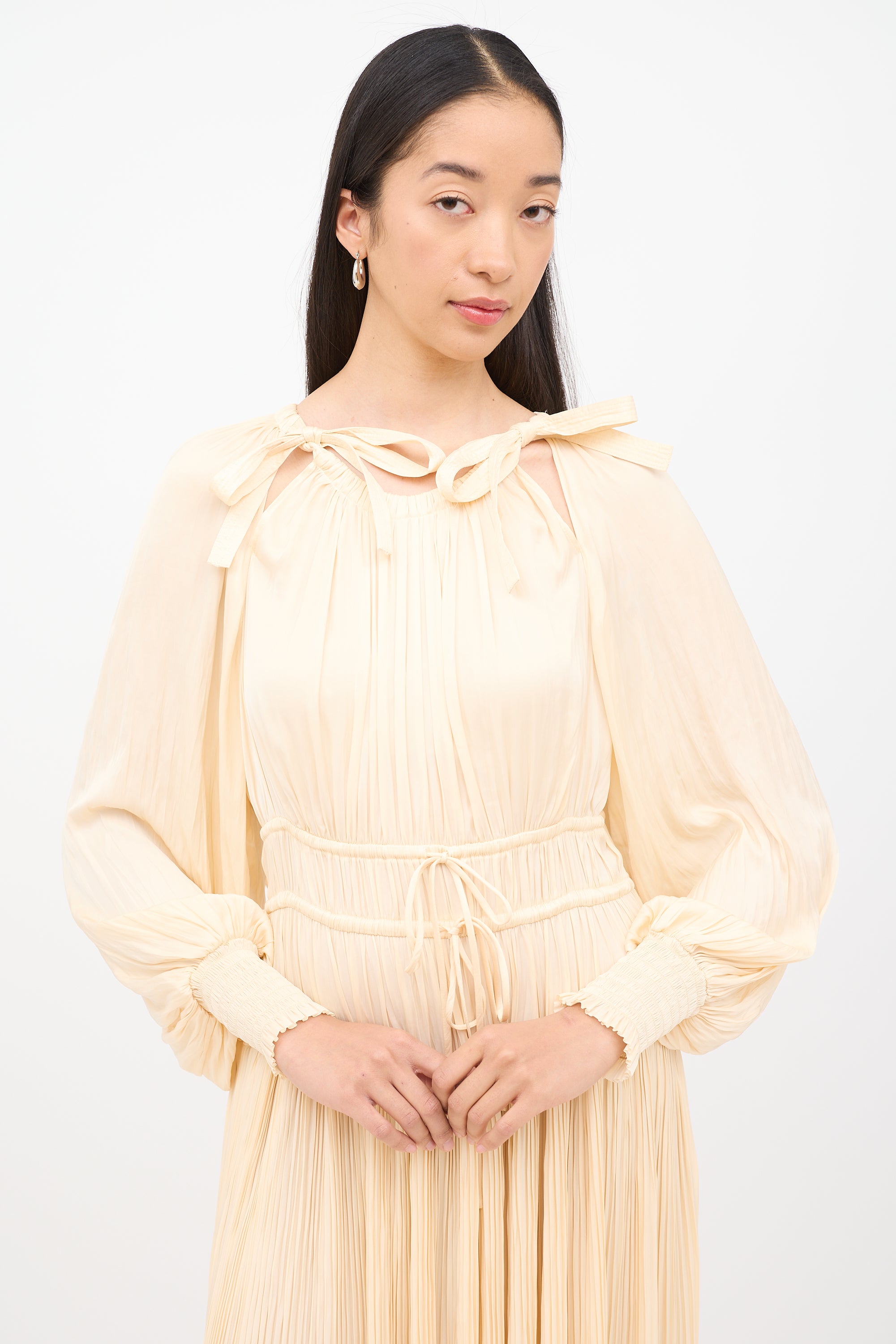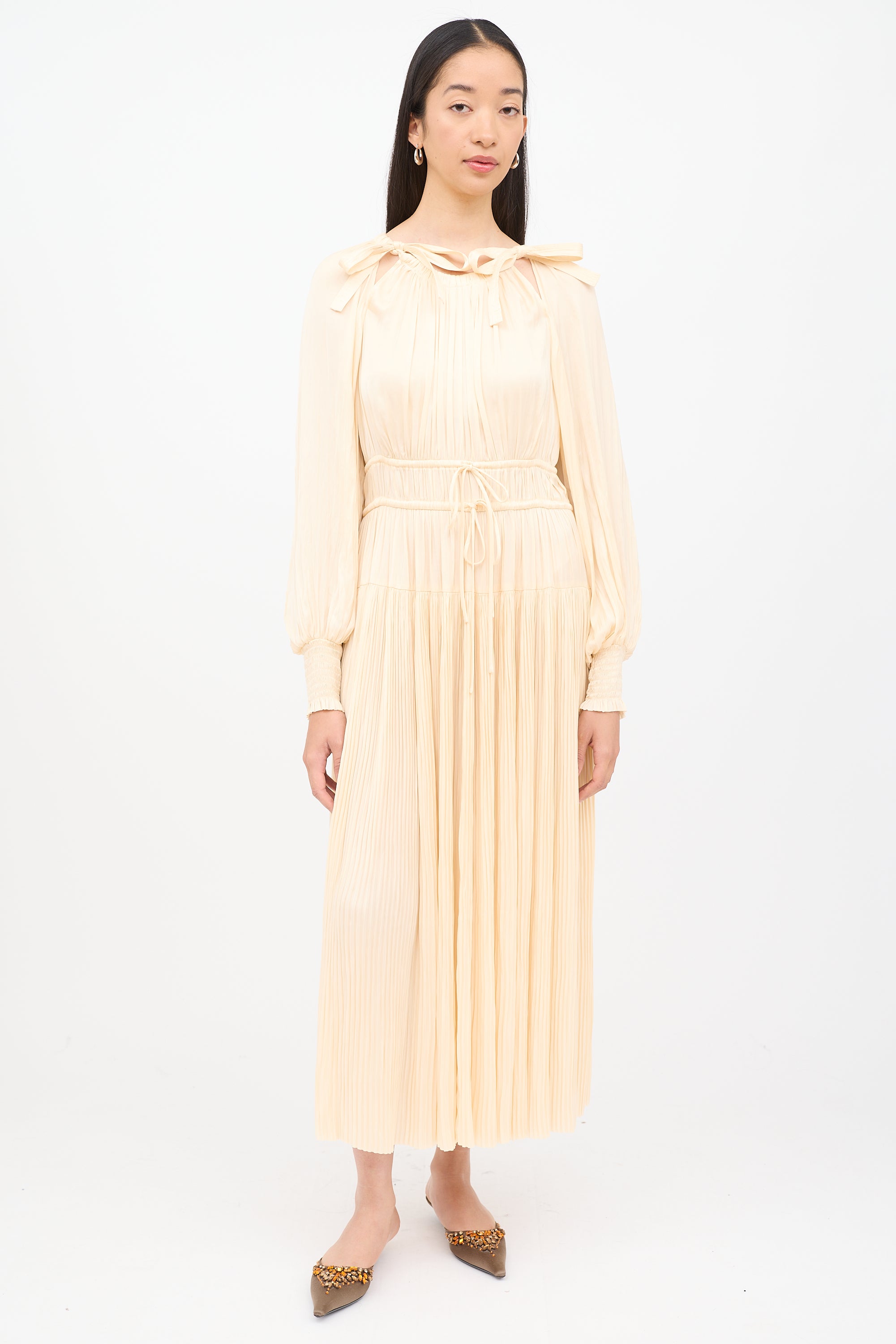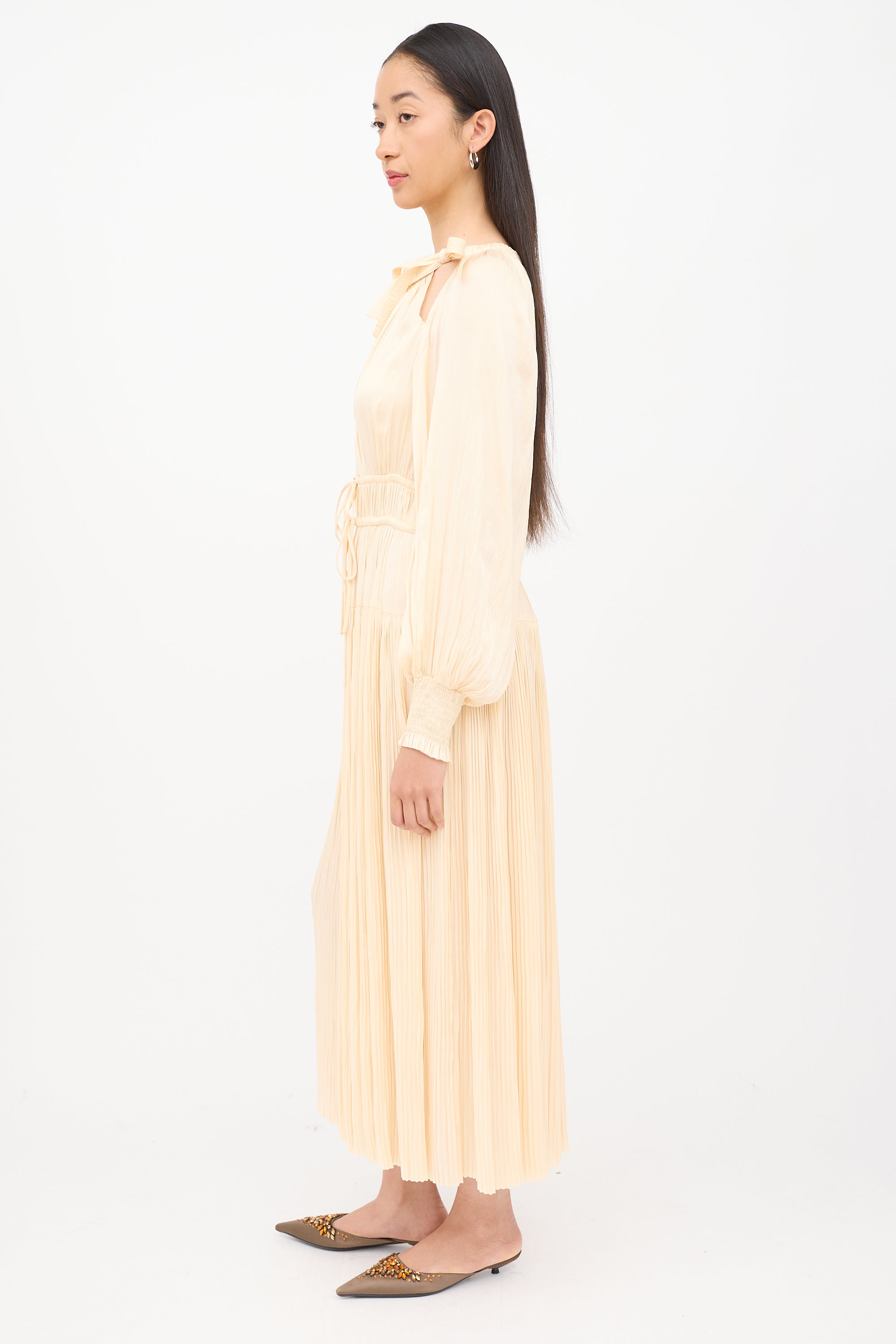 Pre-owned Ulla Johnson cream long sleeve dress featuring round neck with dual ties, cinched elastic cuffs, drawstring elastic waist, side zip entry and pleating.