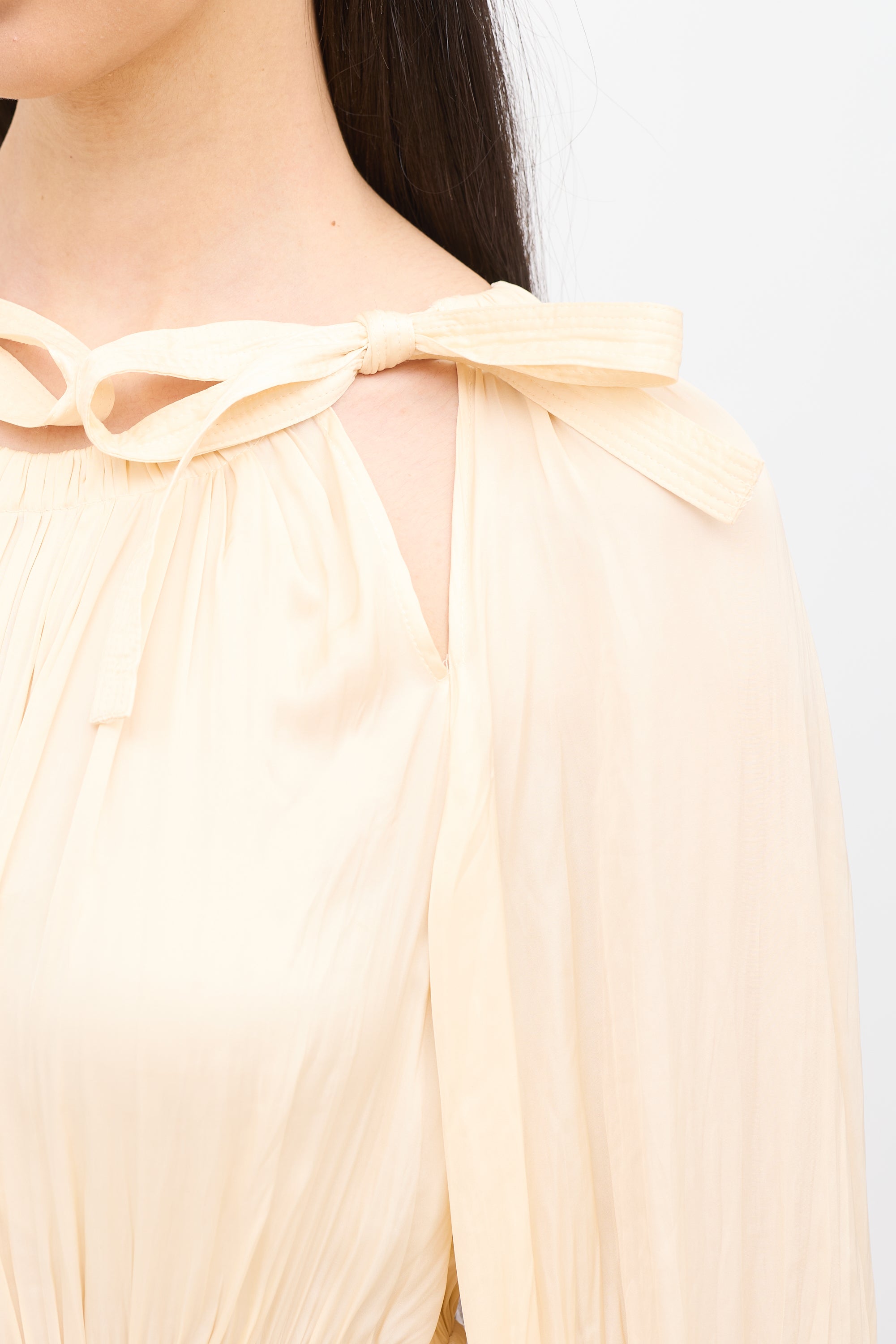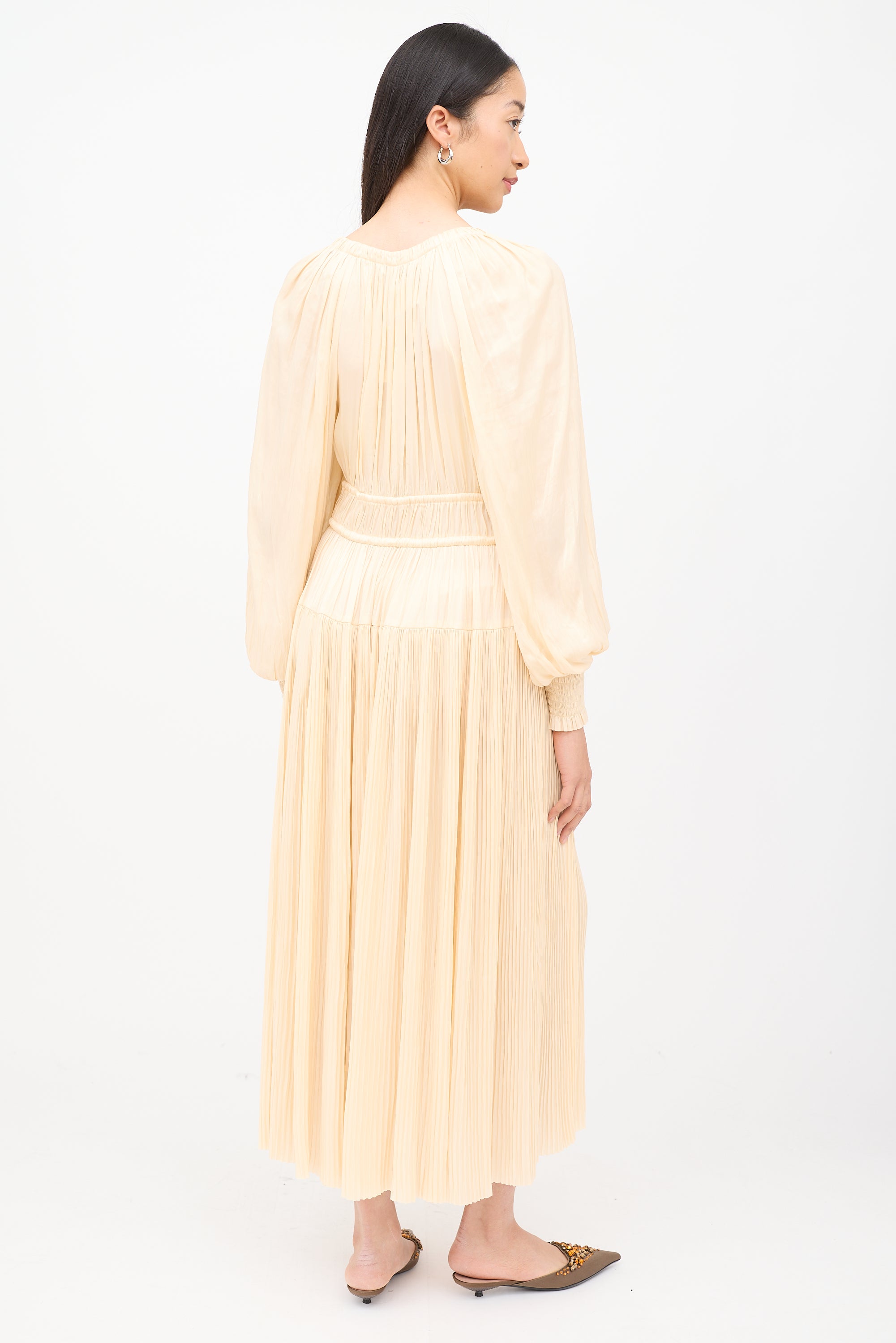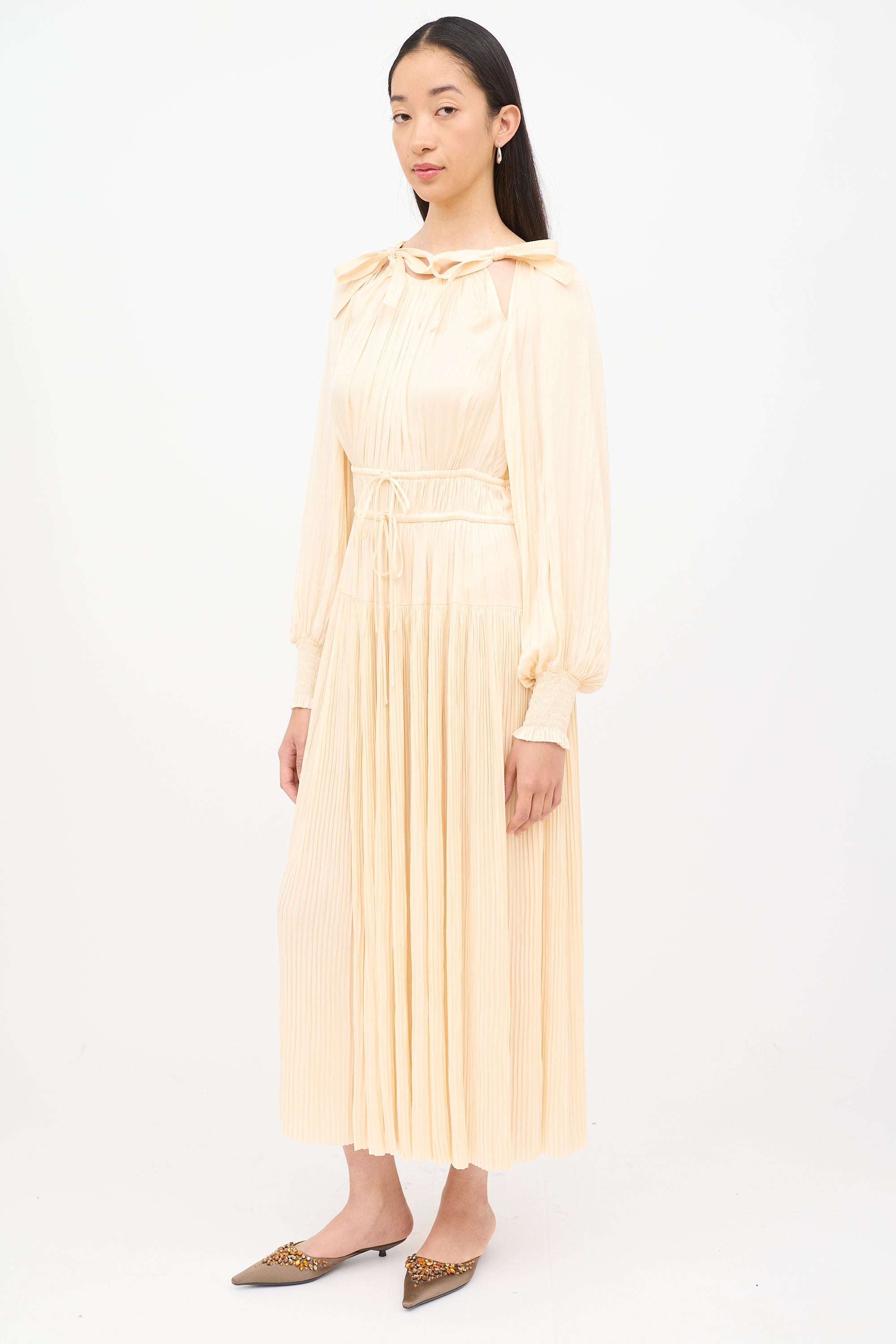 Pre-owned Ulla Johnson cream long sleeve dress featuring round neck with dual ties, cinched elastic cuffs, drawstring elastic waist, side zip entry and pleating.
