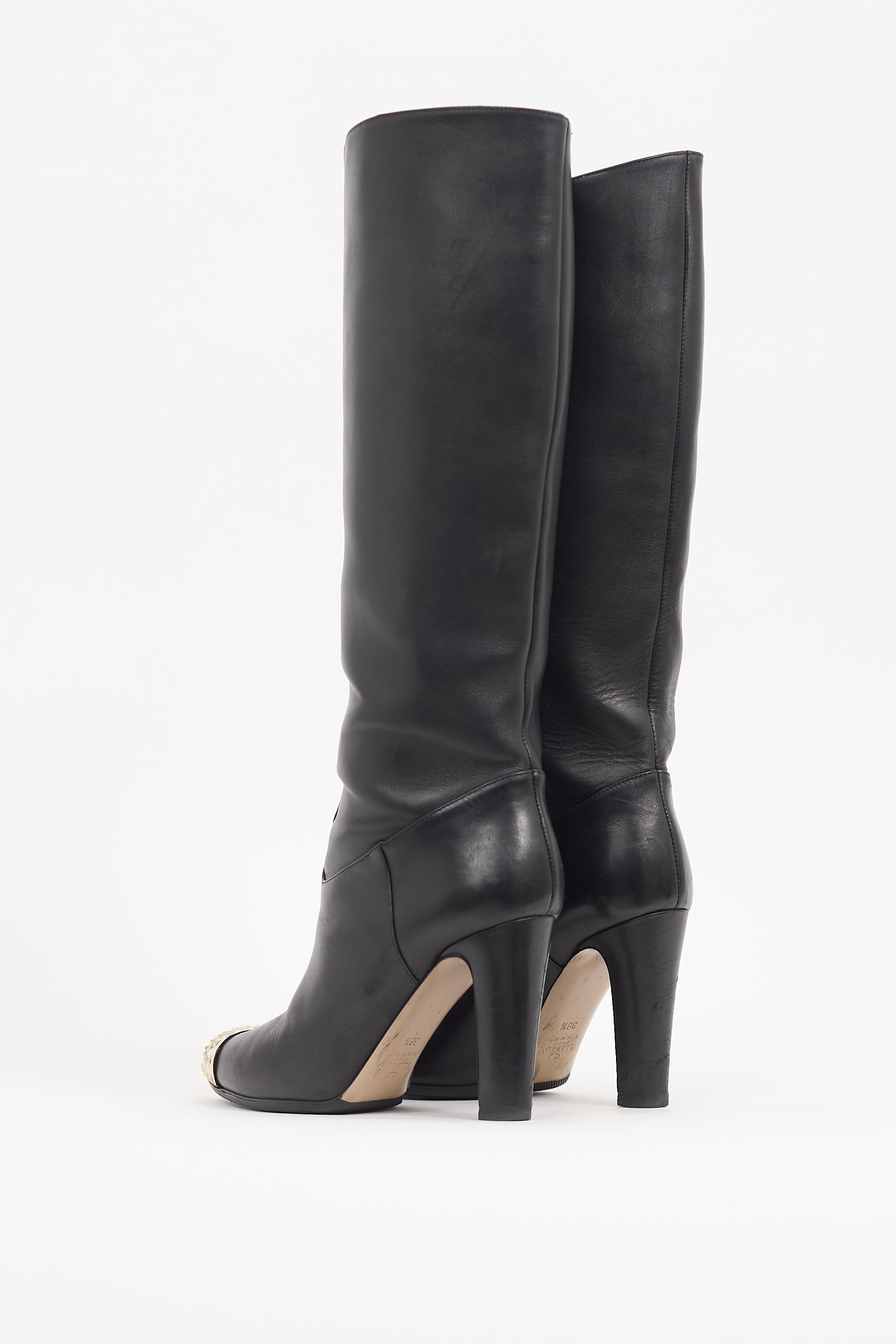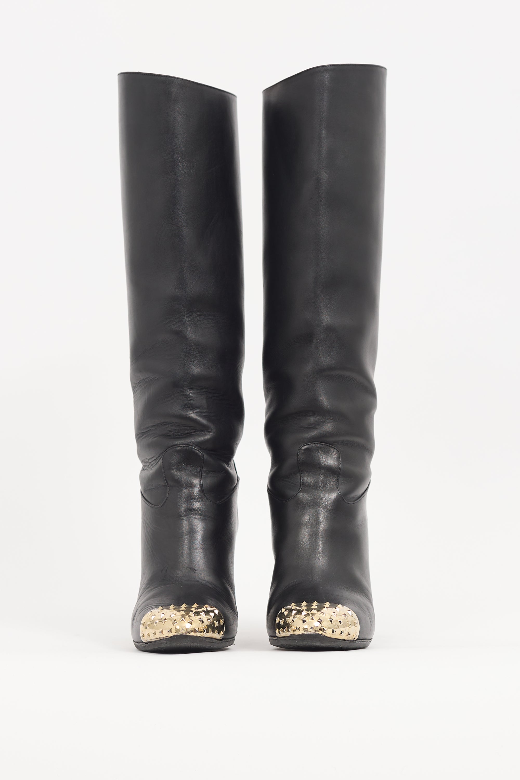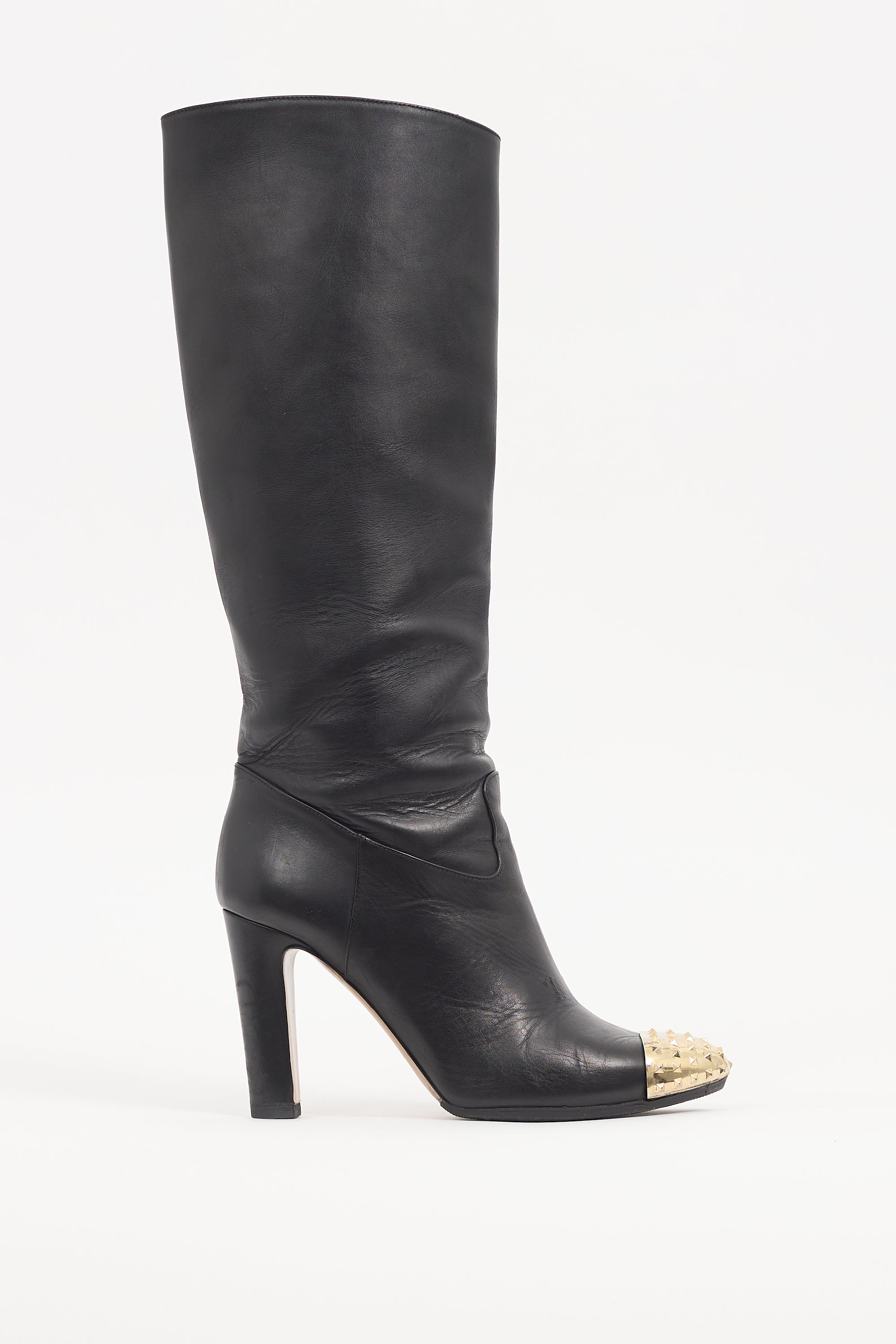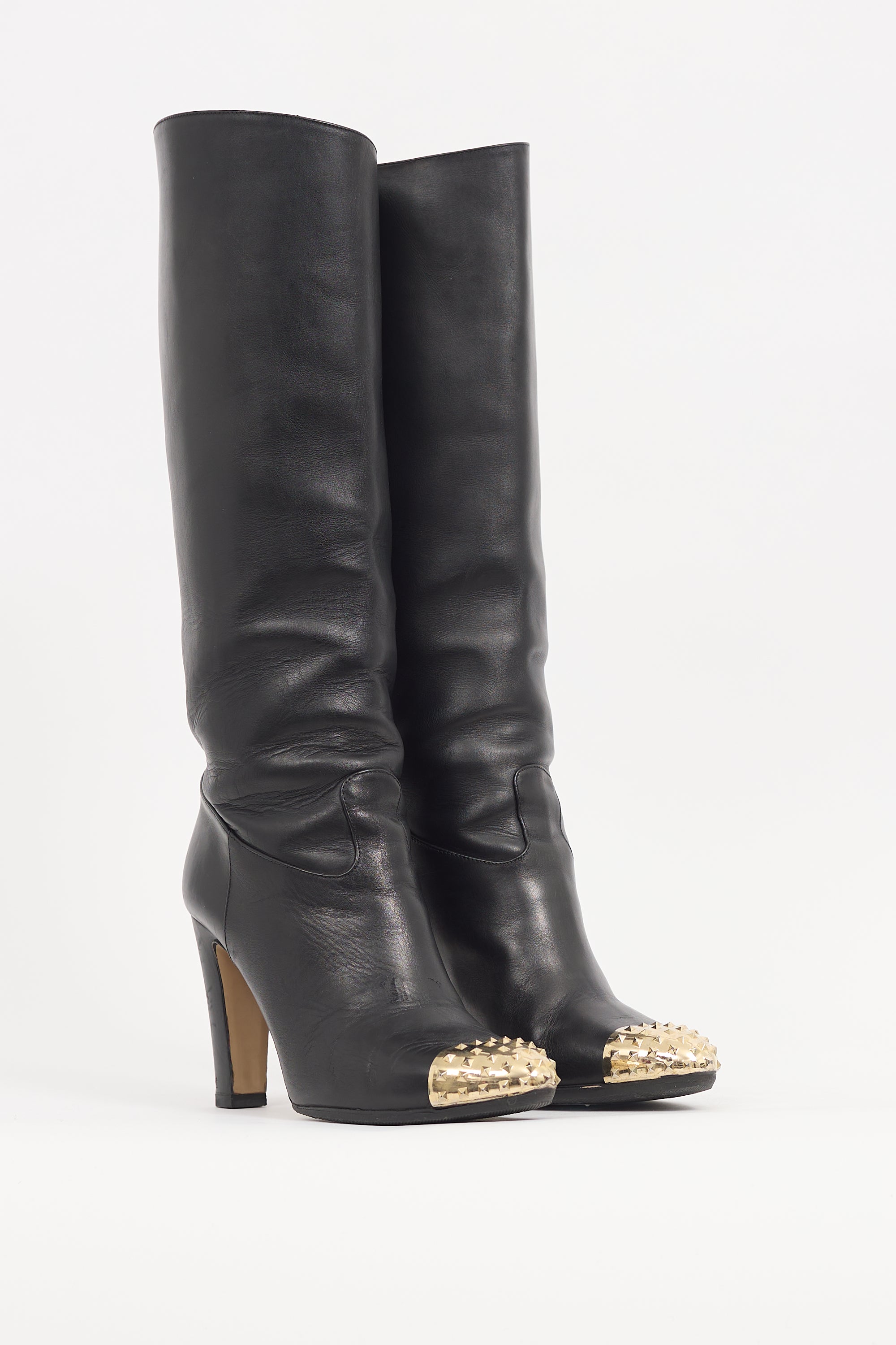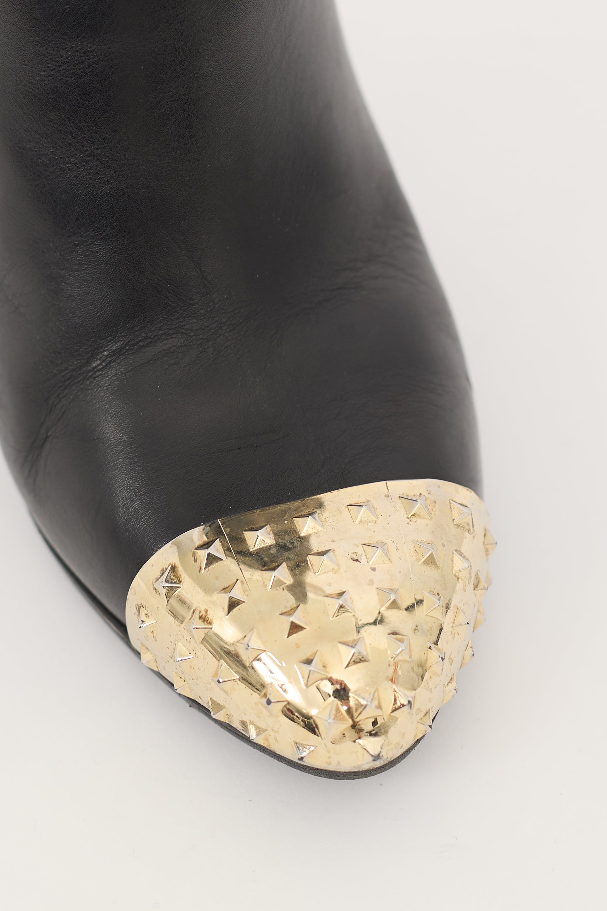 Pre-owned Valentino black leather Rockstud boots featuring almond toe, gold tone Rockstud toe cap, slip on entry, and covered heel.
