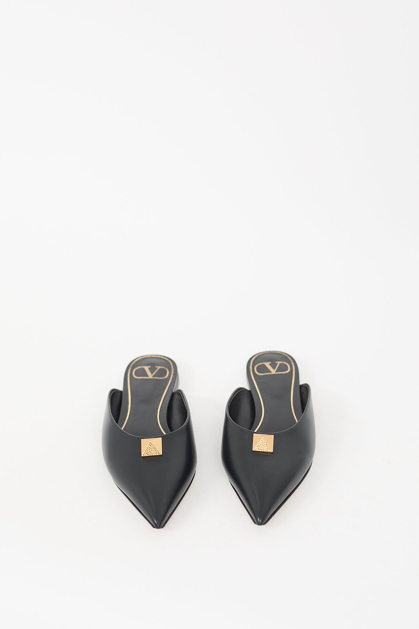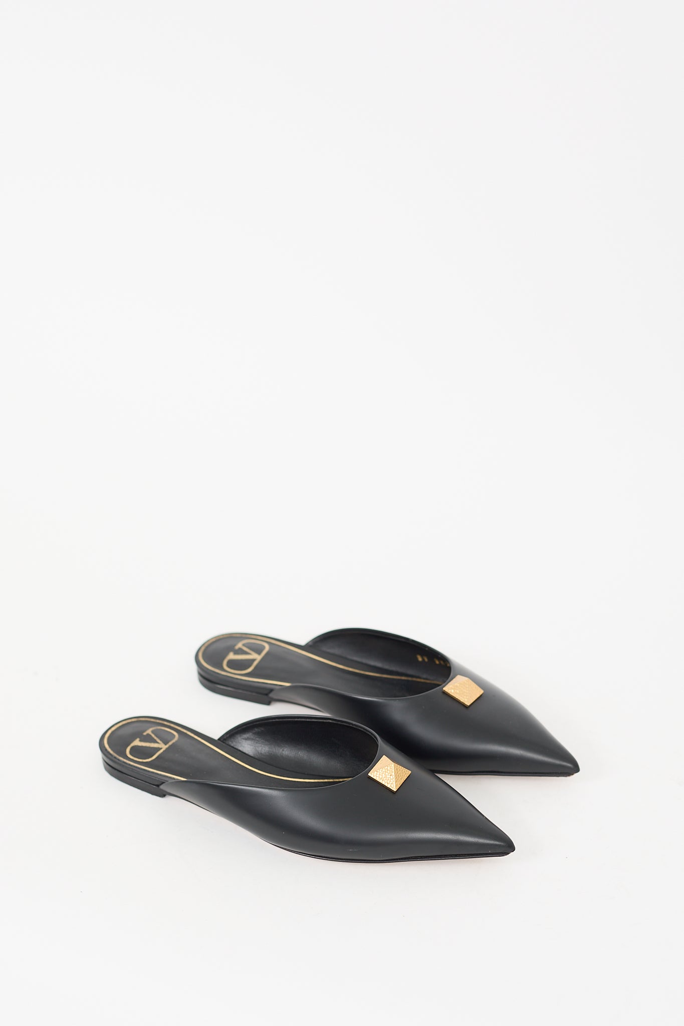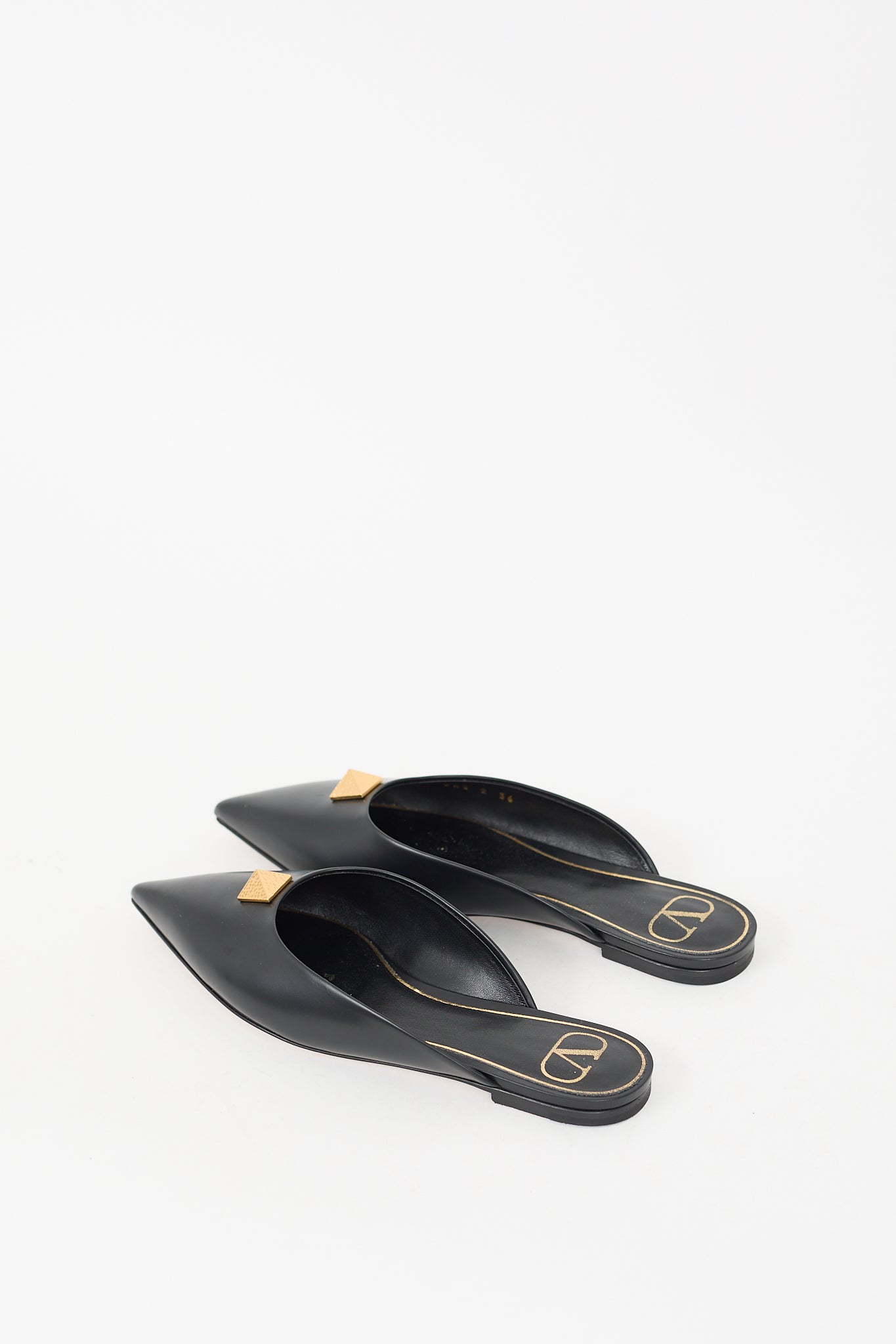 Pre-owned Valentino black leather mules featuring pointed toe, gold tone roman stud at vamp, stamp leather insole, and slip on entry.