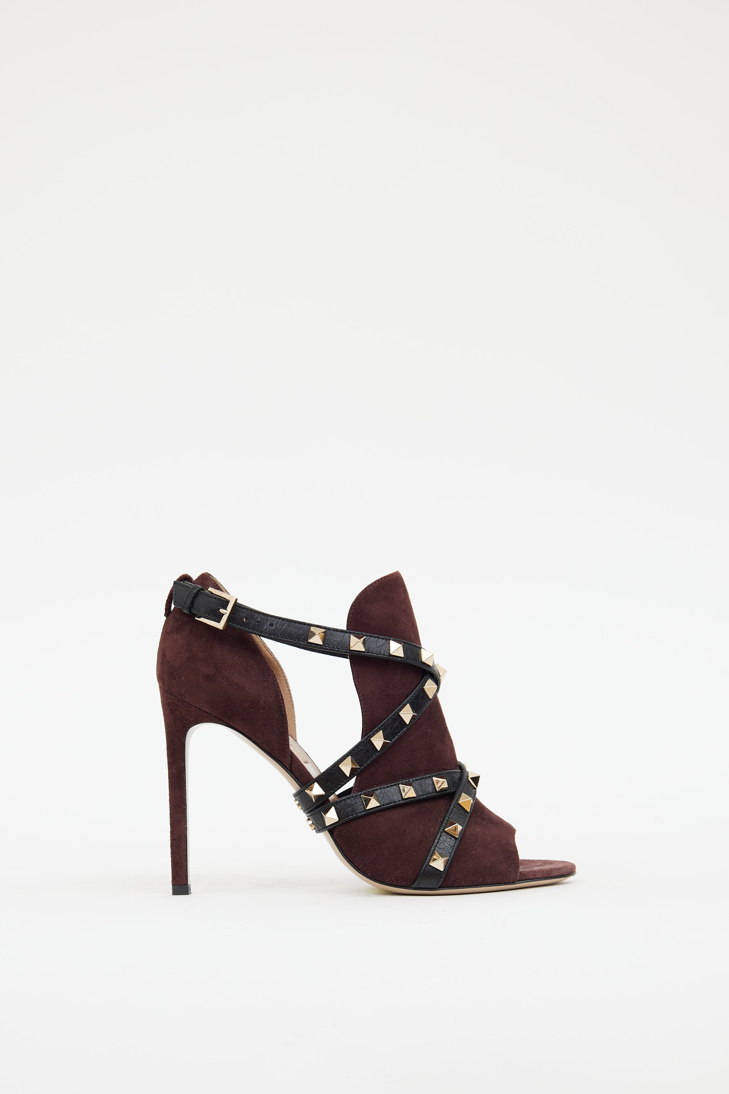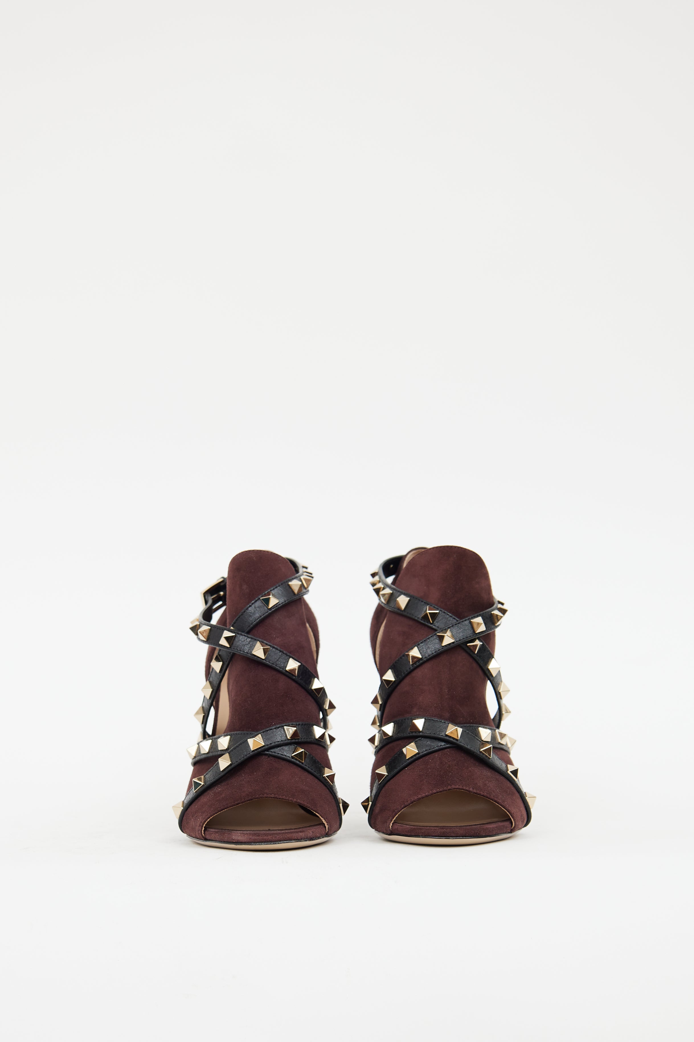 Pre-owned Valentino burgundy suede sandals featuring an open toe, wrapped stiletto, cut out at sides, and criss cross wrap straps at vamp with gold tone rockstud hardware.