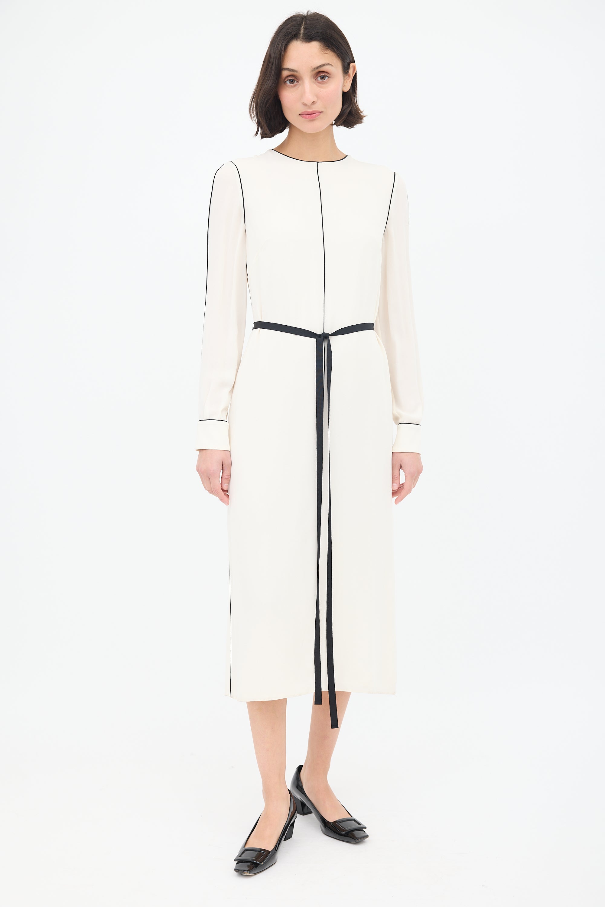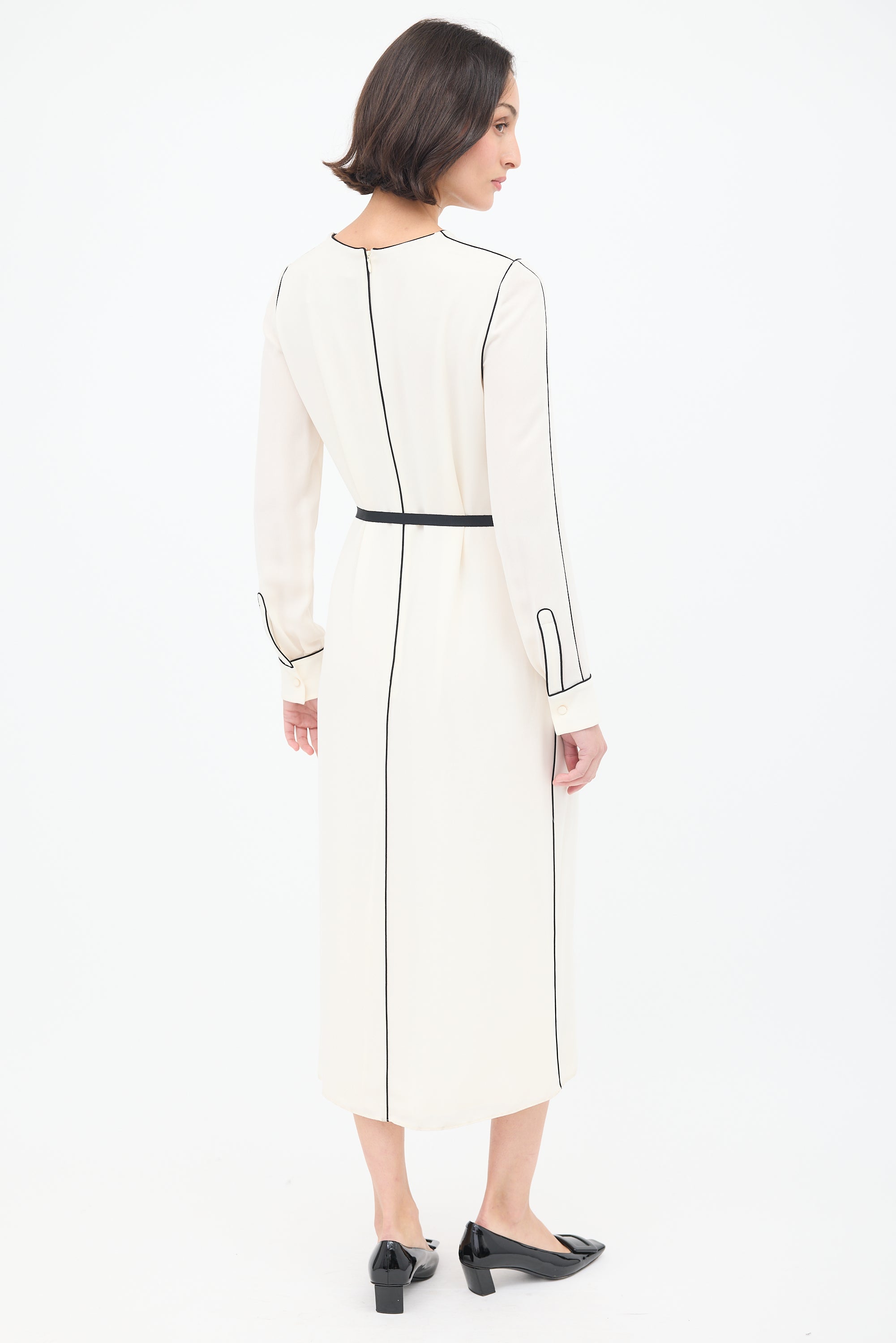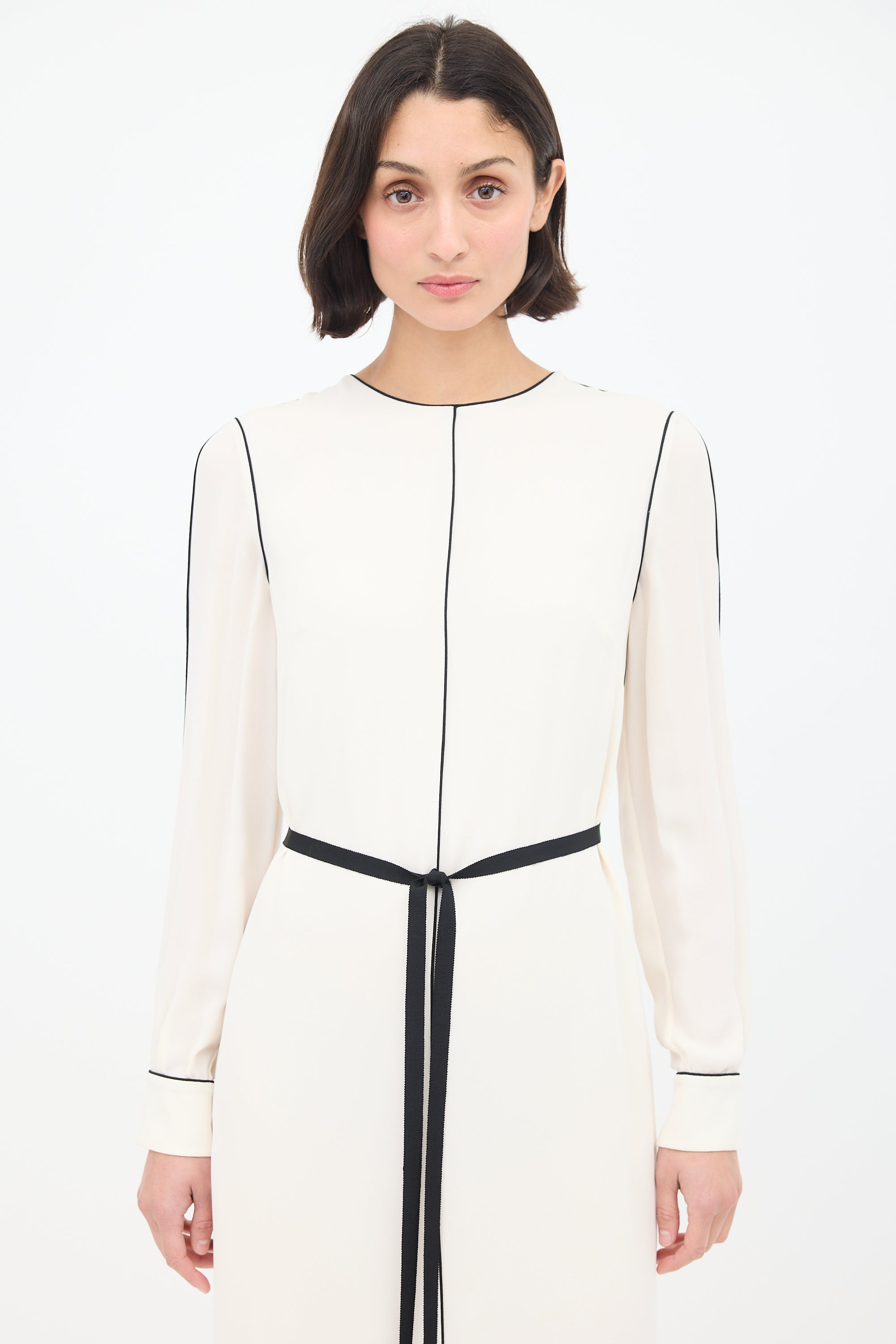 Pre-owned Valentino cream silk midi dress featuring a round neckline, panelled construction with black piping, black self tie grosgrain belt, even hem, long sleeves with buttoned cuffs, and concealed back zip. Lined.