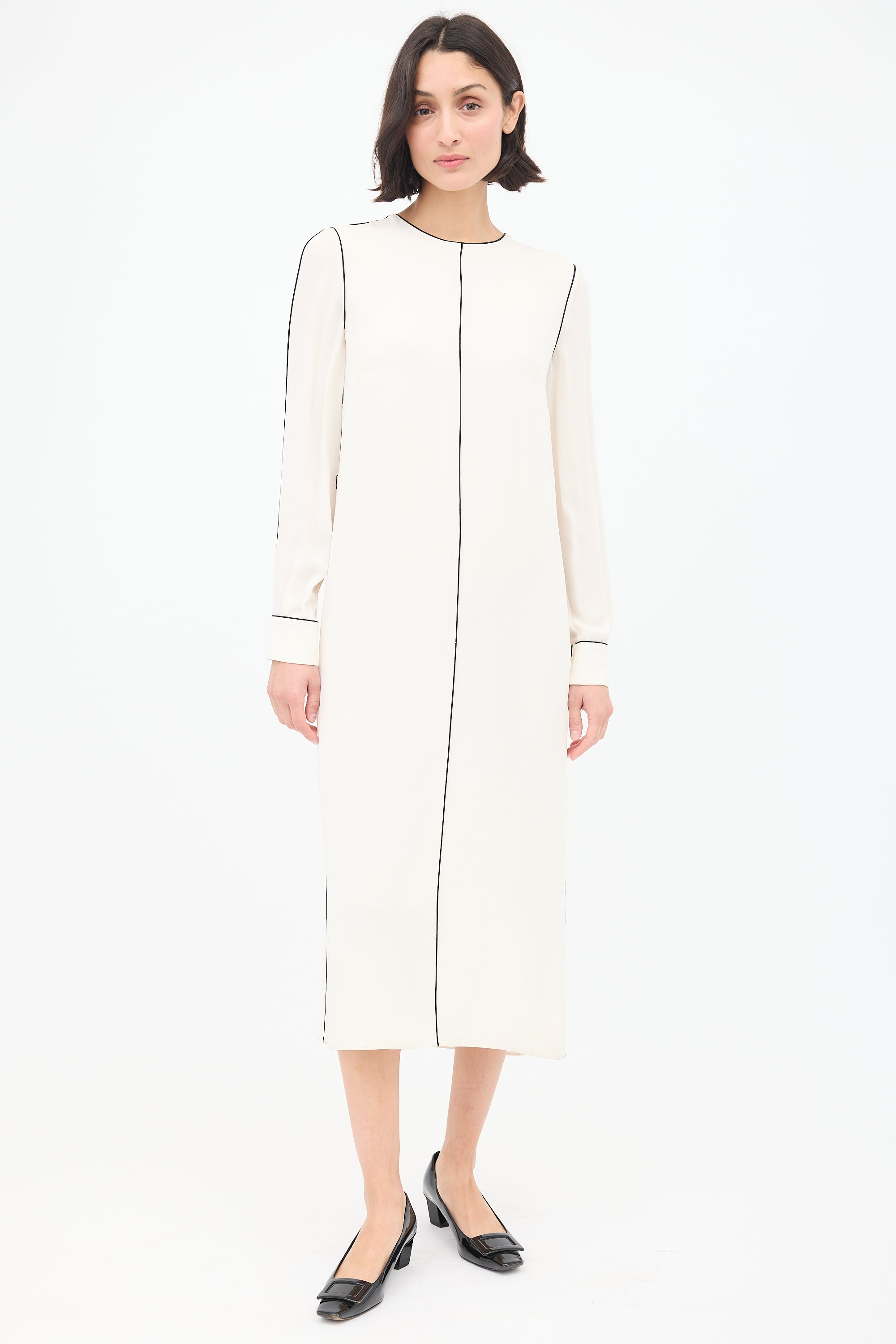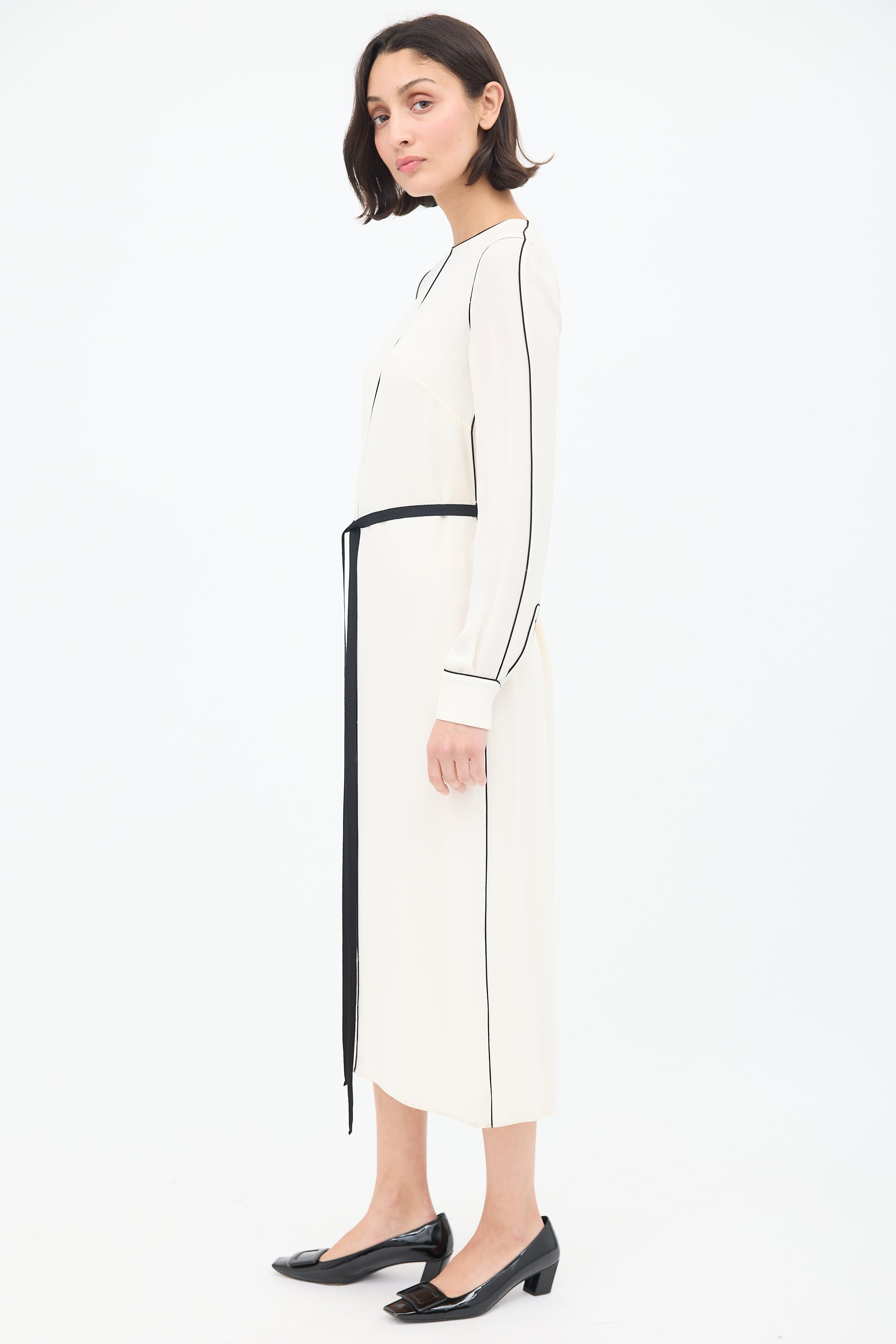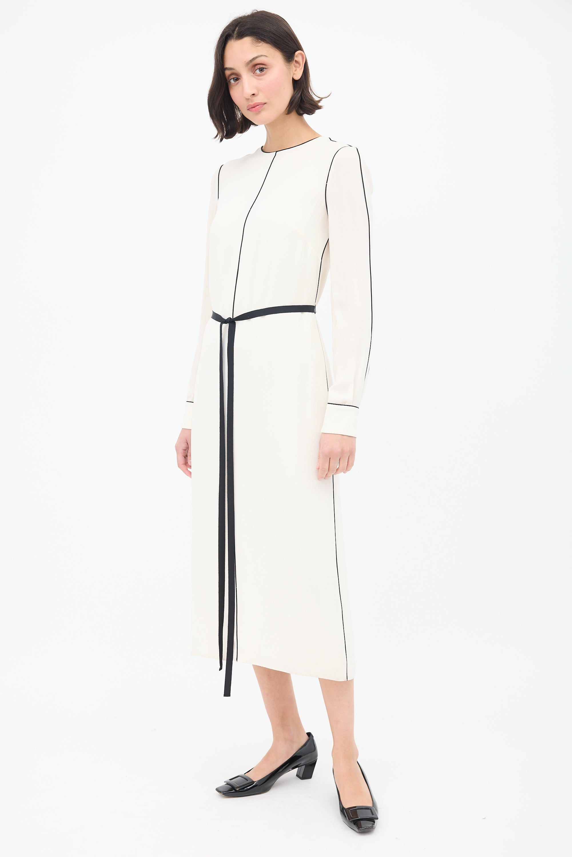 Pre-owned Valentino cream silk midi dress featuring a round neckline, panelled construction with black piping, black self tie grosgrain belt, even hem, long sleeves with buttoned cuffs, and concealed back zip. Lined.
