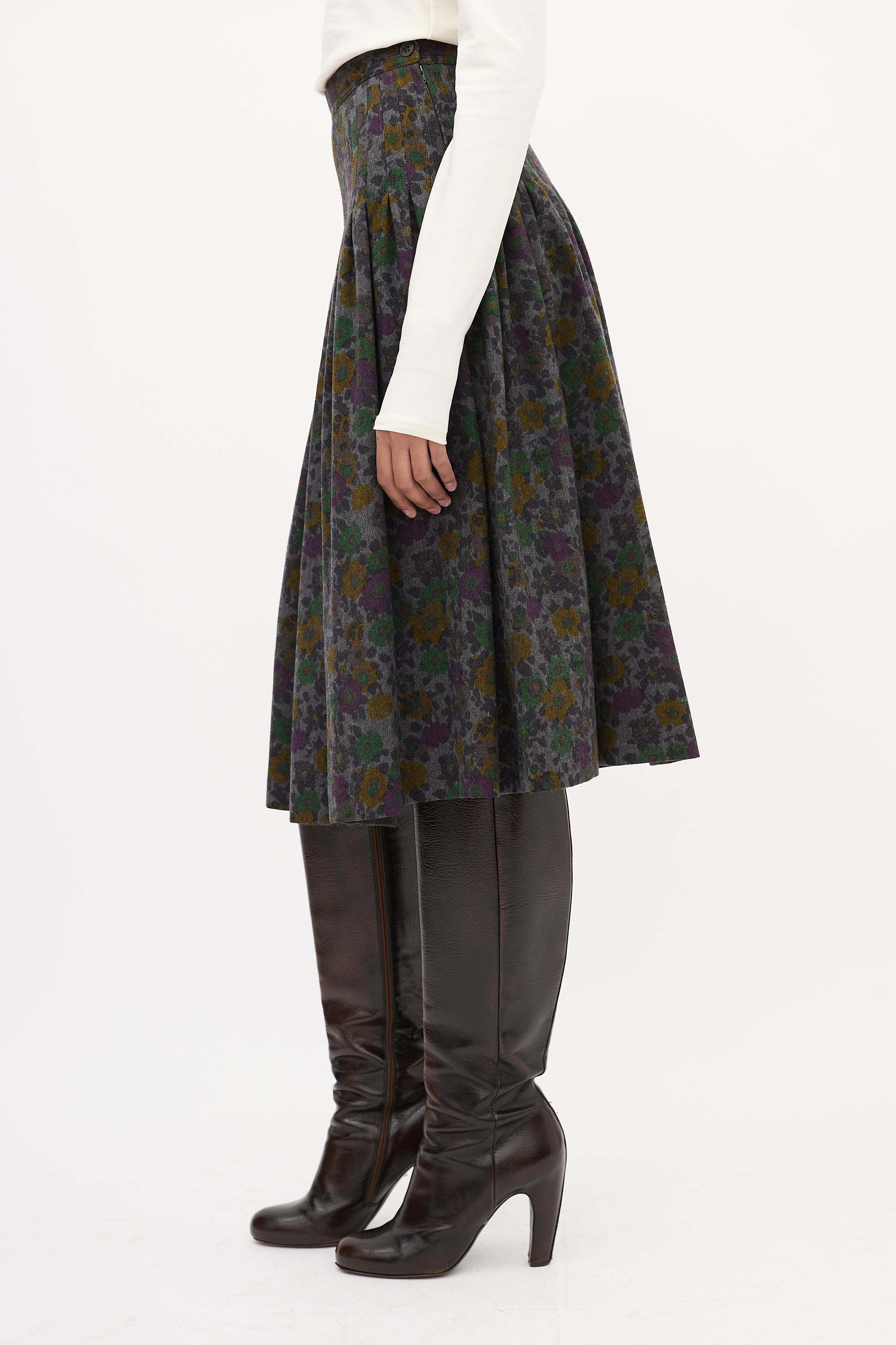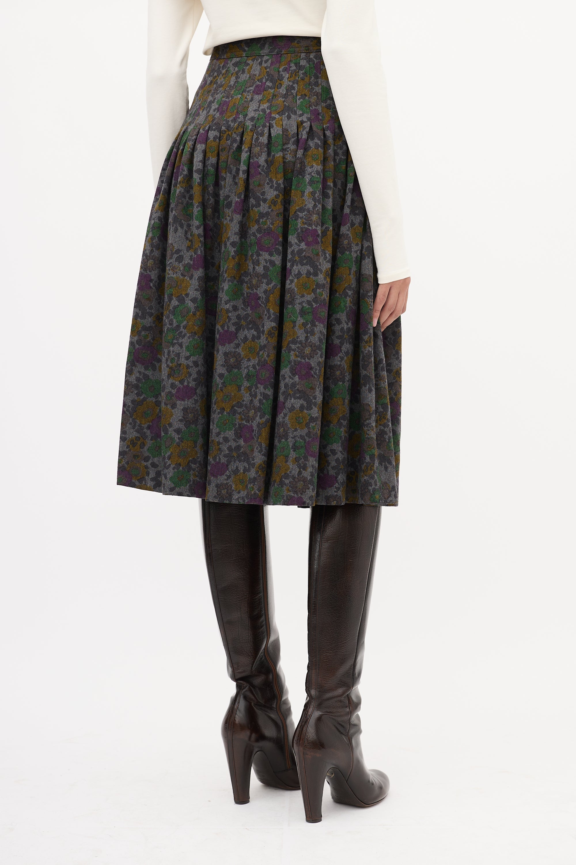Pre-owned Valentino Miss V early 1990s dark grey and multicolour wool midi skirt featuring a high waist, knife pleats throughout, floral print throughout, and concealed side zip closure. Lined.