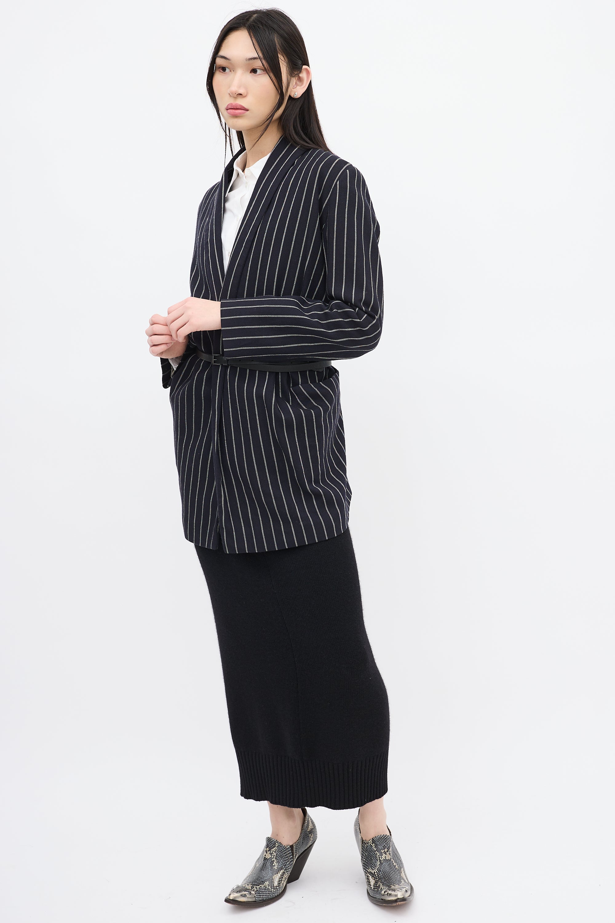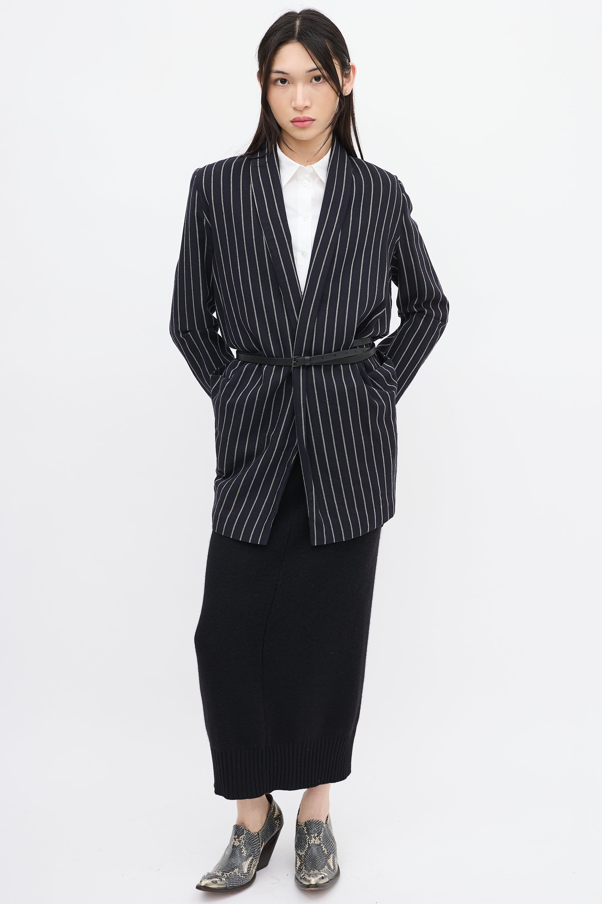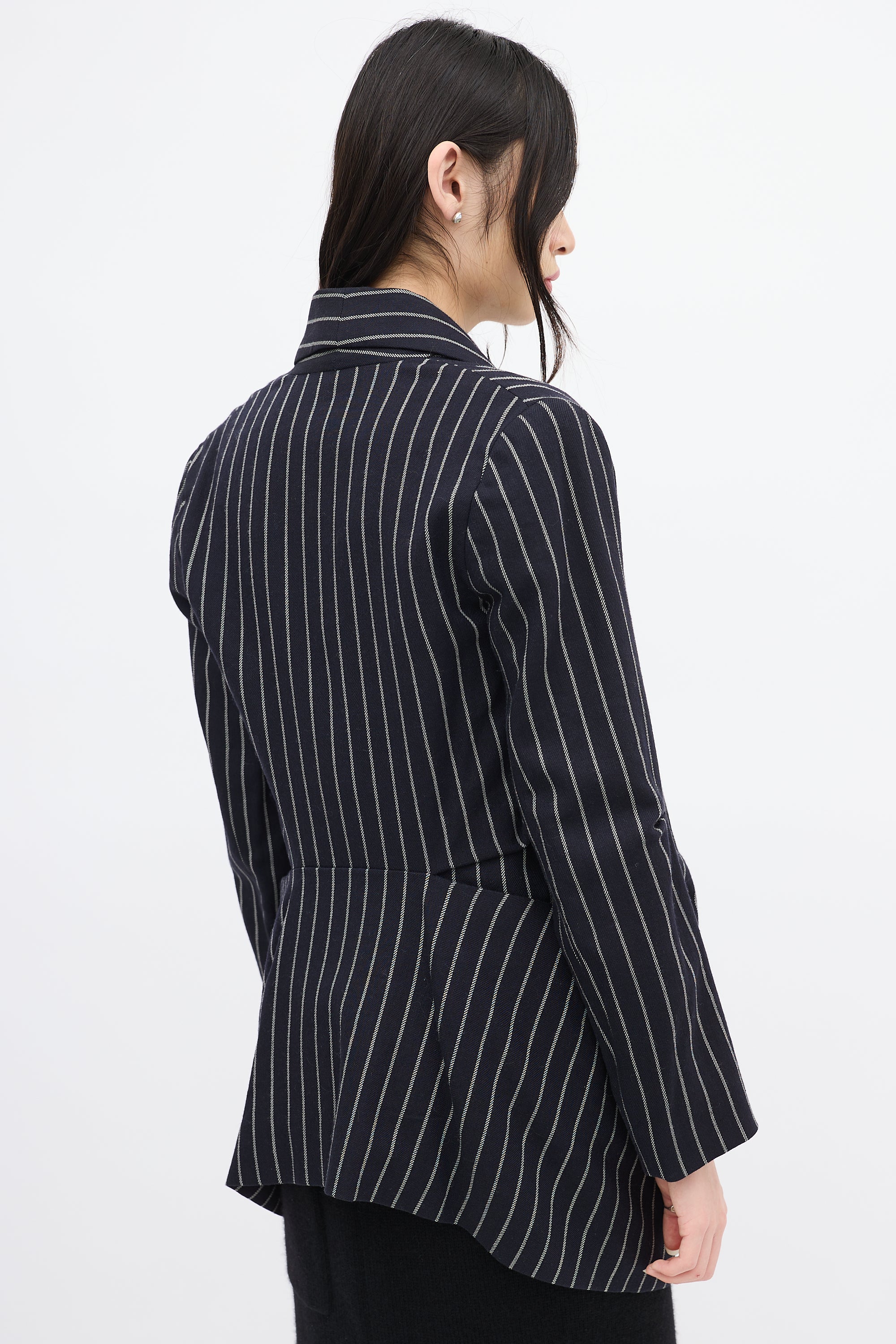 Pre-owned Vivienne Westwood Anglomania navy and white wool striped blazer featuring shawl lapel, open front with two buttonholes, two patch pockets at waist, elbow dart, and high low hem. Styled with belt. Lined.