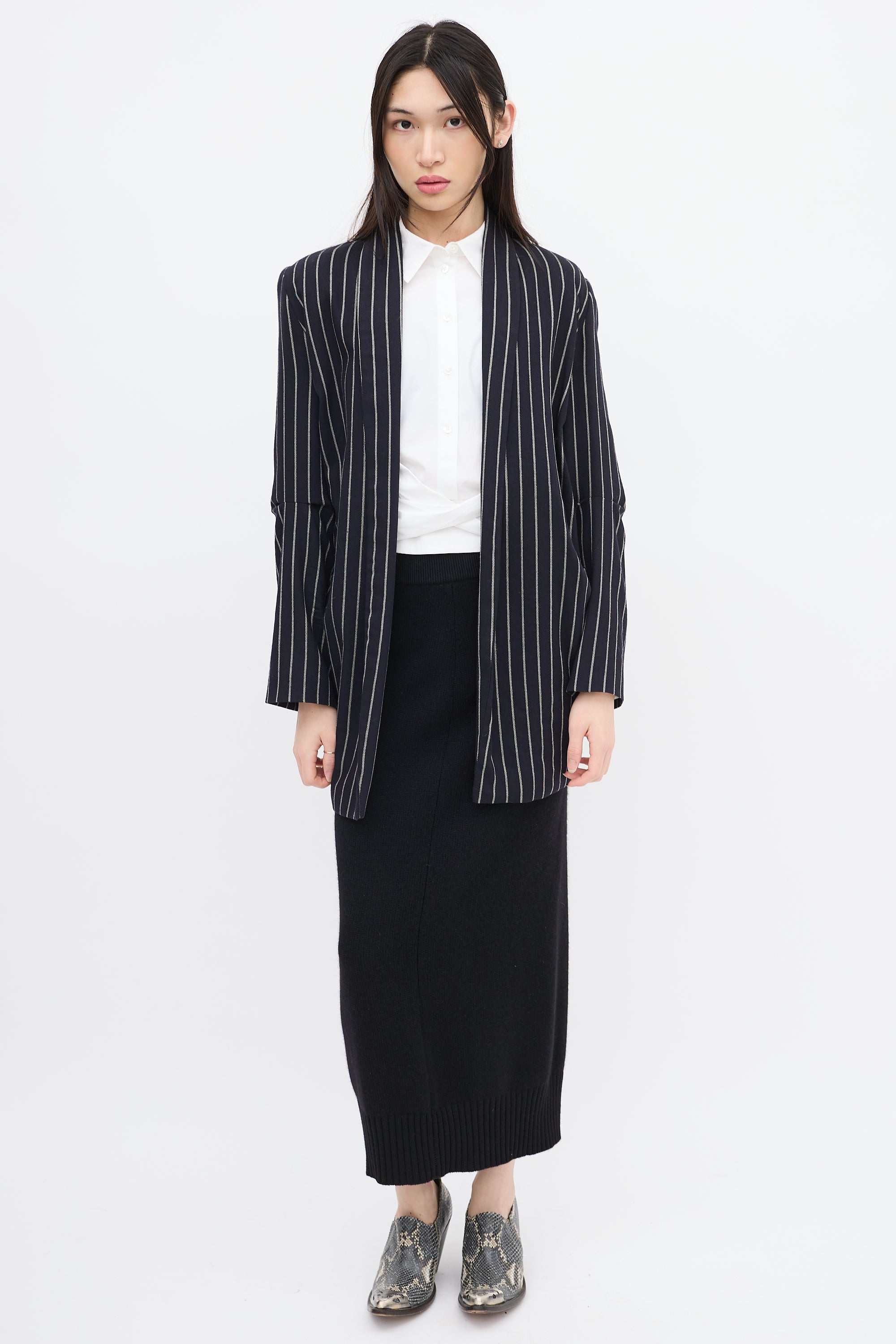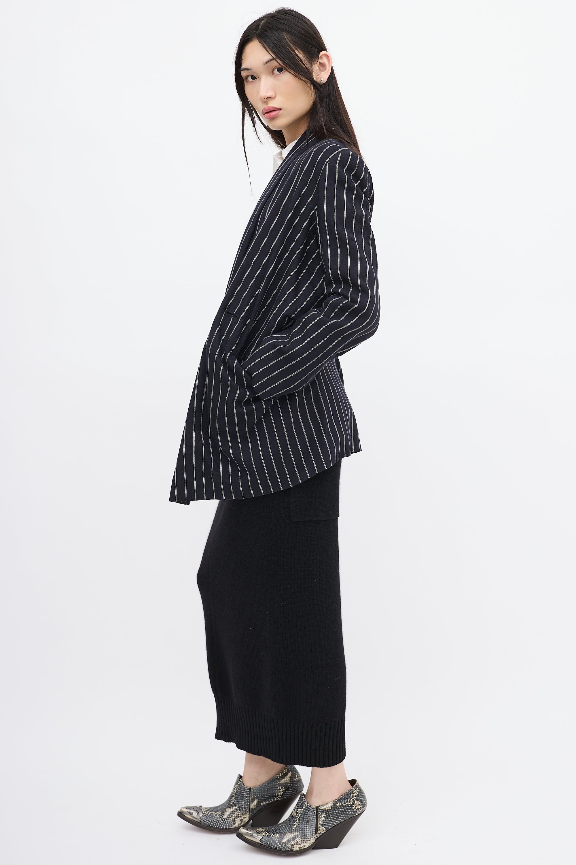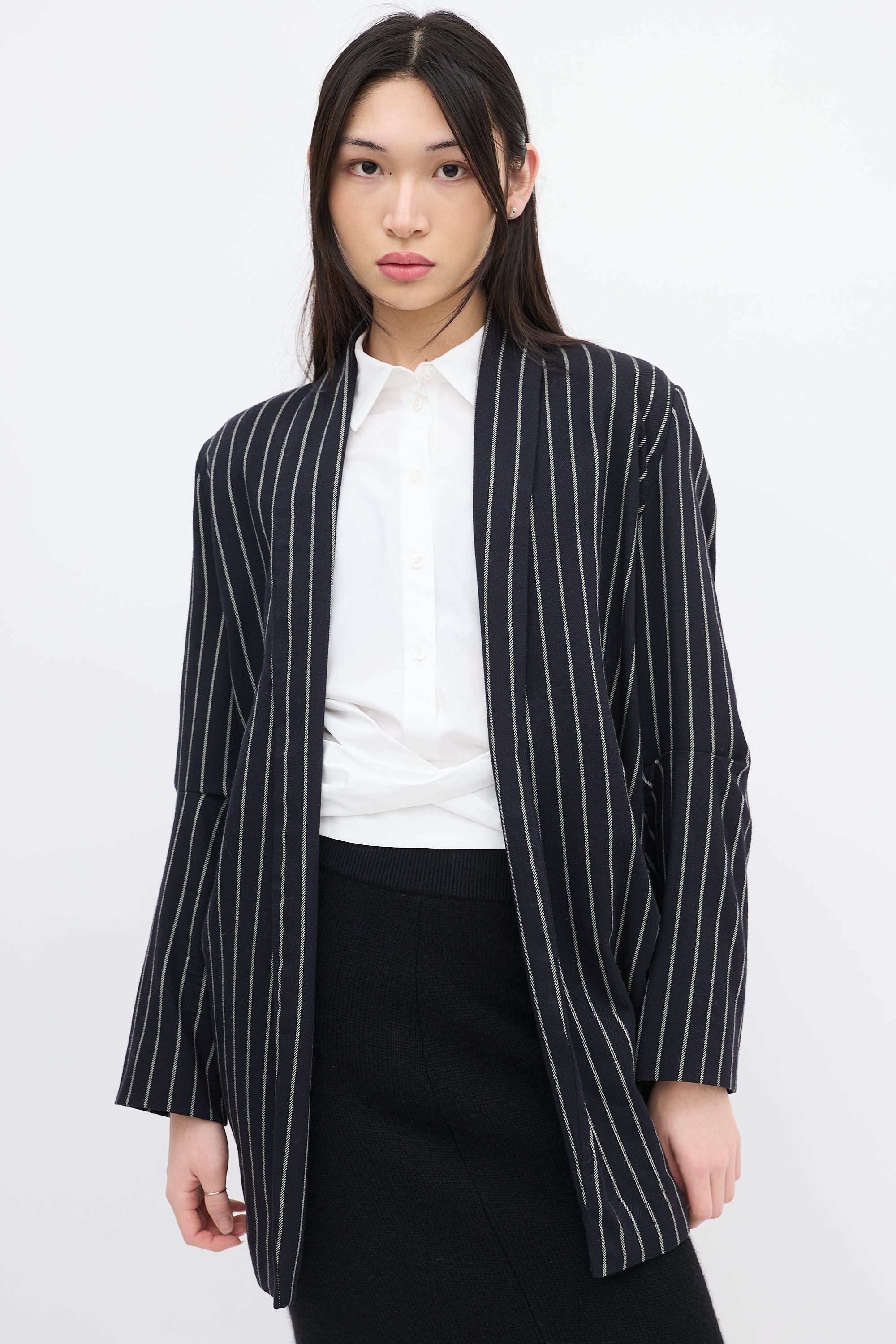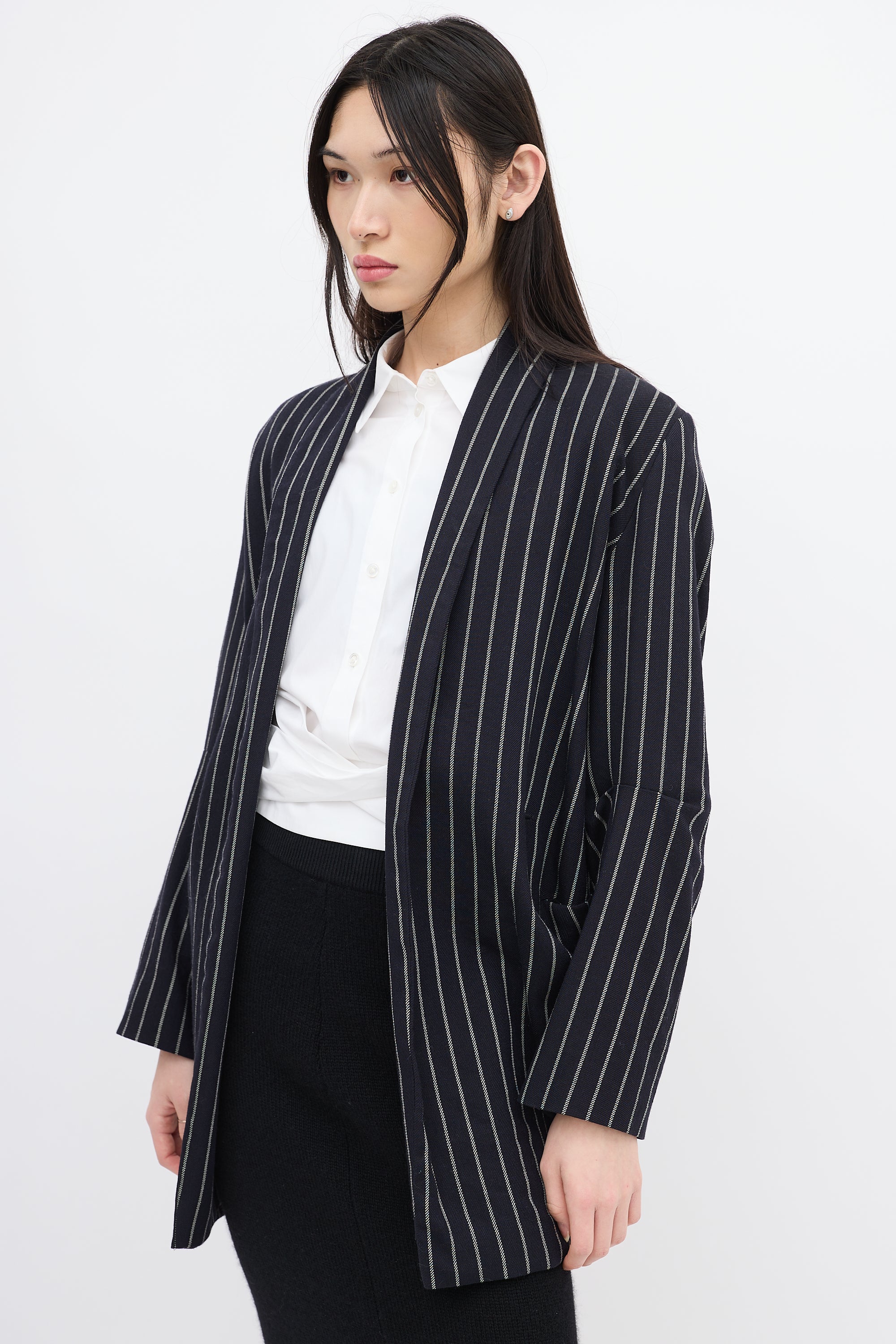 Pre-owned Vivienne Westwood Anglomania navy and white wool striped blazer featuring shawl lapel, open front with two buttonholes, two patch pockets at waist, elbow dart, and high low hem. Styled with belt. Lined.