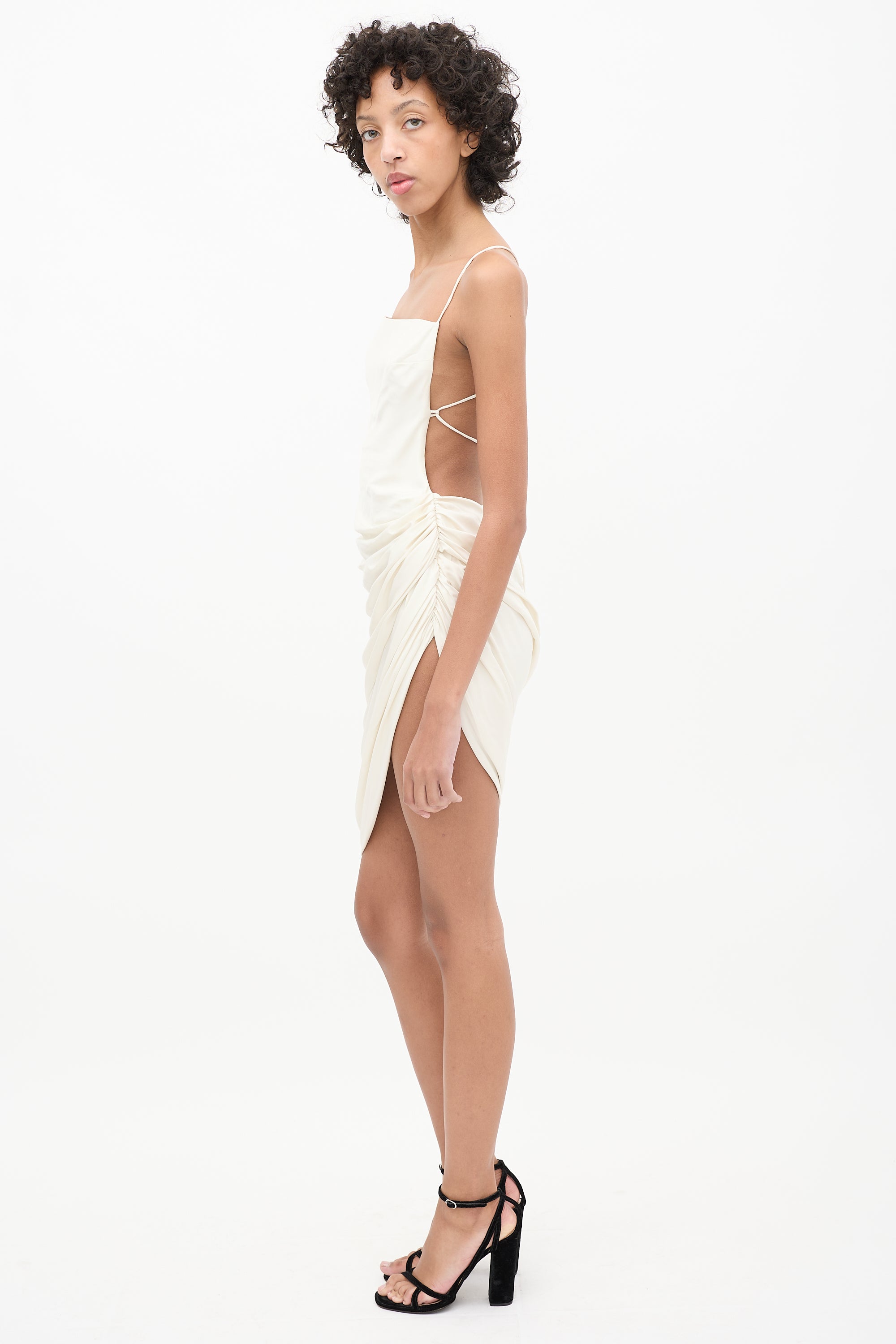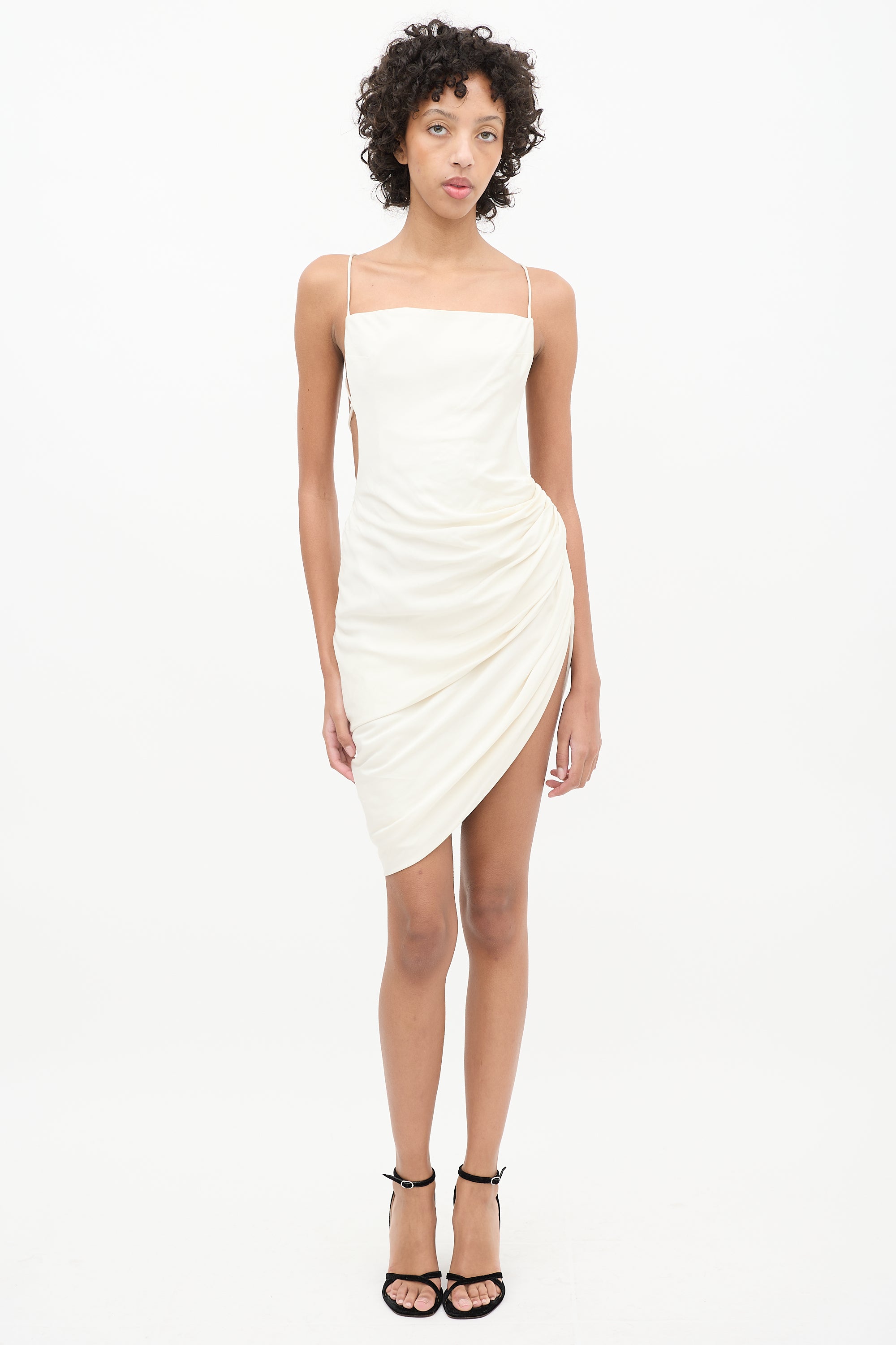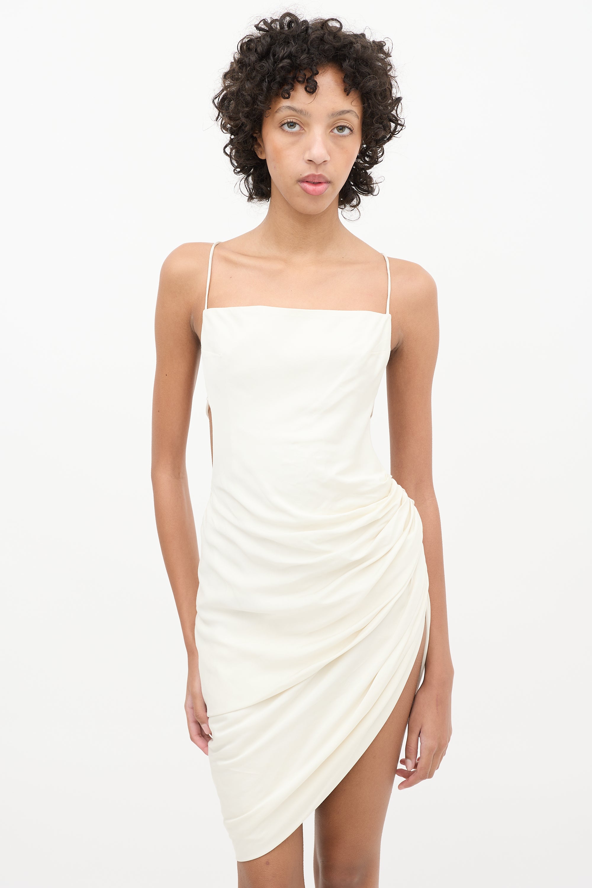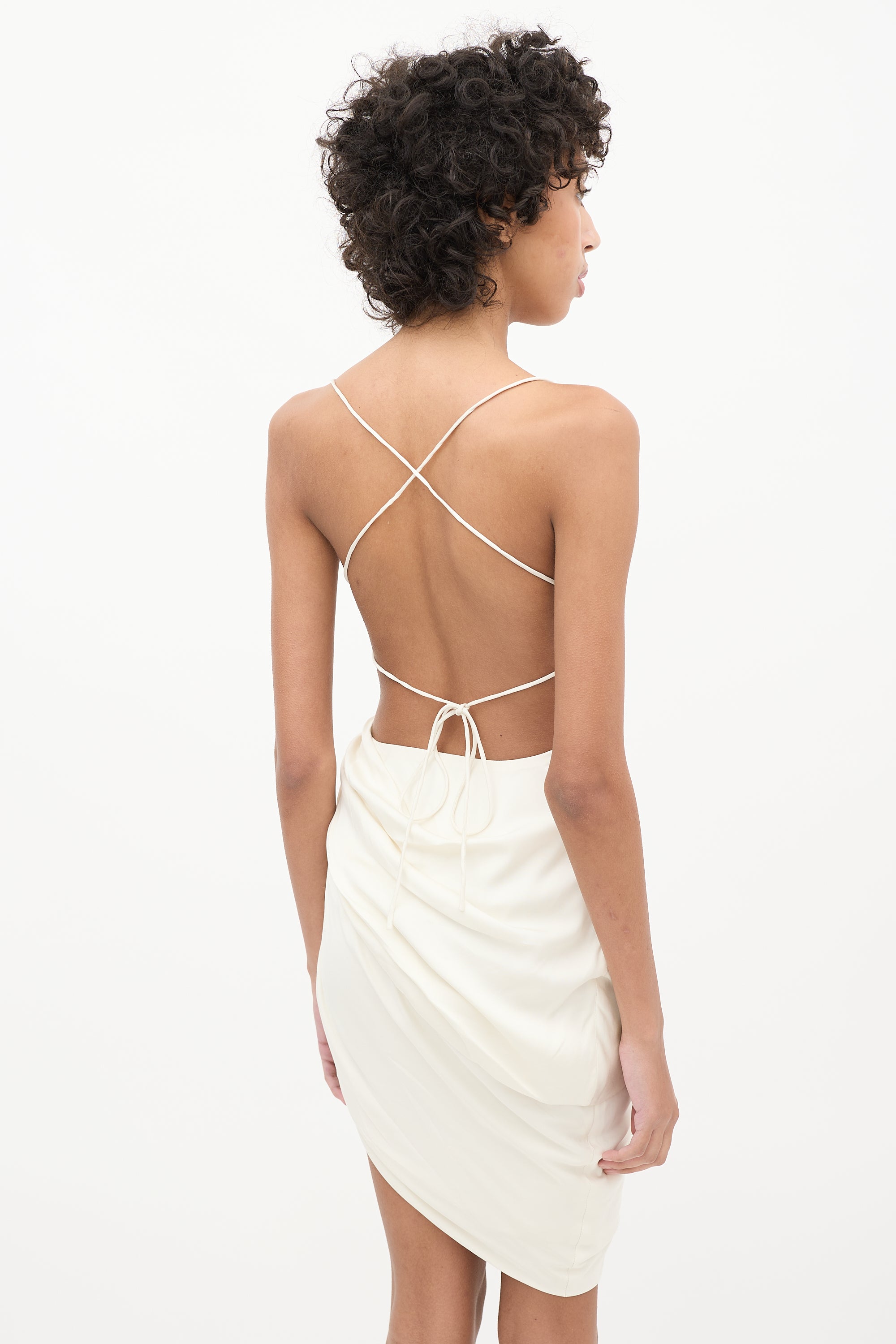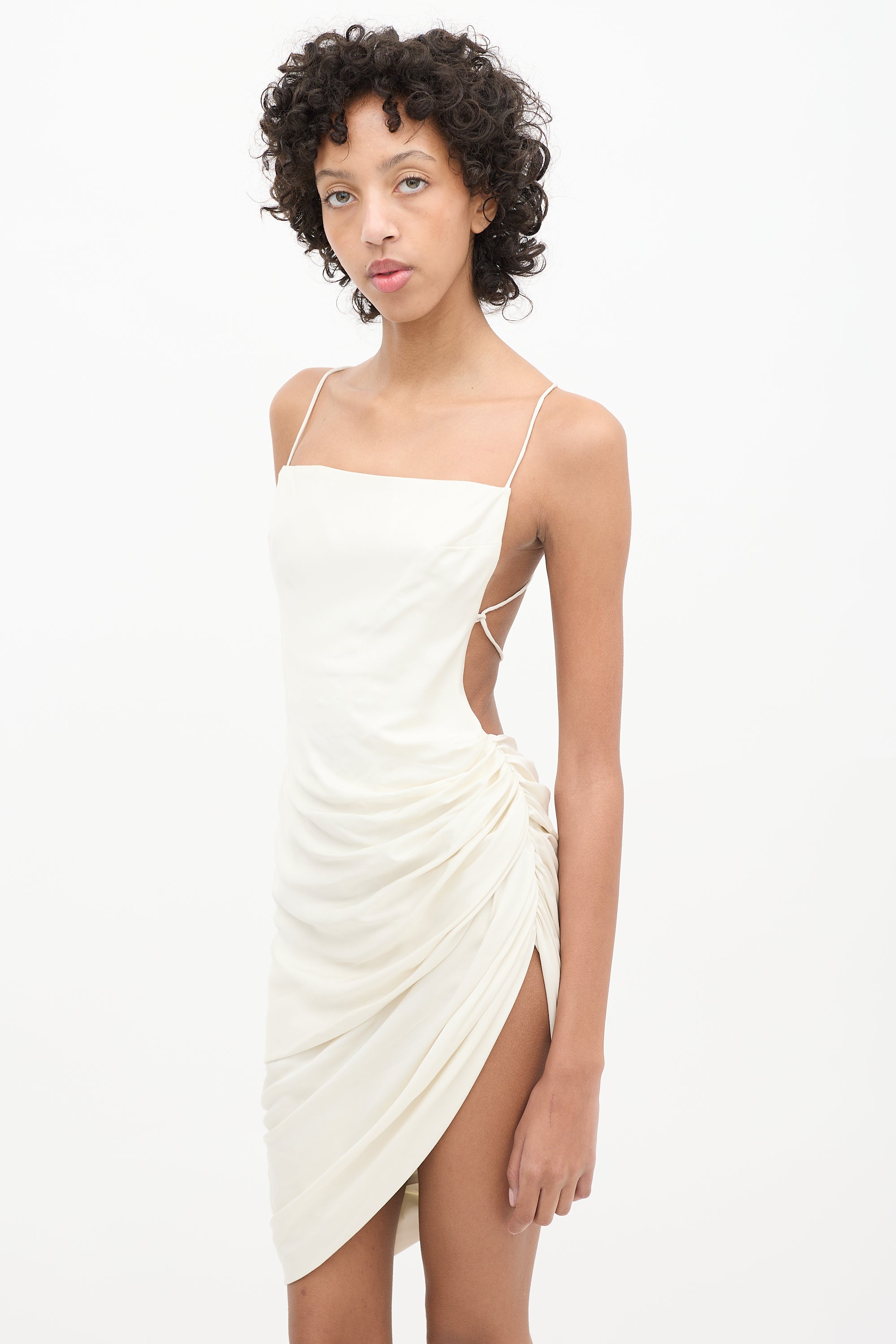 Pre-owned Jacquemus La Robe Saudade dress featuring adjustable spaghetti straps, backless design with criss cross self tie back, gathering at side, and concealed zip closure at side. Lined.