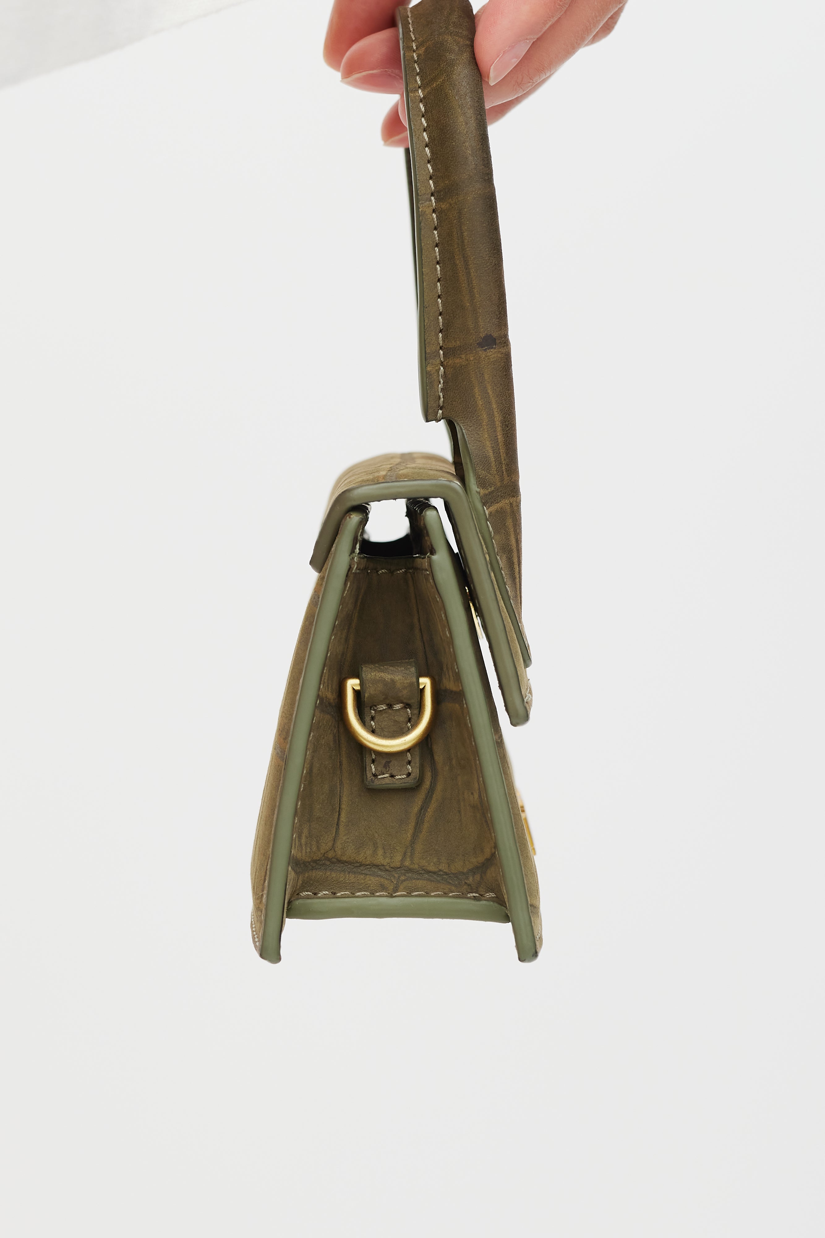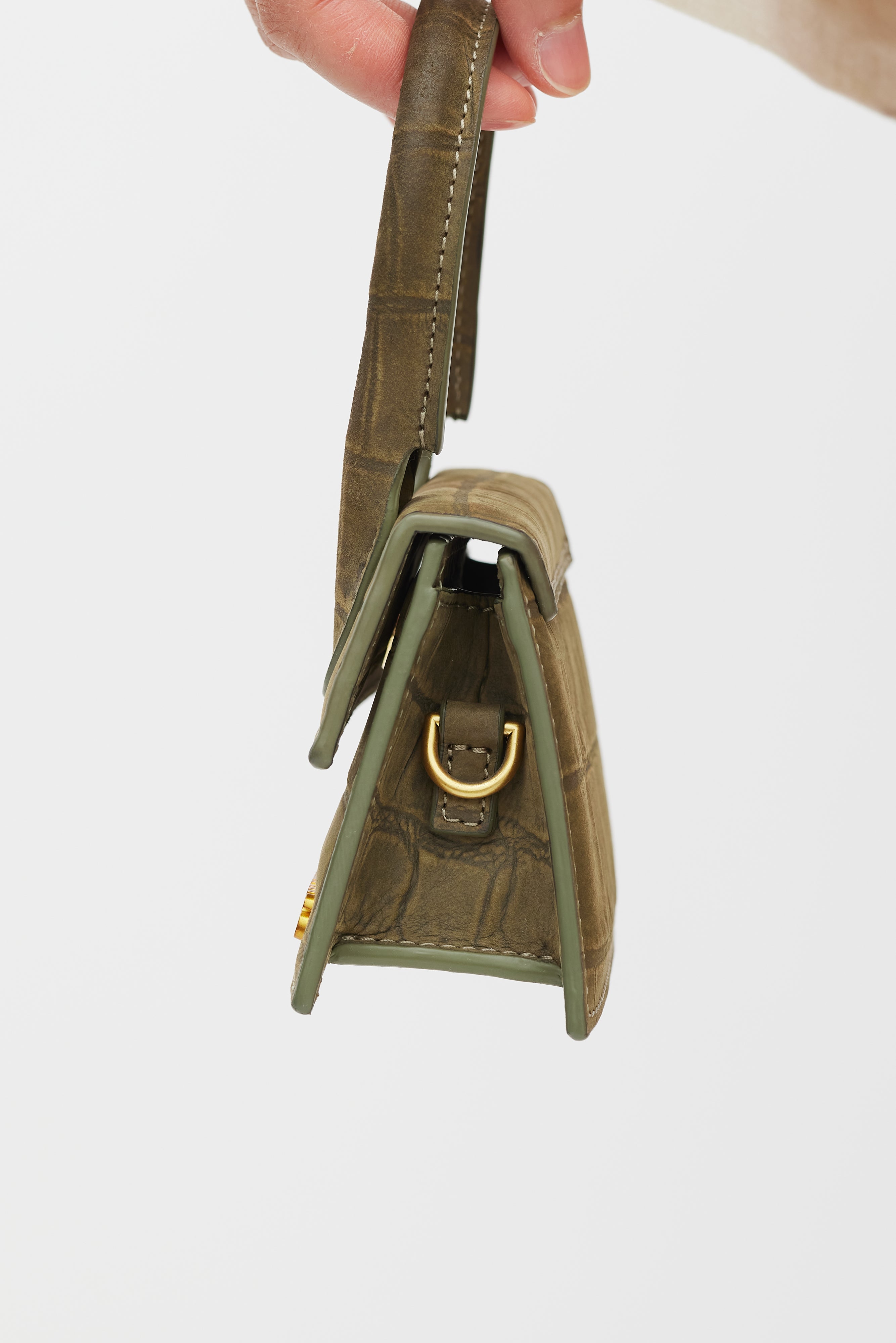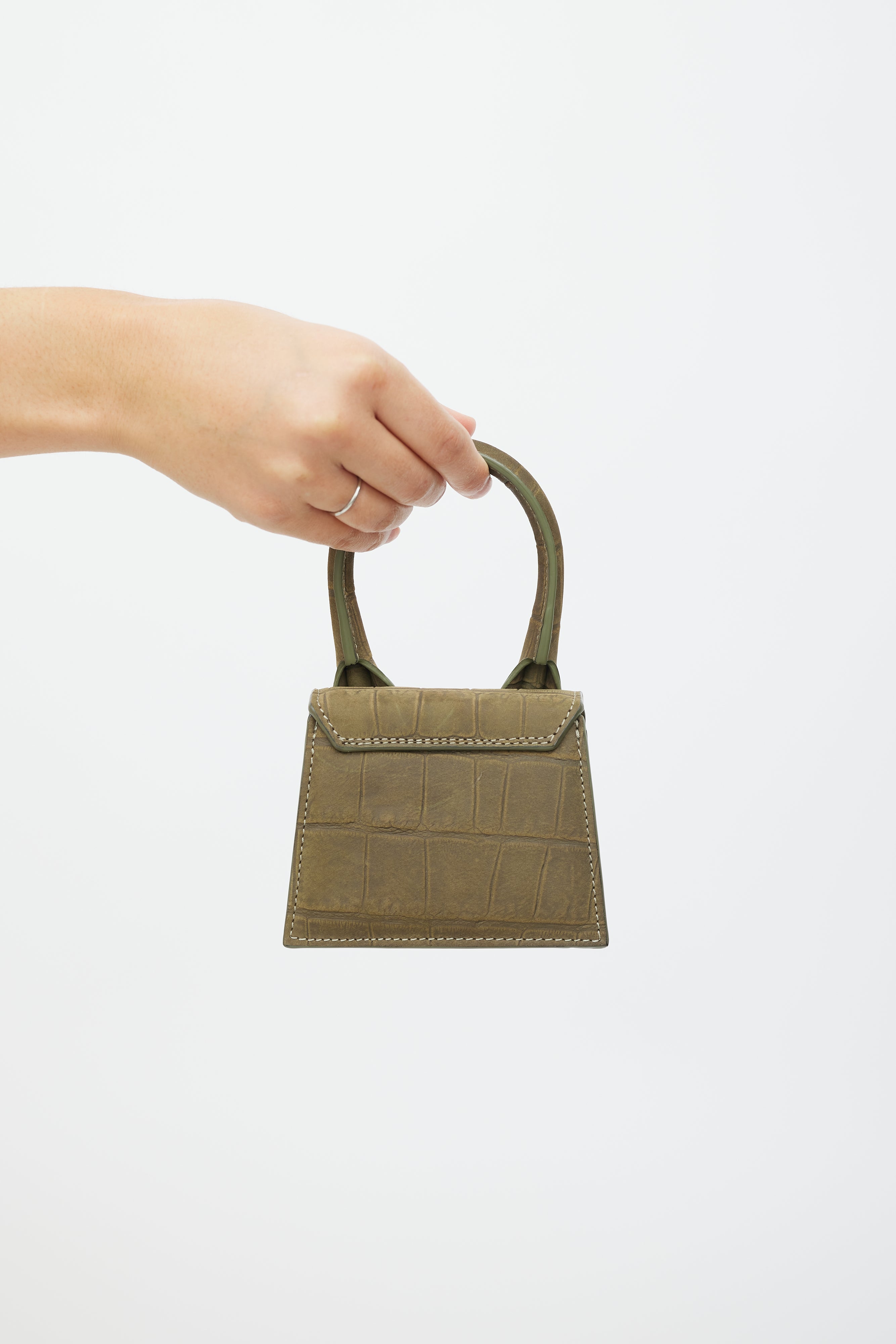 Pre-owned Jacquemus green Le Chiquito leather bag featuring an embossed croc effect throughout, top flap, wrapped top handle, gold tone logo hardware at front, one main compartment, removable shoulder strap, and magnetic snap closure. Comes with original dust bag.
