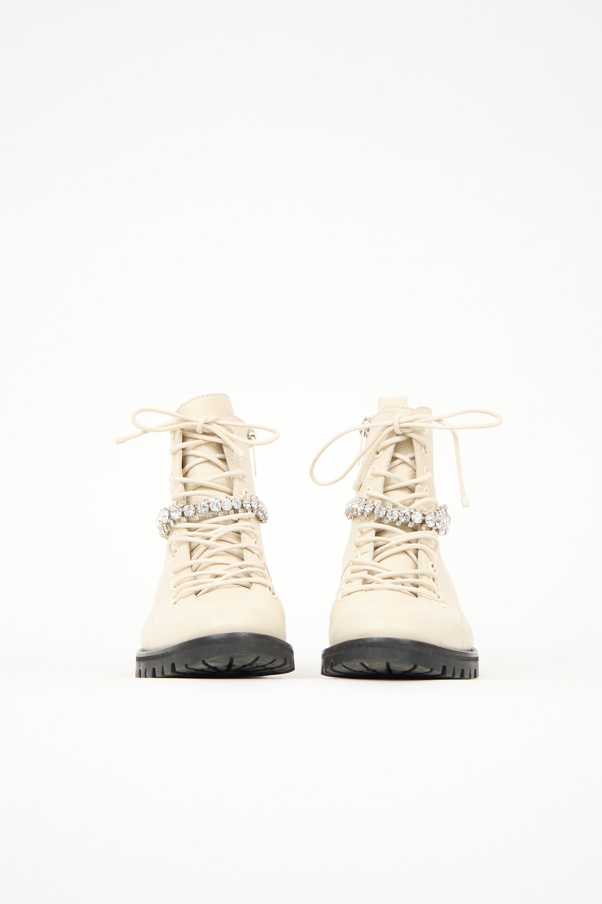 Pre-owned Jimmy Choo cream leather Cruz combat boots featuring a rounded toe, lace up front, side zip, crystal embellished strap at vamp, and pull tab at counter.