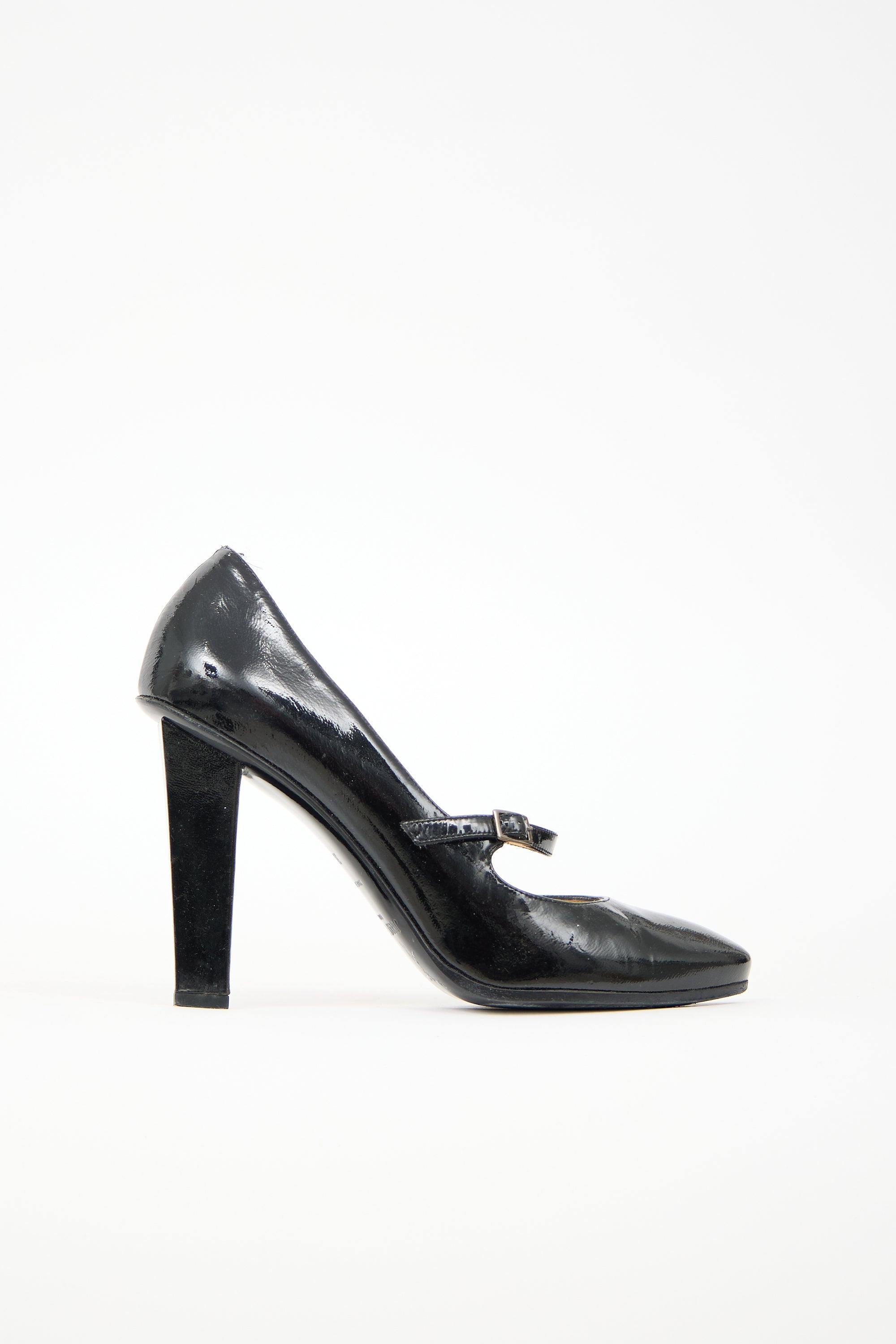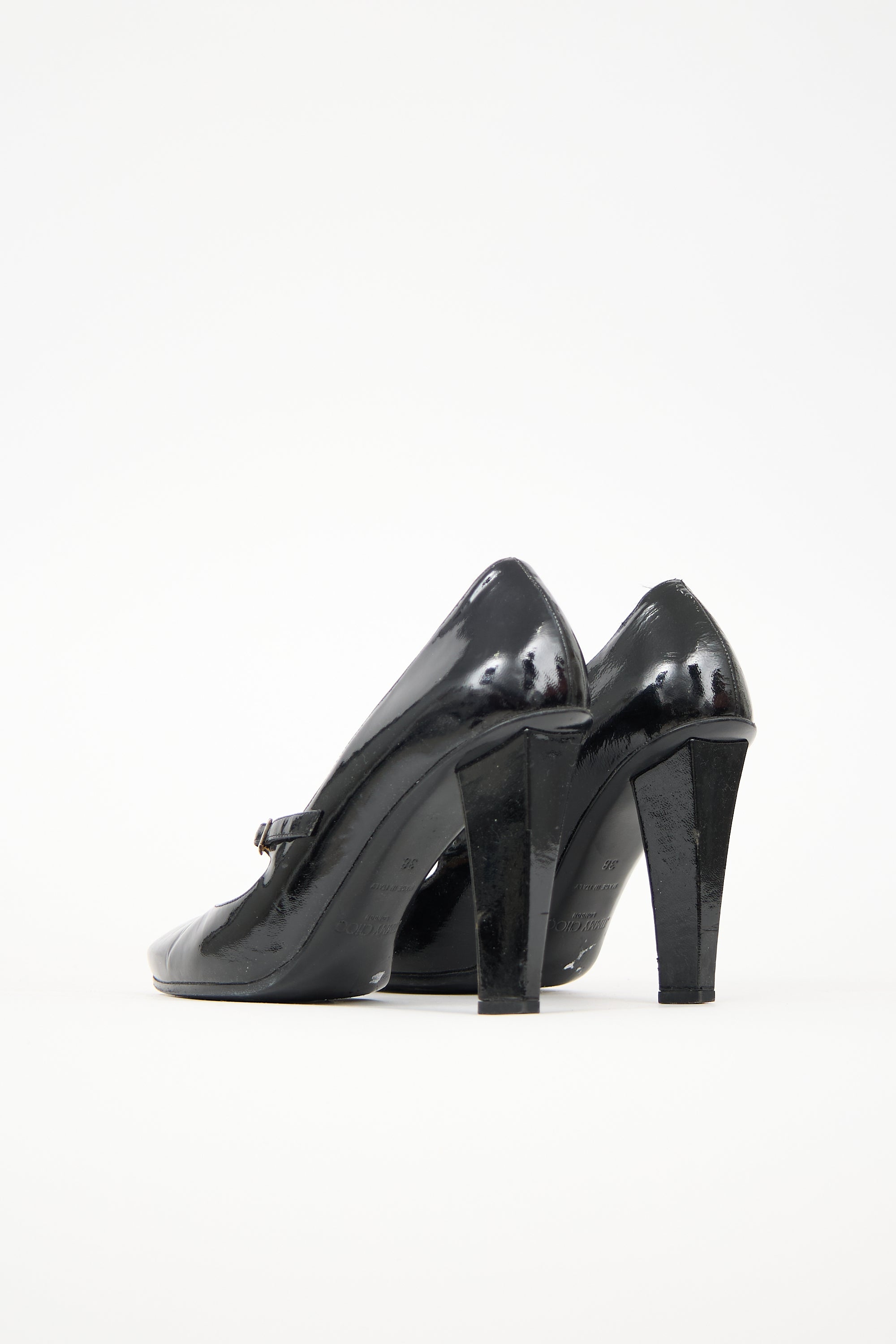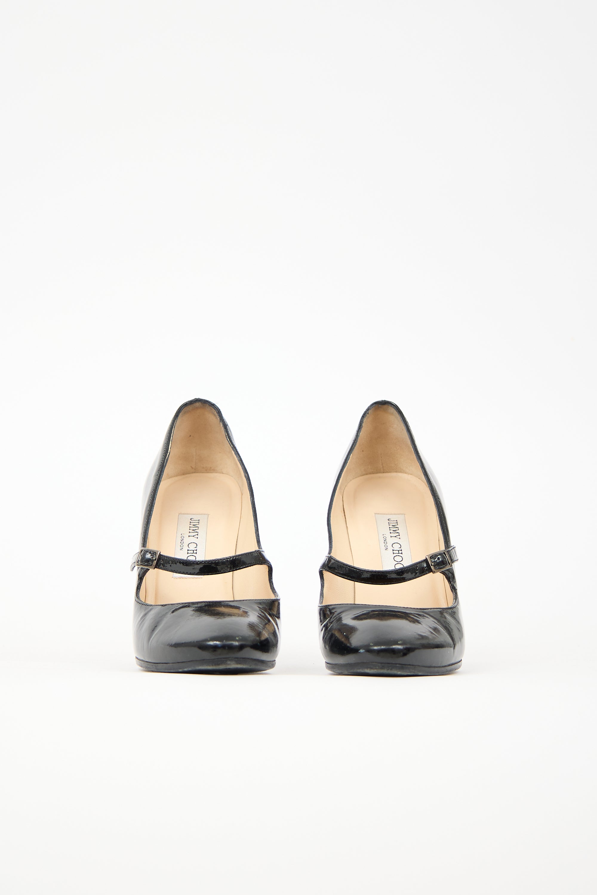 Pre-owned Jimmy Choo black patent leather Kindle Mary Jane pumps featuring almond toe, thin buckled instep strap, and covered block heel.