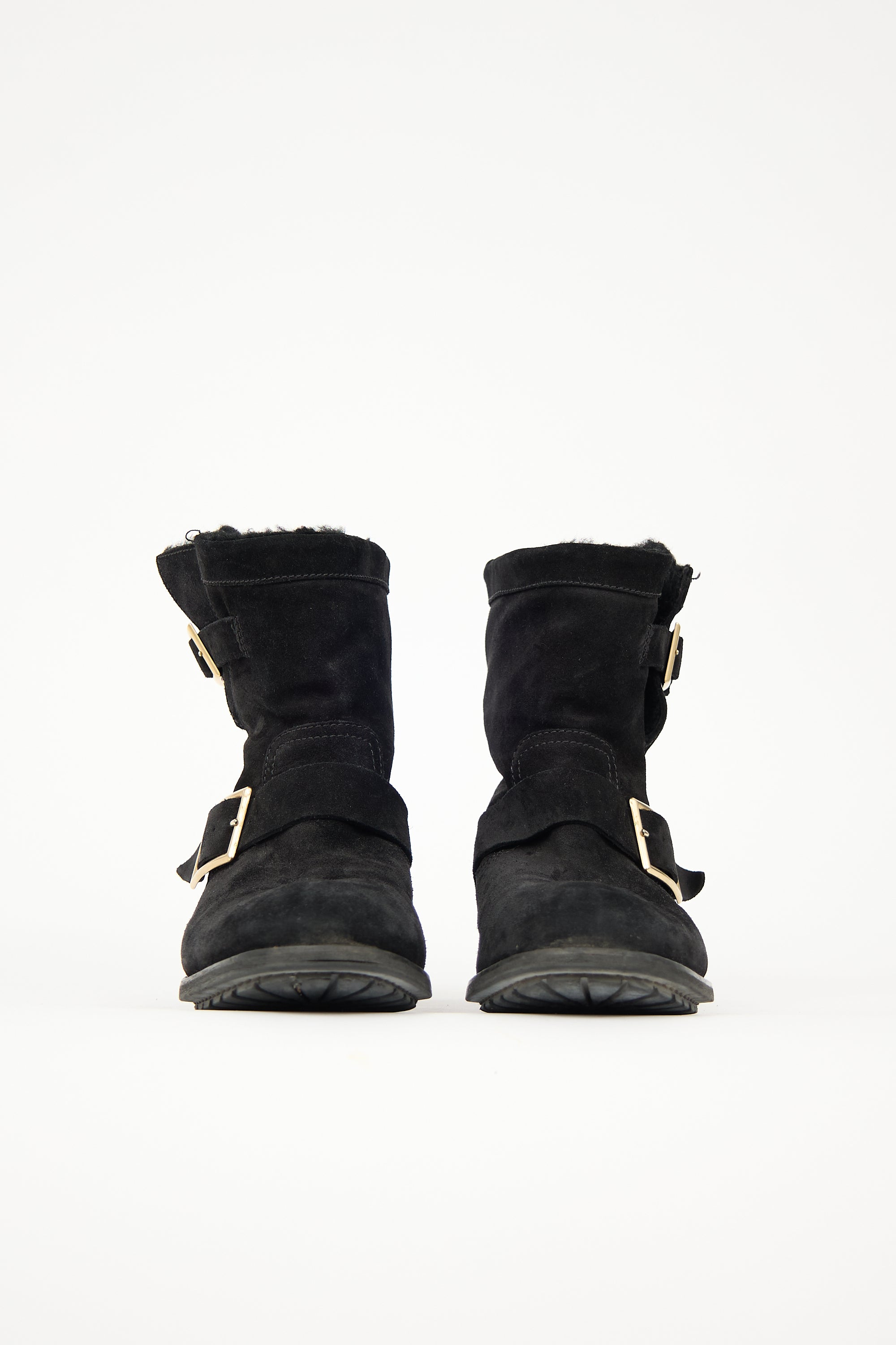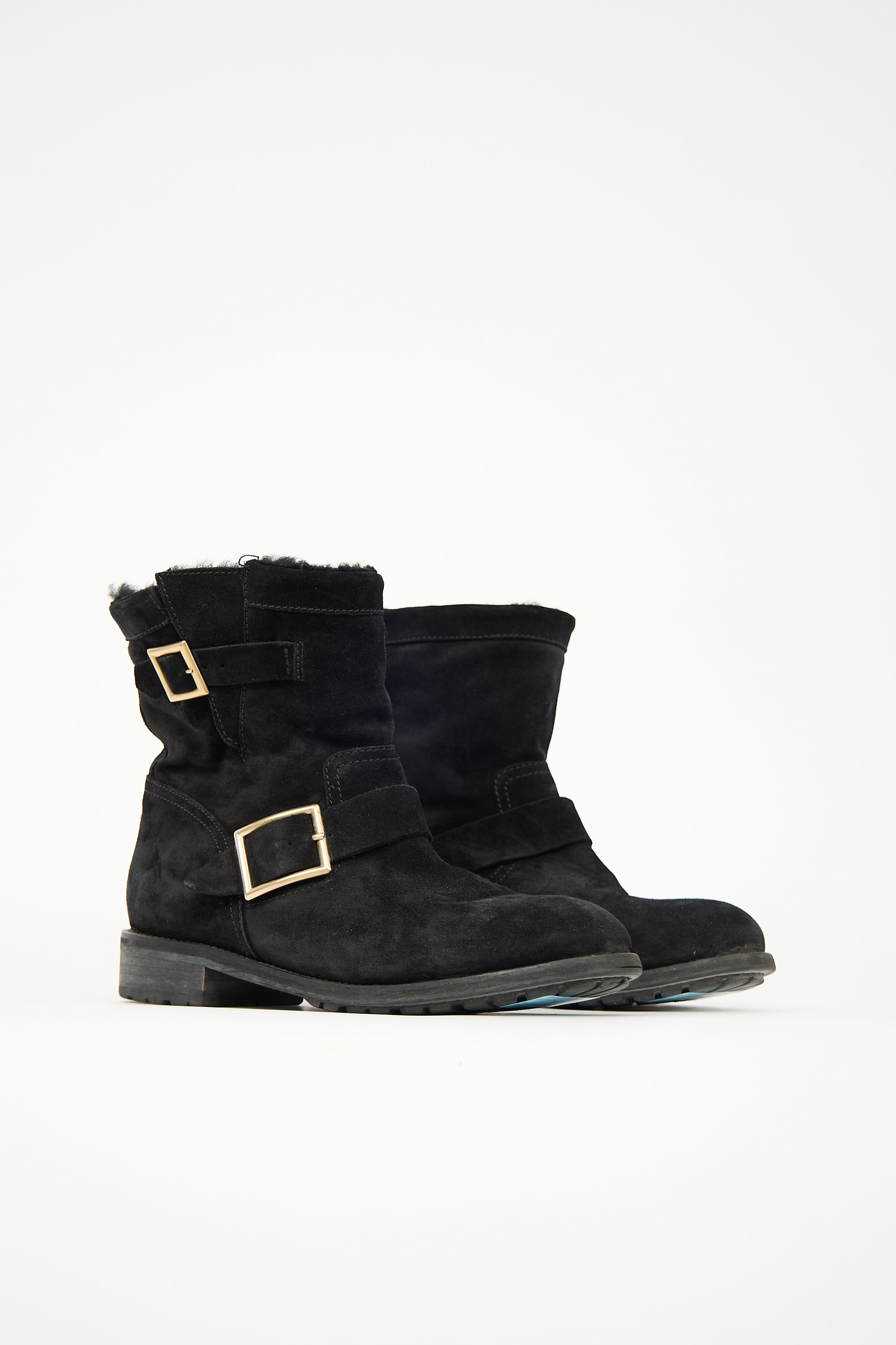 Pre-owned Jimmy Choo black suede Youth boots featuring rounded toe, two buckled strap design, etched logo plaque at counter, pull on entry, shearling interior, and tonal stacked heel.