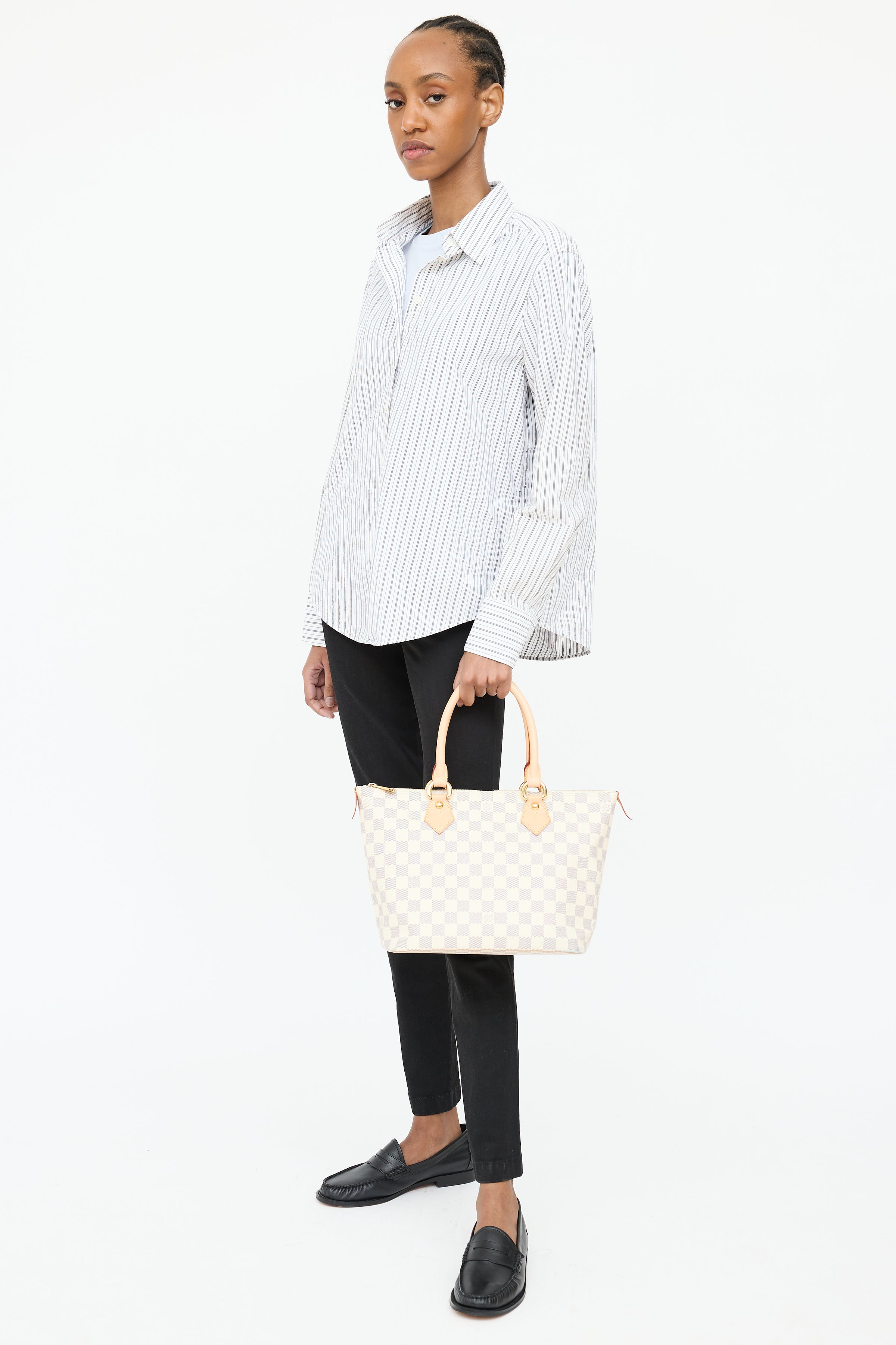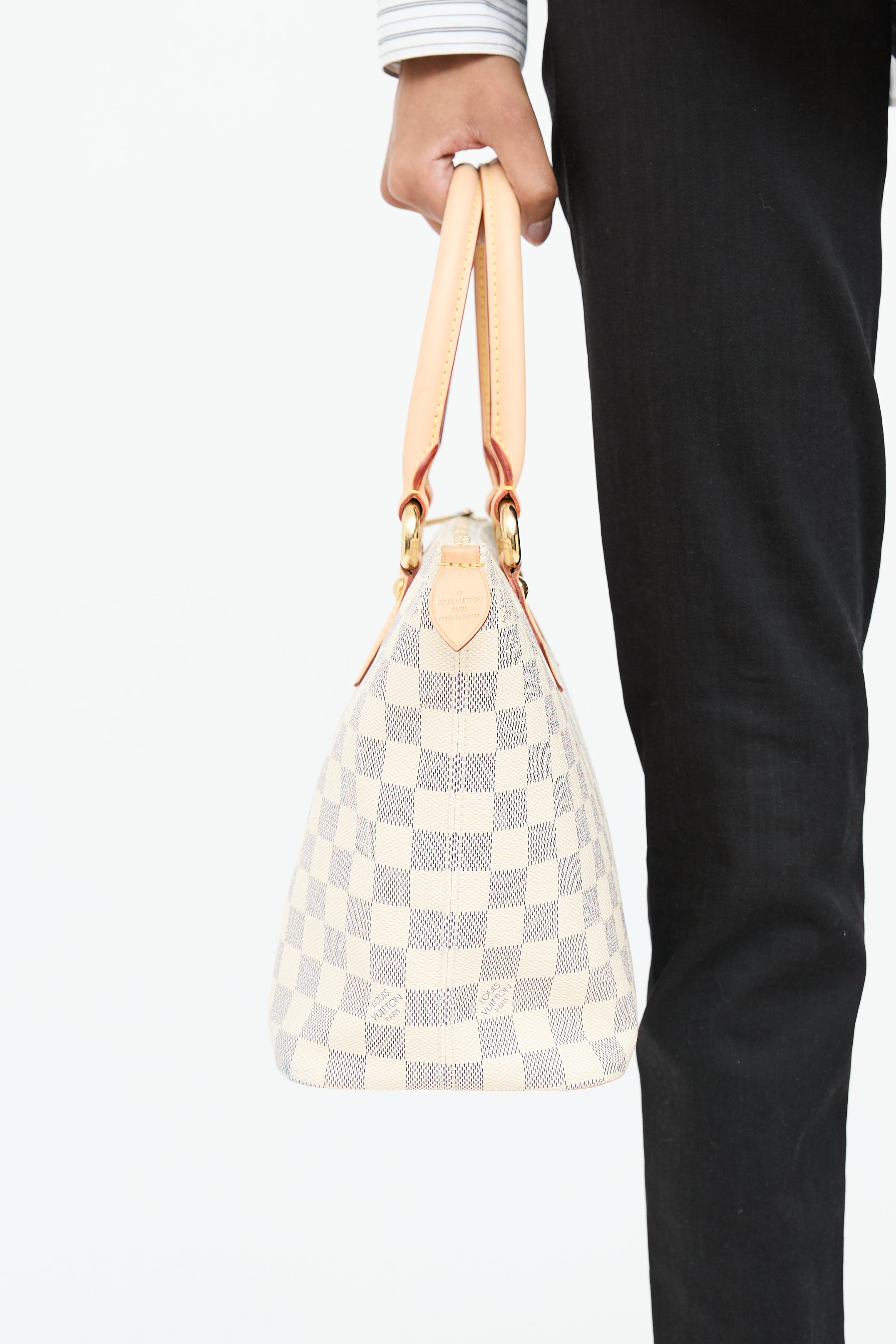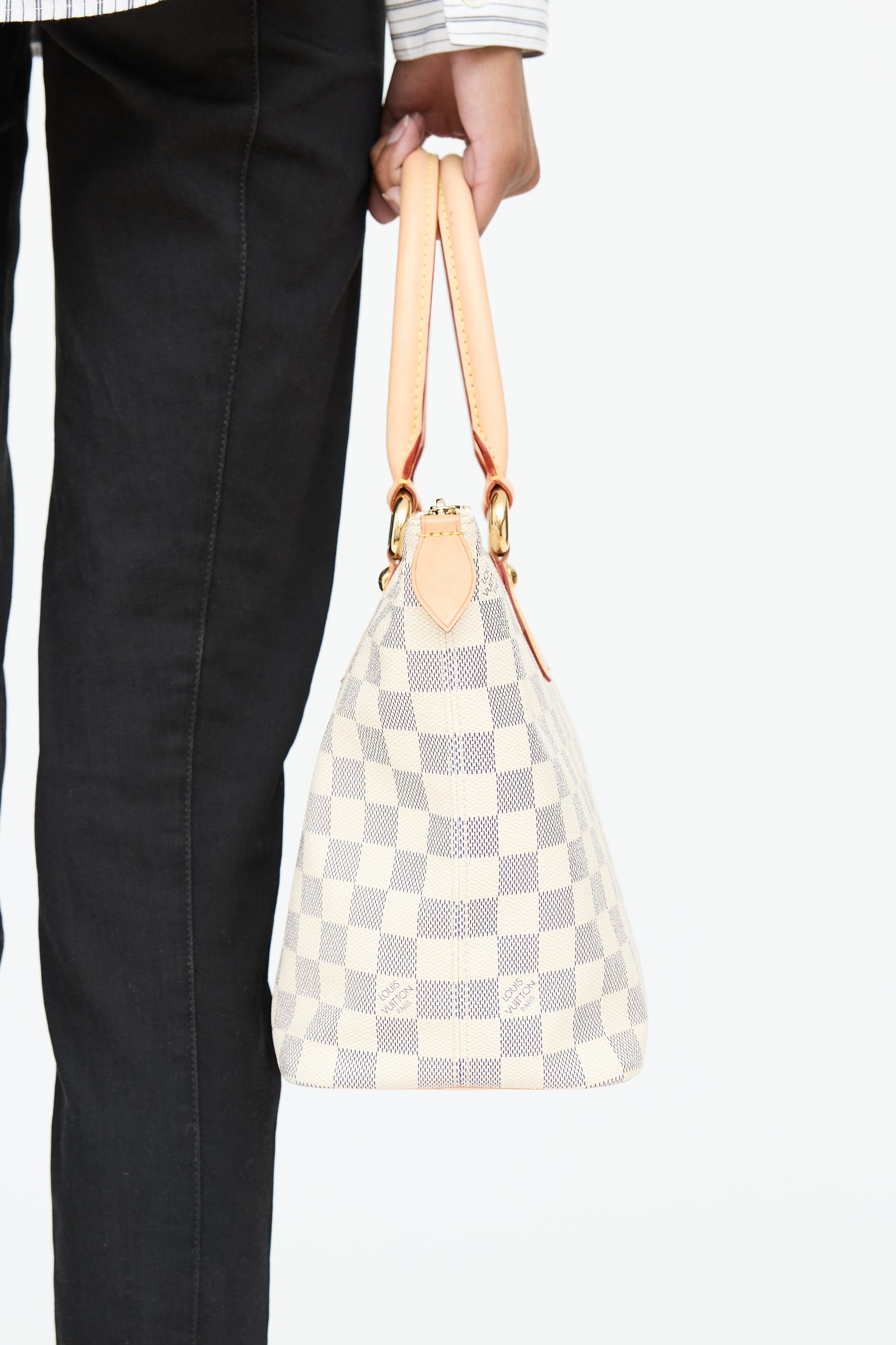 Pre-owned Louis Vuitton 2007 cream Damier Azur Saleya bag featuring coated canvas, dual rolled leather handles, structured base, gold tone hardware and top zip closure. Suede lined interior featuring d-ring hardware, and two slip pockets.