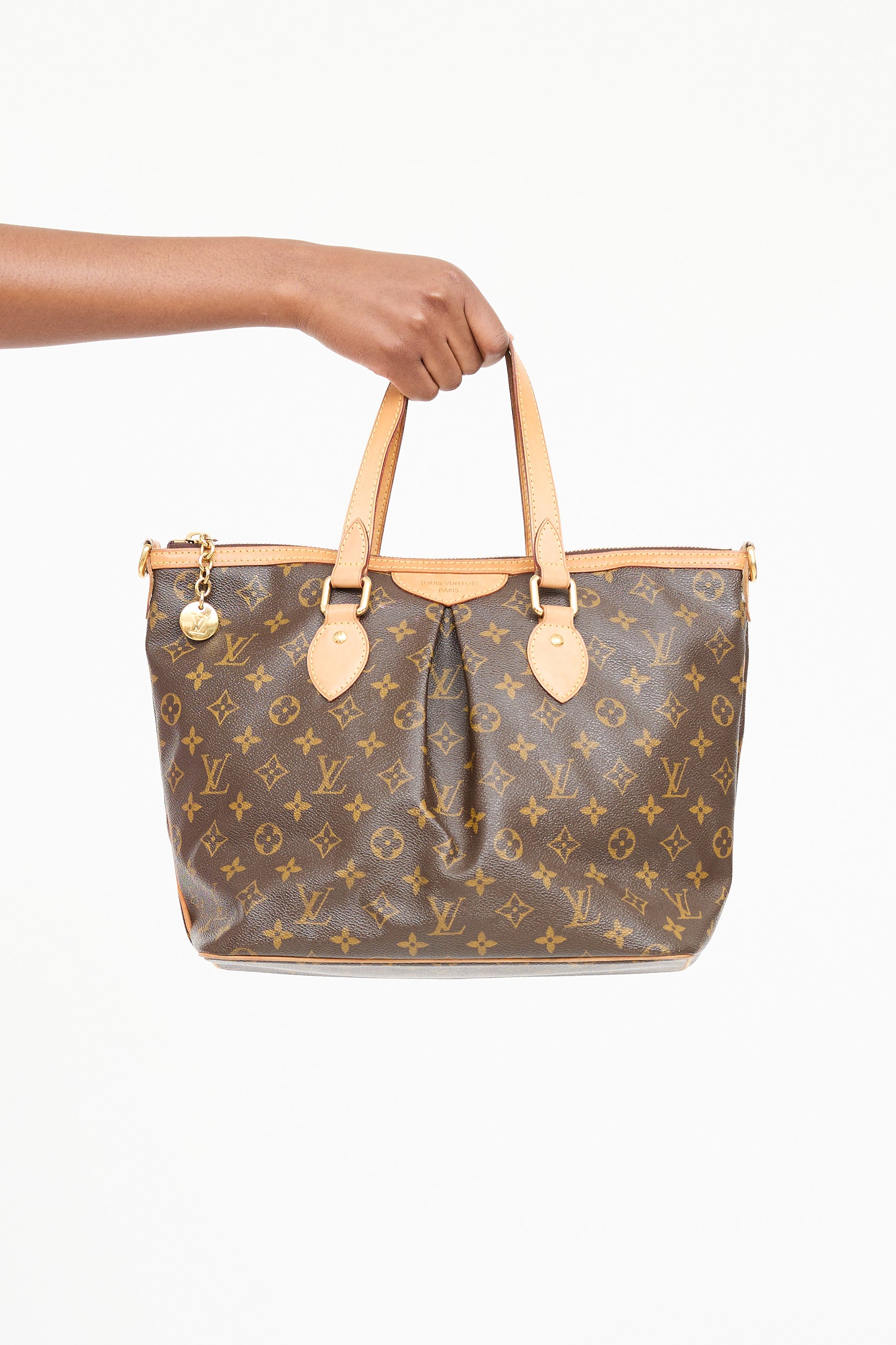 Pre-owned Louis Vuitton 2010 Monogram Palermo bag featuring signature monogram coated canvas, Vachetta leather trim, dual flat top handles, detachable shoulder strap, inverted box pleat detail at front and back, zip closure at top with logo charm zipper tab and gold tone hardware. Interior features one main compartment, three slip pockets, one cell phone pocket and brown canvas lining.