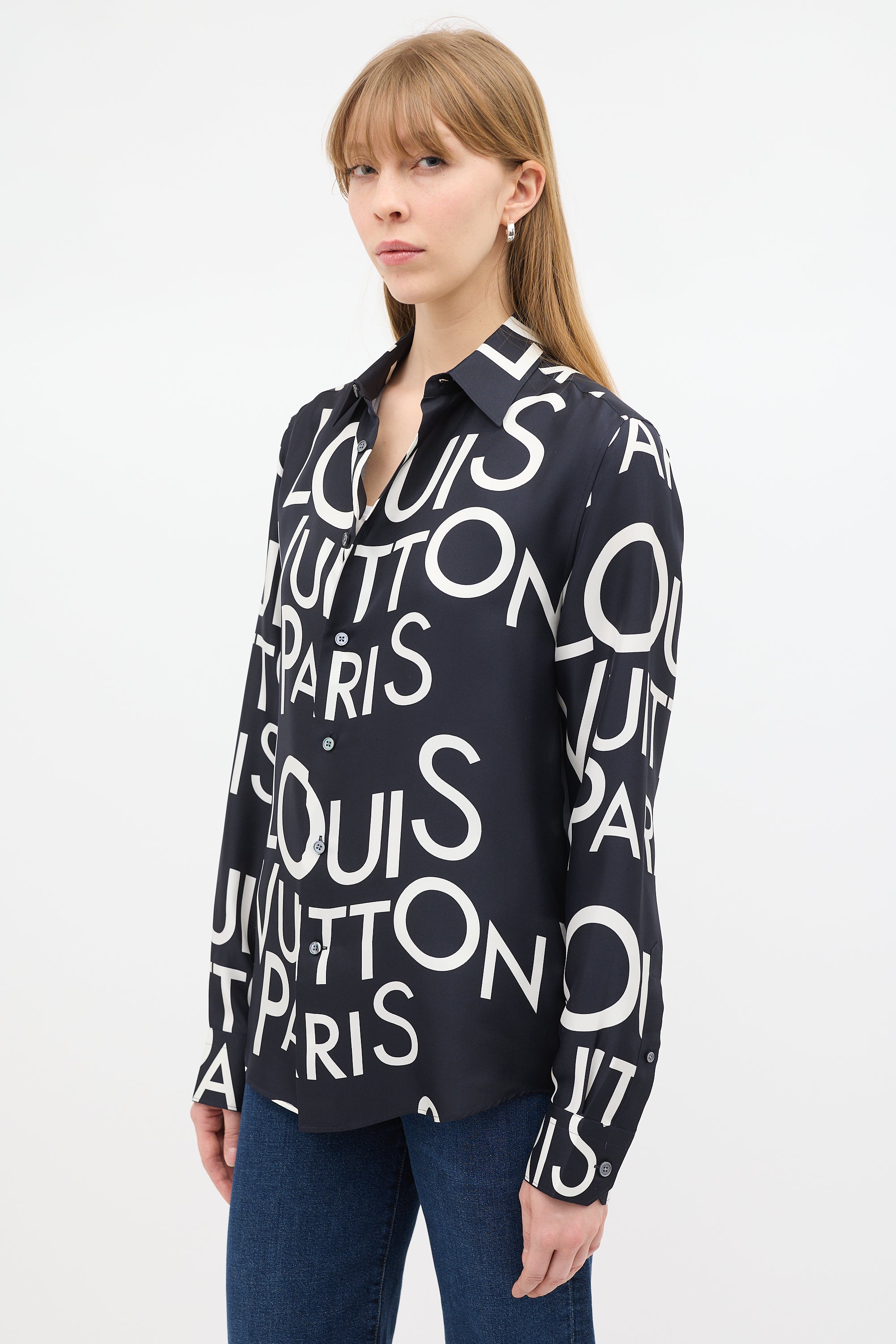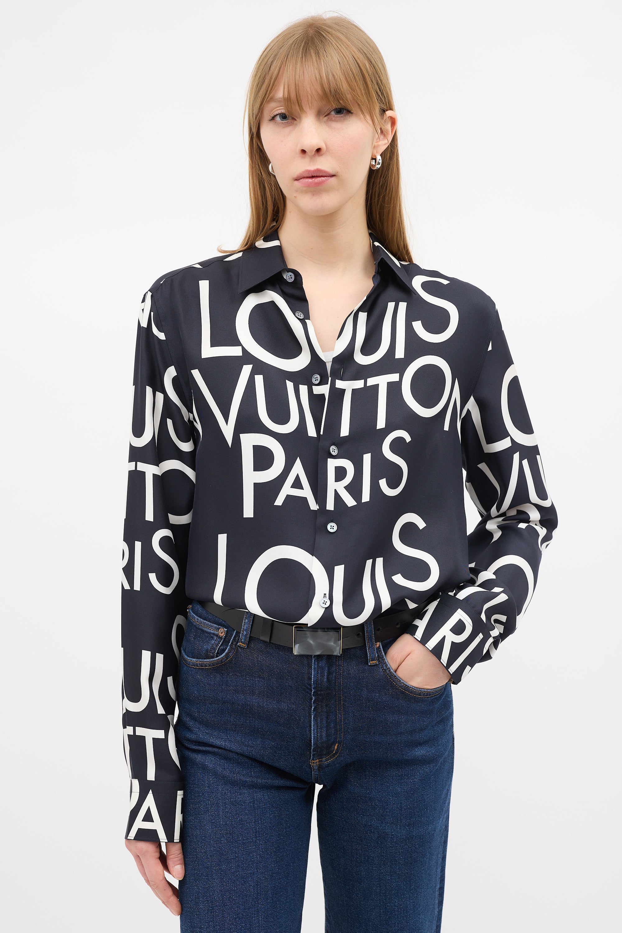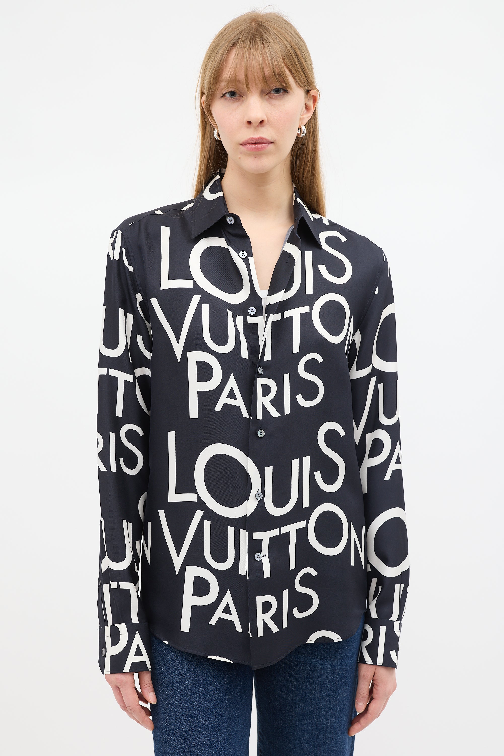 Pre-owned Louis Vuitton black and white silk shirt featuring logo lettering throughout, straight collar, button up front, and buttoned cuffs.
