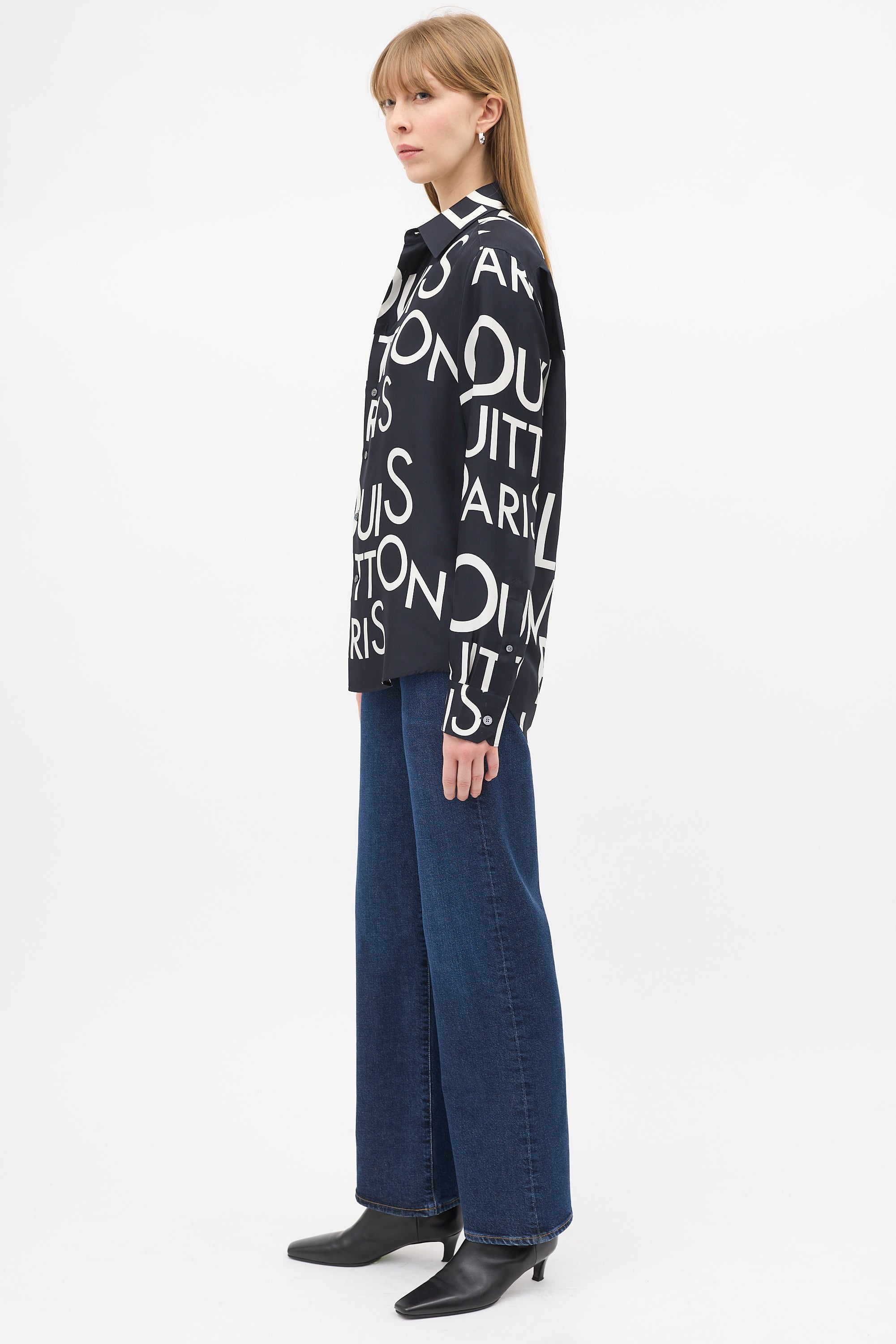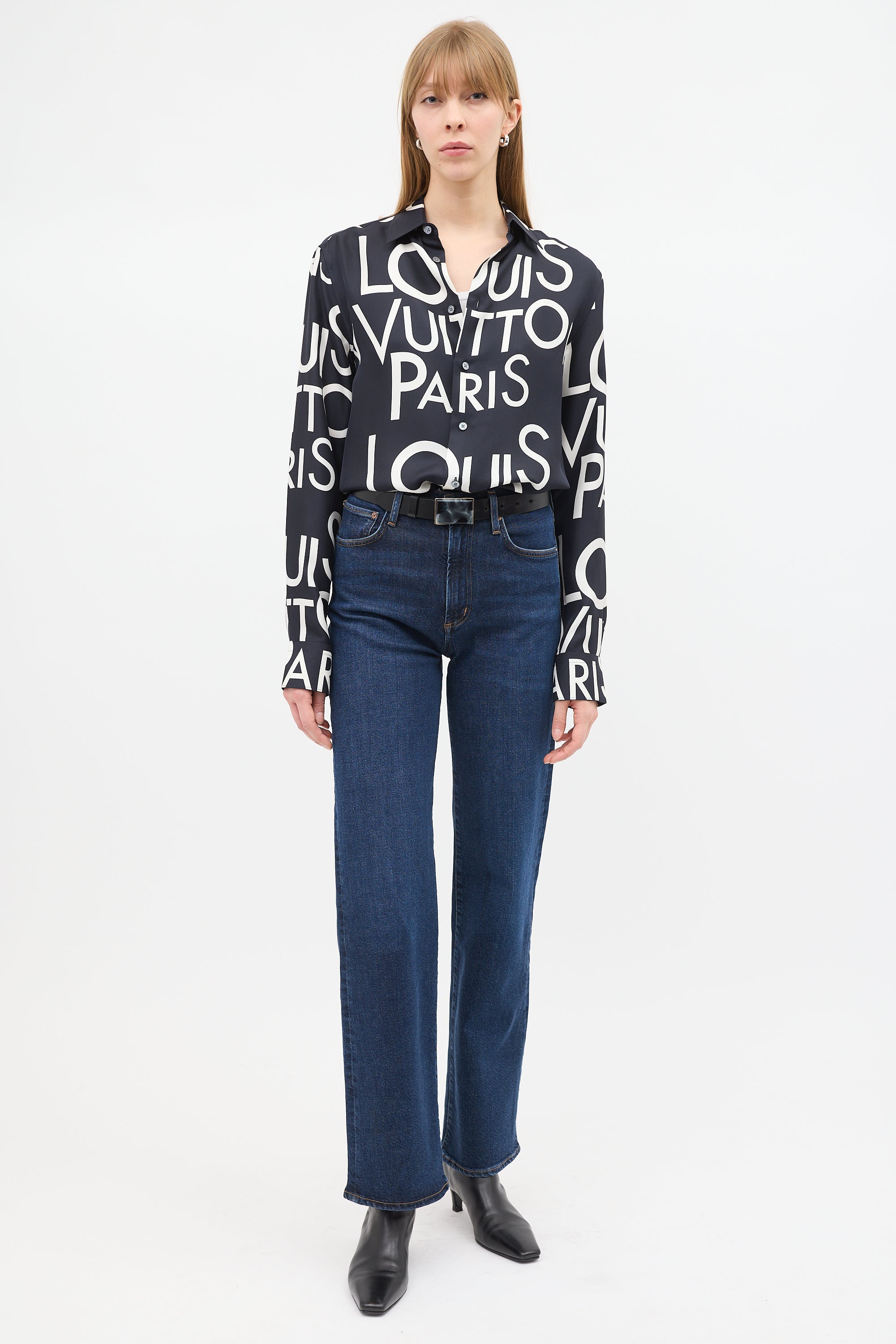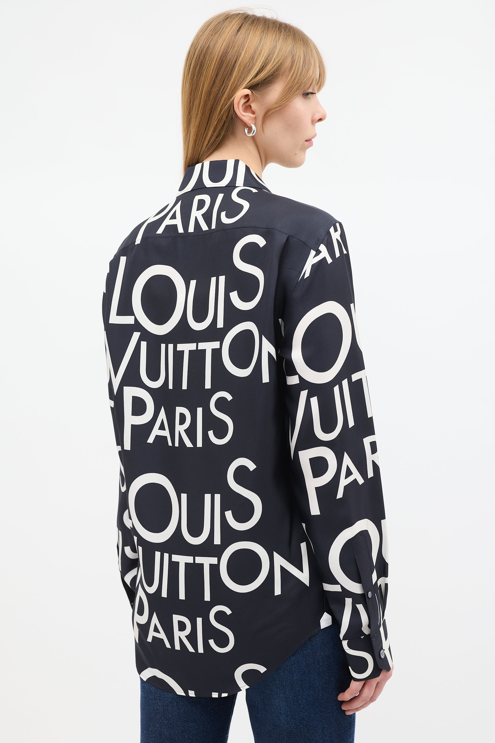 Pre-owned Louis Vuitton black and white silk shirt featuring logo lettering throughout, straight collar, button up front, and buttoned cuffs.