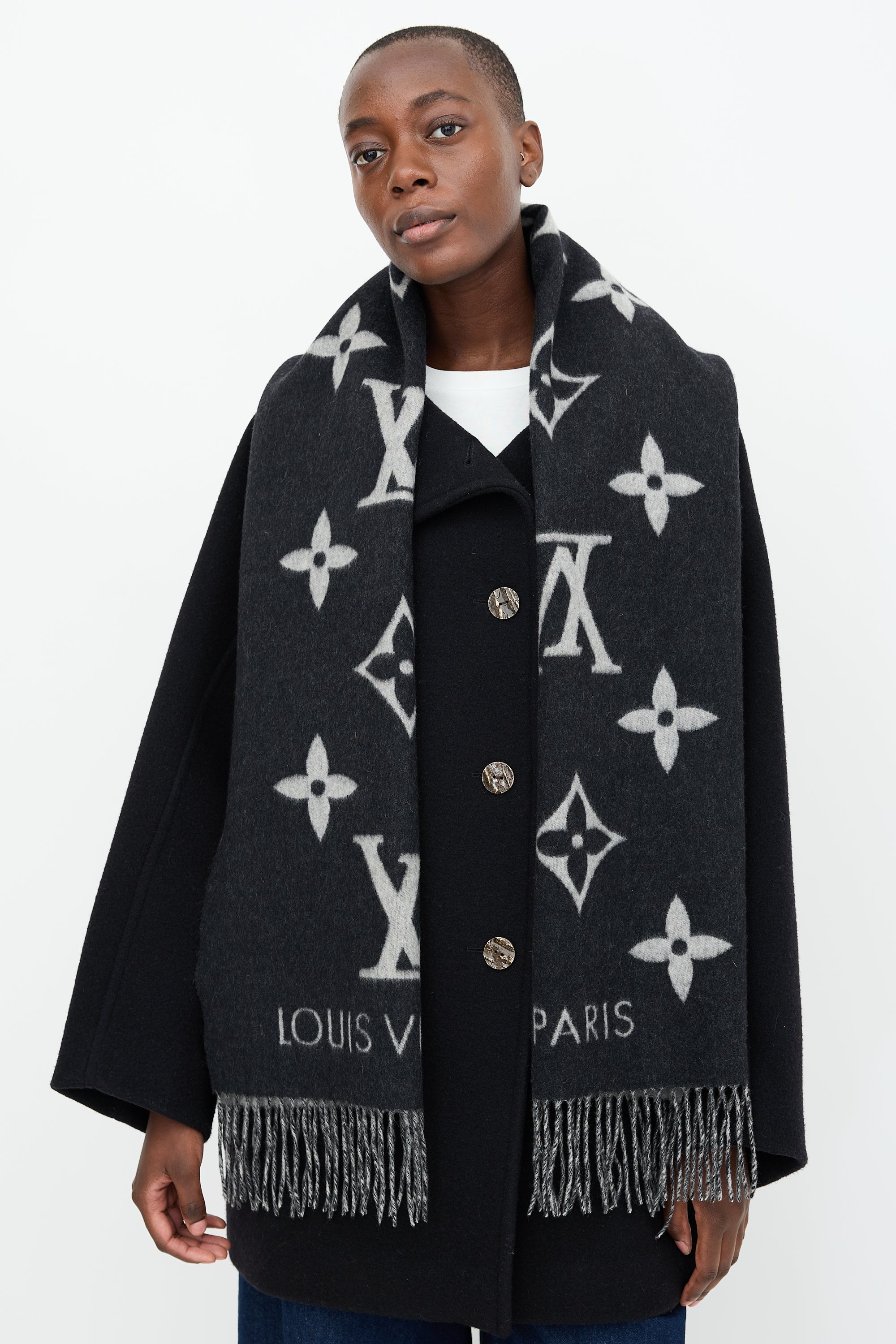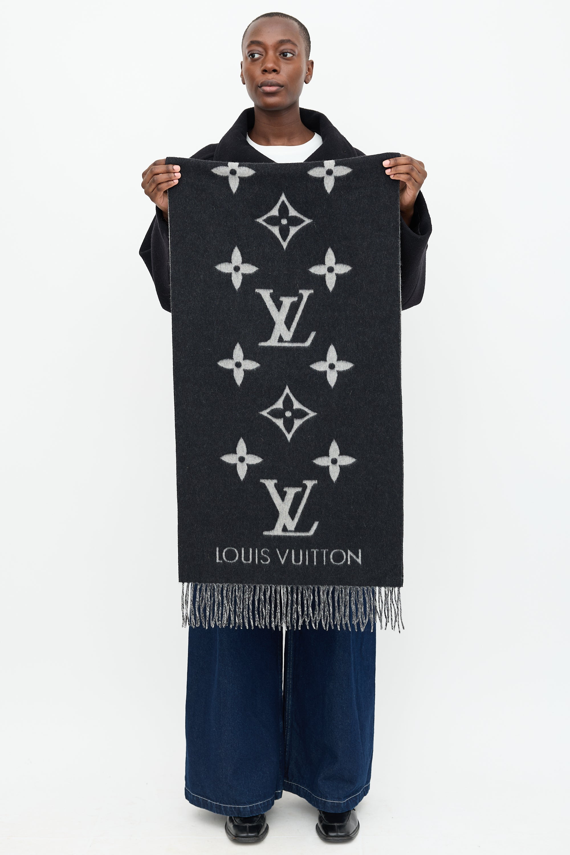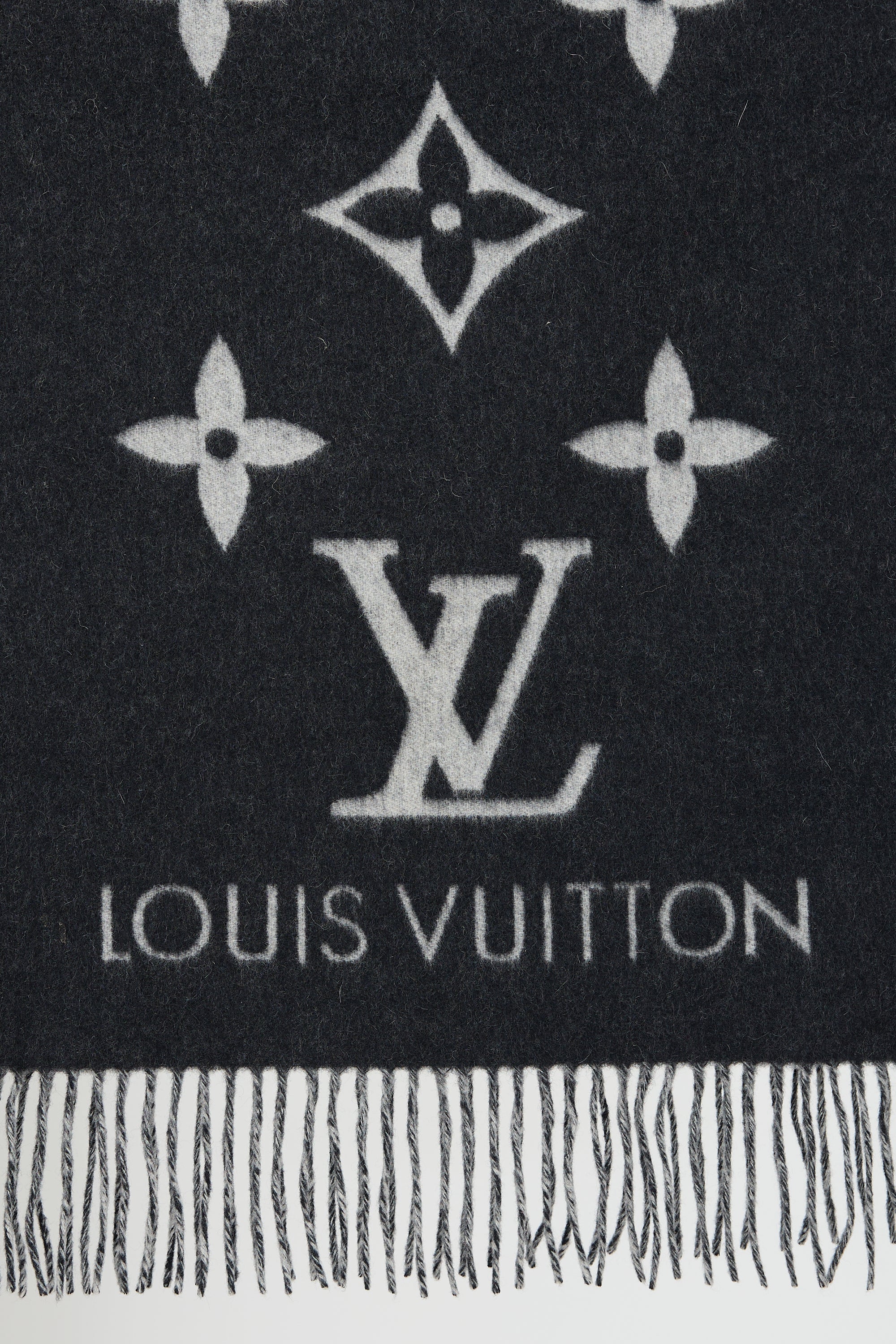 Pre-owned Louis Vuitton black and grey cashmere Reykjavik scarf featuring signature monogram intarsia and fringe trim. Comes with original box.