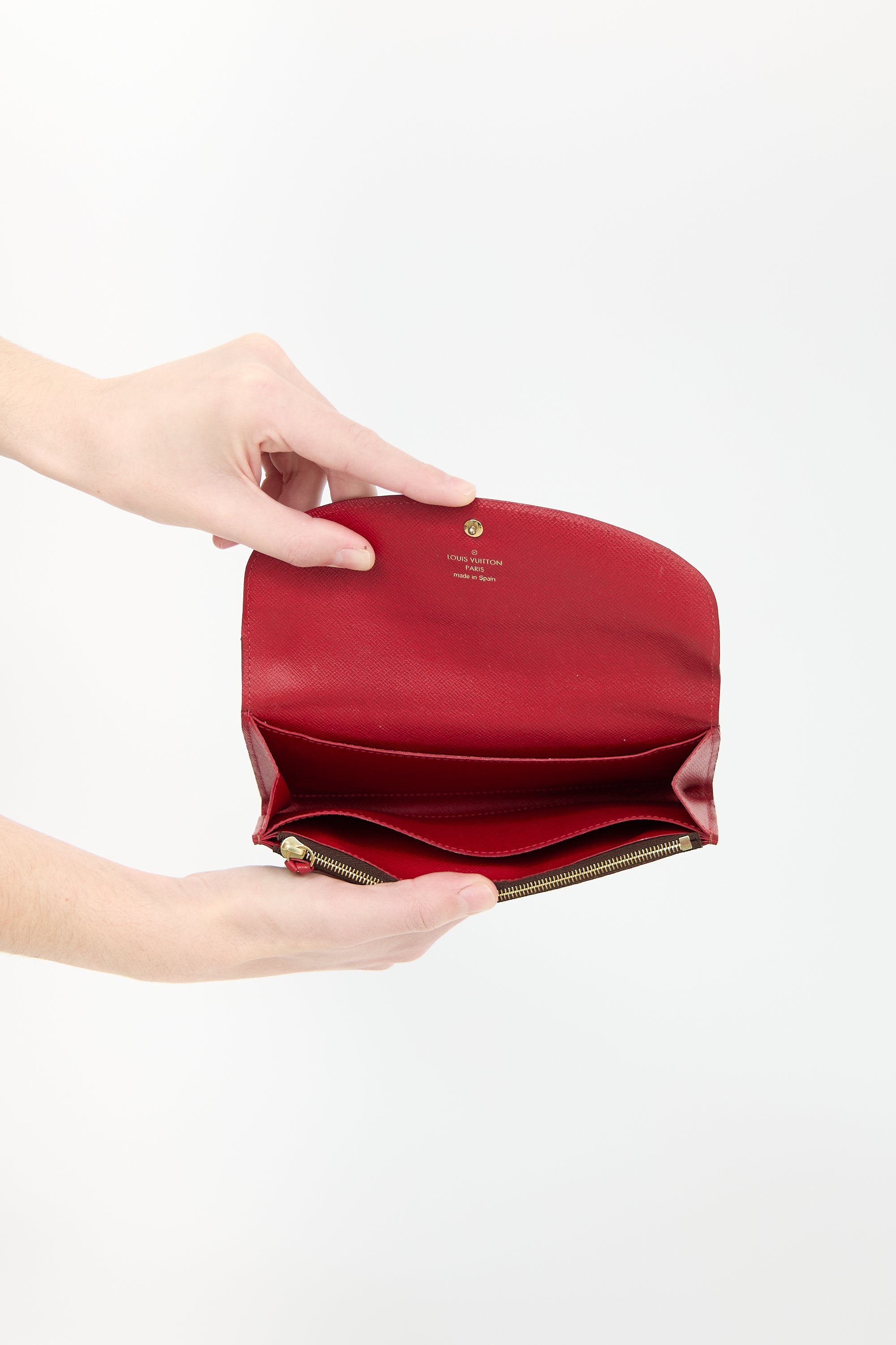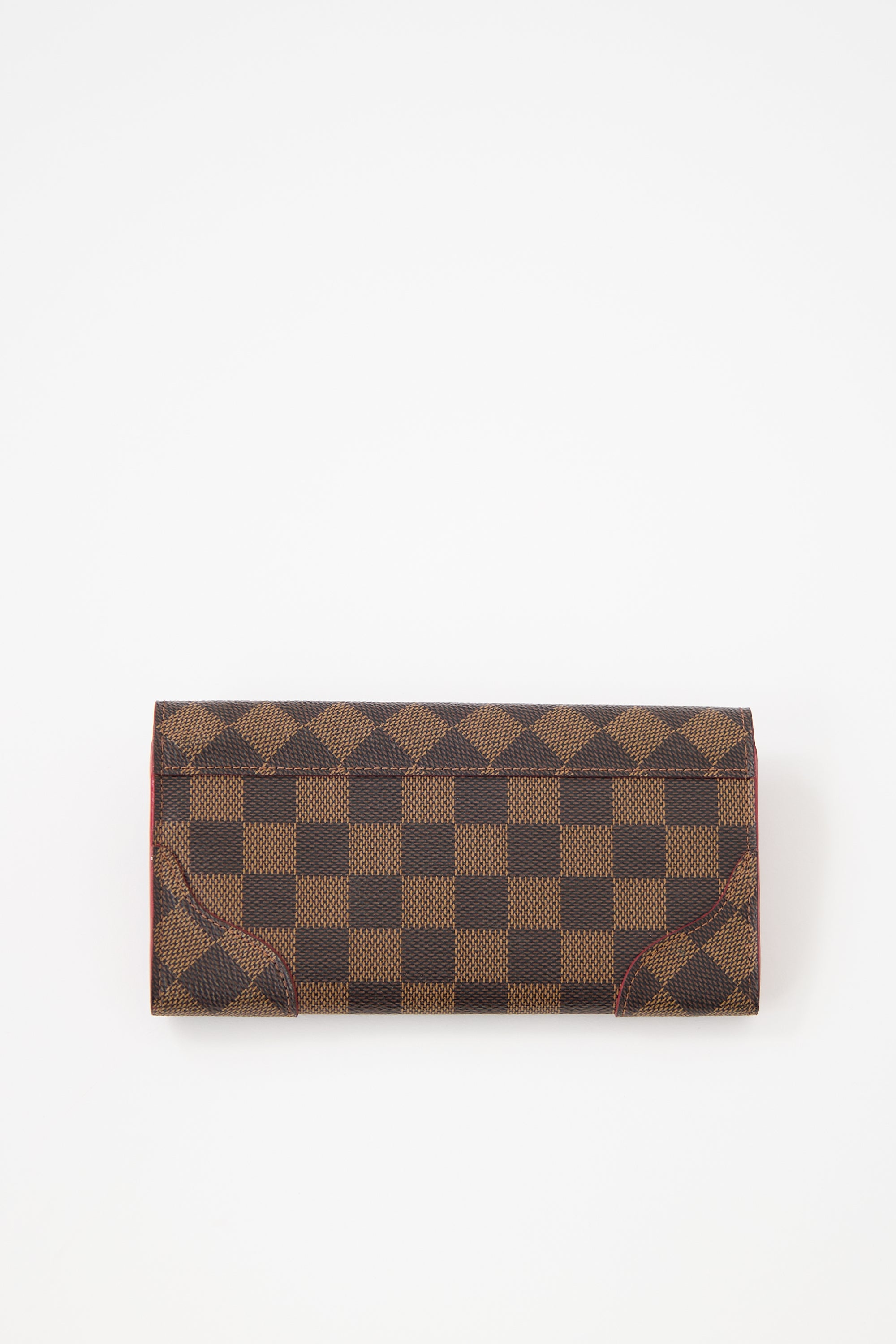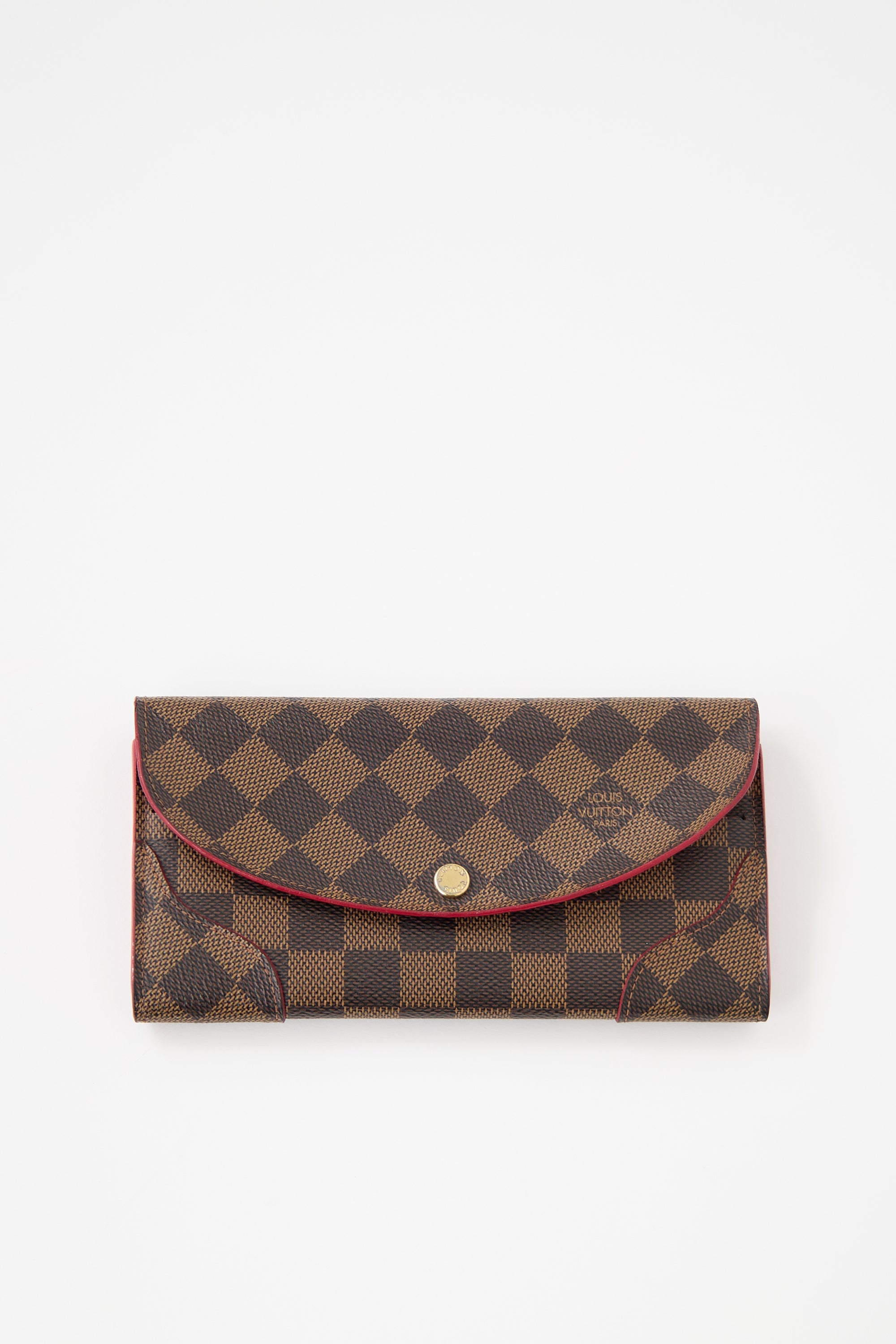 Pre-owned Louis Vuitton brown Caissa wallet featuring Damier Ebene monogram coated canvas, snap button closure, red leather lining, and interior pockets include four card slots, one zip pocket, two slip pockets, and one main compartment.