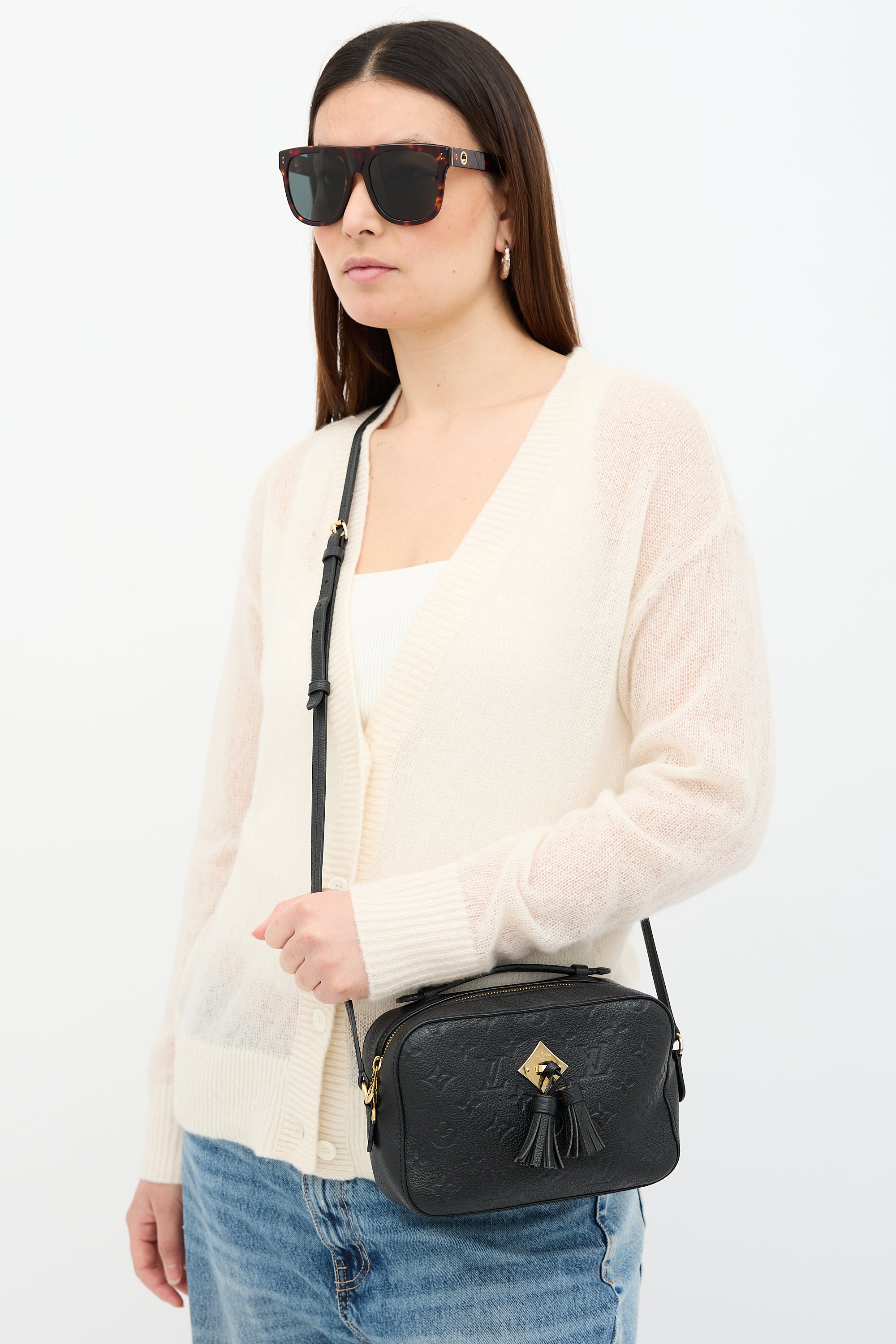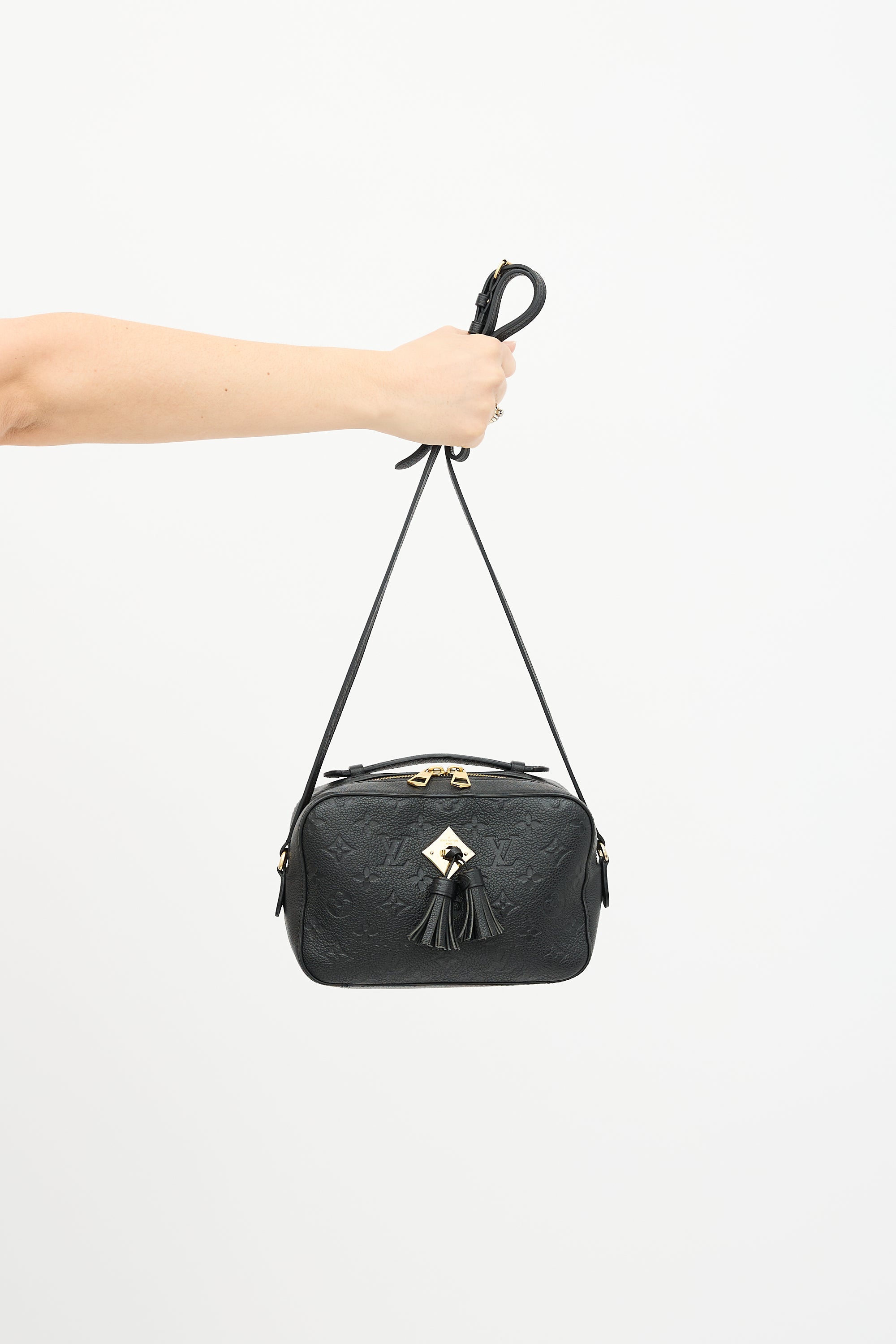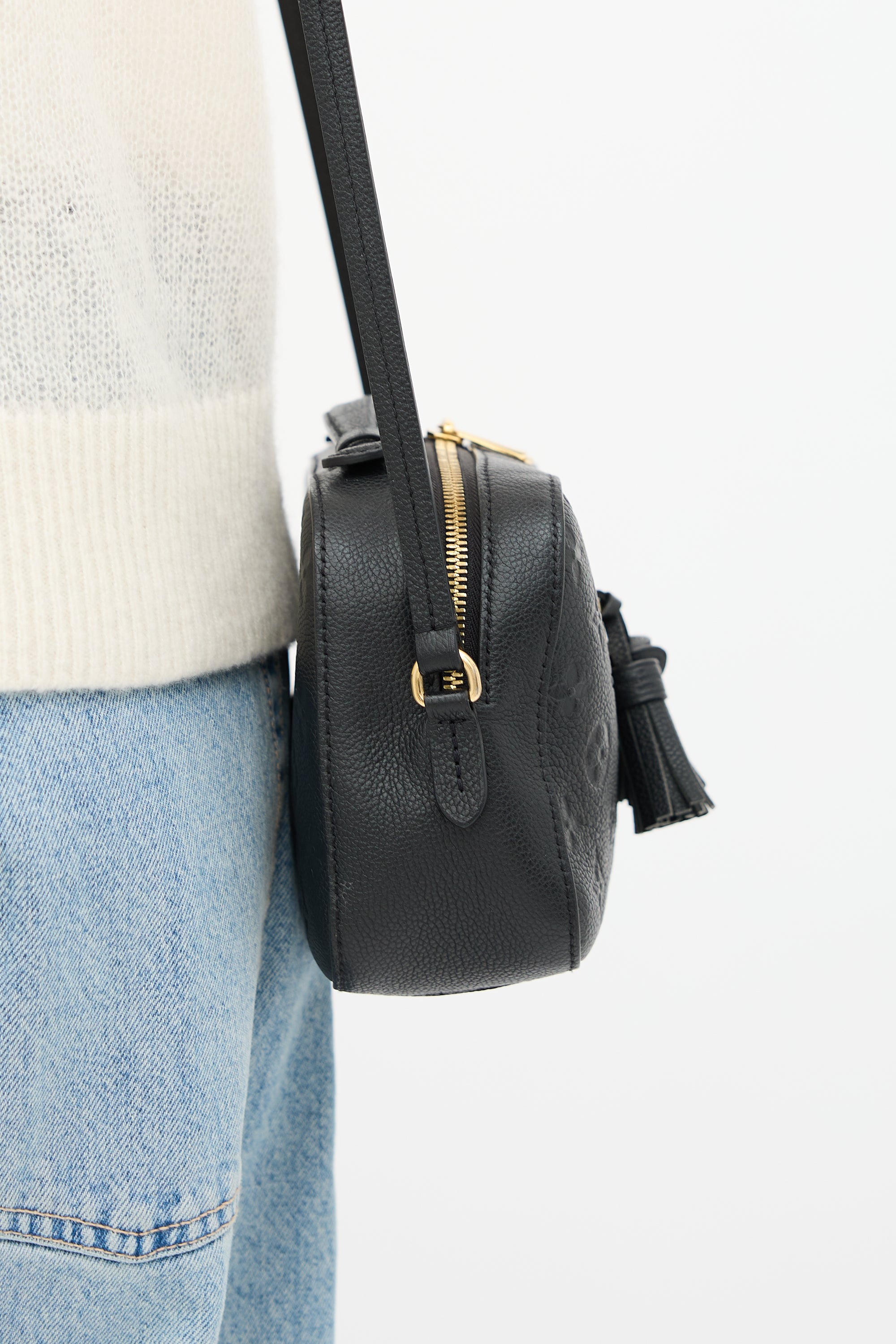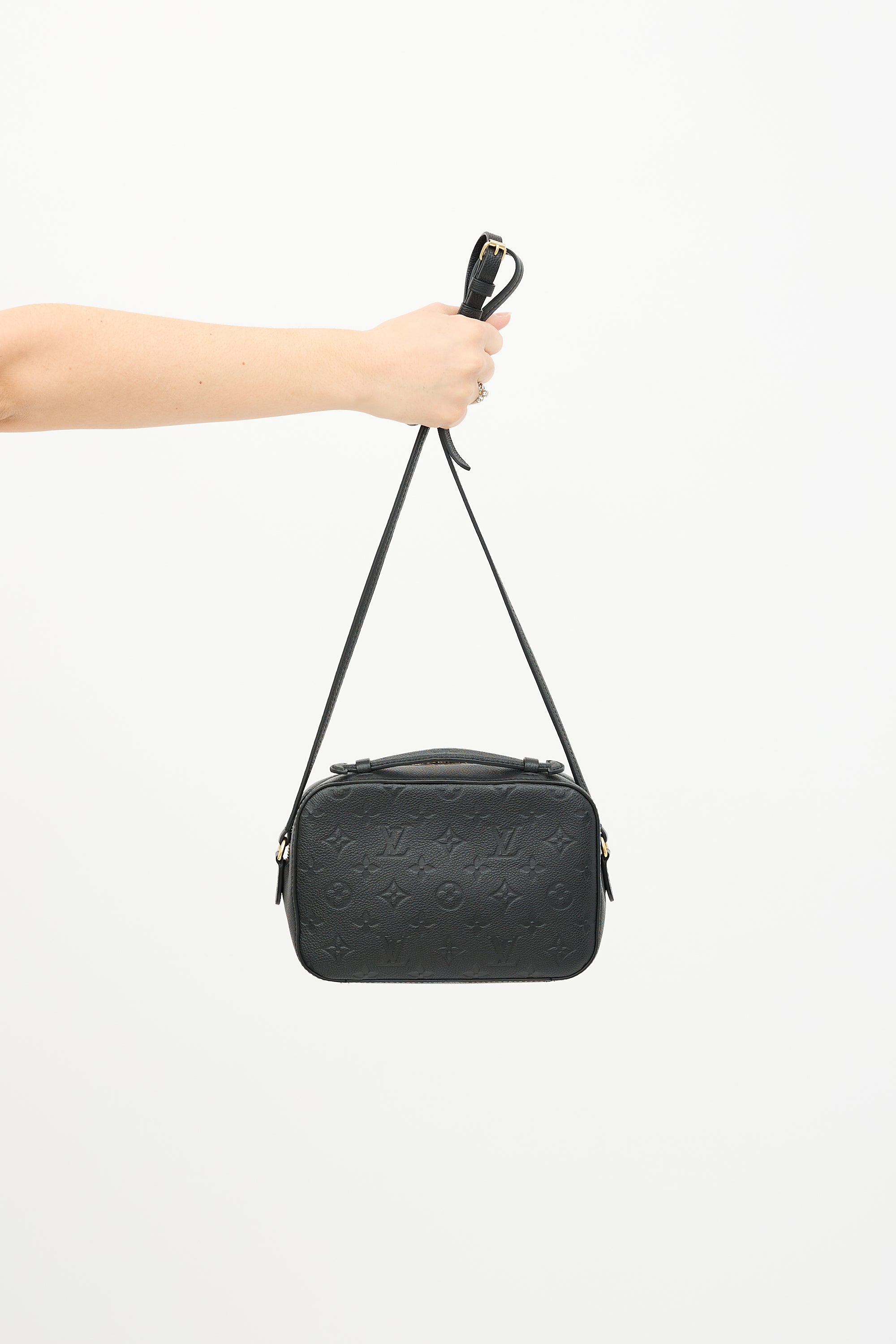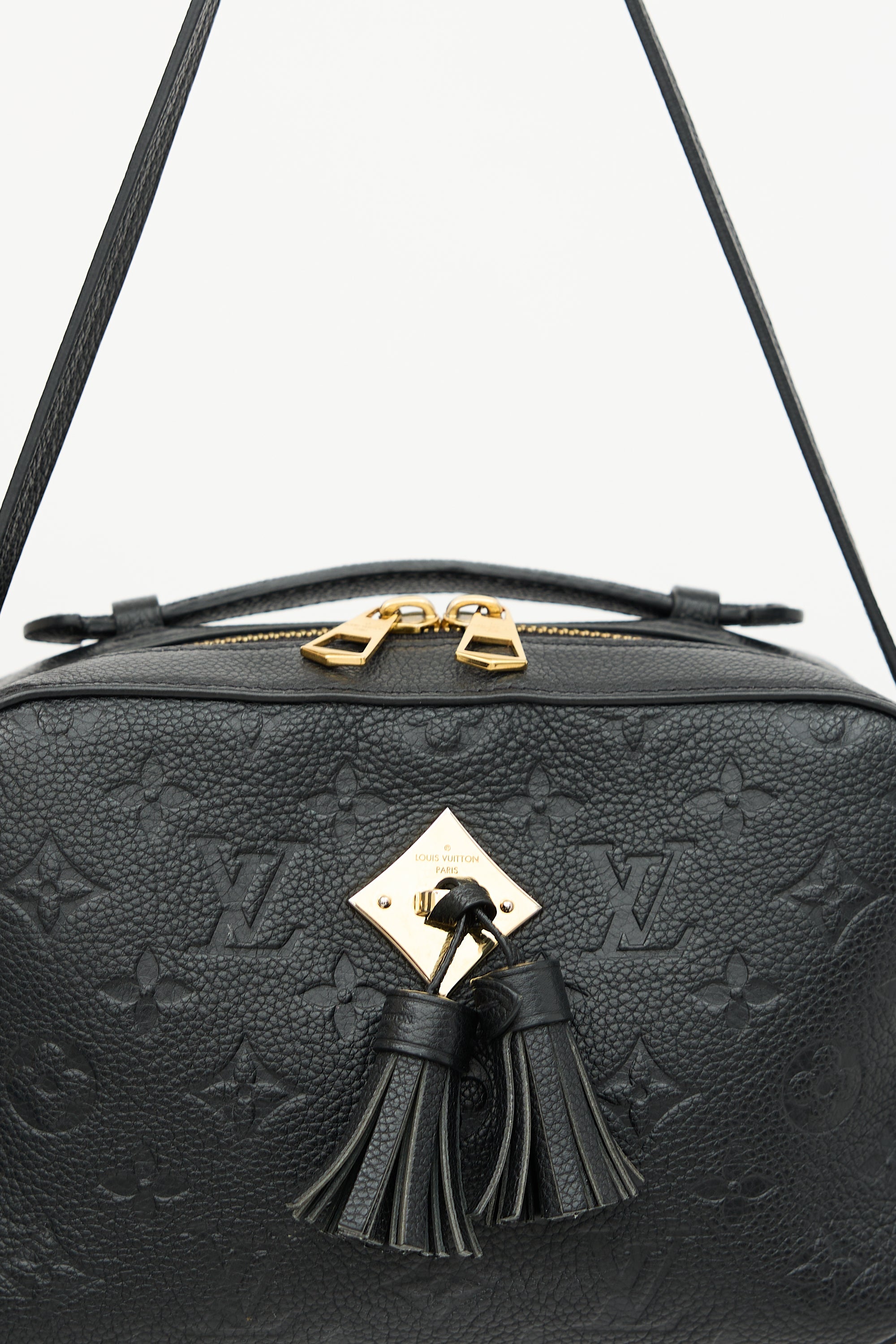 Pre-owned Louis Vuitton black pebbled leather Empreinte Saintonge crossbody bag featuring debossed signature monogram, gold tone hardware, flat top handle, dual top zip closure, adjustable shoulder strap, and one black canvas lined main compartment with one slip pocket. Comes with original box.