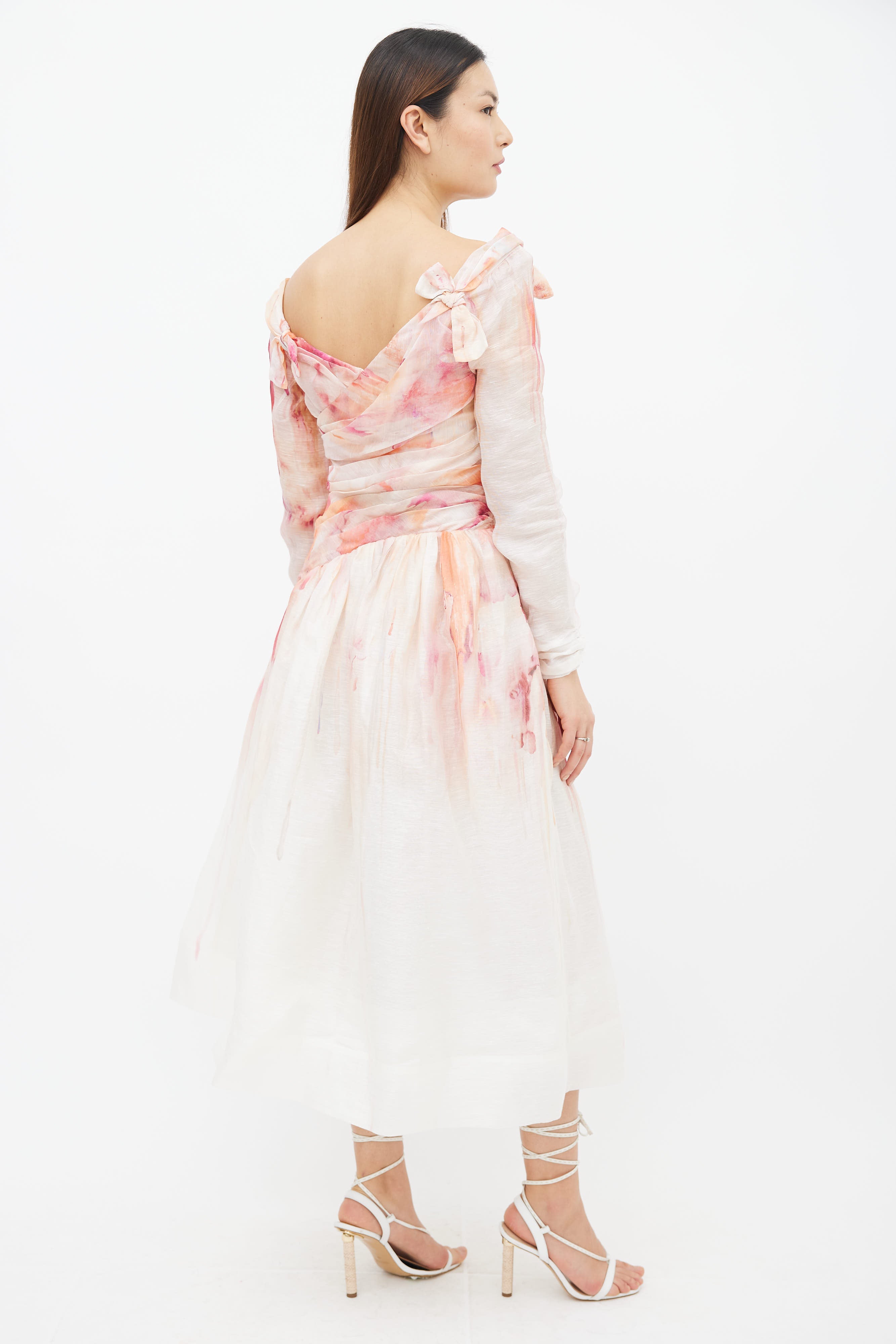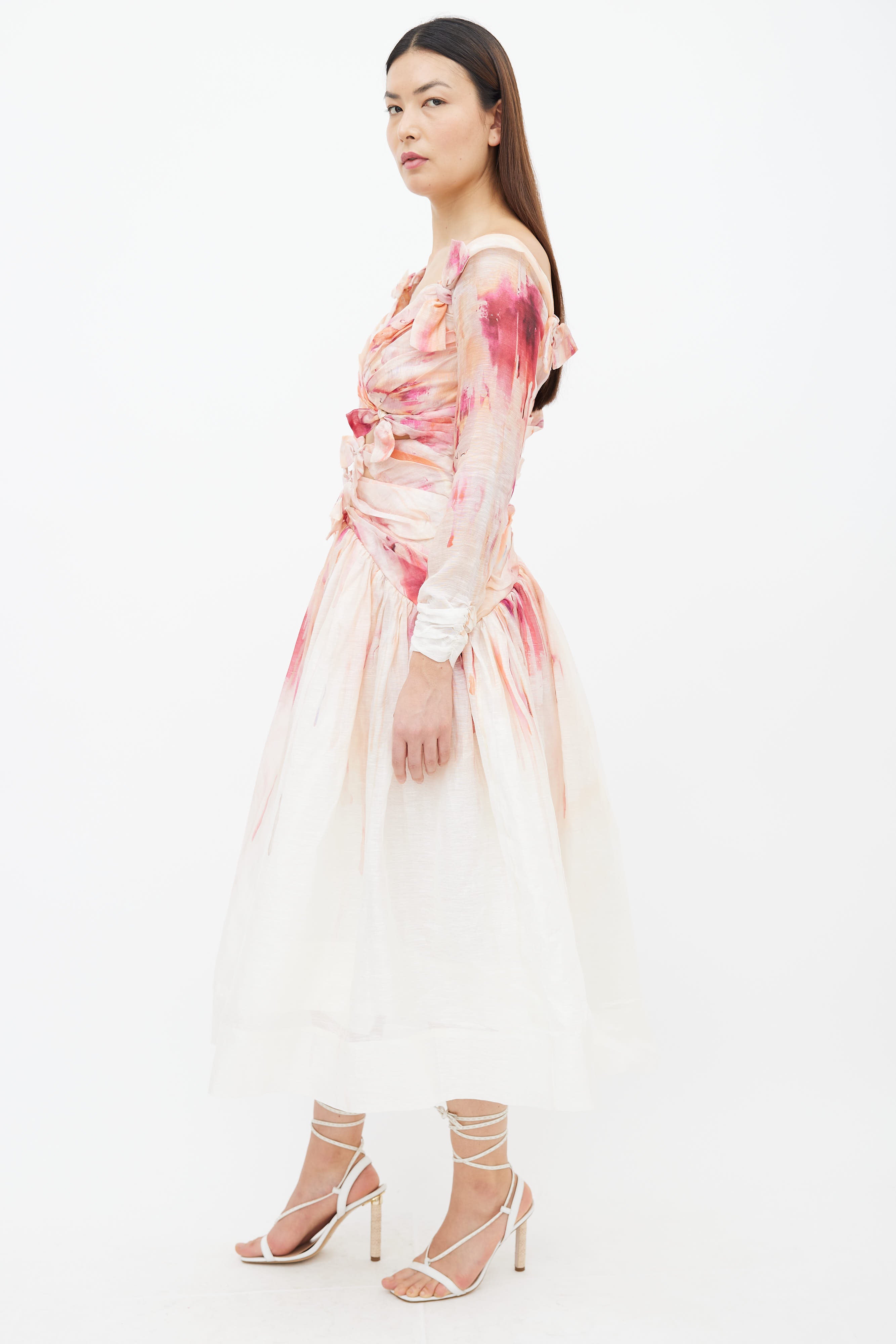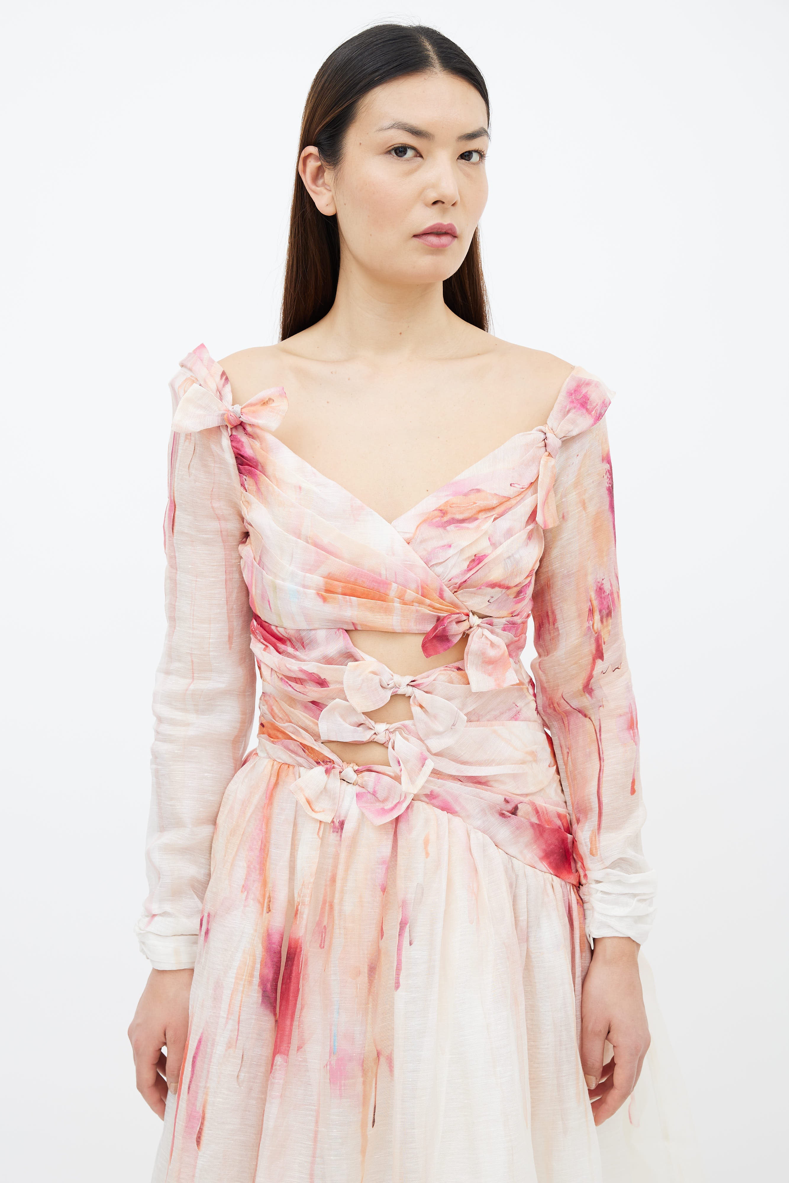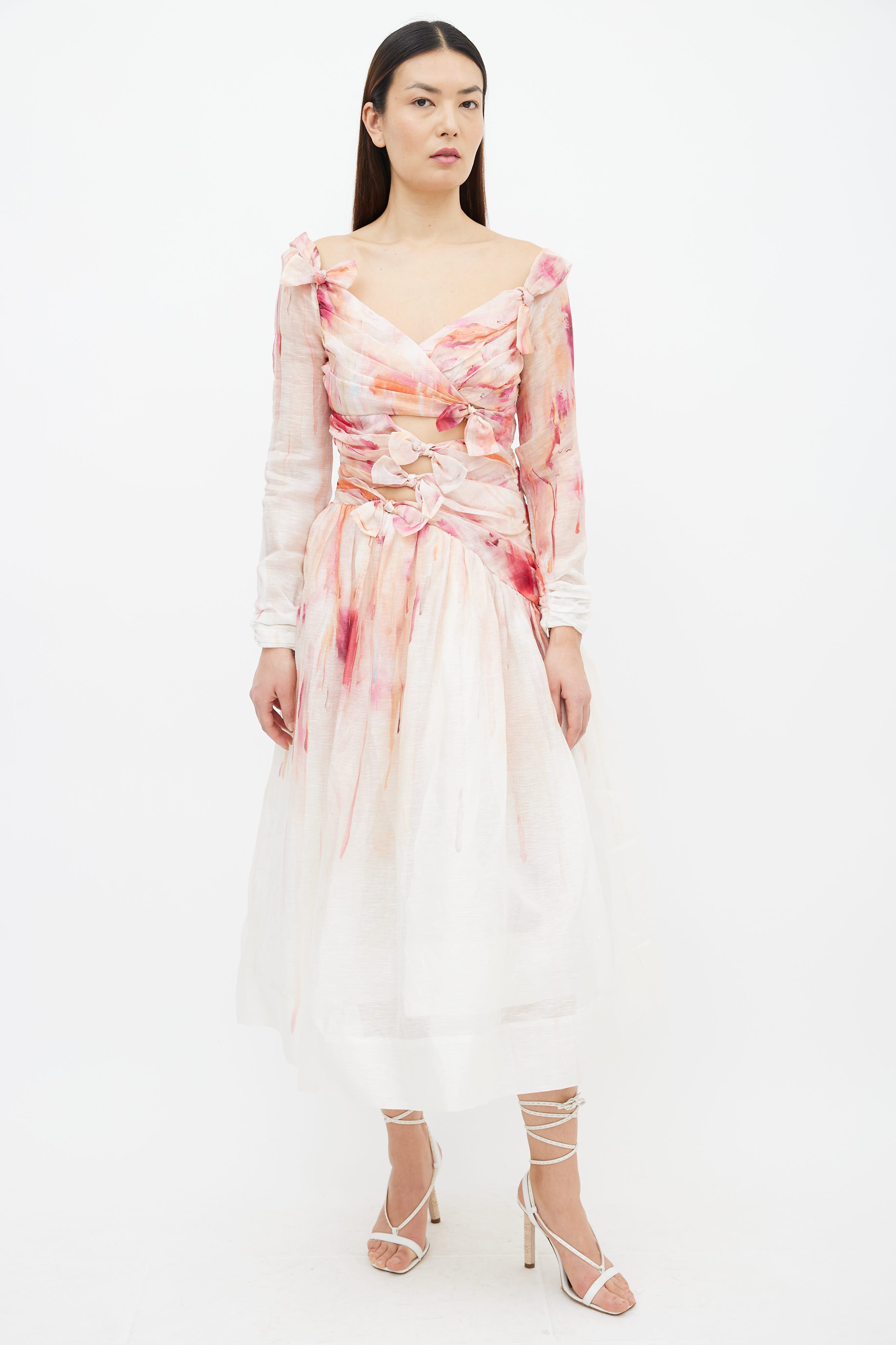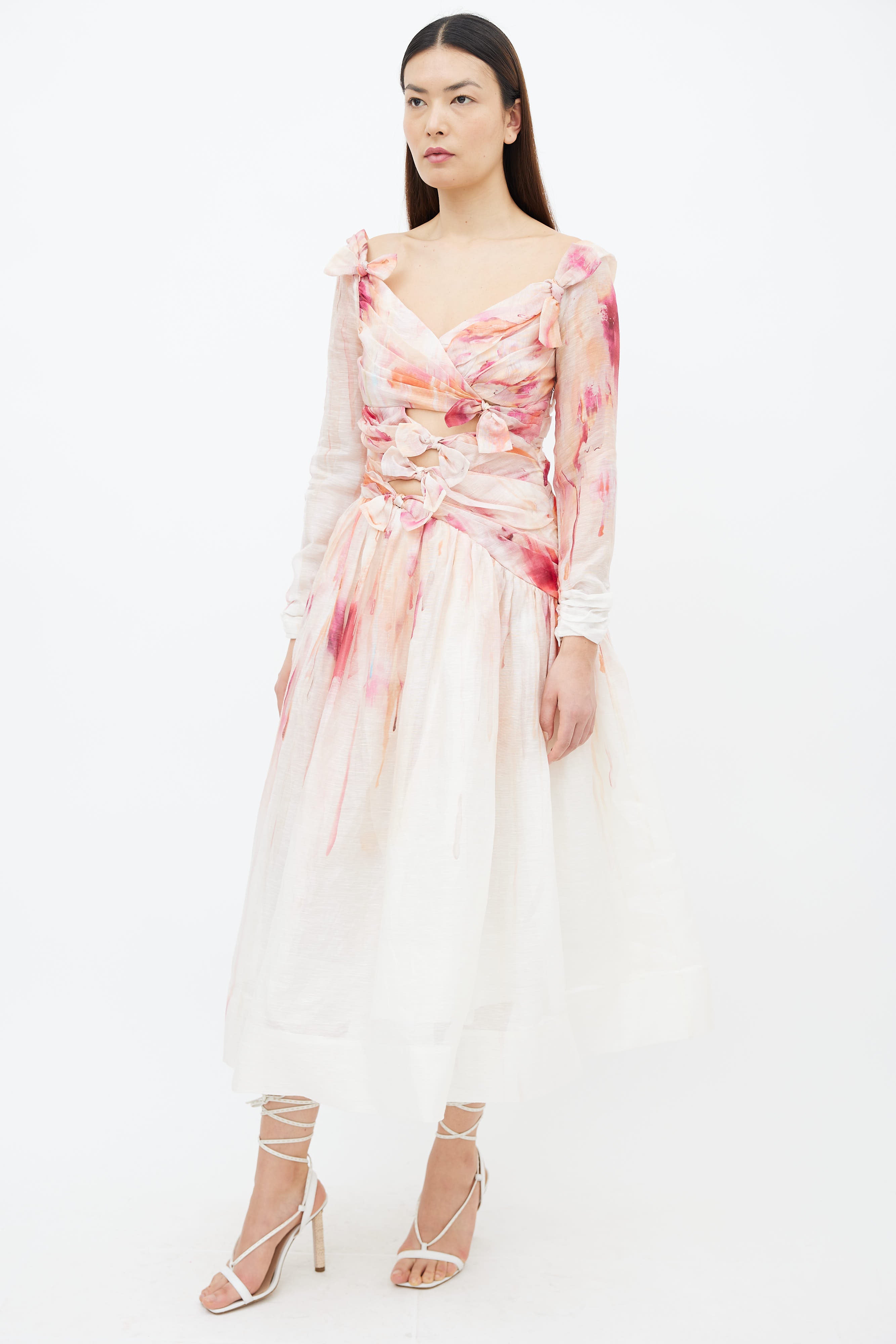 Zimmermann dress in cream featuring pink gradient multicolor print, cut-out with attached bows at front, long sleeves, pleated bodice, sweetheart neckline, and concealed zip closure at sides.