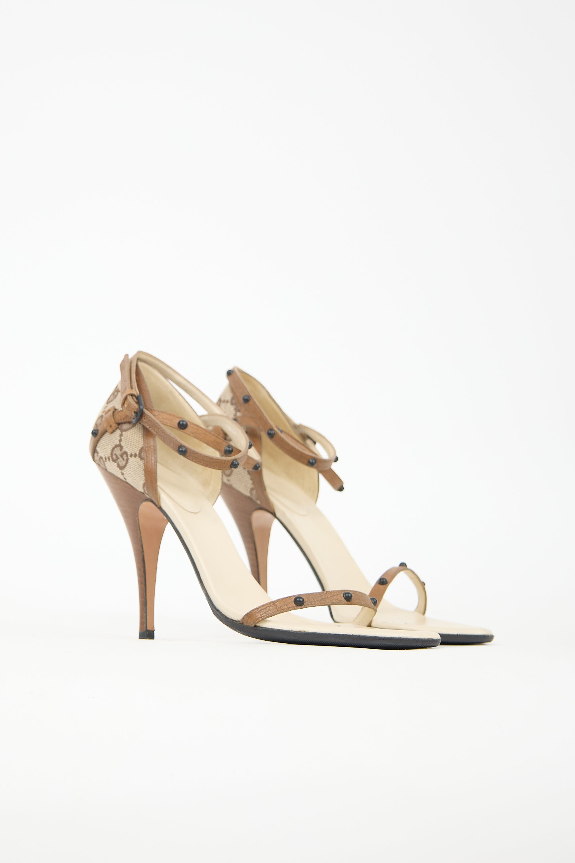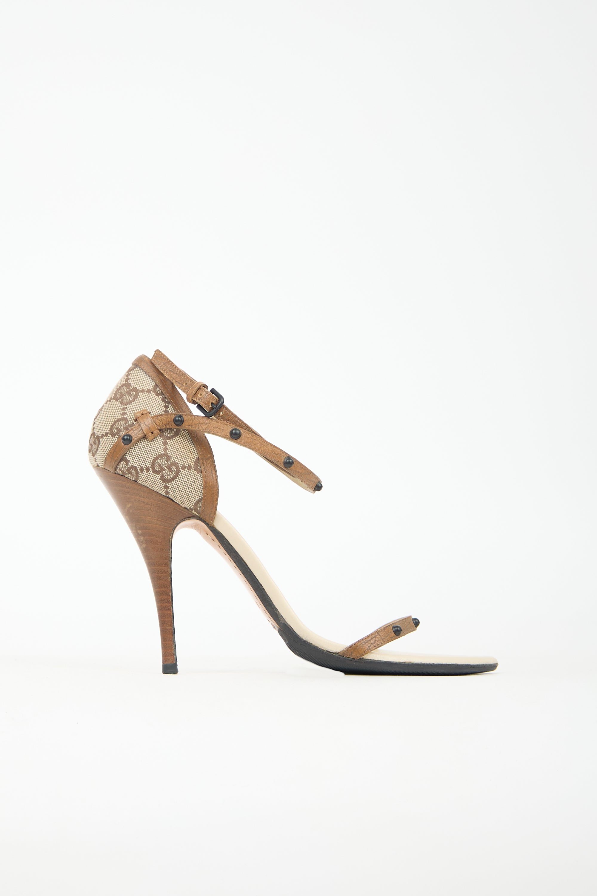Pre-owned Gucci brown and beige sandals featuring almond toe, GG canvas counter, thin strap upper with stud embellishment, and wooden continental heel.