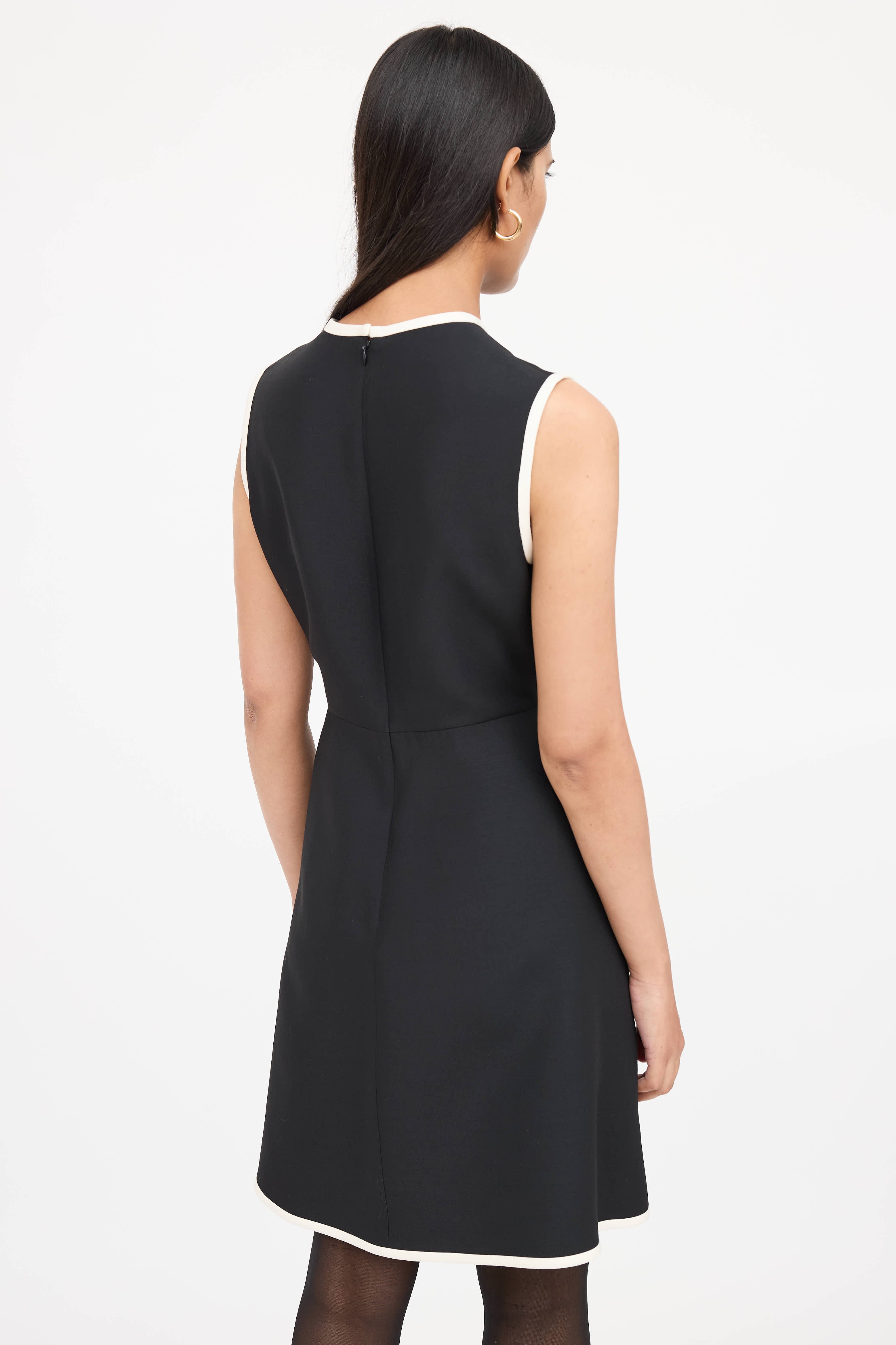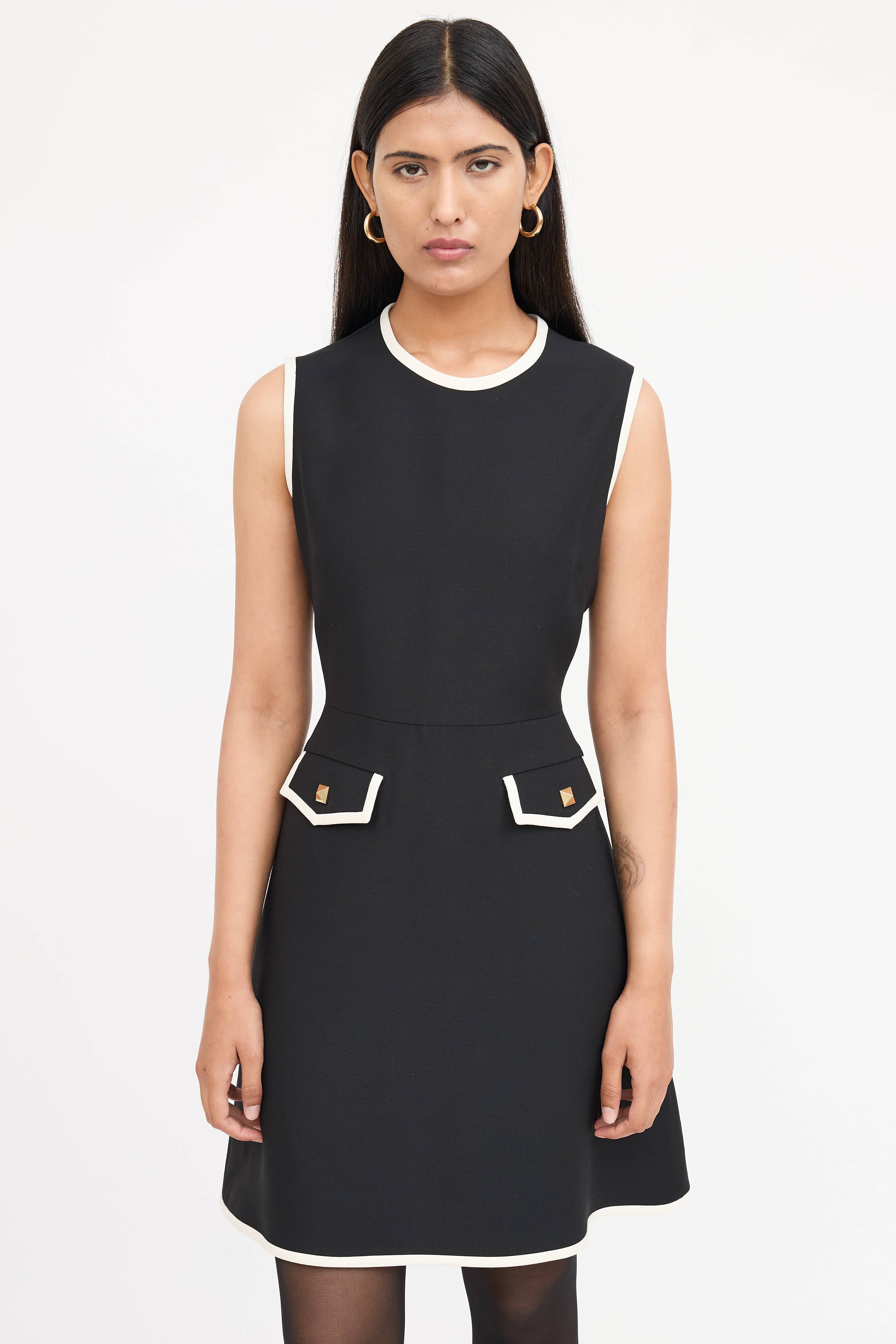 Pre-owned Valentino black and white sleeveless dress featuring round neckline, flap pockets at front with gold tone studs, and concealed zip at side. Lined. Clipped to fit model.