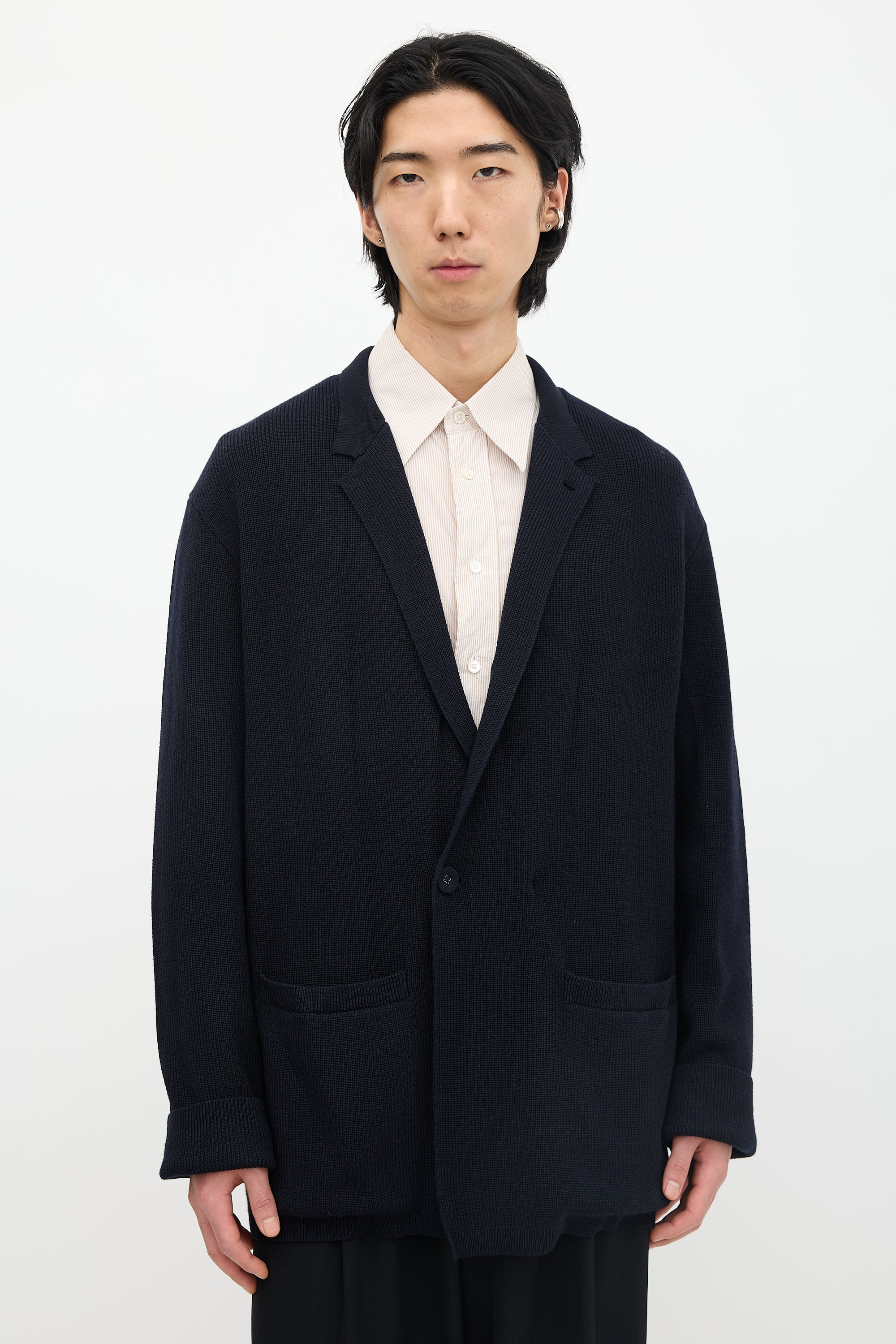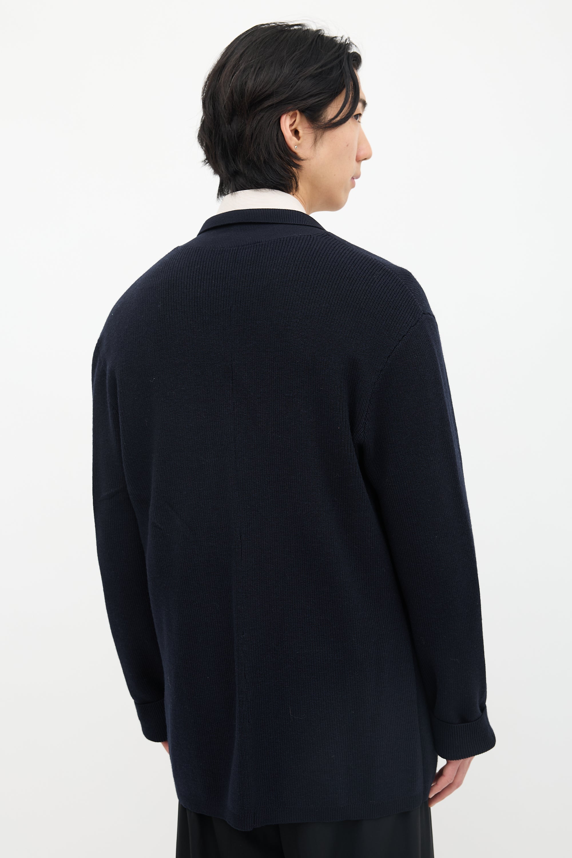 Pre-owned Armani navy wool blend cardigan featuring notched lapel, ribbed knit, 2x1 double breasted button up front, two front patch pockets, and fold over cuffs.