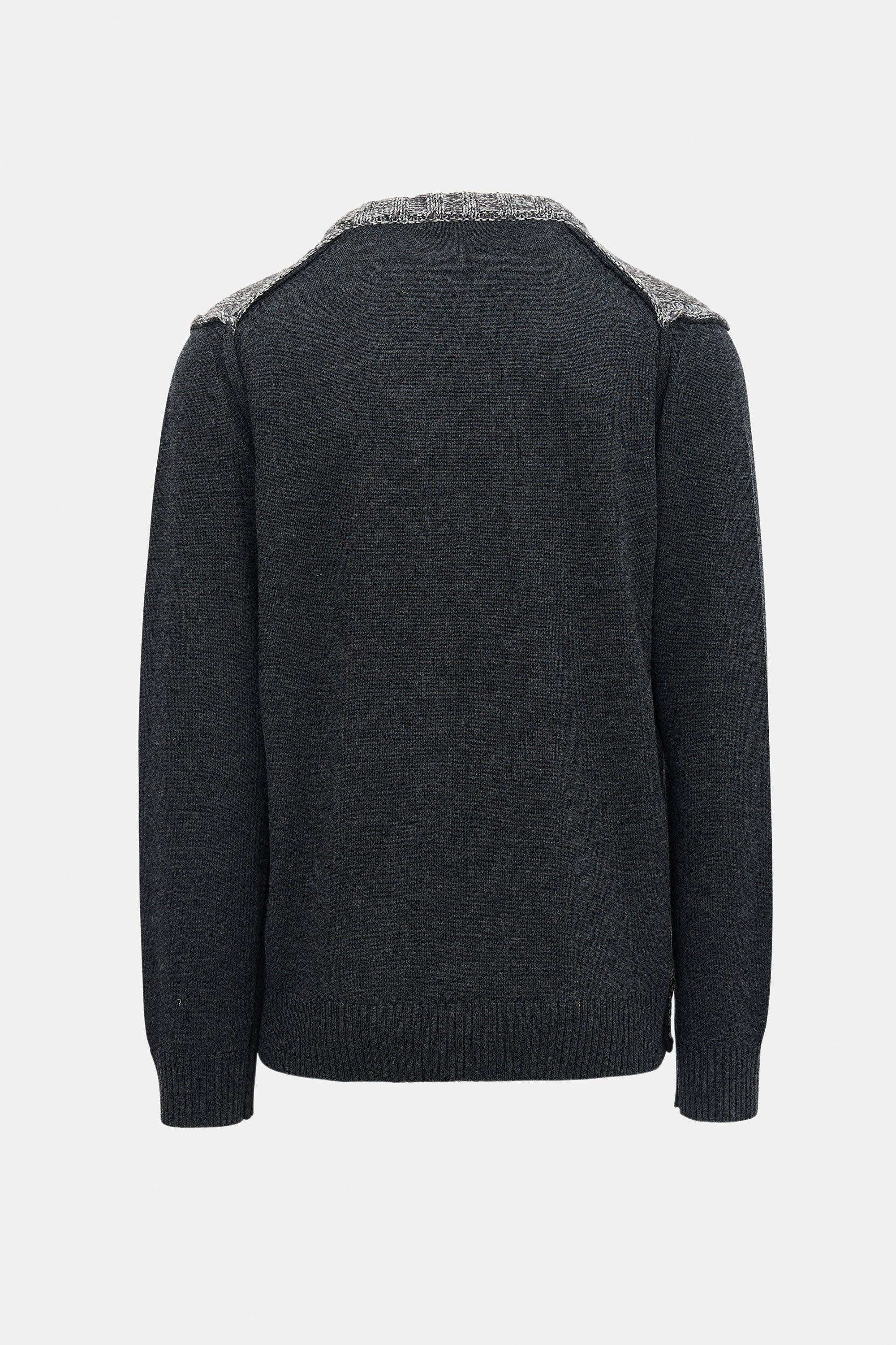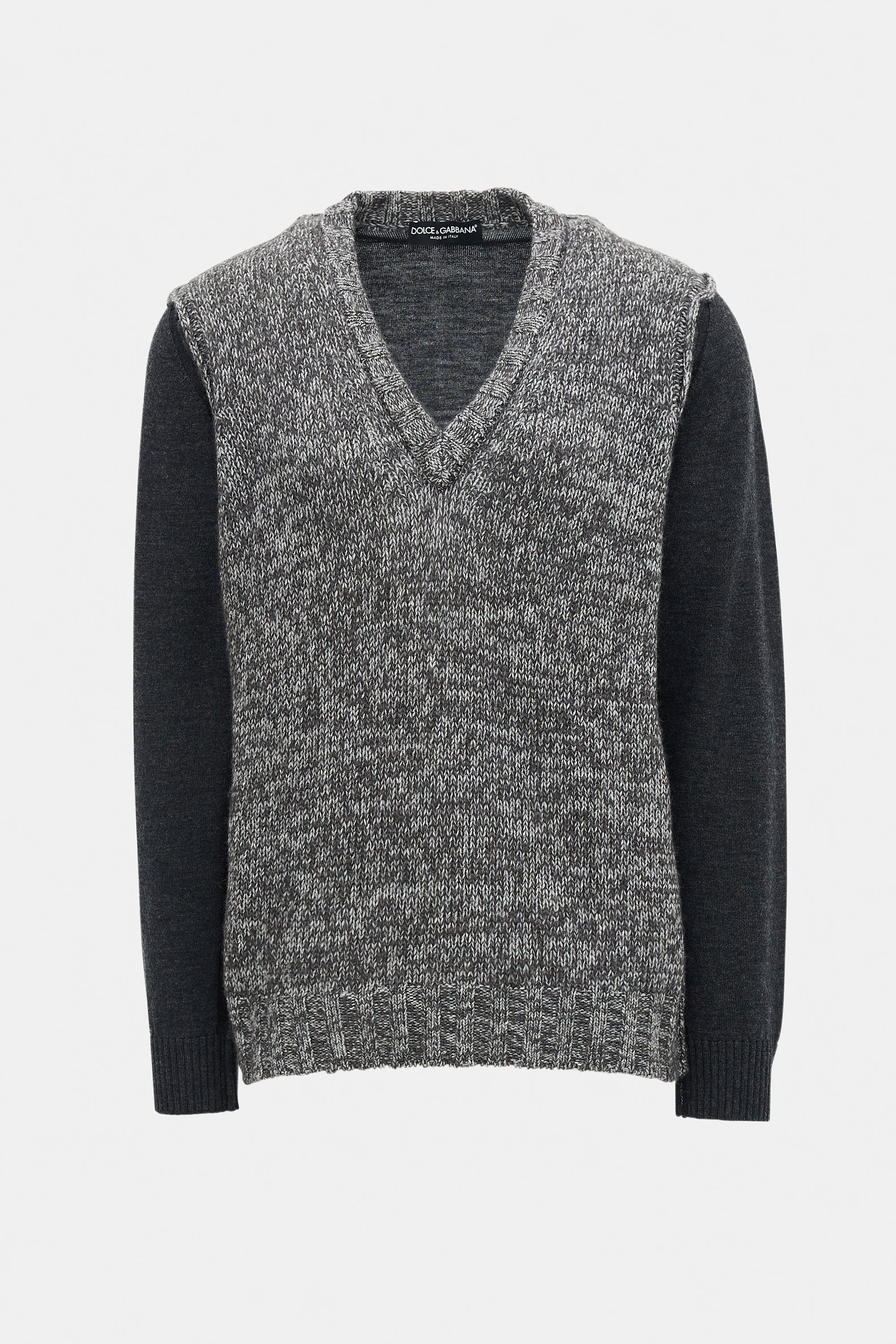 Pre-owned Dolce & Gabbana dark grey hybrid sweater featuring V-neckline, marled chunky knit front, jersey knit back and sleeves, and ribbed collar, hem, and cuffs.