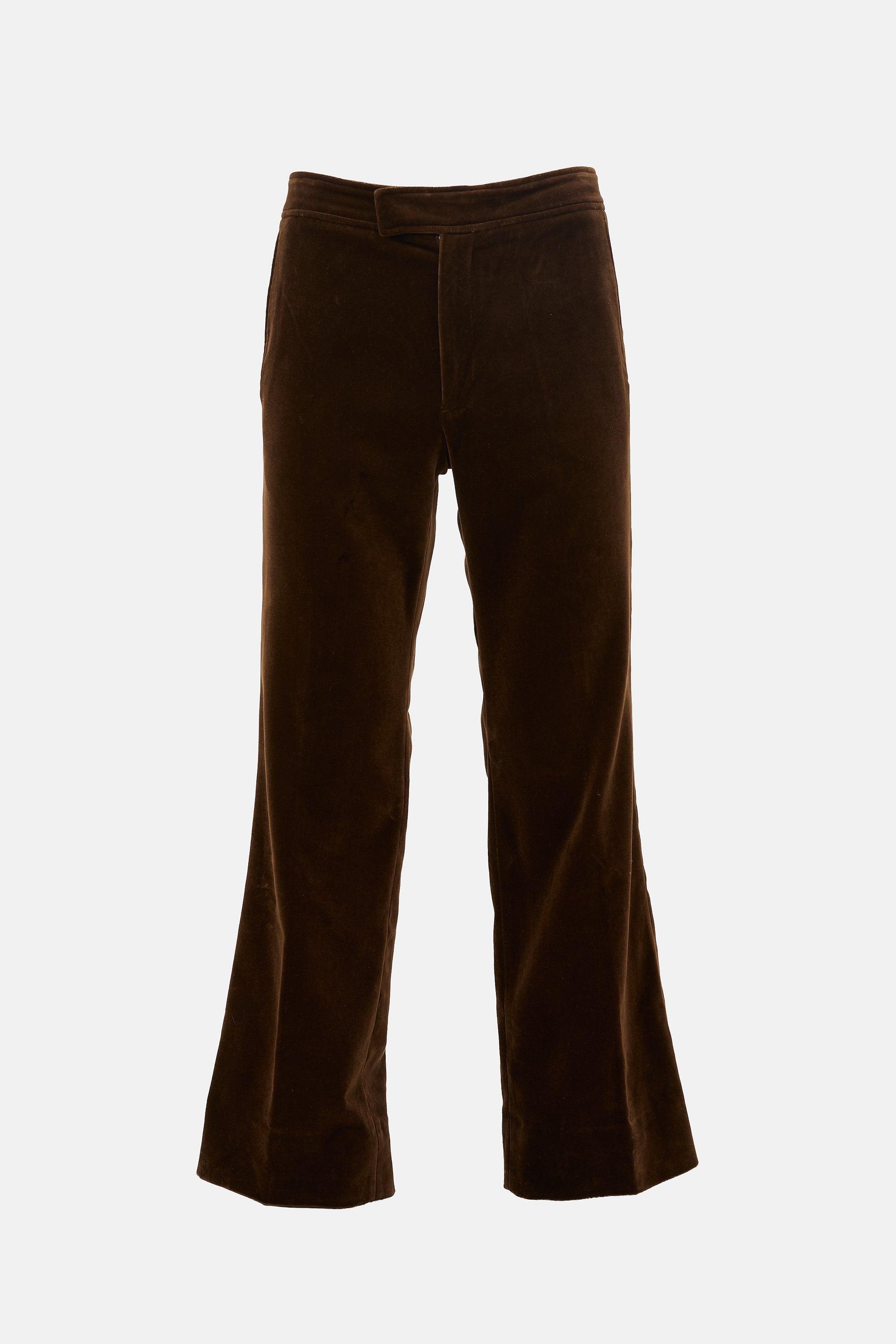 Pre-owned Gucci brown velvet trousers featuring belt loops, four pocket styling, and wide leg.