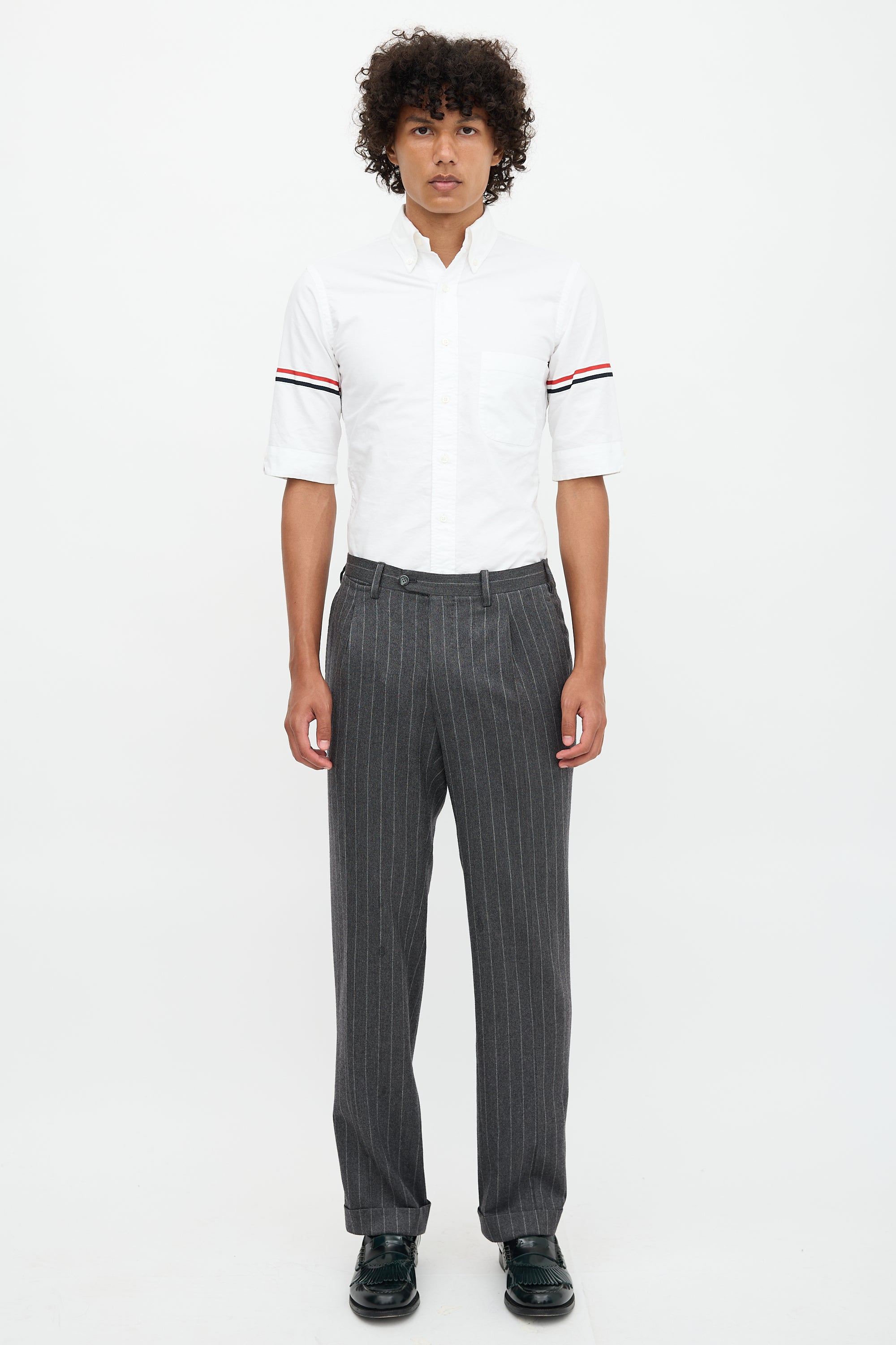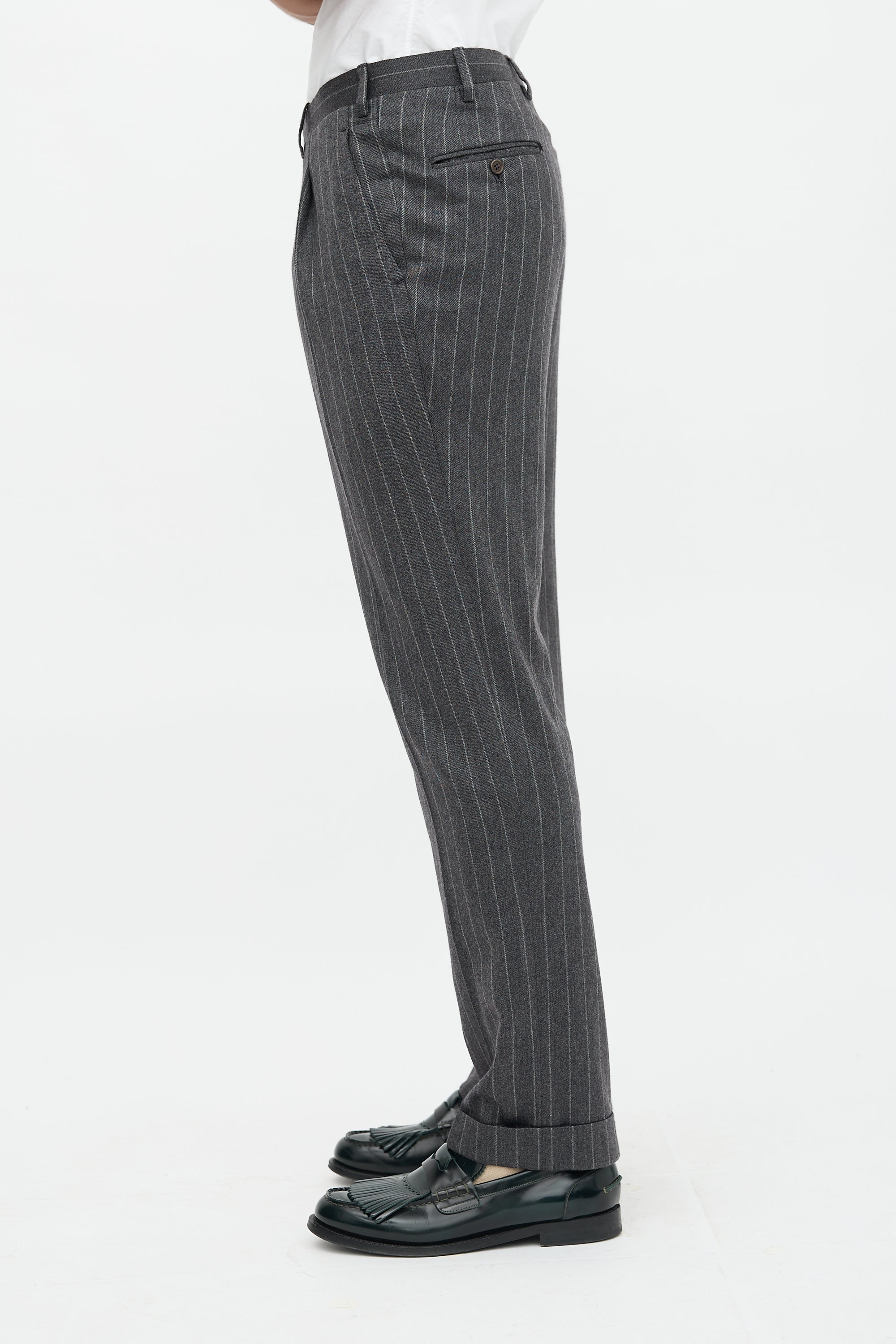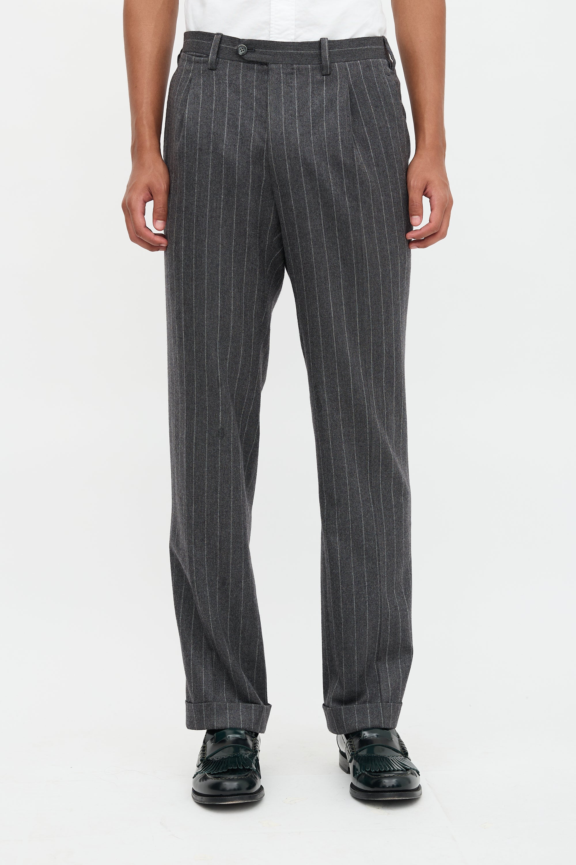 Pre-owned Kiton grey trousers featuring pinstripe pattern, front pleats, straight leg with creases, folded hem, four pocket styling, change pocket at right waist, and zip fly.