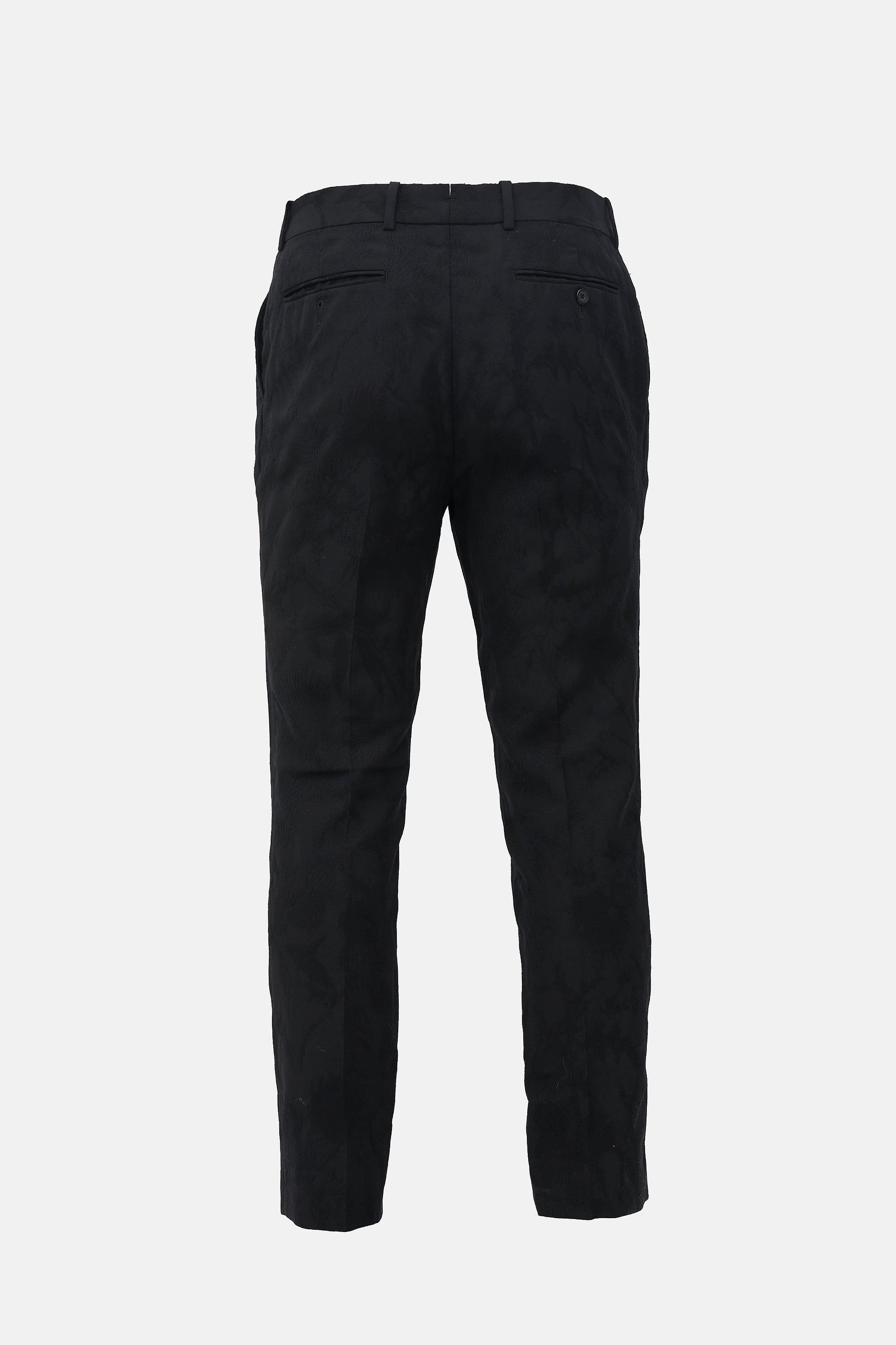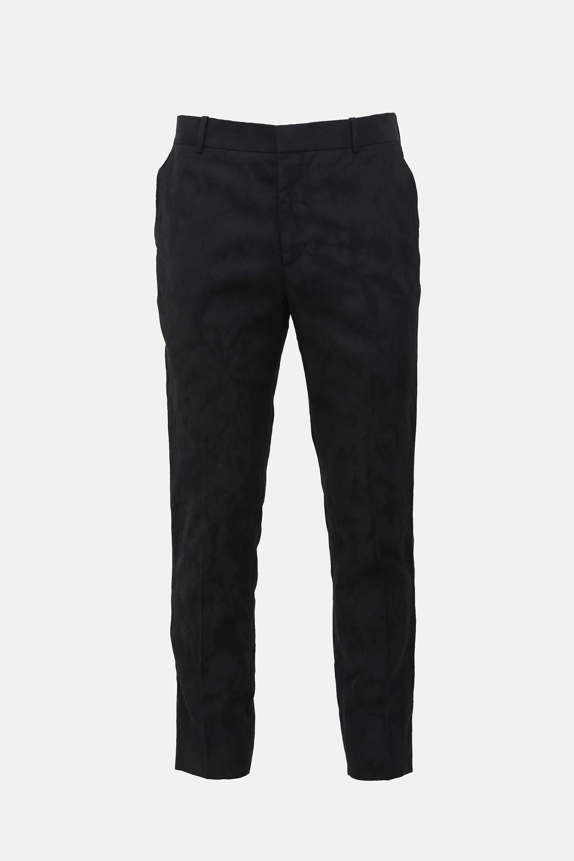 Pre-owned Alexander McQueen black trousers featuring brocade, belt loops, zip fly, four pocket styling, and straight leg.
