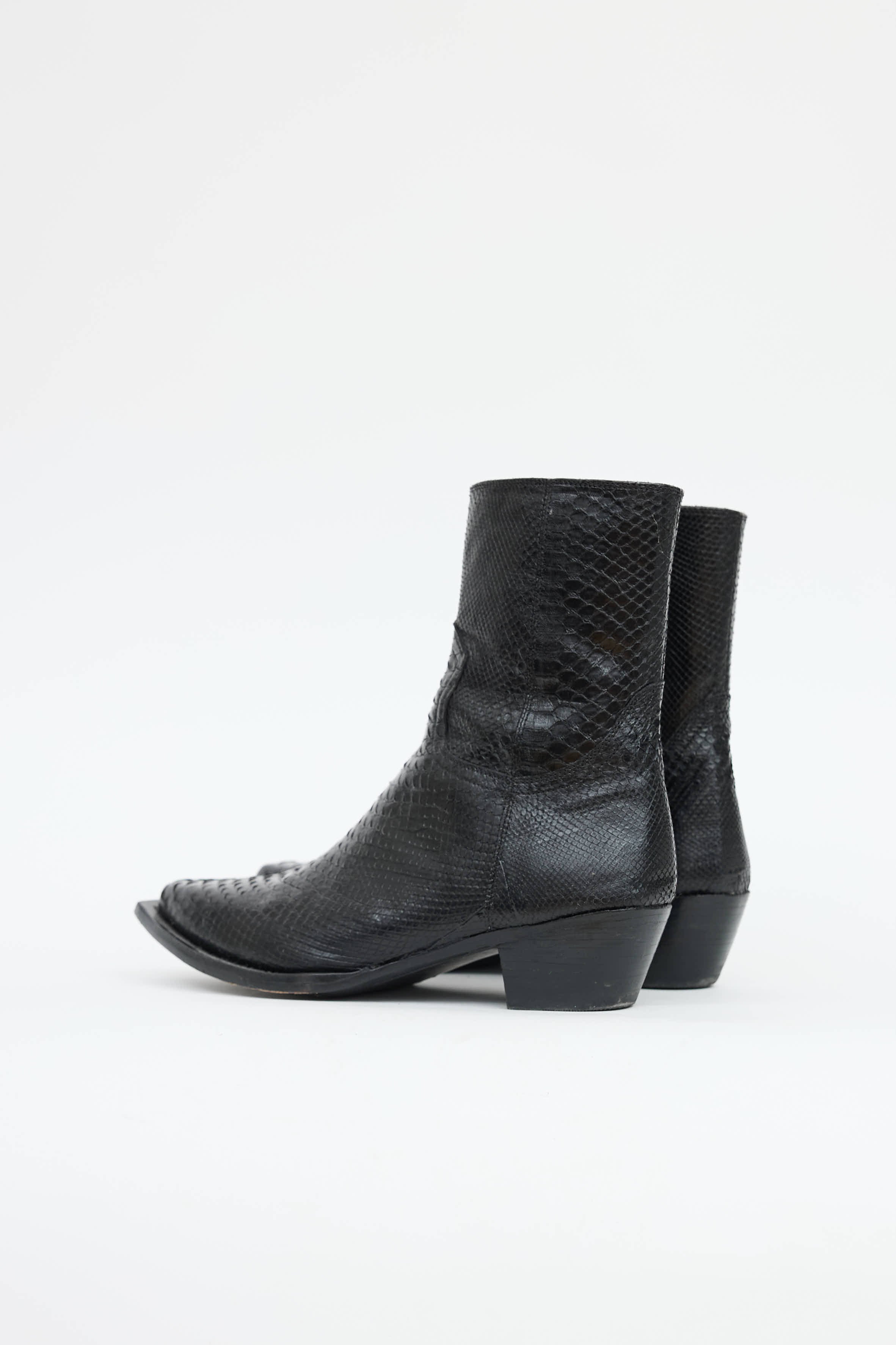 Pre-owned Unmarked men's black snakeskin ankle boot featuring tapered square toe, stacked heel, and zip at side.