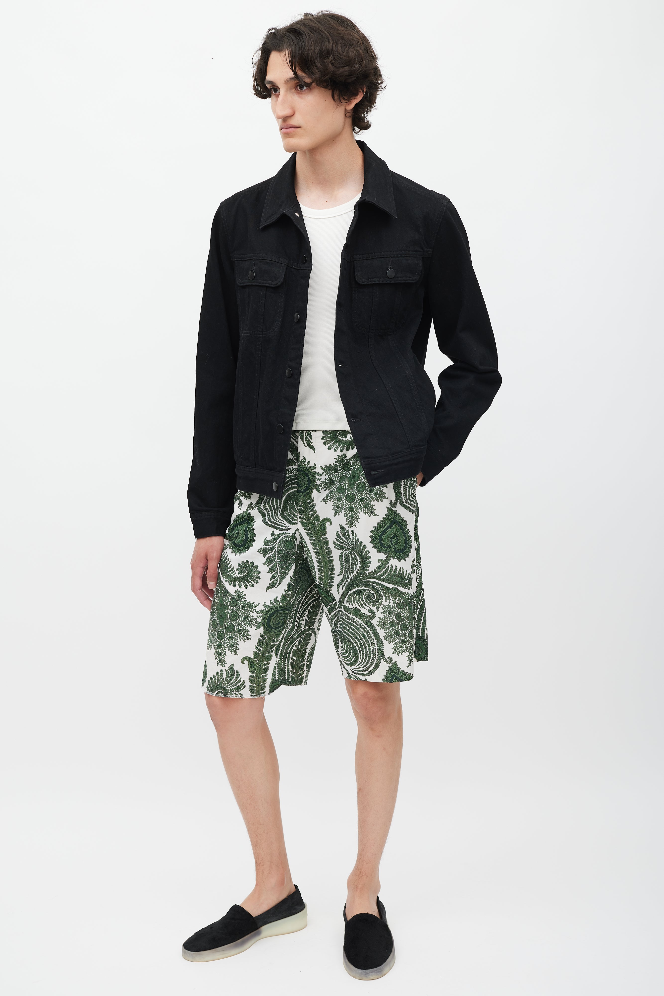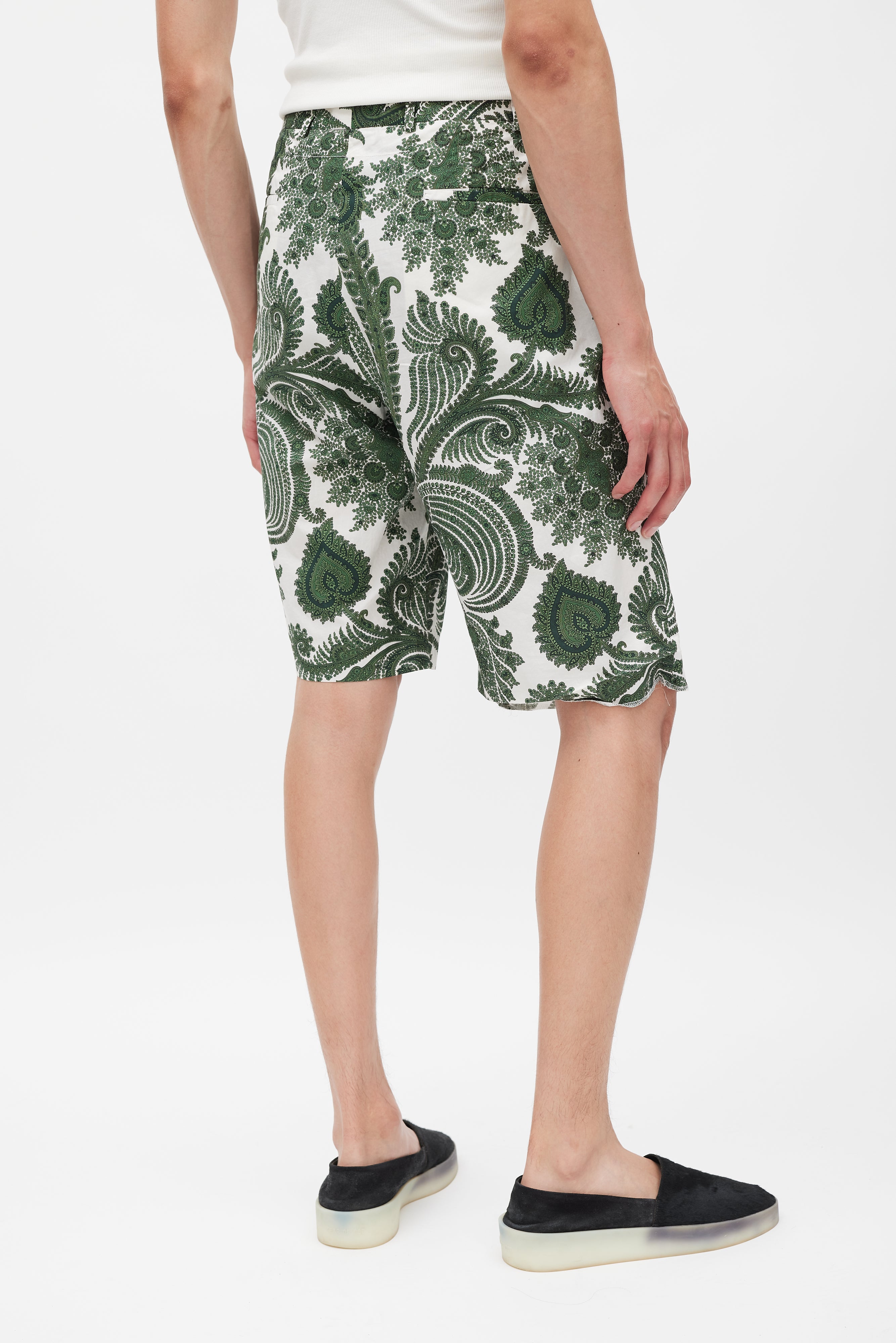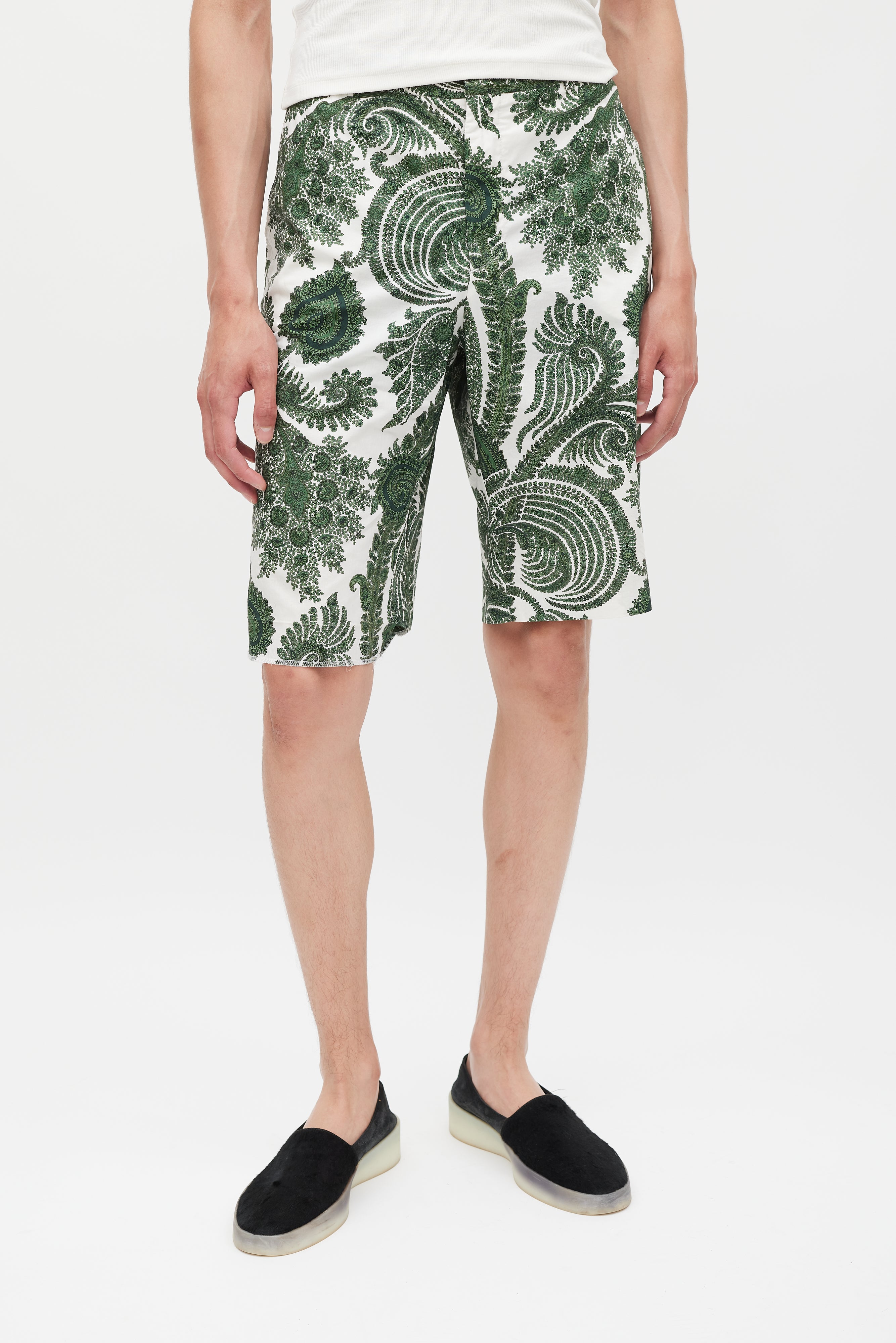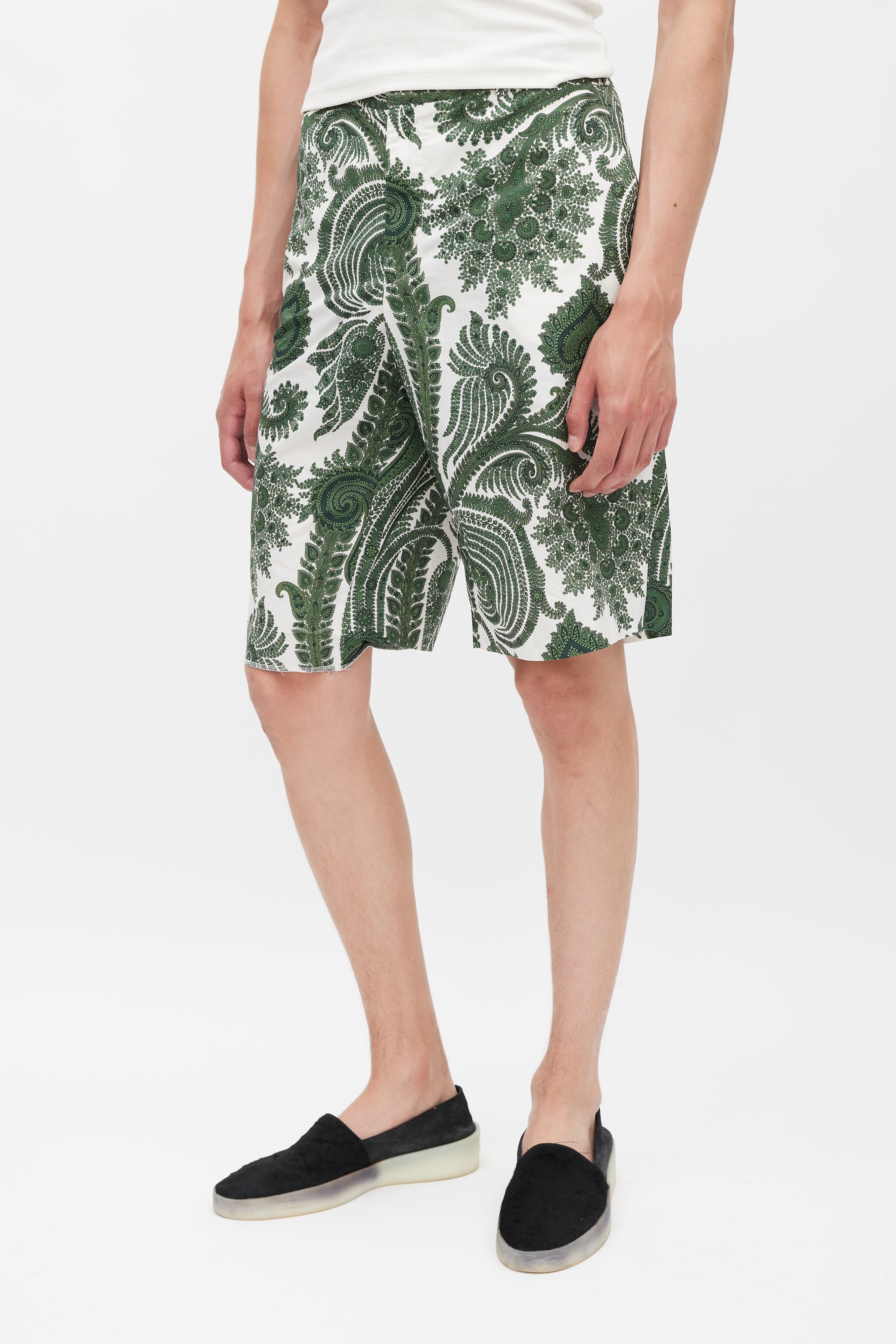 Pre-owned Givenchy white shorts featuring a green paisley pattern throughout, two slip pockets at hip, two welt pockets at back, wide leg, and zip fly with hook and eye closure.