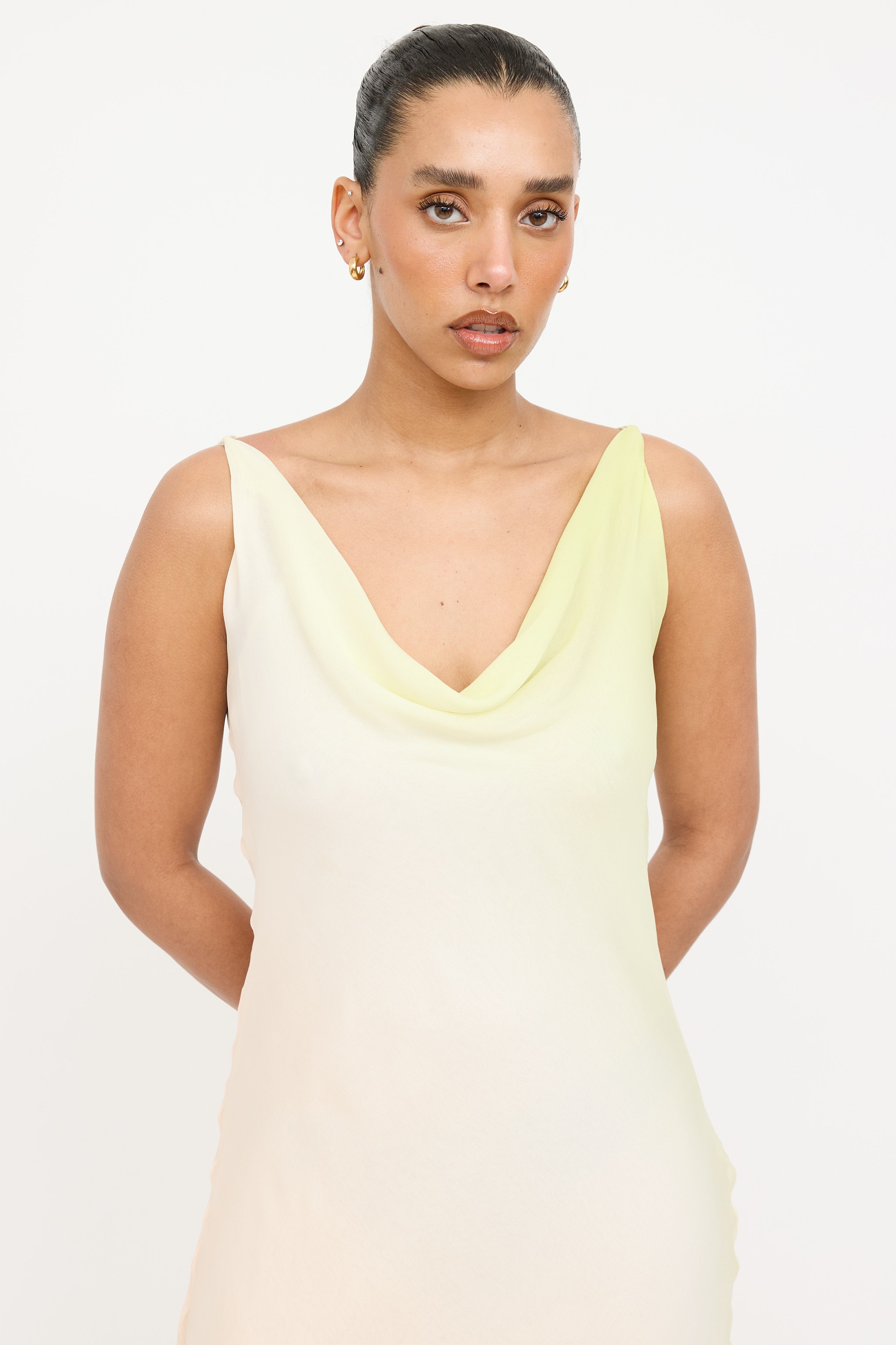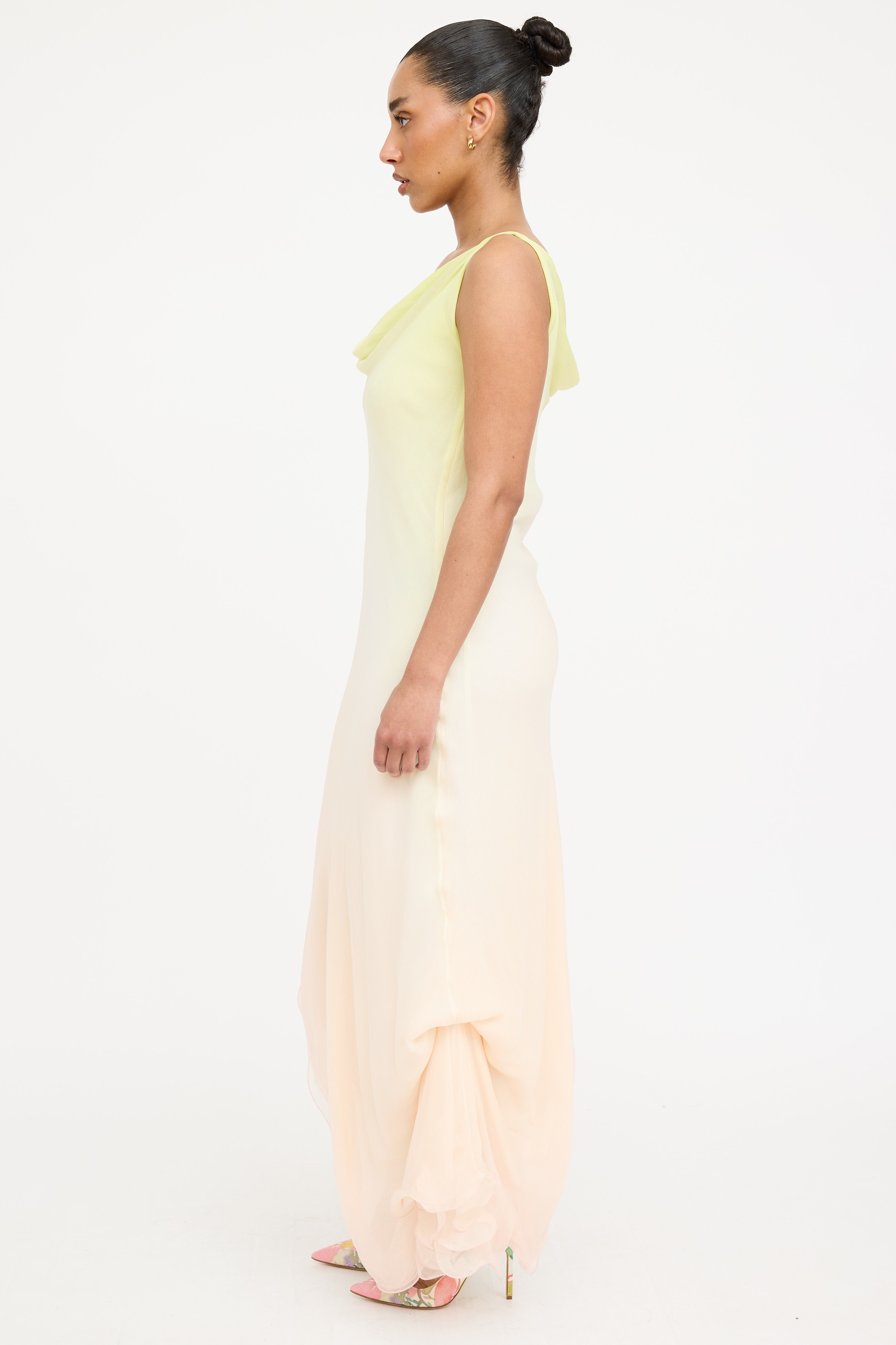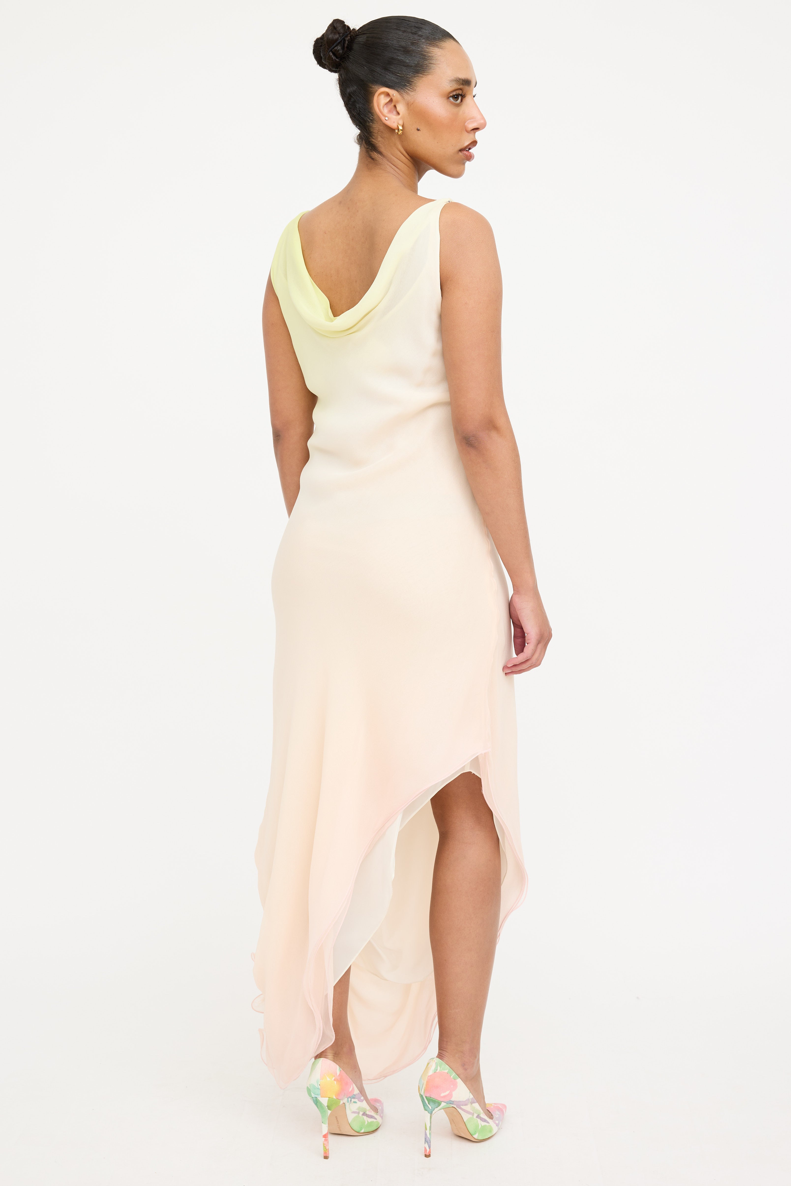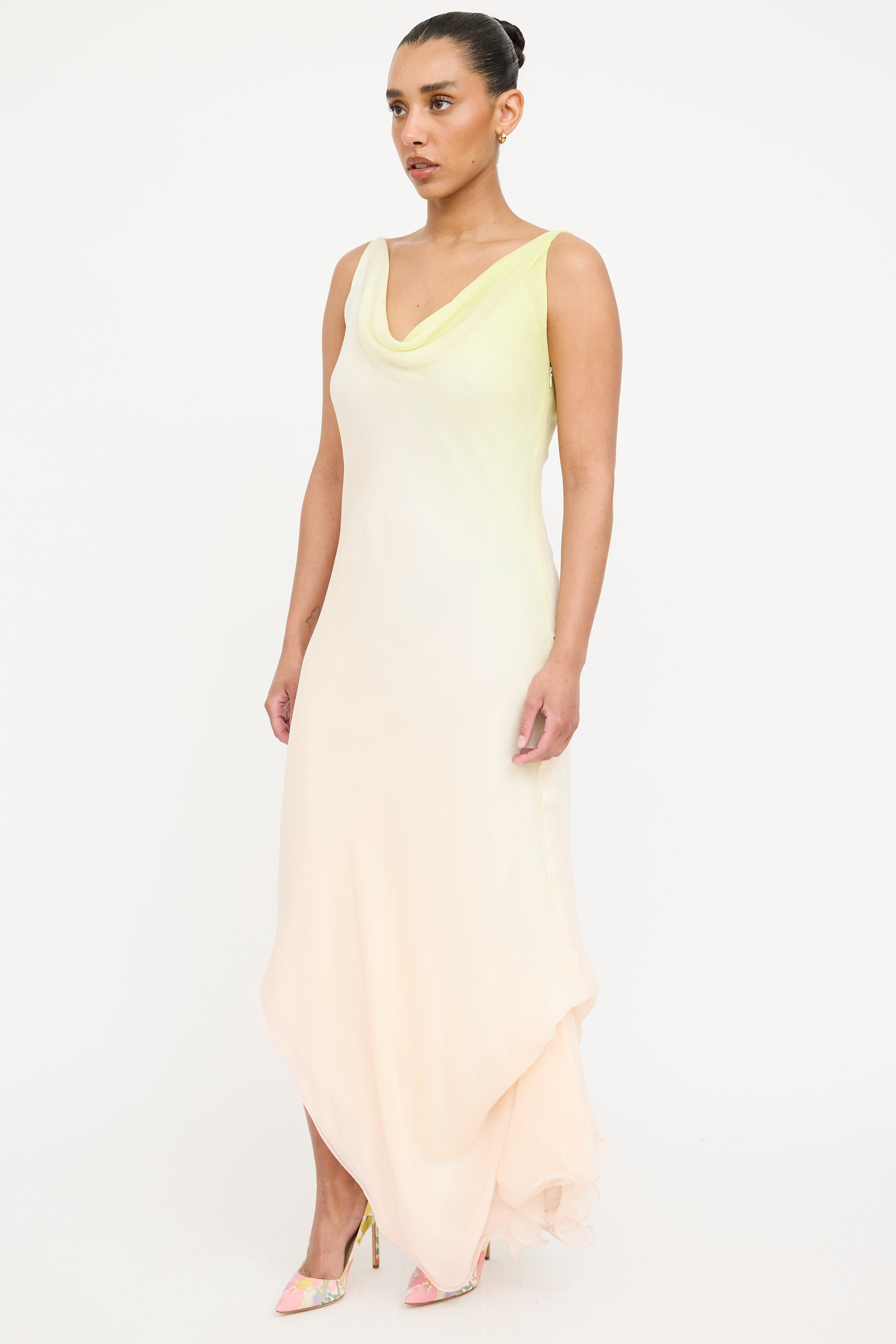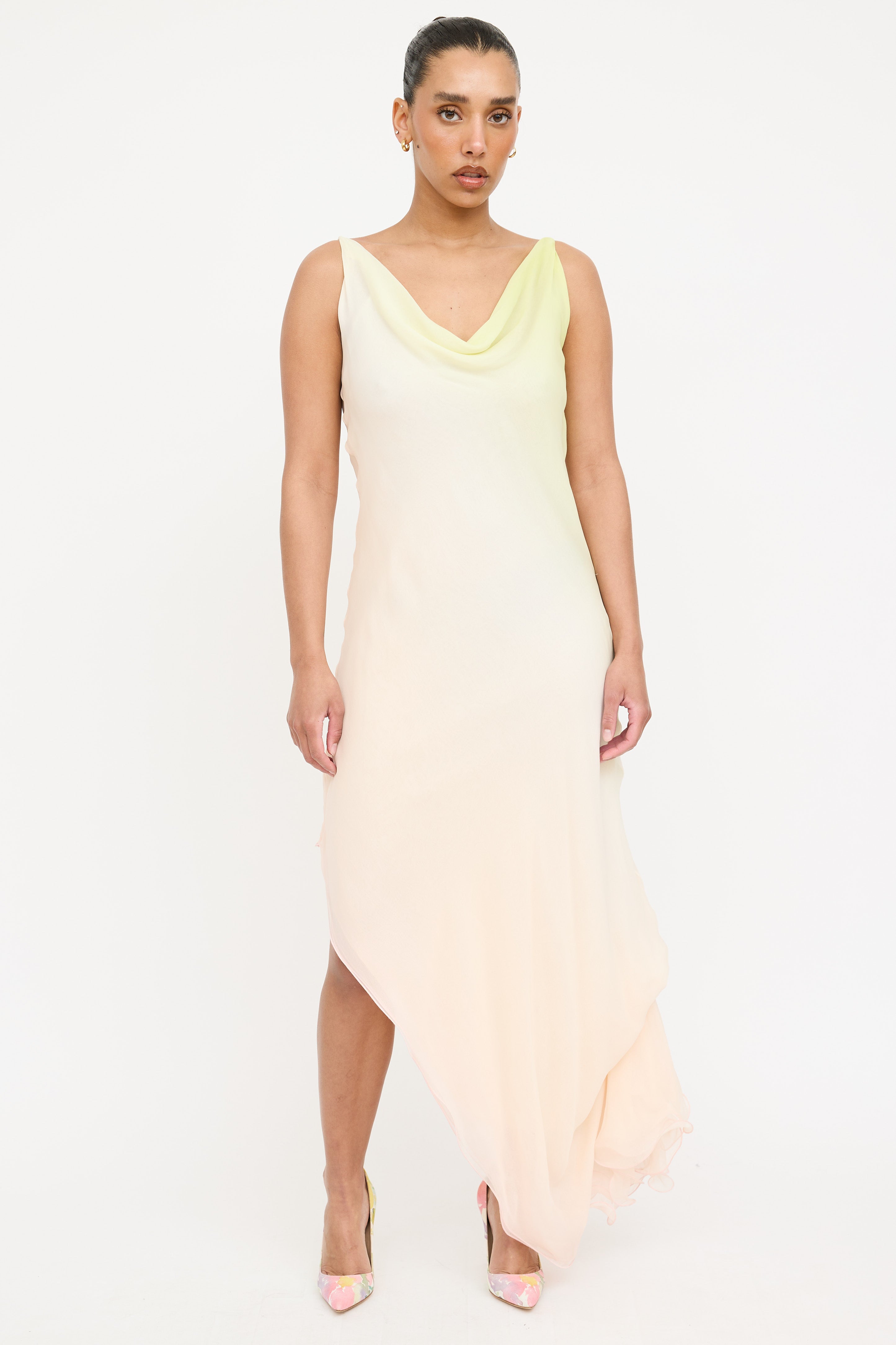 Pre-owned Edward Achour green silk sleeveless dress featuring a multicolour gradient, scoop cowl neckline, ruffled hem, and zip closure at side. Includes matching slip.