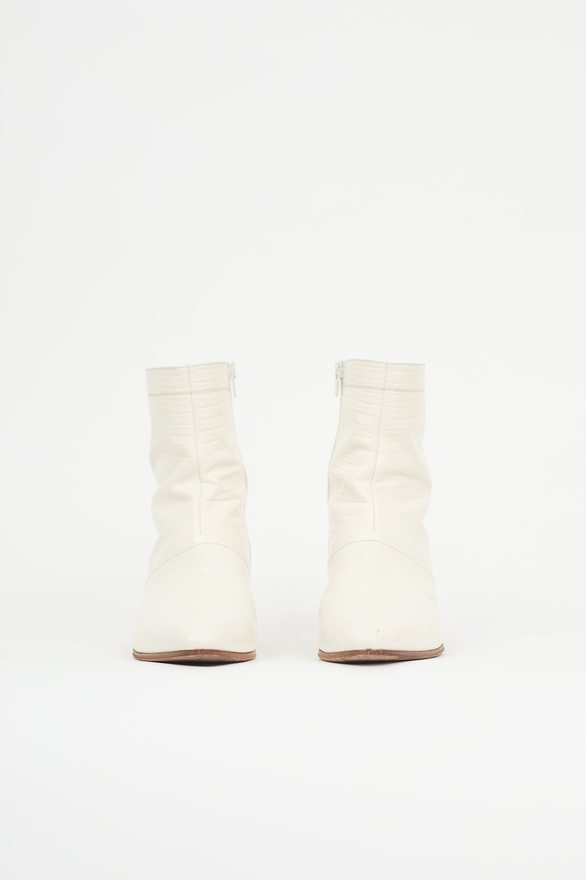 Pre-owned Celine white embossed leather boots featuring panelled snakeskin effect, zip closure at side, and stacked block heel. Includes original dust bag.