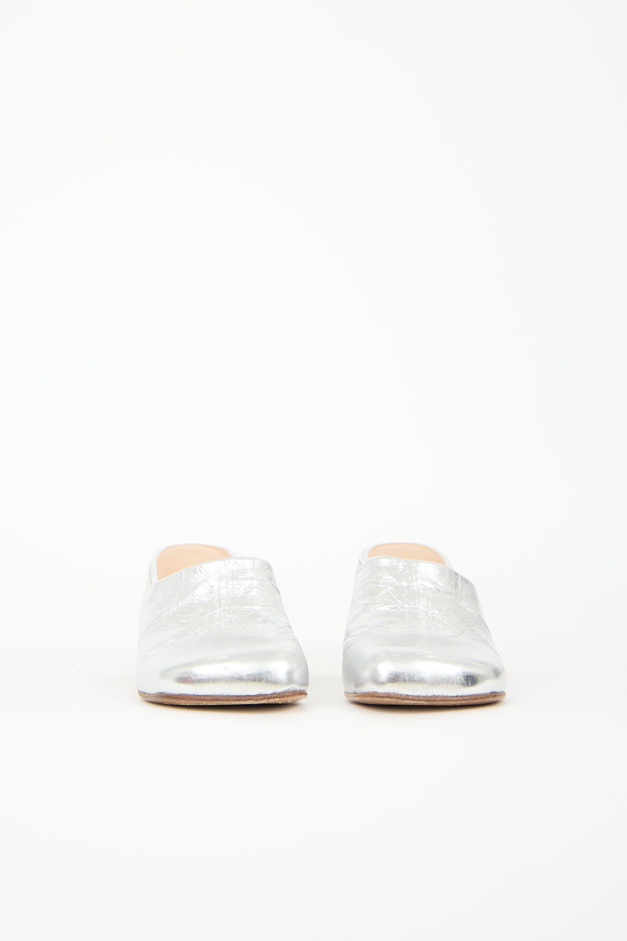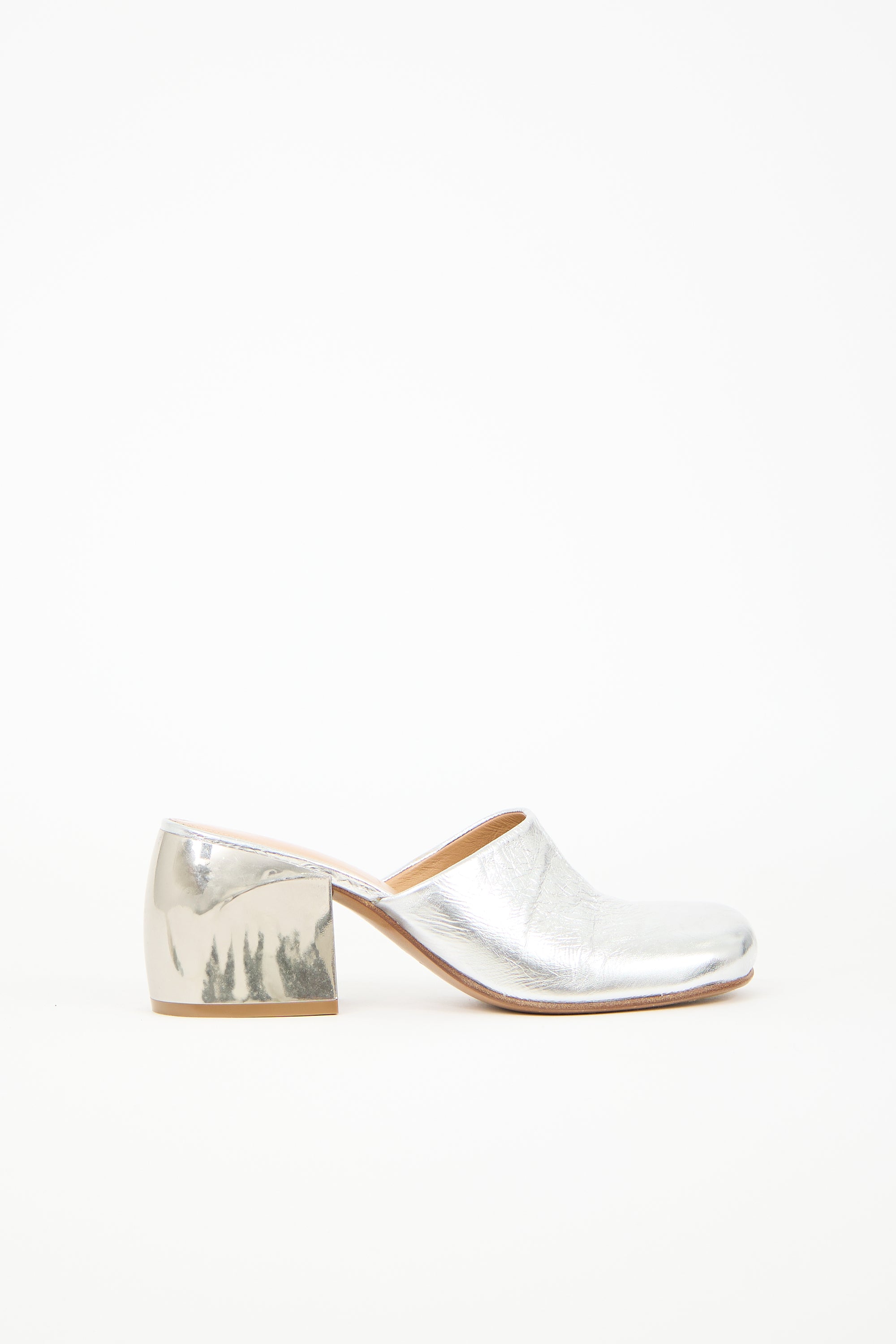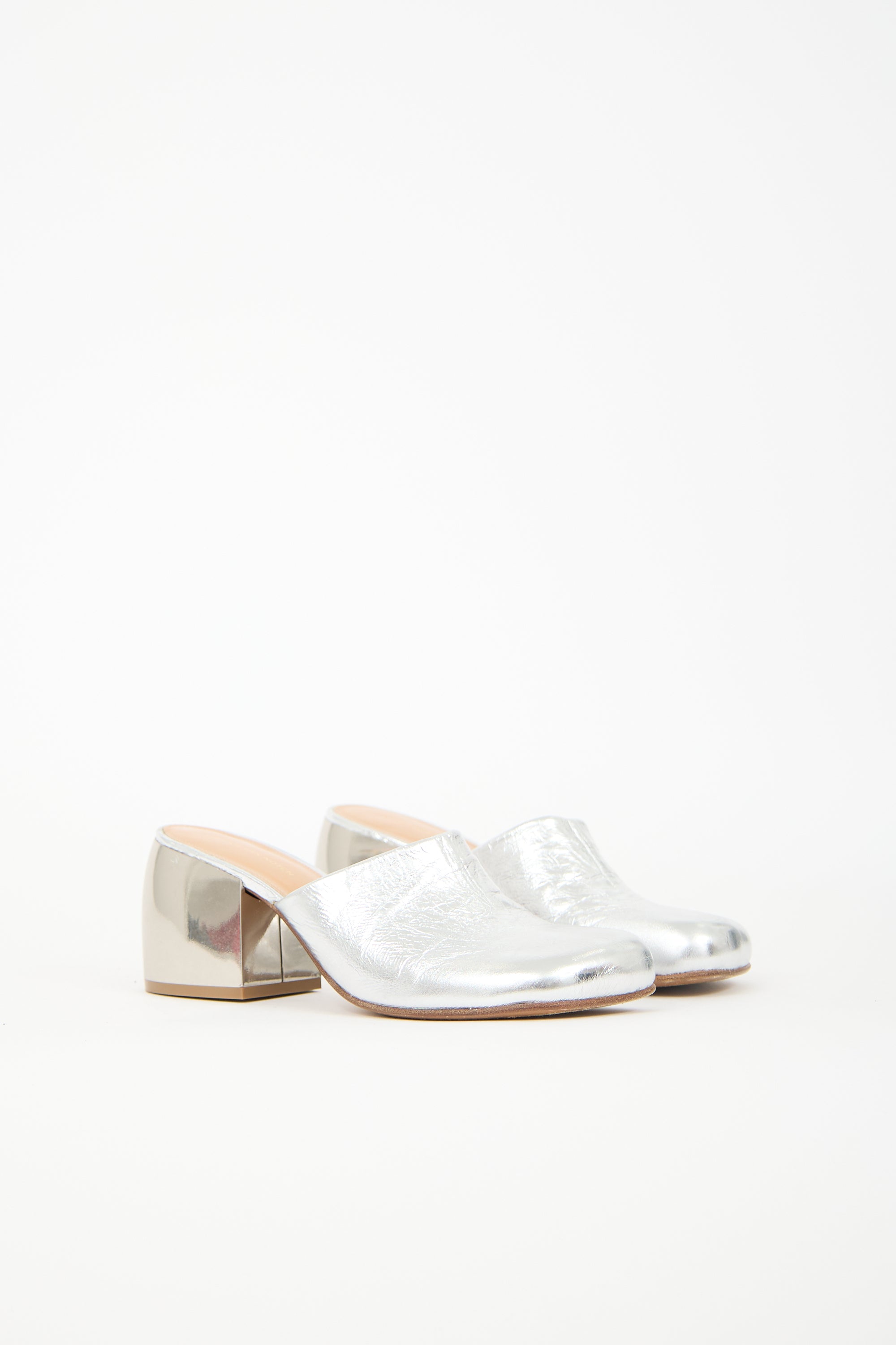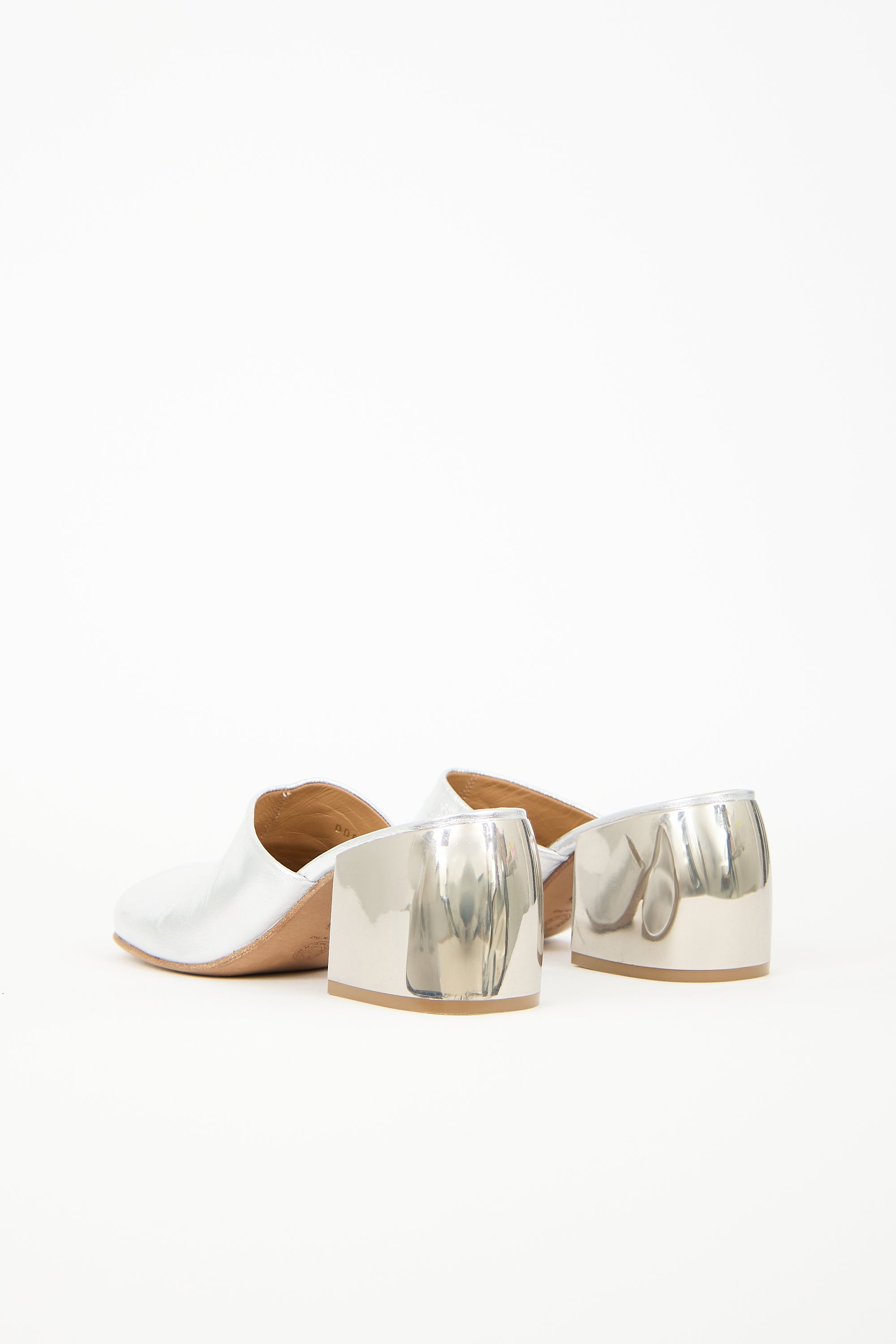 Pre-owned Dries Van Noten silver tone metallic leather mules featuring sculpted toe and sculptural block heel with metal plating.