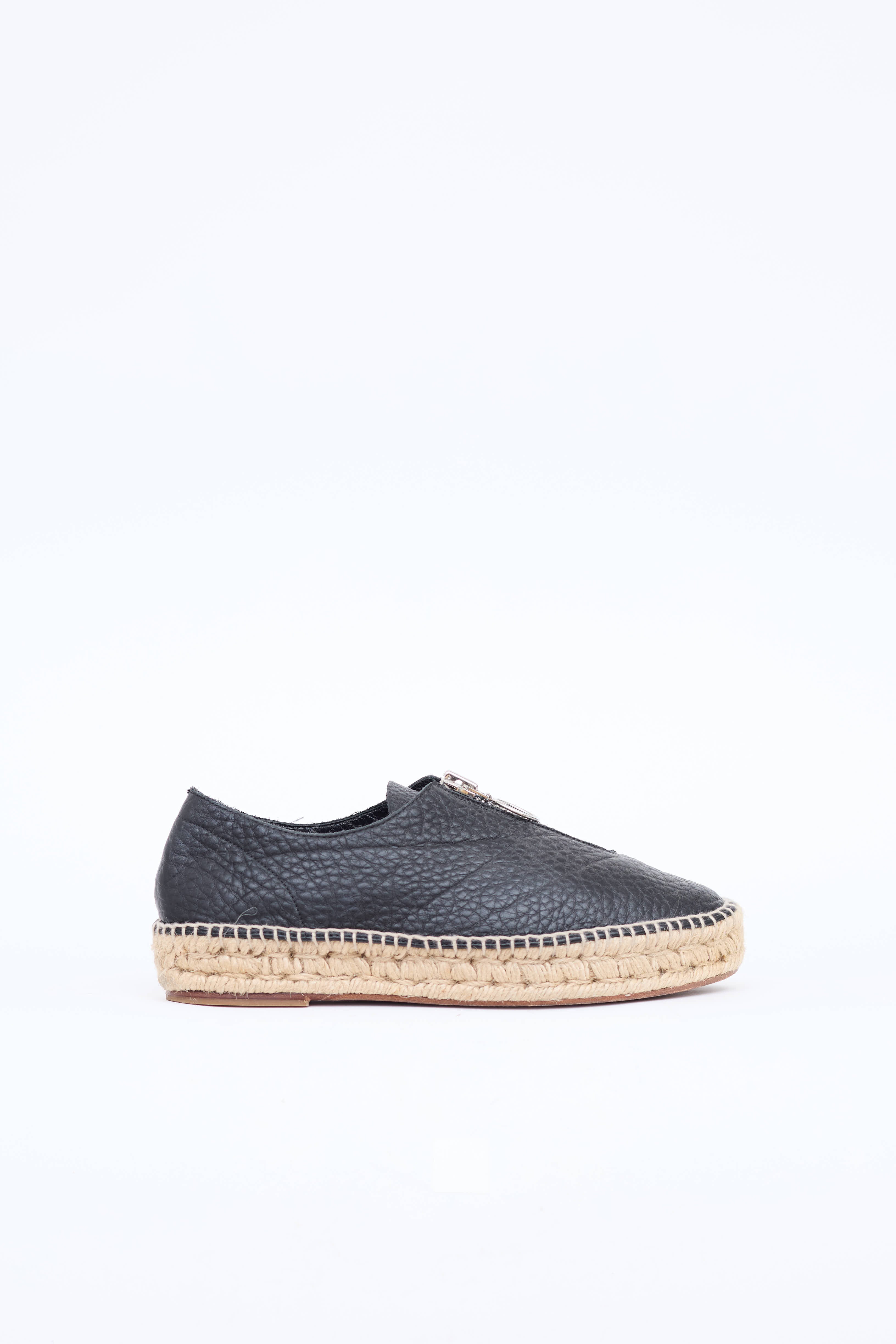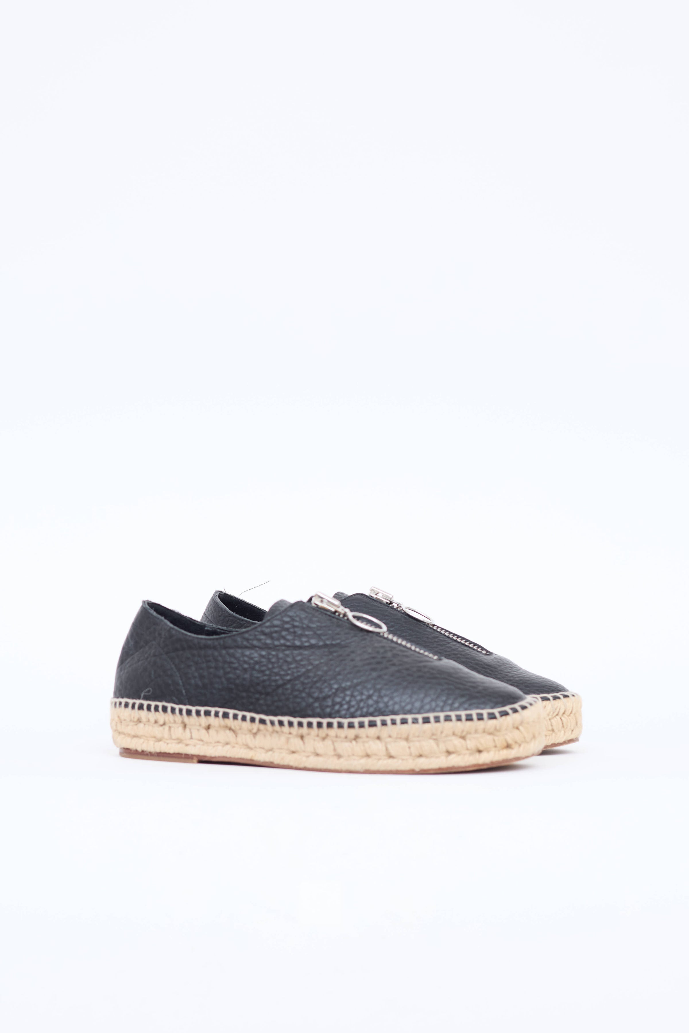 Pre-owned Alexander Wang black Devon sneakers featuring a rounded toe, pebbled leather upper, zipper detail at vamp with silver toned ring pull tab, and a woven espadrille midsole.