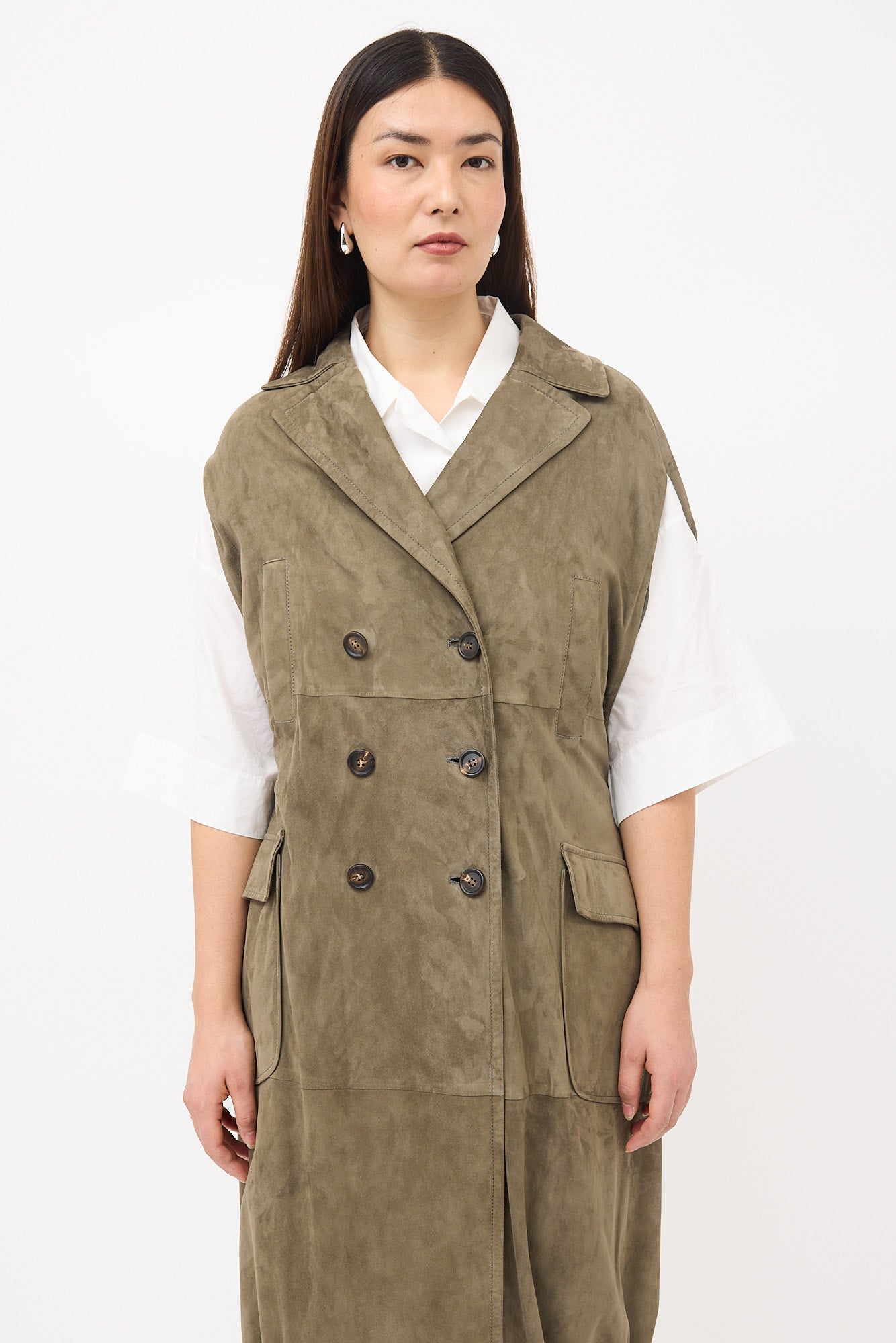 Pre-owned Brunello Cucinelli green suede long vest featuring a notched lapel, double breasted button front, two welt pockets at chest, two flap pockets at hip, and drawcord hem. Lined.