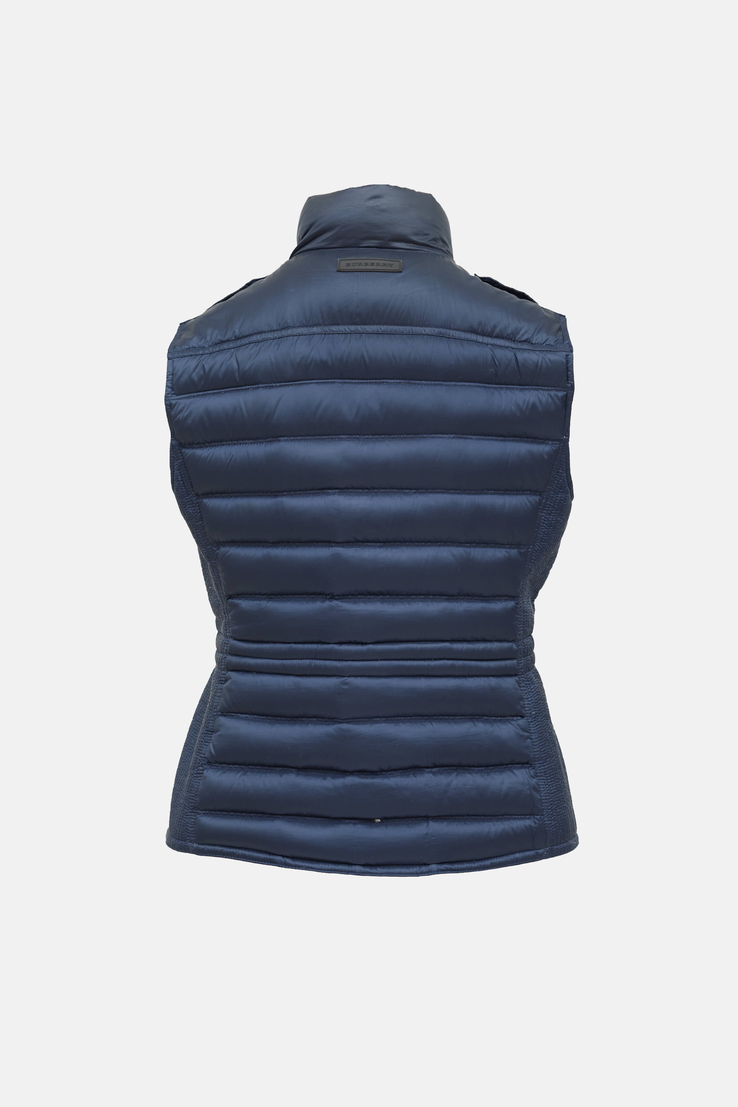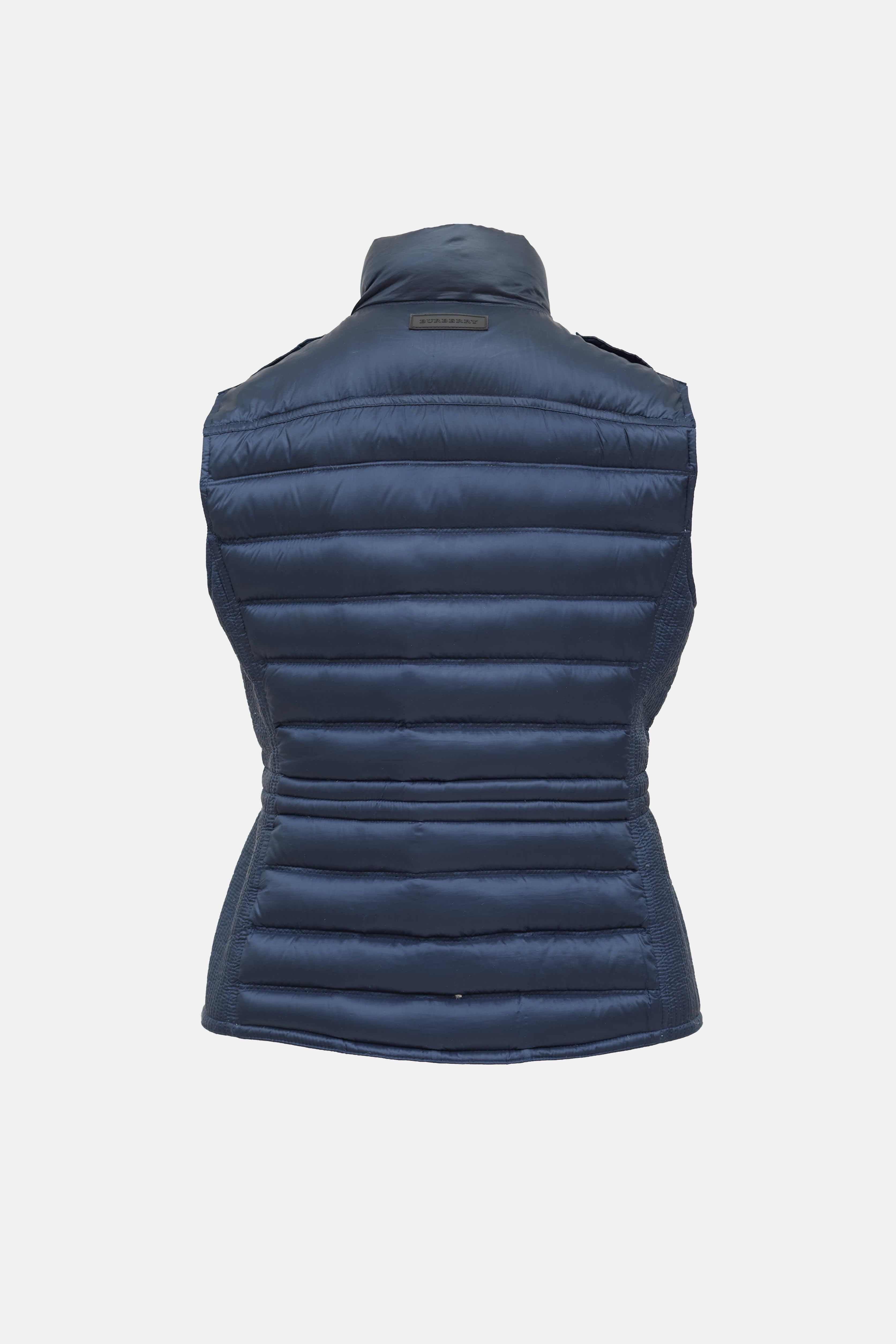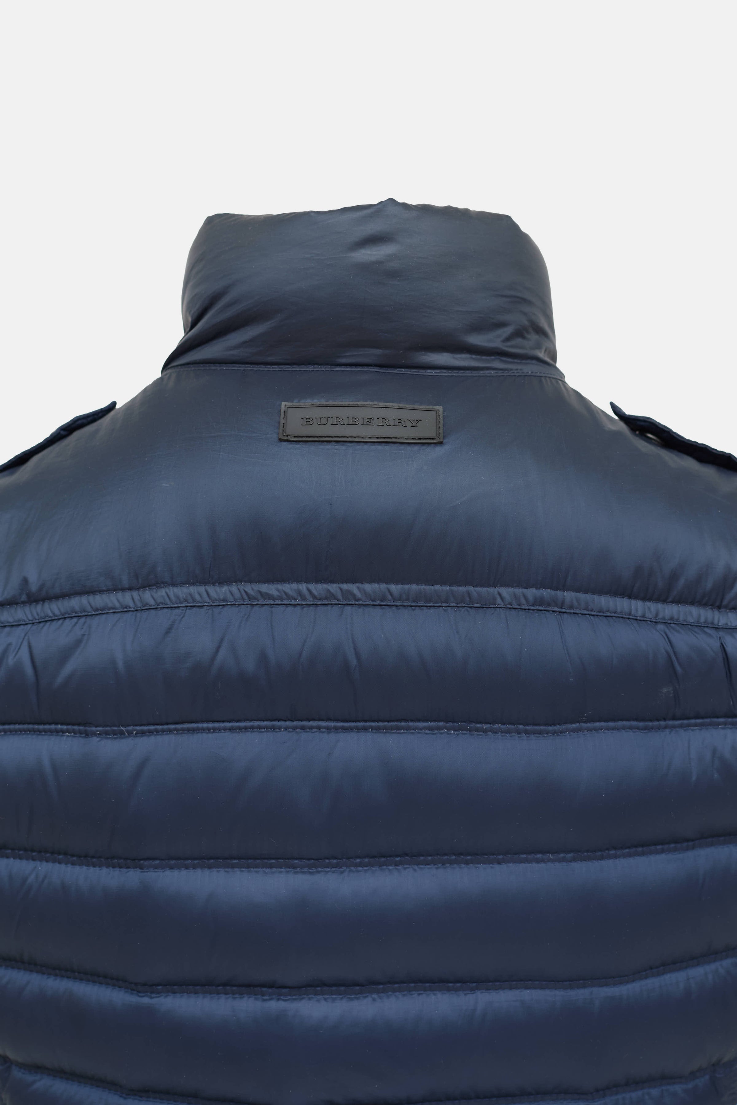 Pre-owned Burbery Brit navy down vest featuring a funnel neck collar, sleeveless styling, shoulder epaulets, two zip pockets at hip, quilted stitching, and zip closure. Lined.