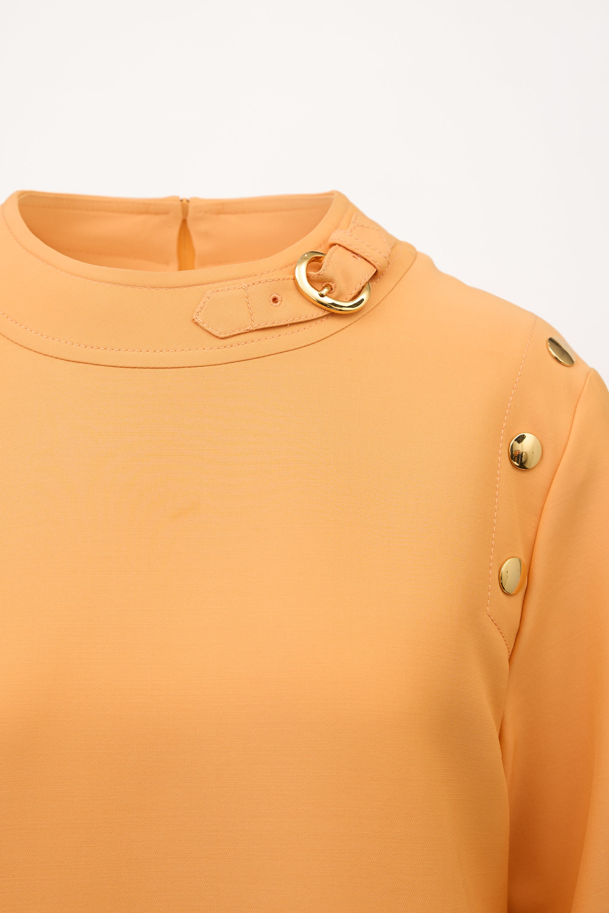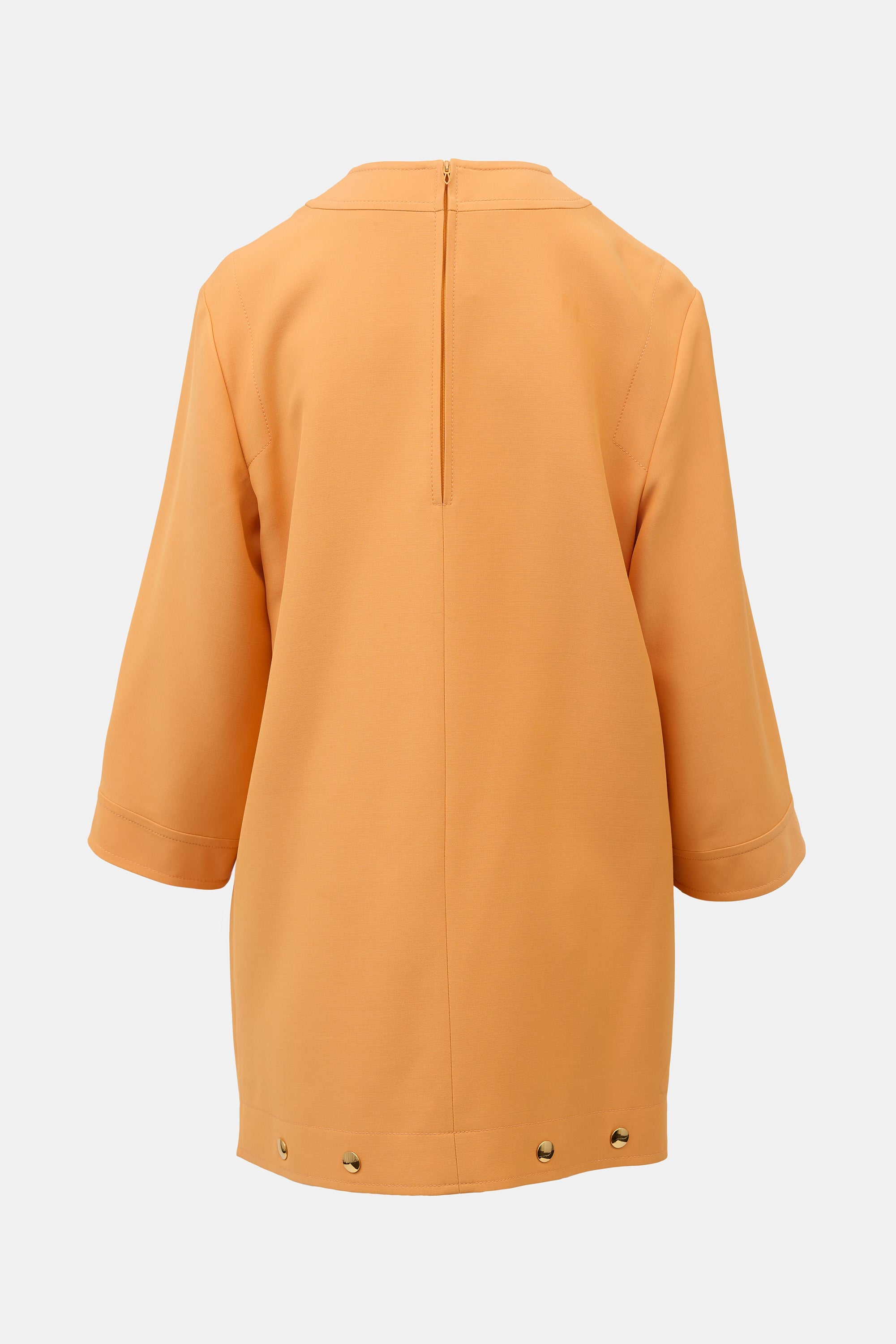 Pre-owned Gucci orange silk blend dress featuring round neckline with buckled strap, gold tone button embellishment at arms and hems, zip closure at back, and wide sleeves. Lined.